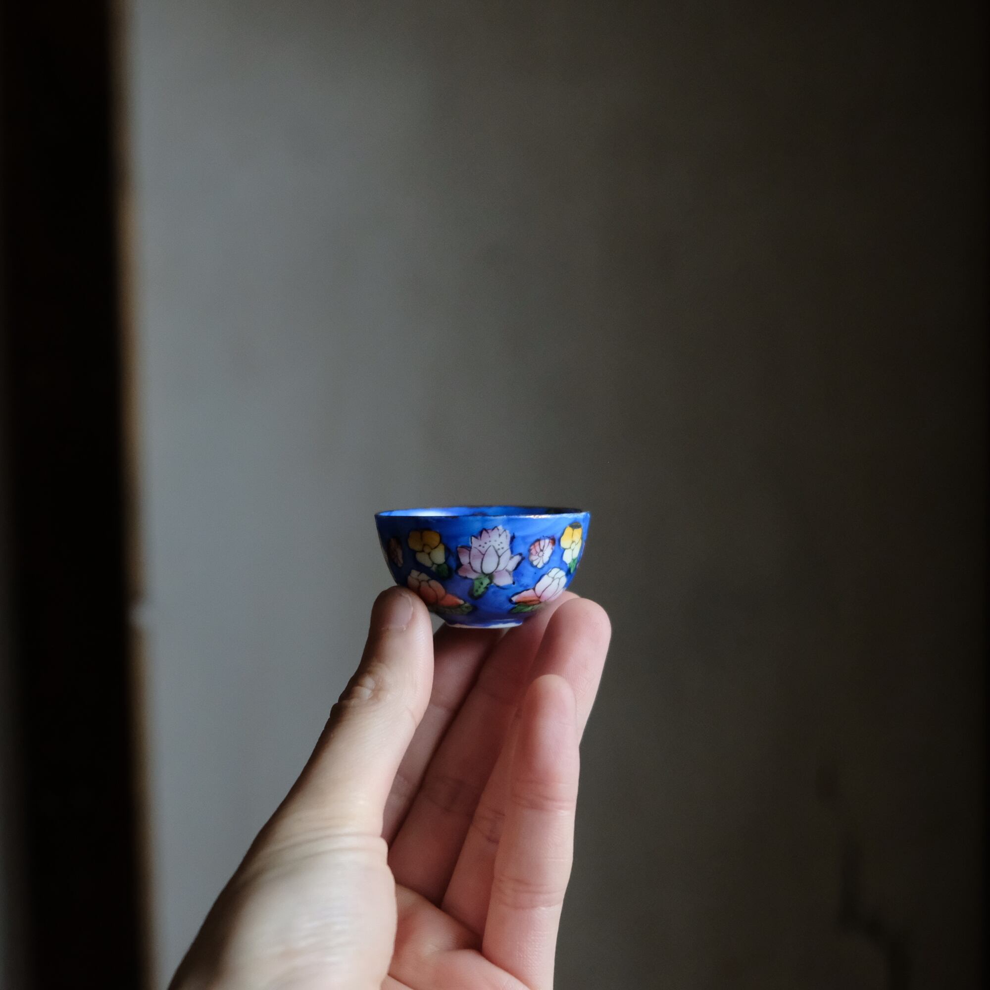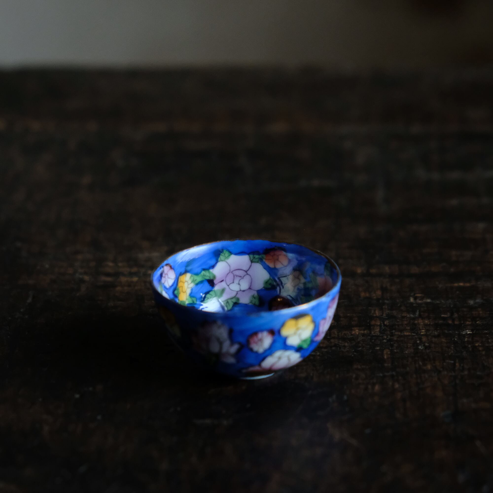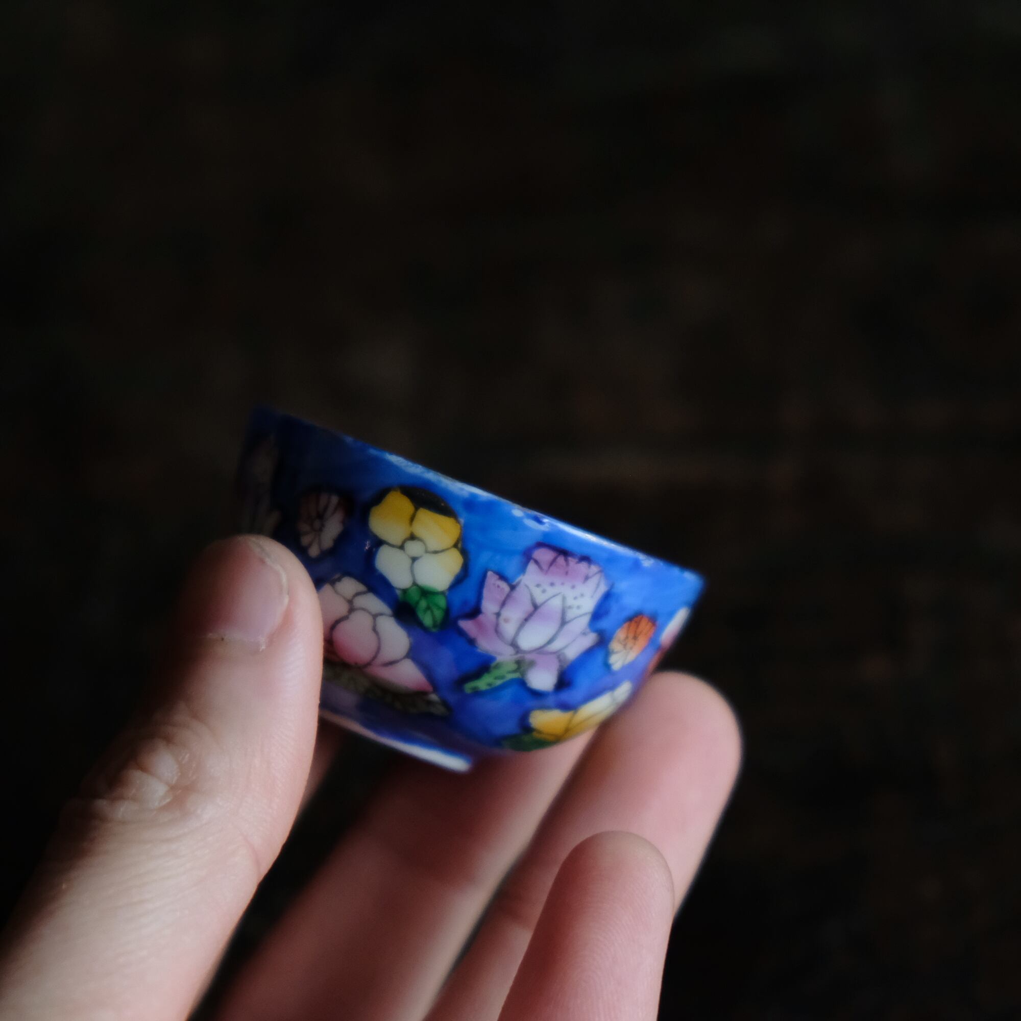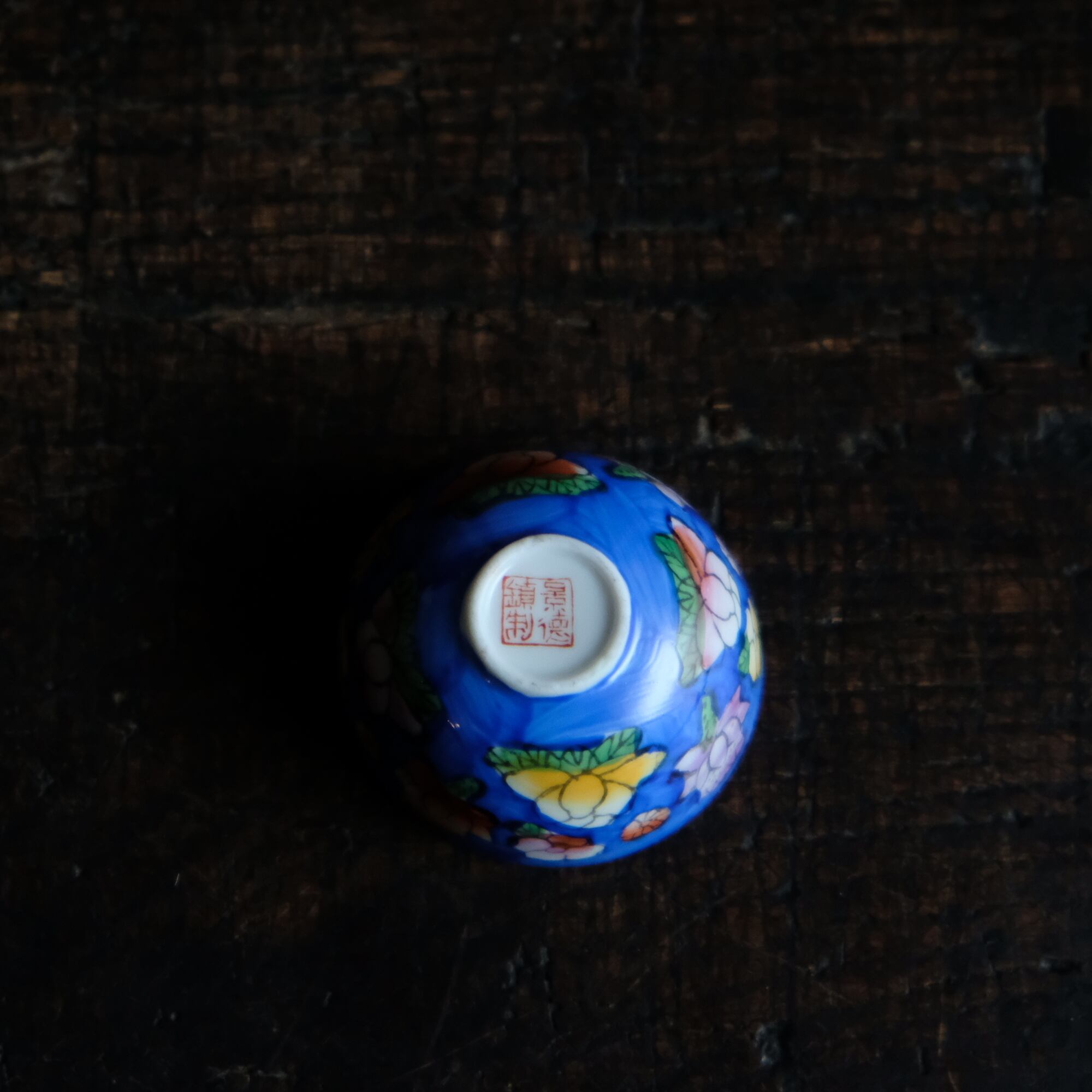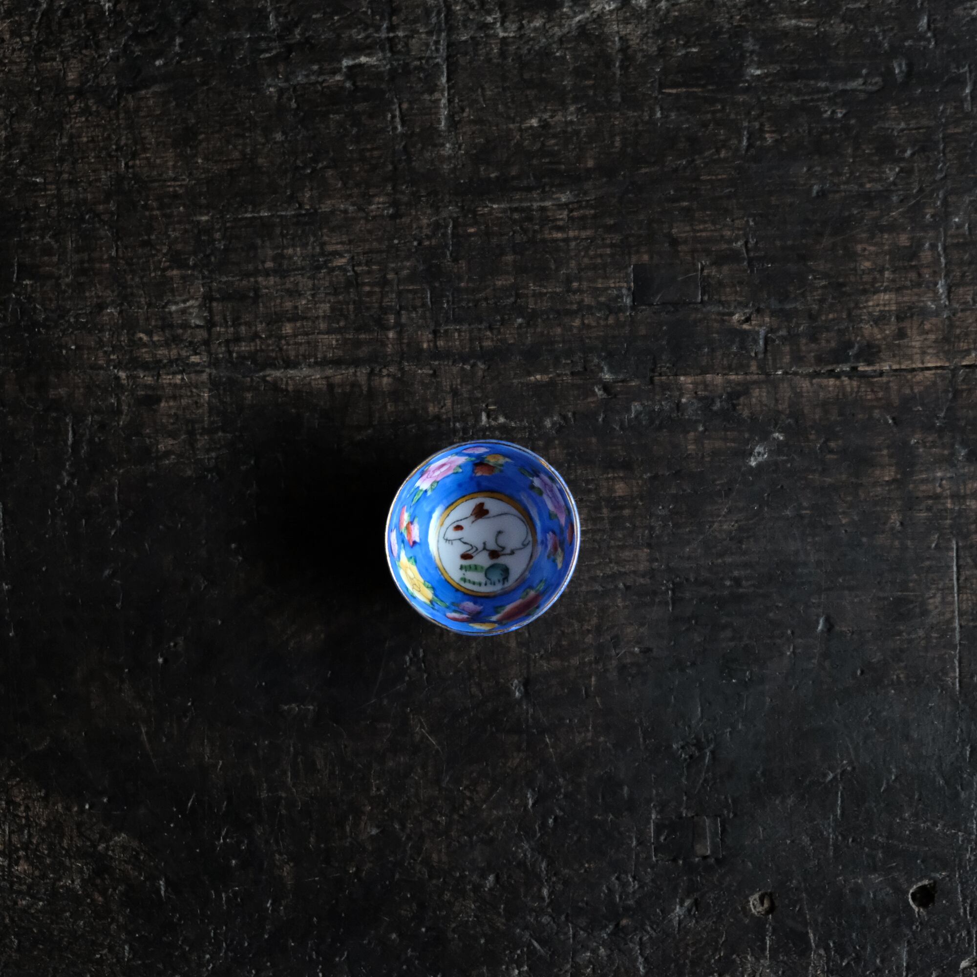 見込みに兎(卯)◆中国景徳鎮 ブルー 干支 色絵金彩小ぶり猪口 花尽くし。シノワズリ チャイナレトロ