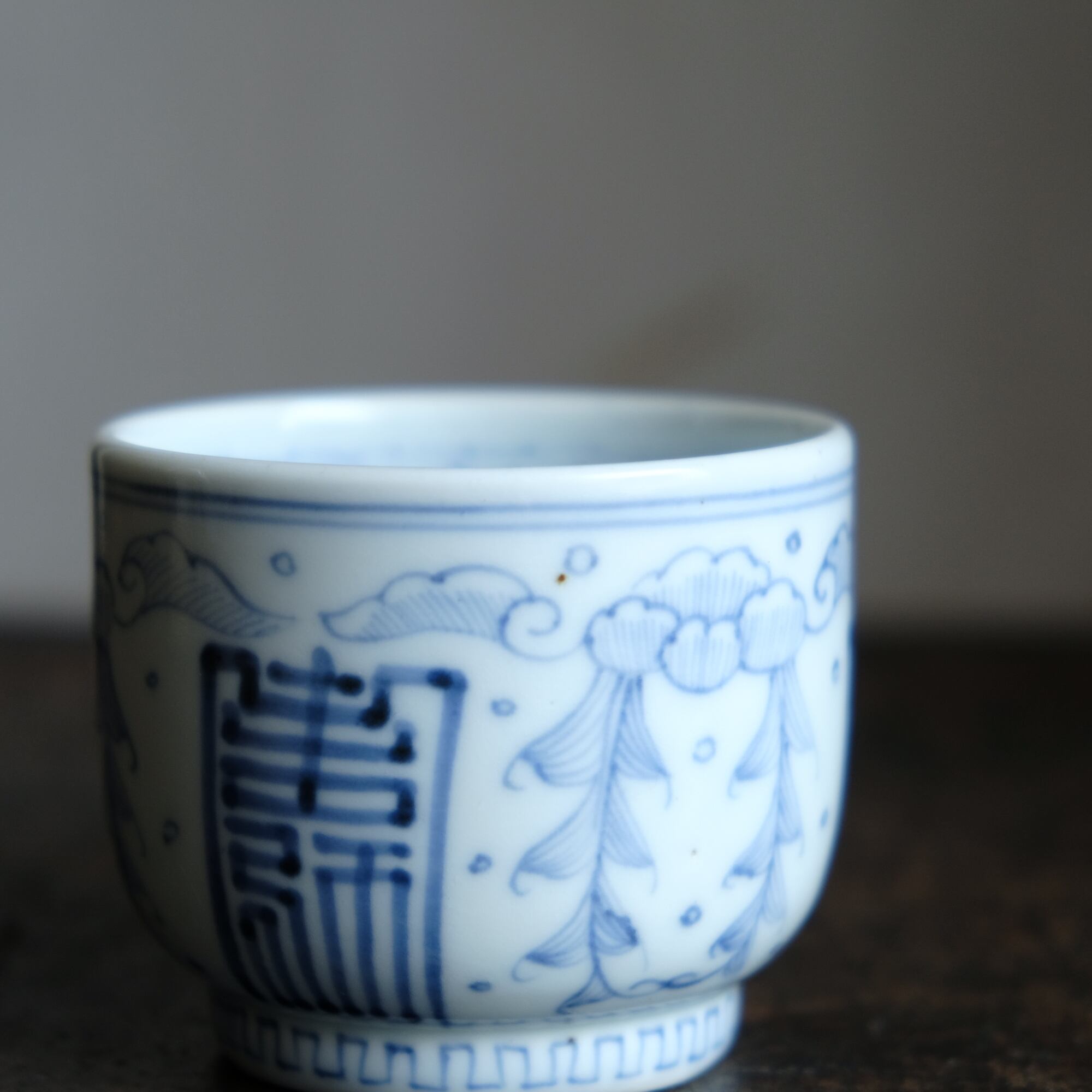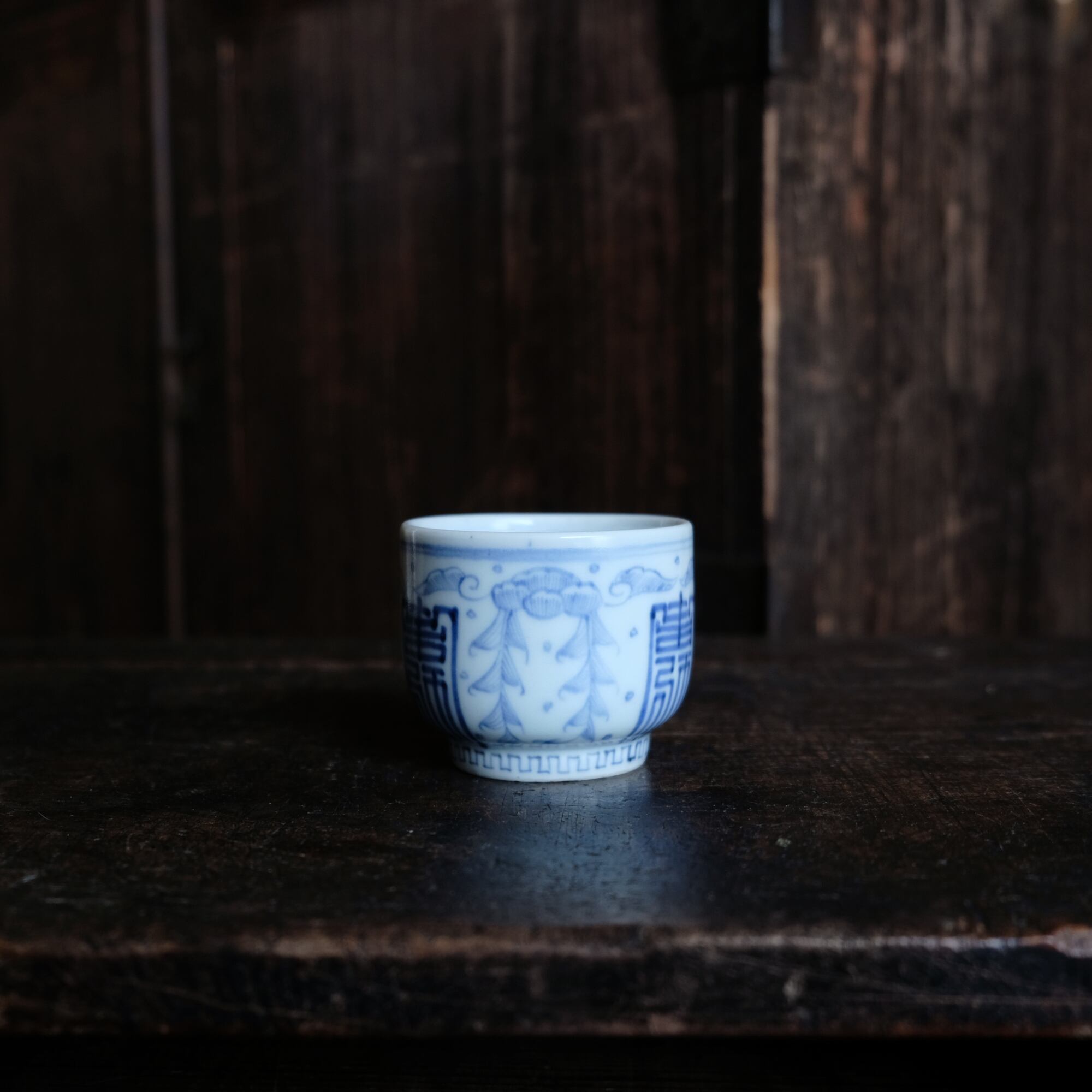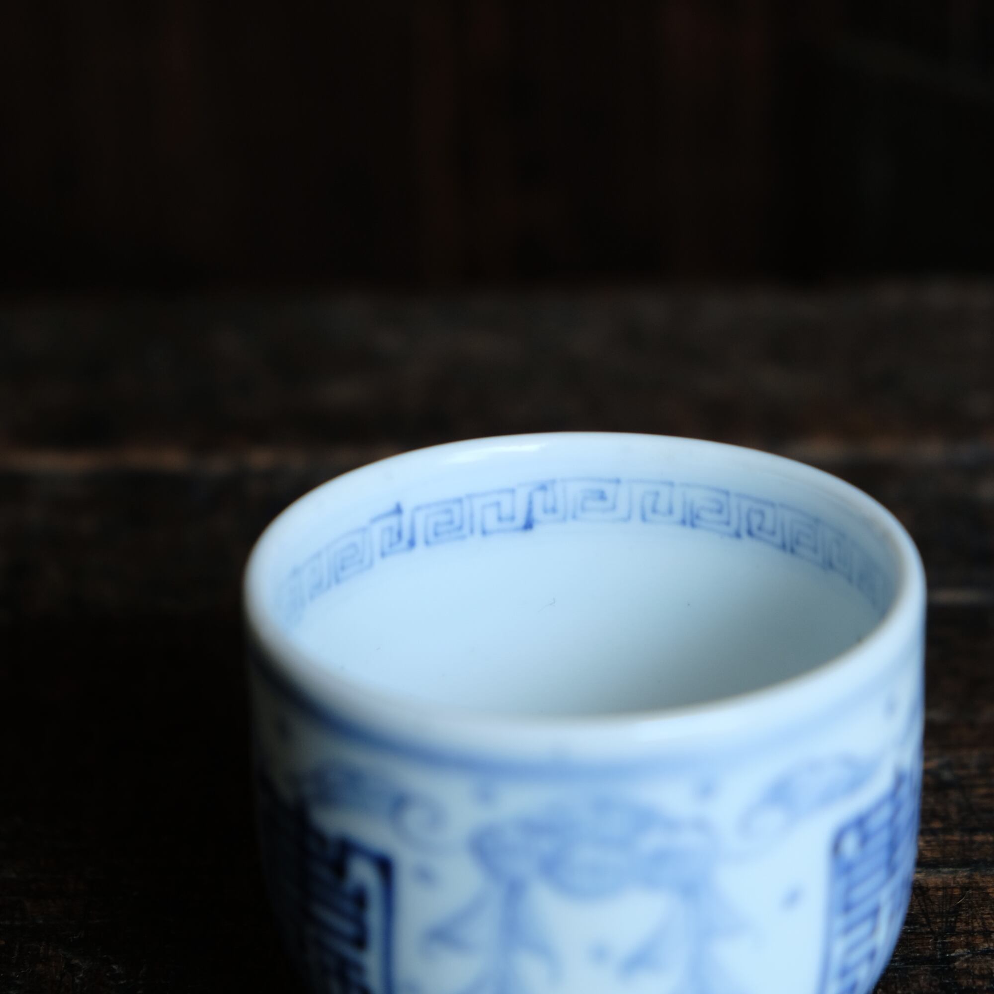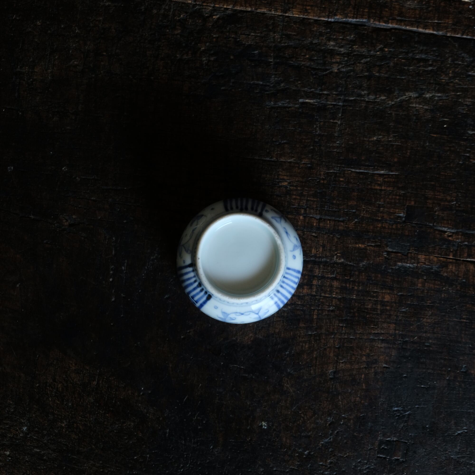線描きで素敵◆花と漢字。伊万里 染付線描猪口 骨董・antiques 丁寧な暮らしに。江戸末期
