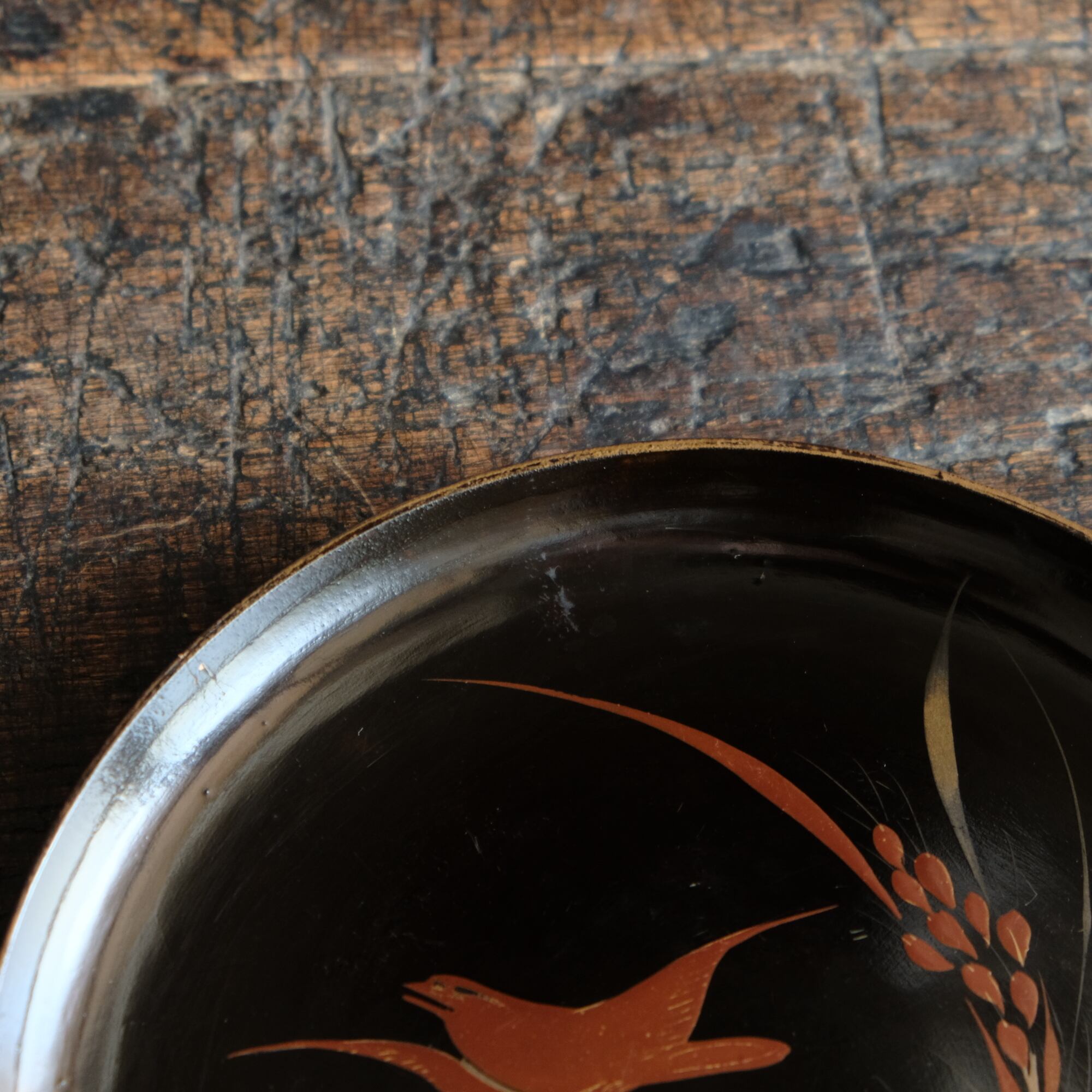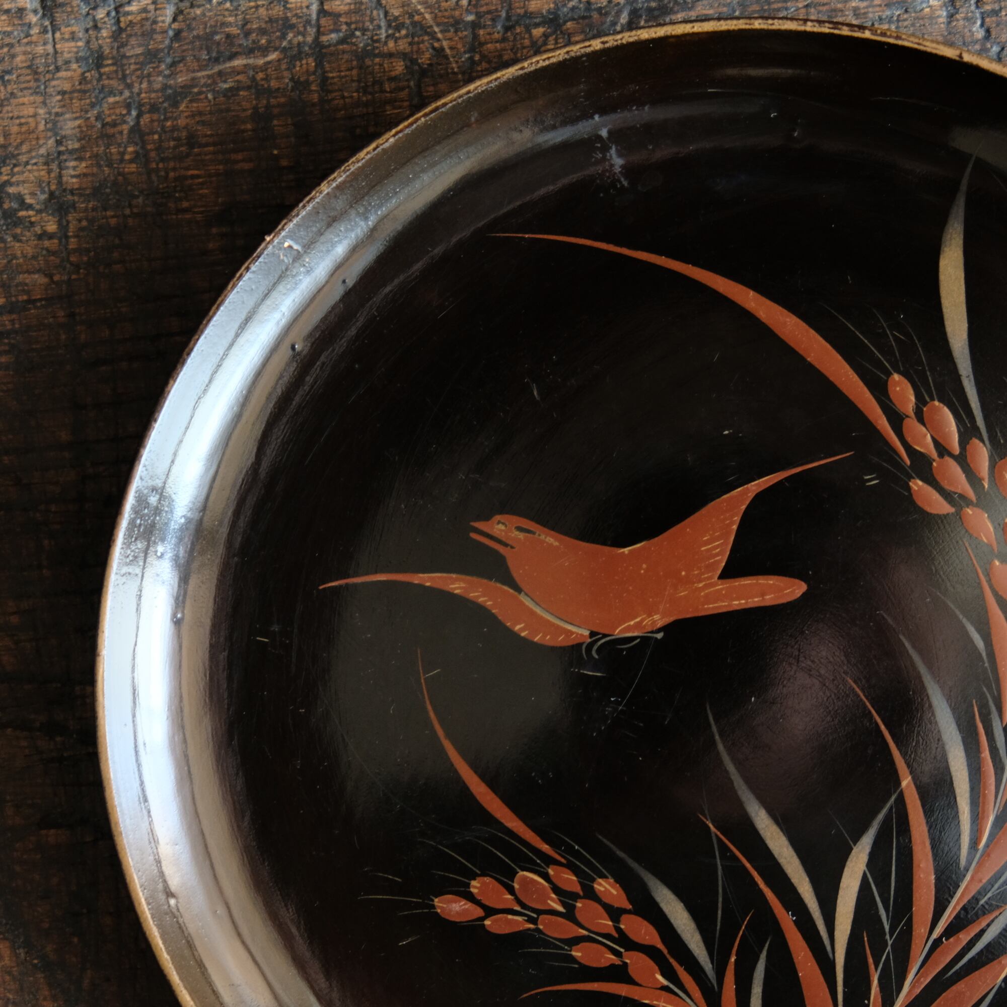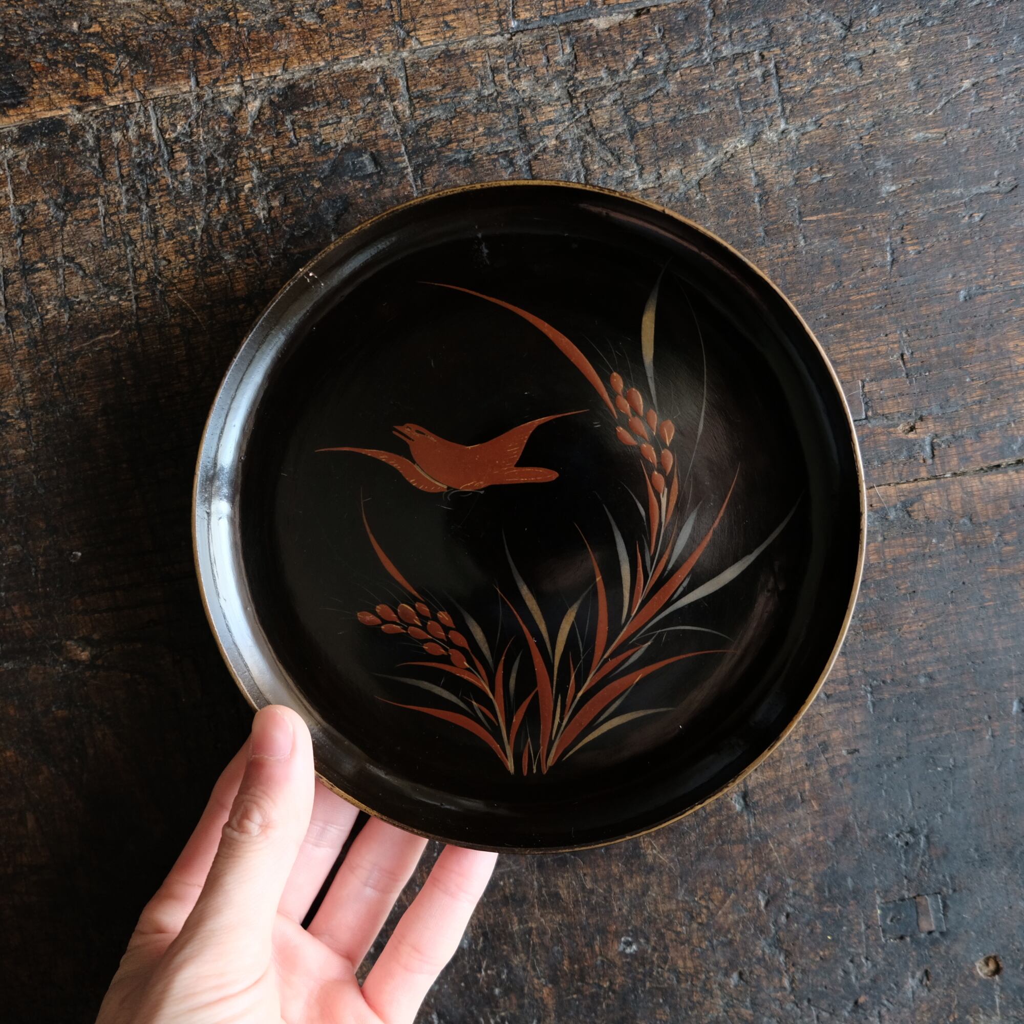 鳥と稲穂◆味のあるお品物。時代物 漆芸蒔絵中皿 漆器 骨董/antiques 古民家 明治期 b2
