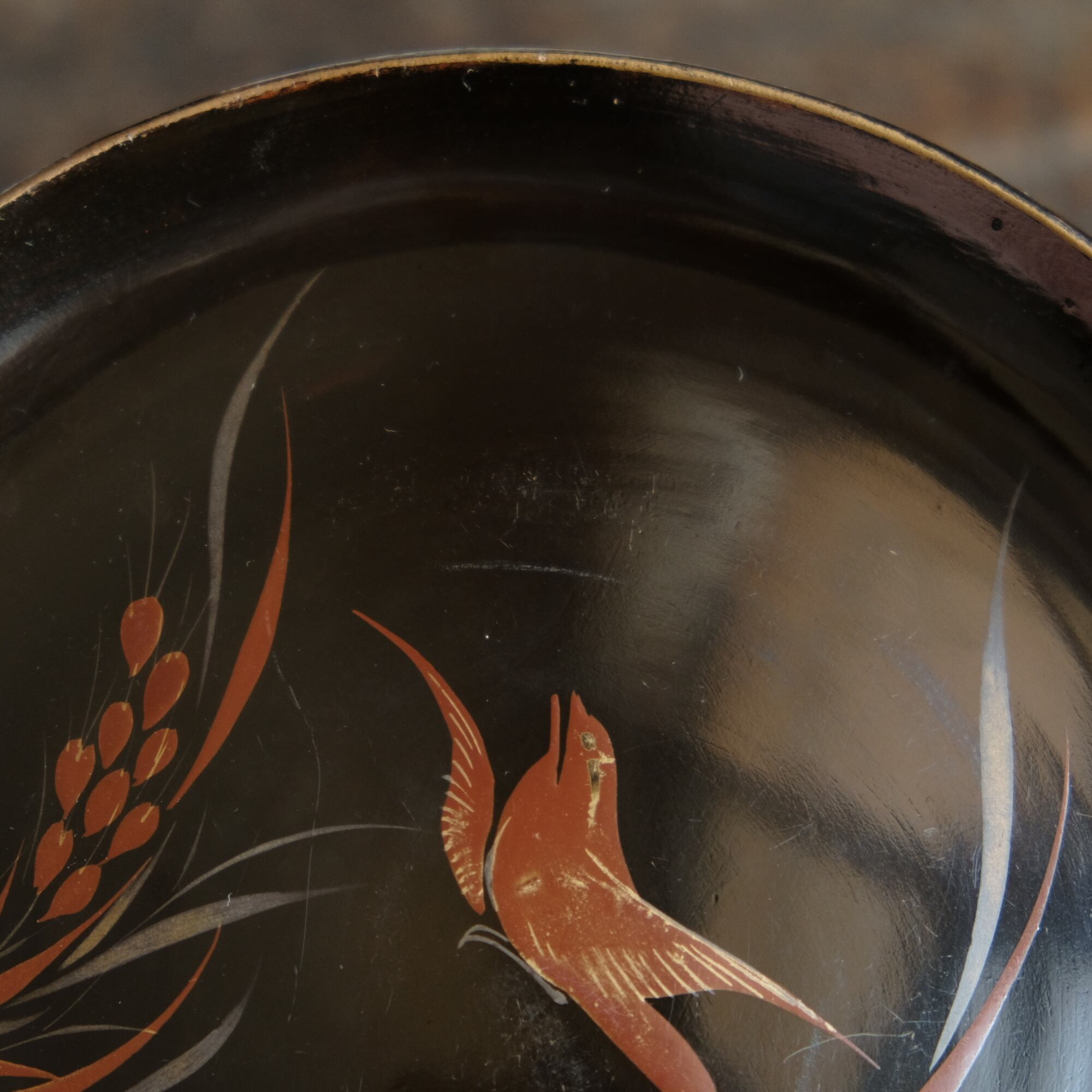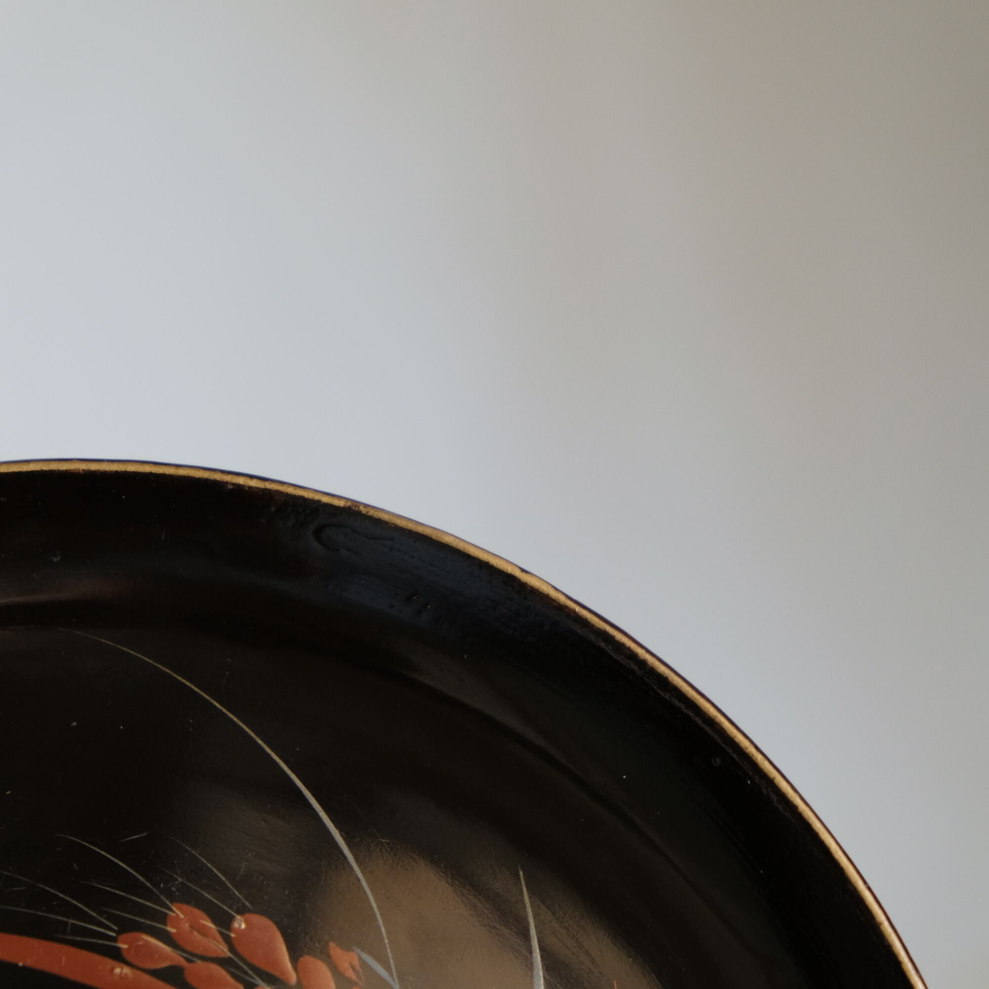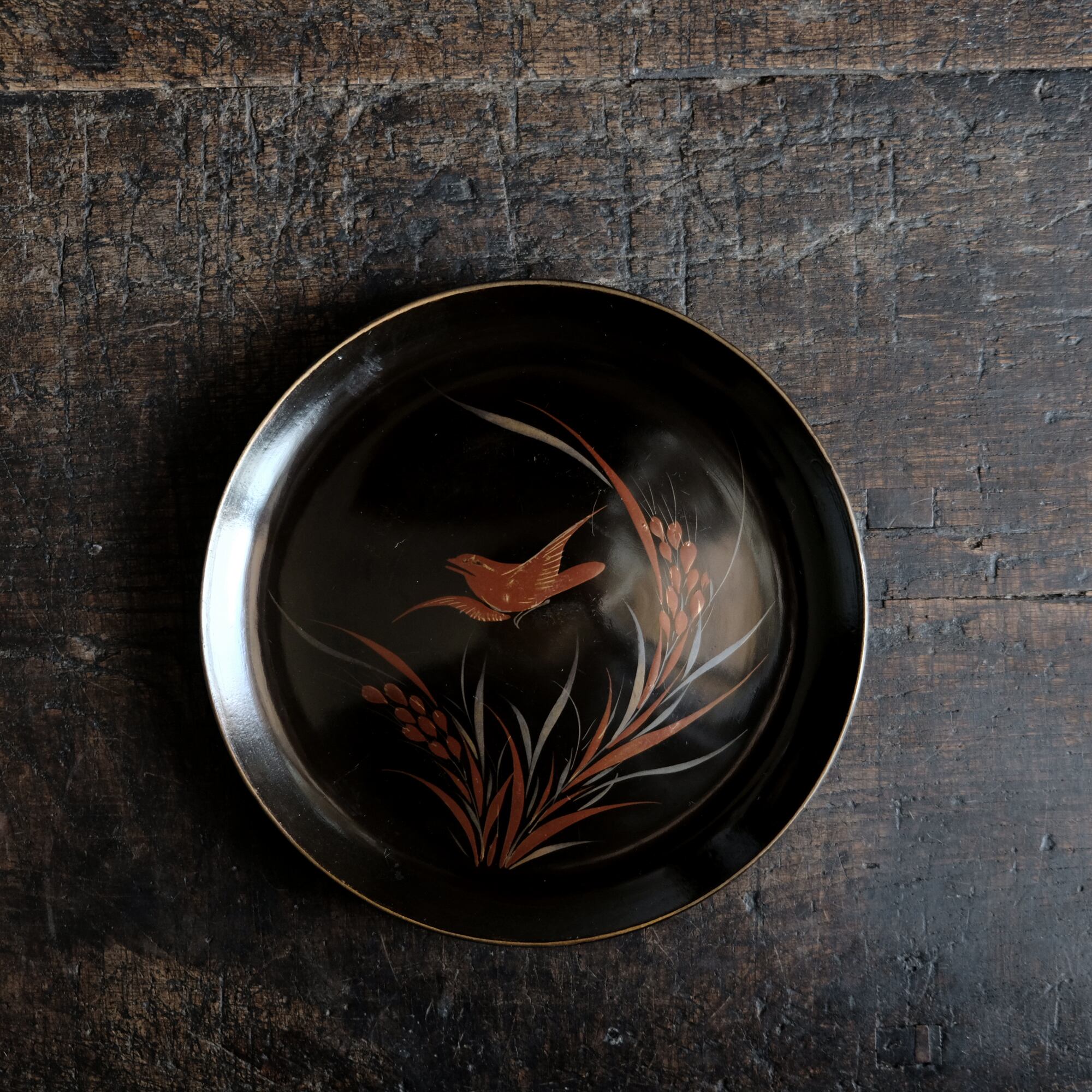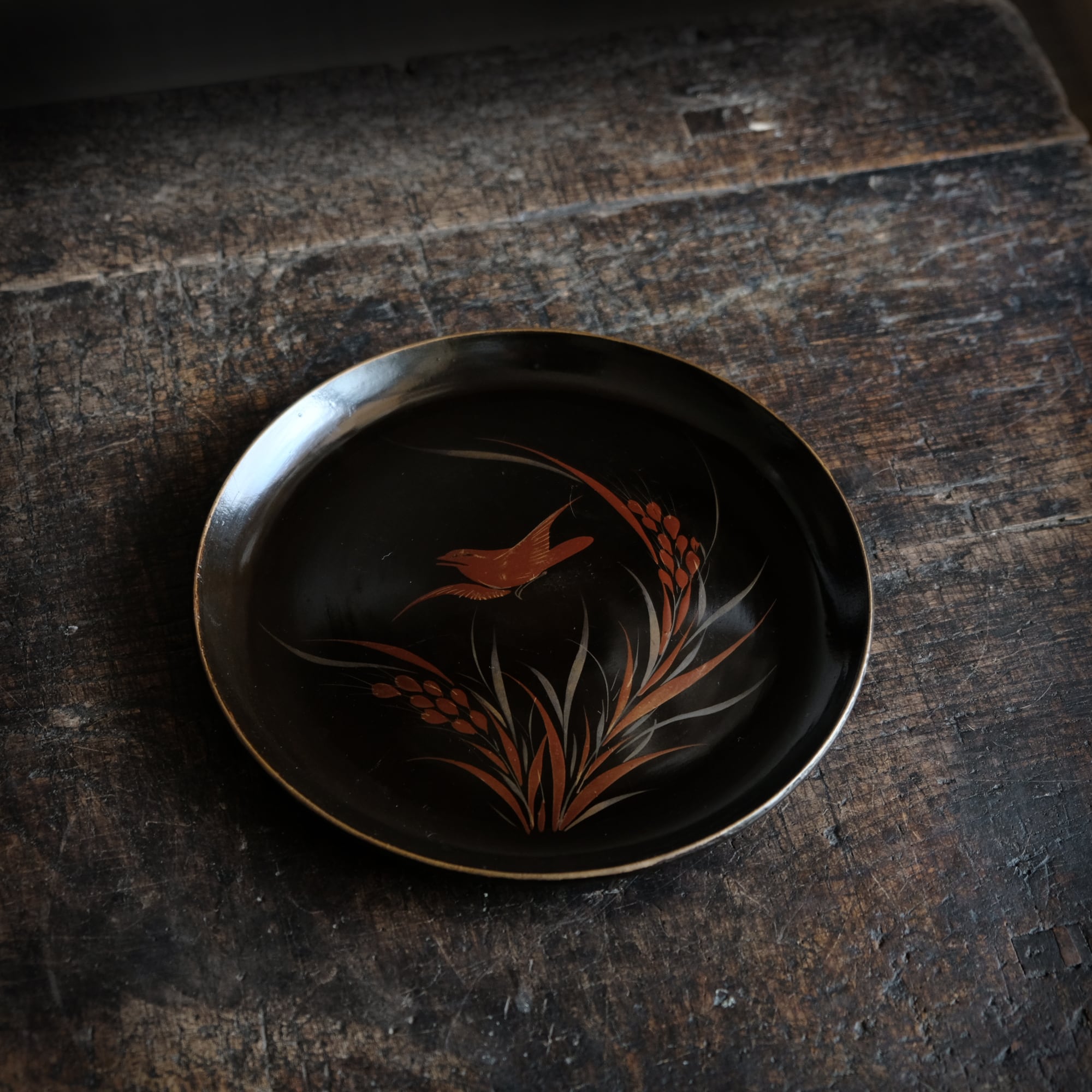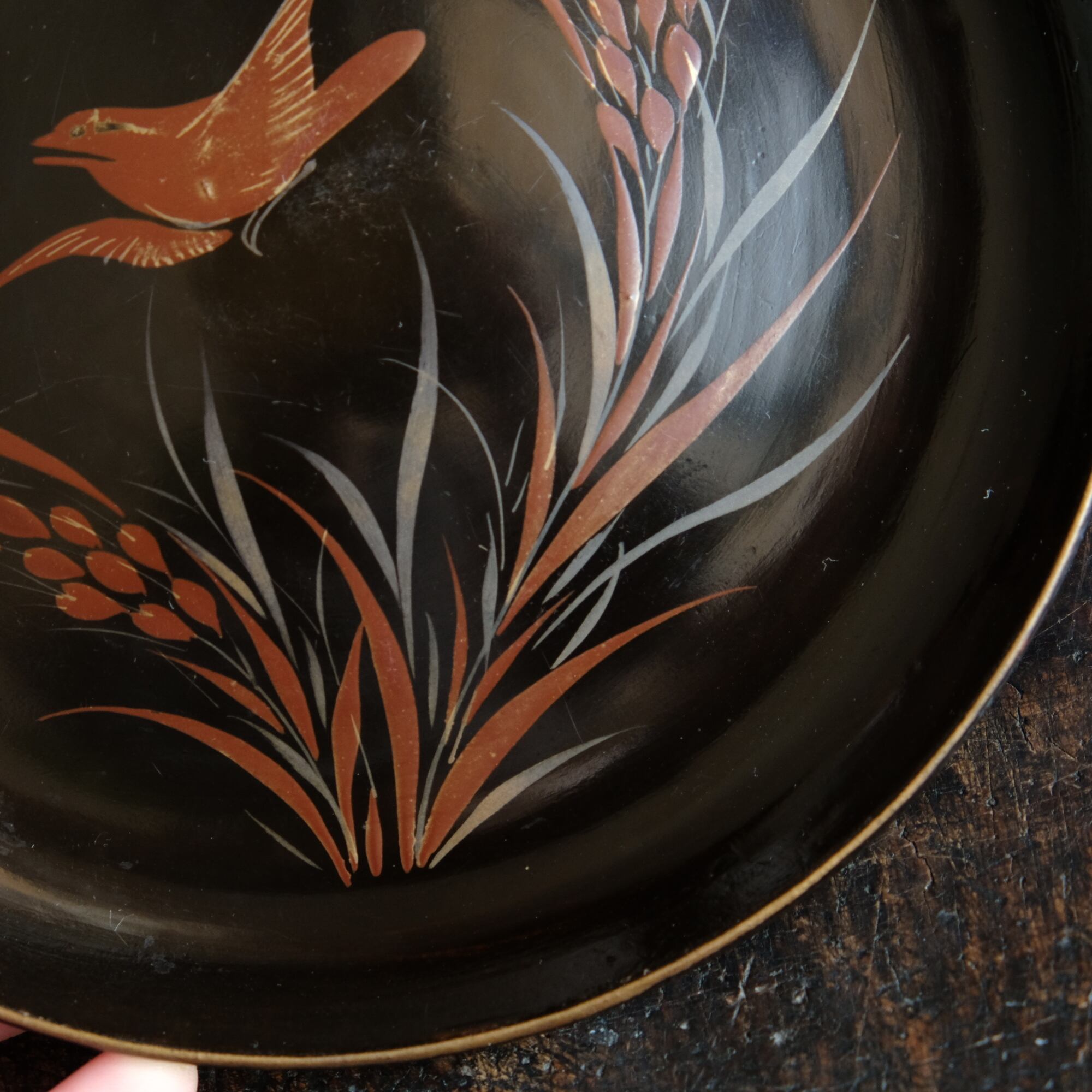 鳥と稲穂◆味のあるお品物。時代物 漆芸蒔絵中皿 漆器 骨董/antiques 古民家 明治期 b4