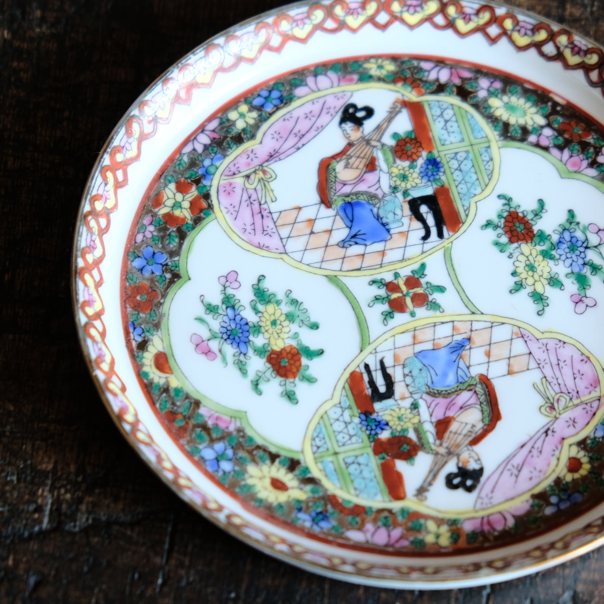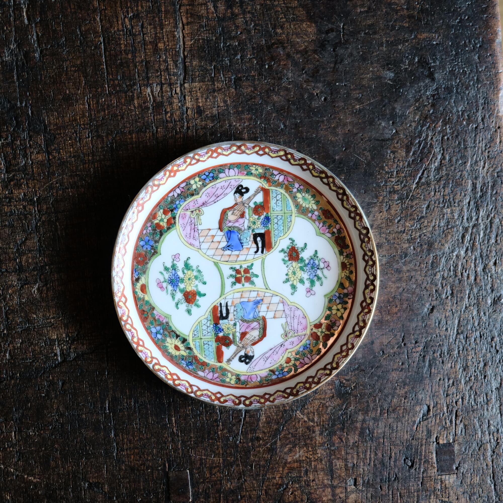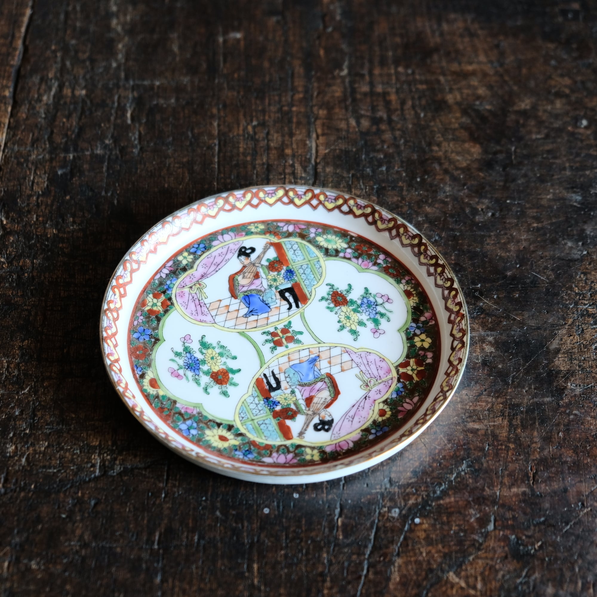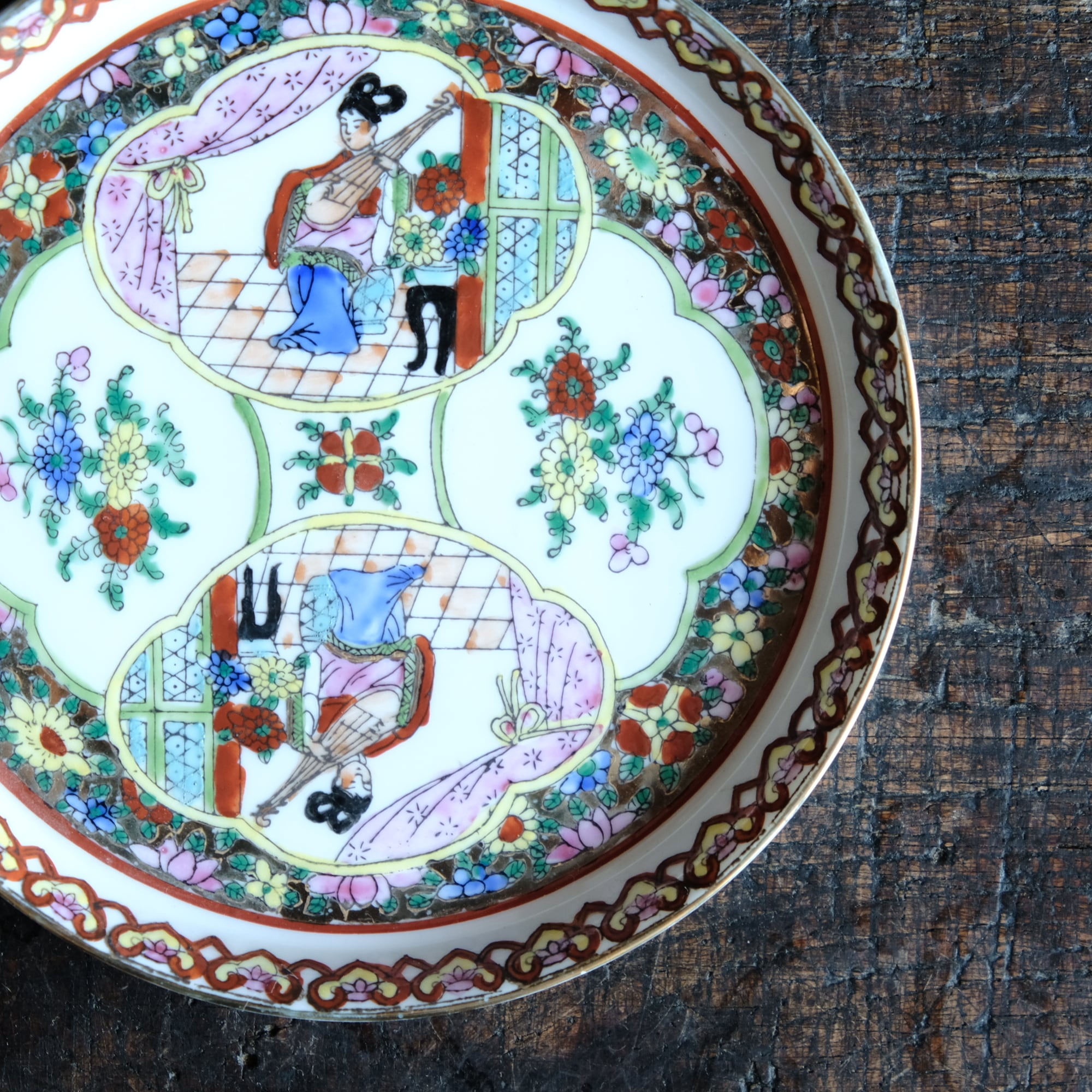 チャイナレトロで可愛い◆草花と琵琶を弾く天女。中国廣彩 色絵金彩中皿プレート シノワズリ 飾り皿 インテリア