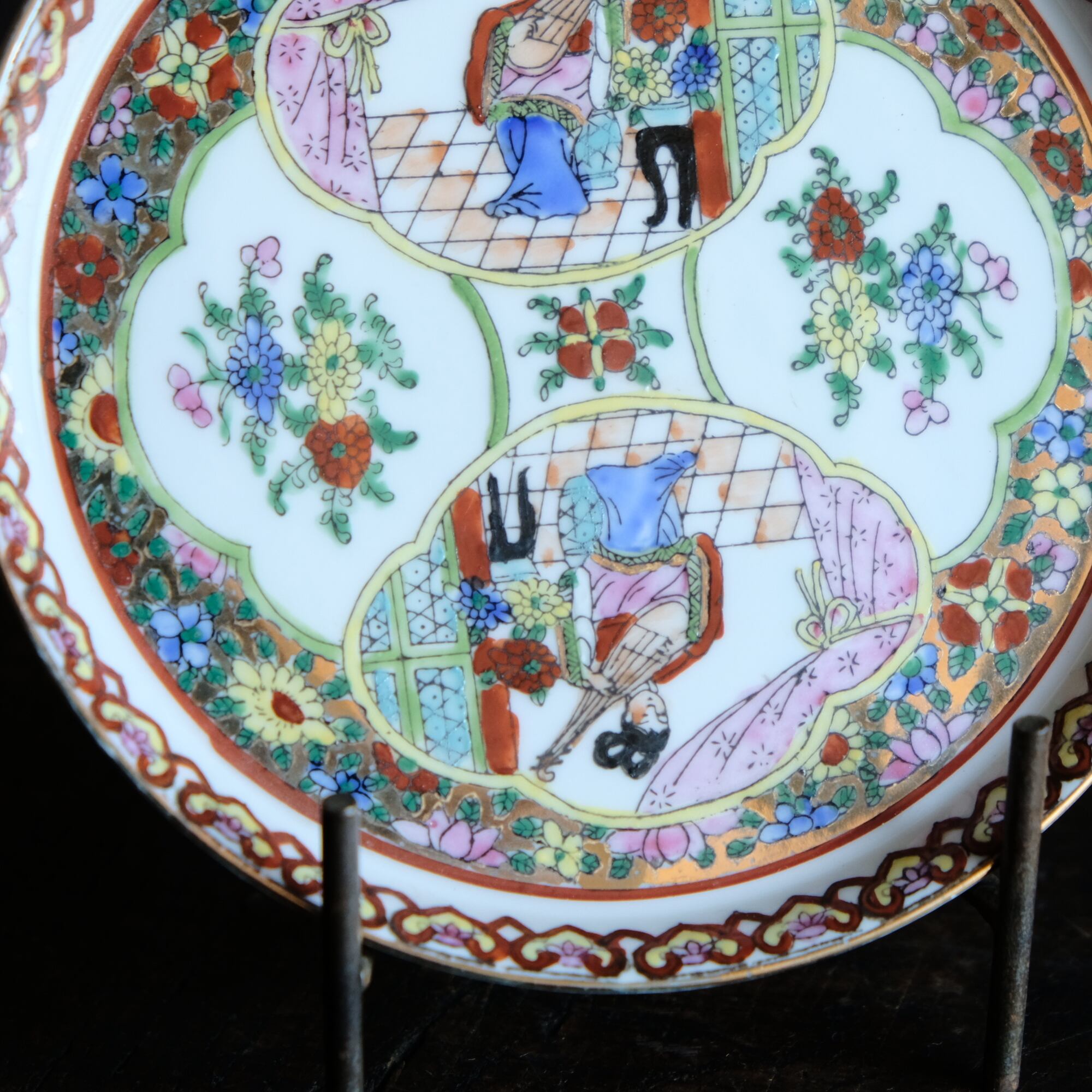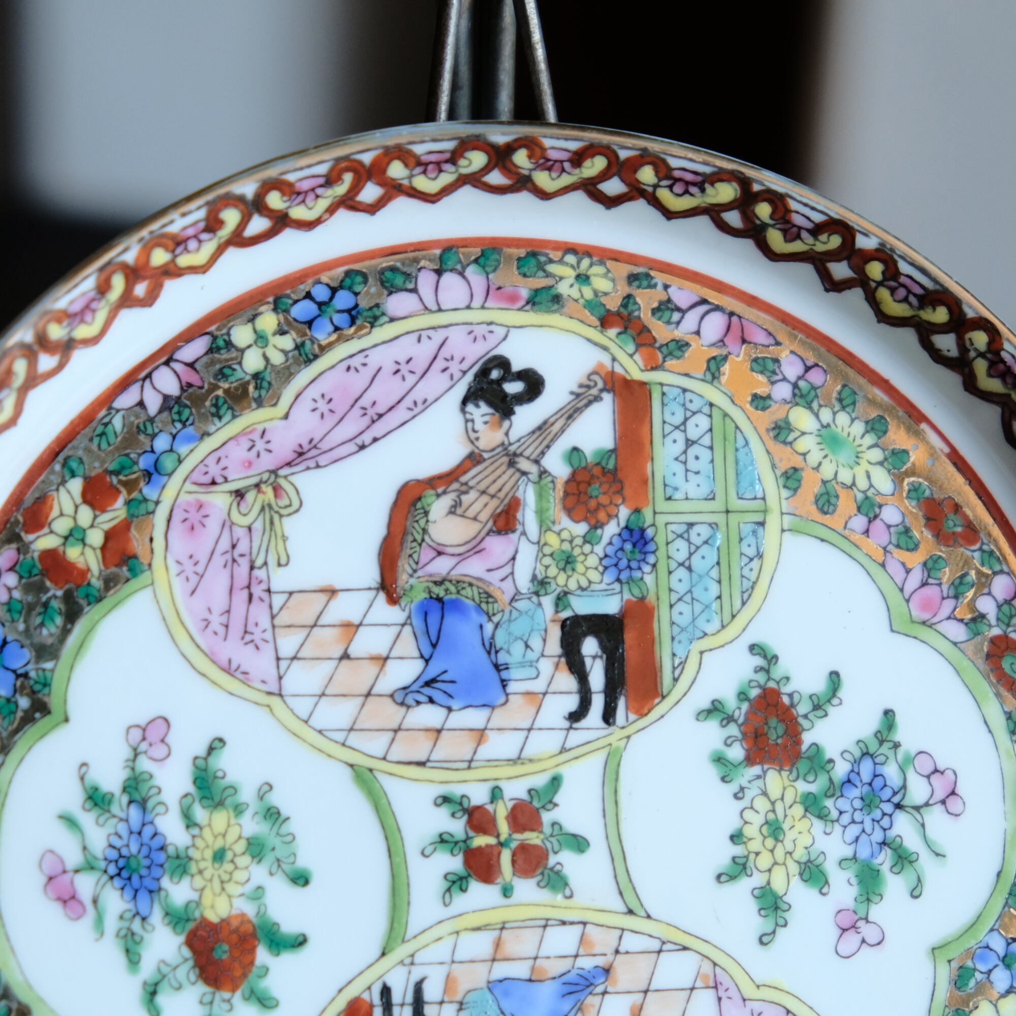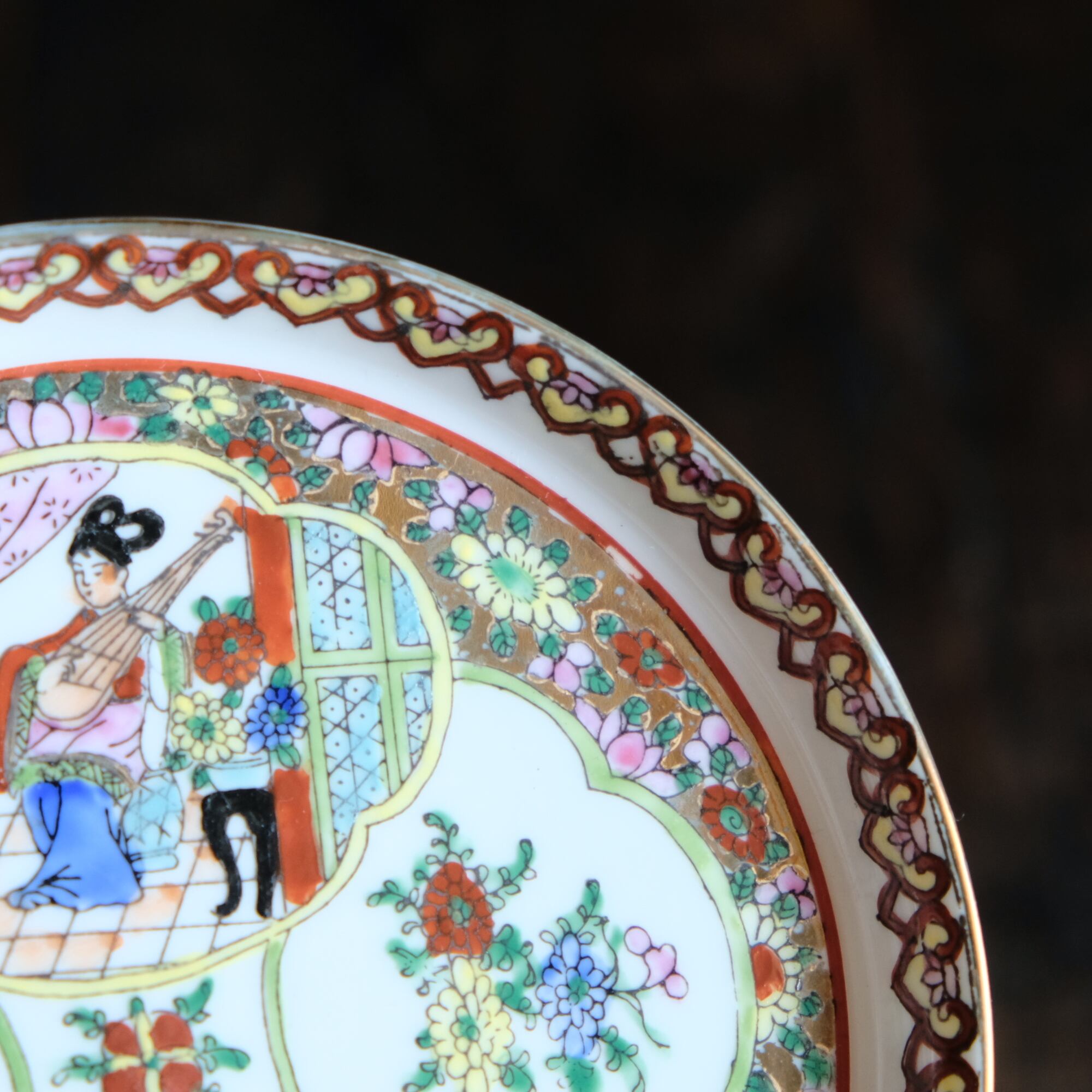 チャイナレトロで可愛い◆草花と琵琶を弾く天女。中国廣彩 色絵金彩中皿プレート シノワズリ 飾り皿 インテリア