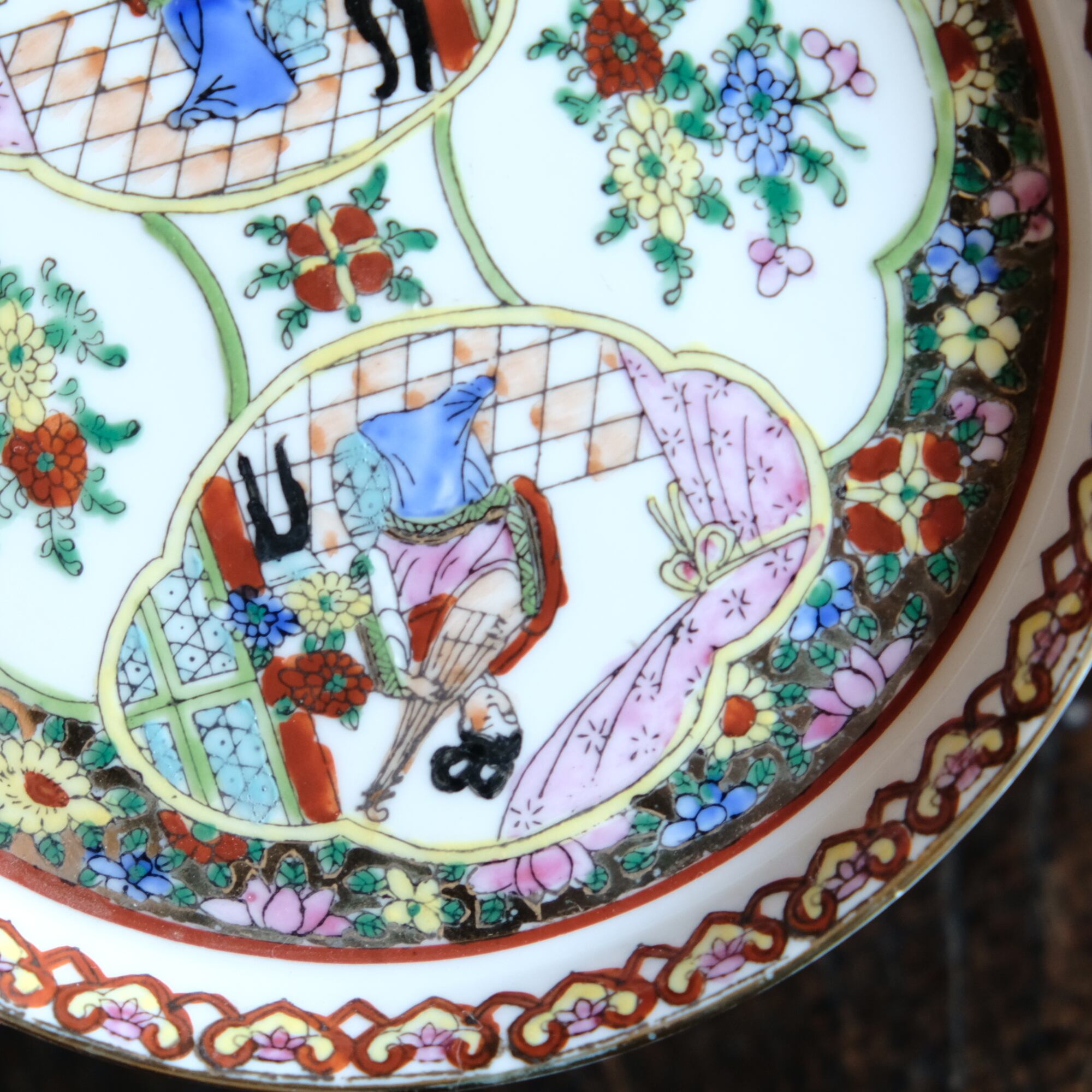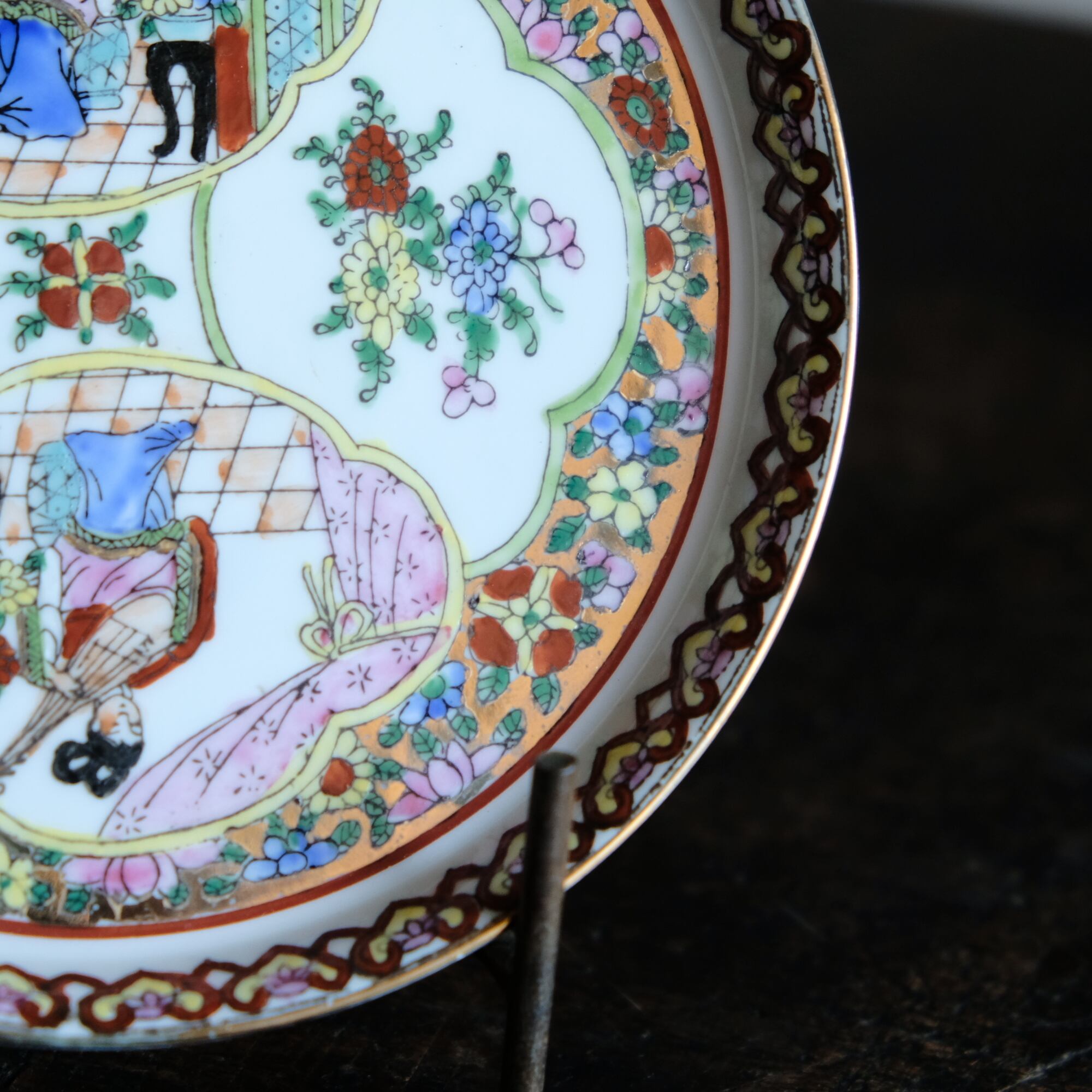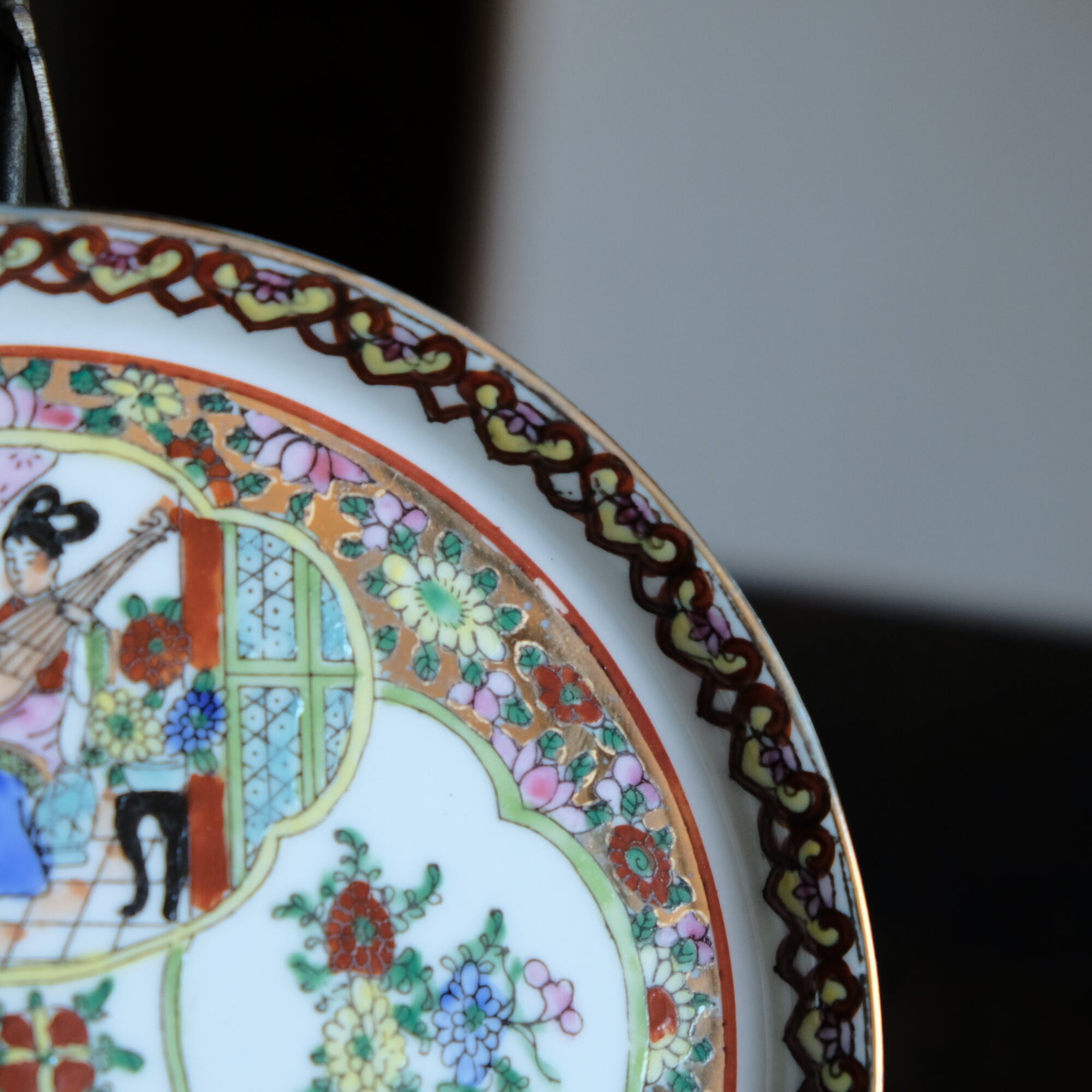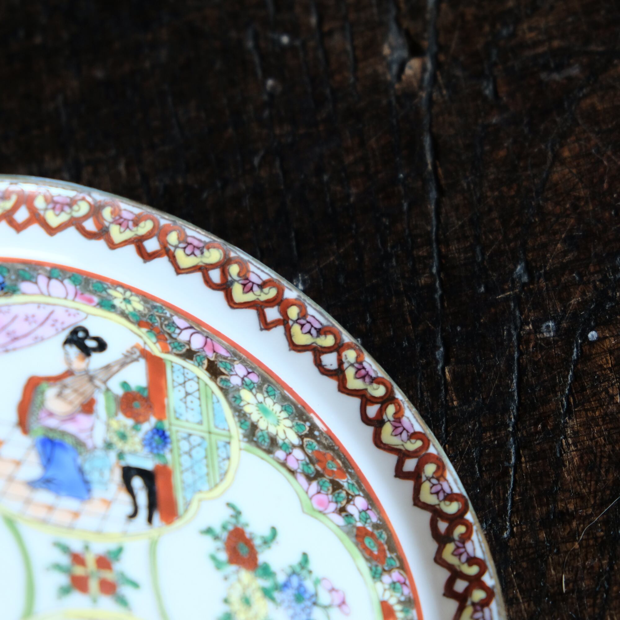 チャイナレトロで可愛い◆草花と琵琶を弾く天女。中国廣彩 色絵金彩中皿プレート シノワズリ 飾り皿 インテリア