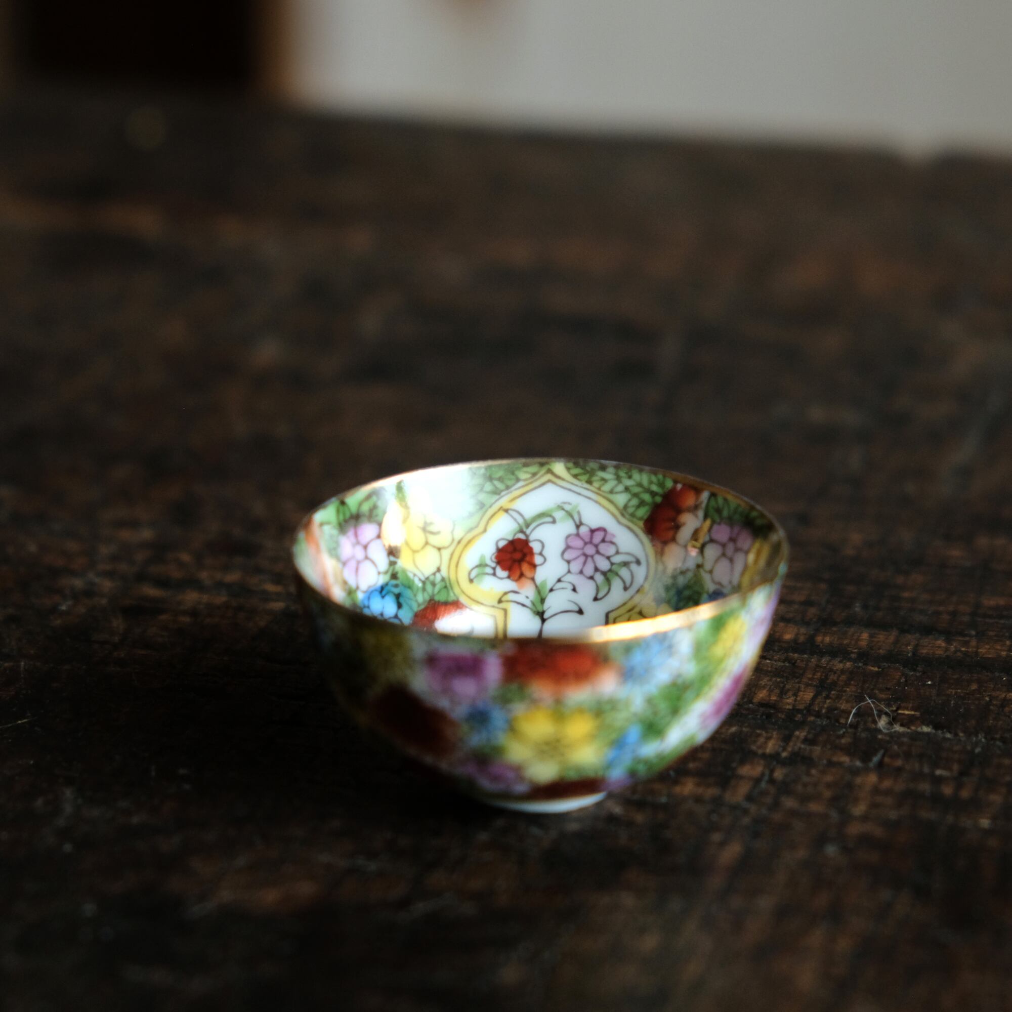 内側は金メッキの上に、側面は白地の上にこれでもかという程のカラフルな草花尽くし。