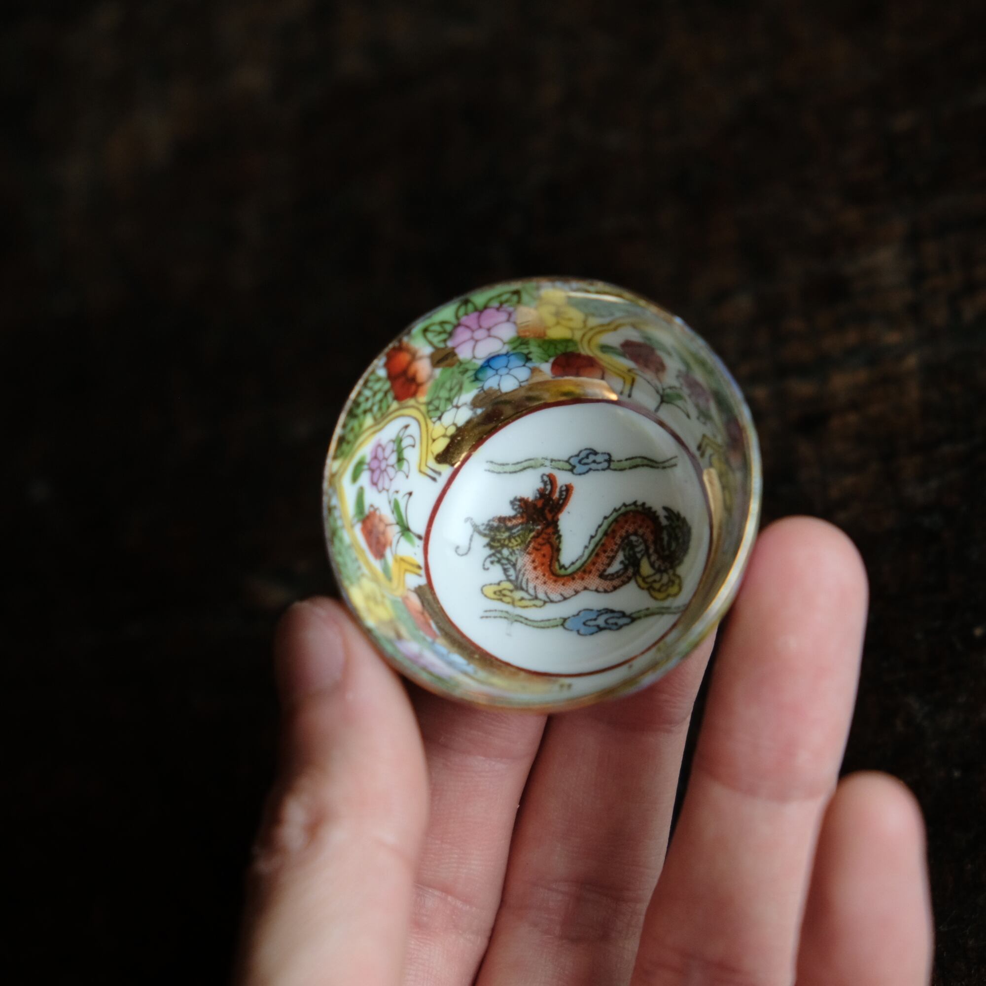 見込みに龍(辰)◆中国産 made in china 干支文色絵金彩小ぶり猪口 茶杯 花尽くし。シノワズリ チャイナレトロ b1