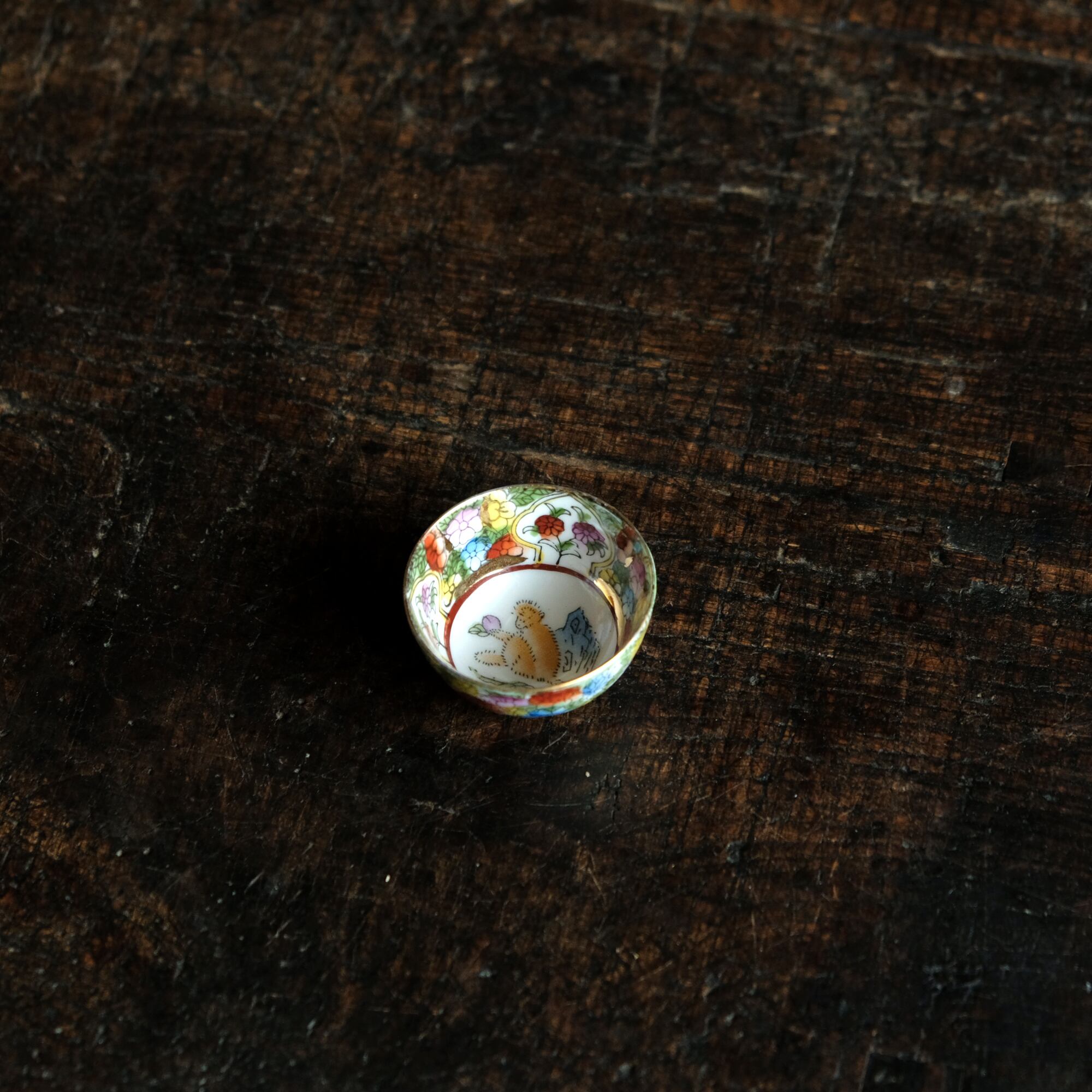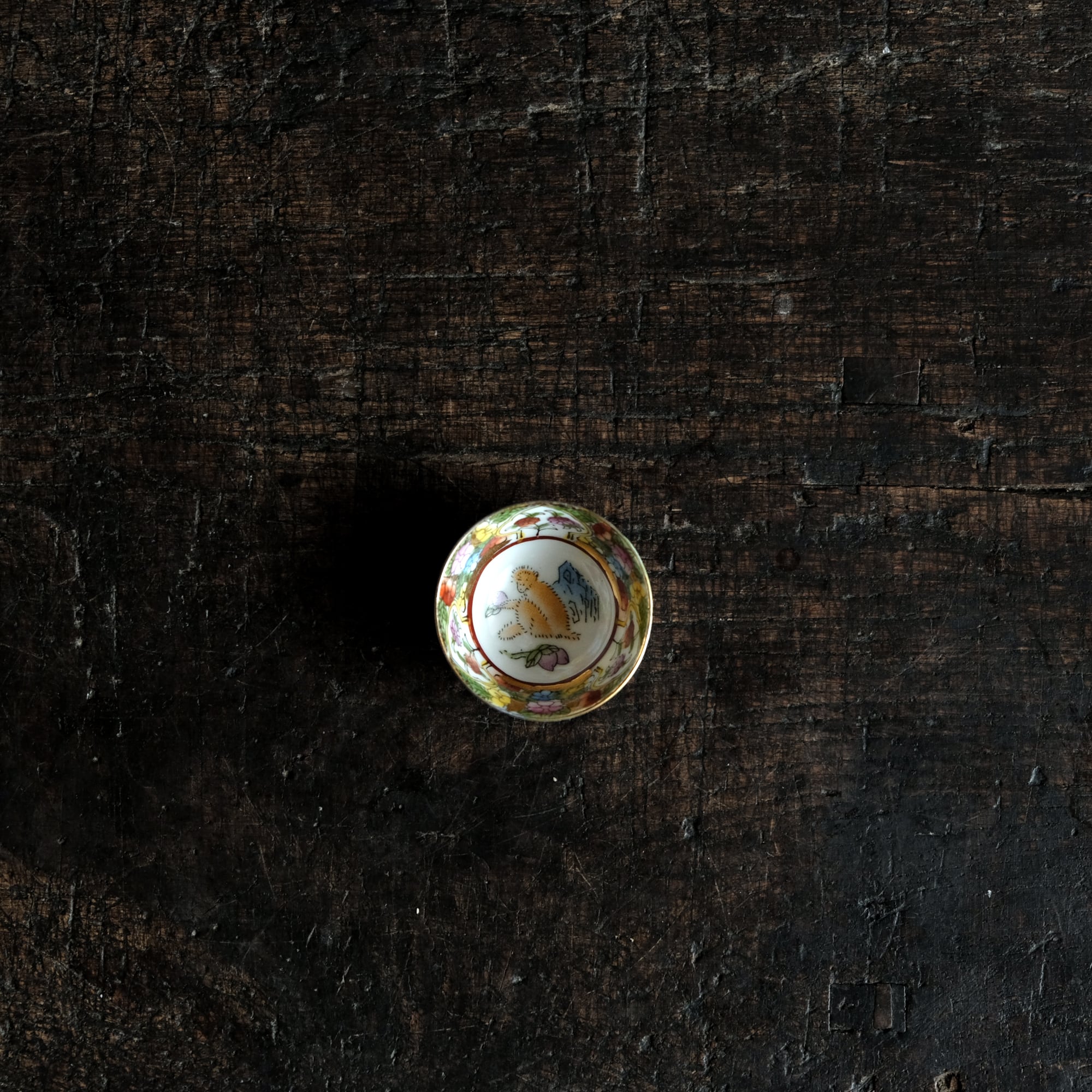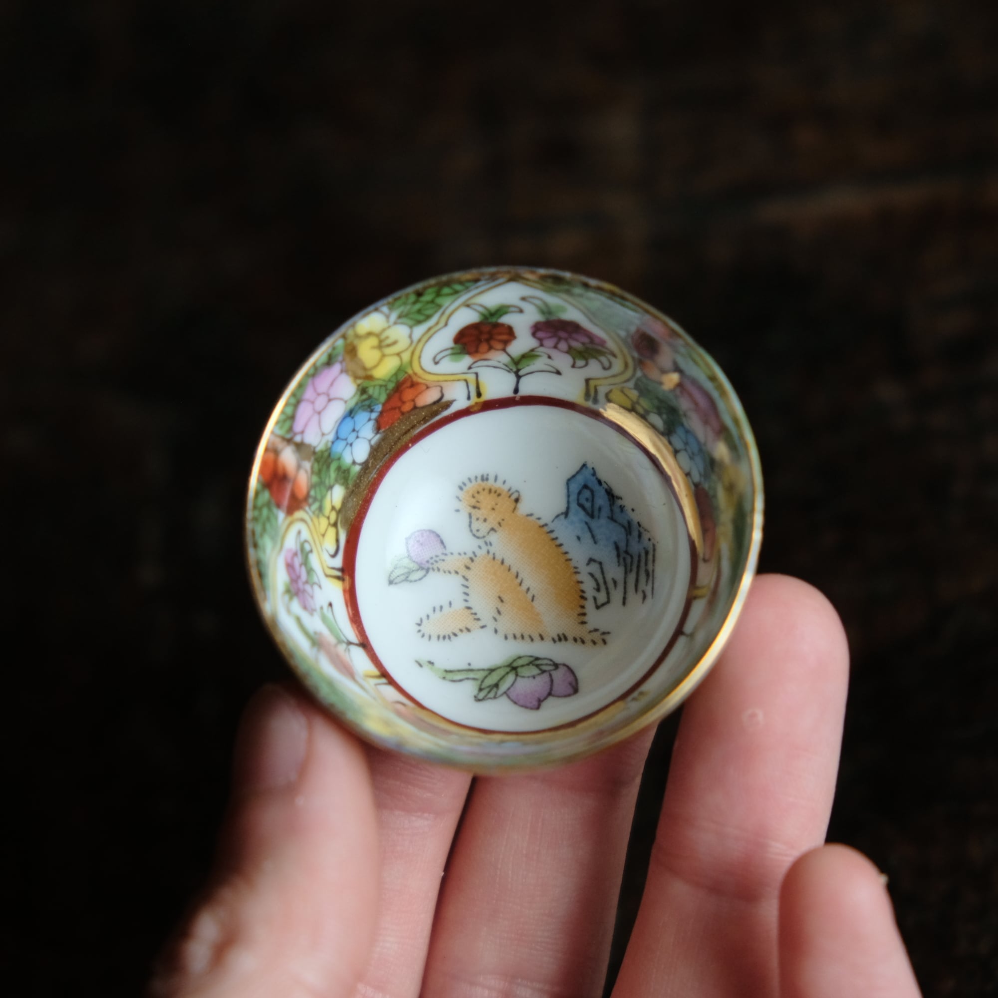 見込みに猿(申)◆中国産 made in china 干支文色絵金彩小ぶり猪口 茶杯 花尽くし。シノワズリ チャイナレトロ b1