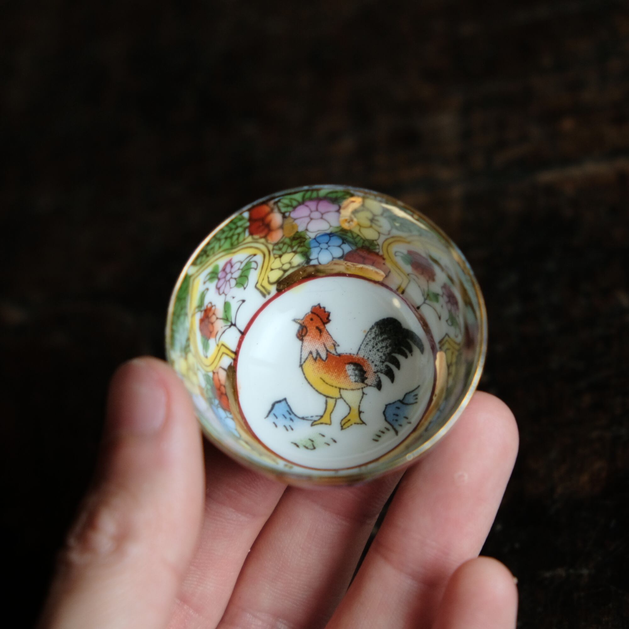 見込みに鶏(酉)◆中国産 made in china 干支文色絵金彩小ぶり猪口 茶杯 花尽くし。シノワズリ チャイナレトロ b1
