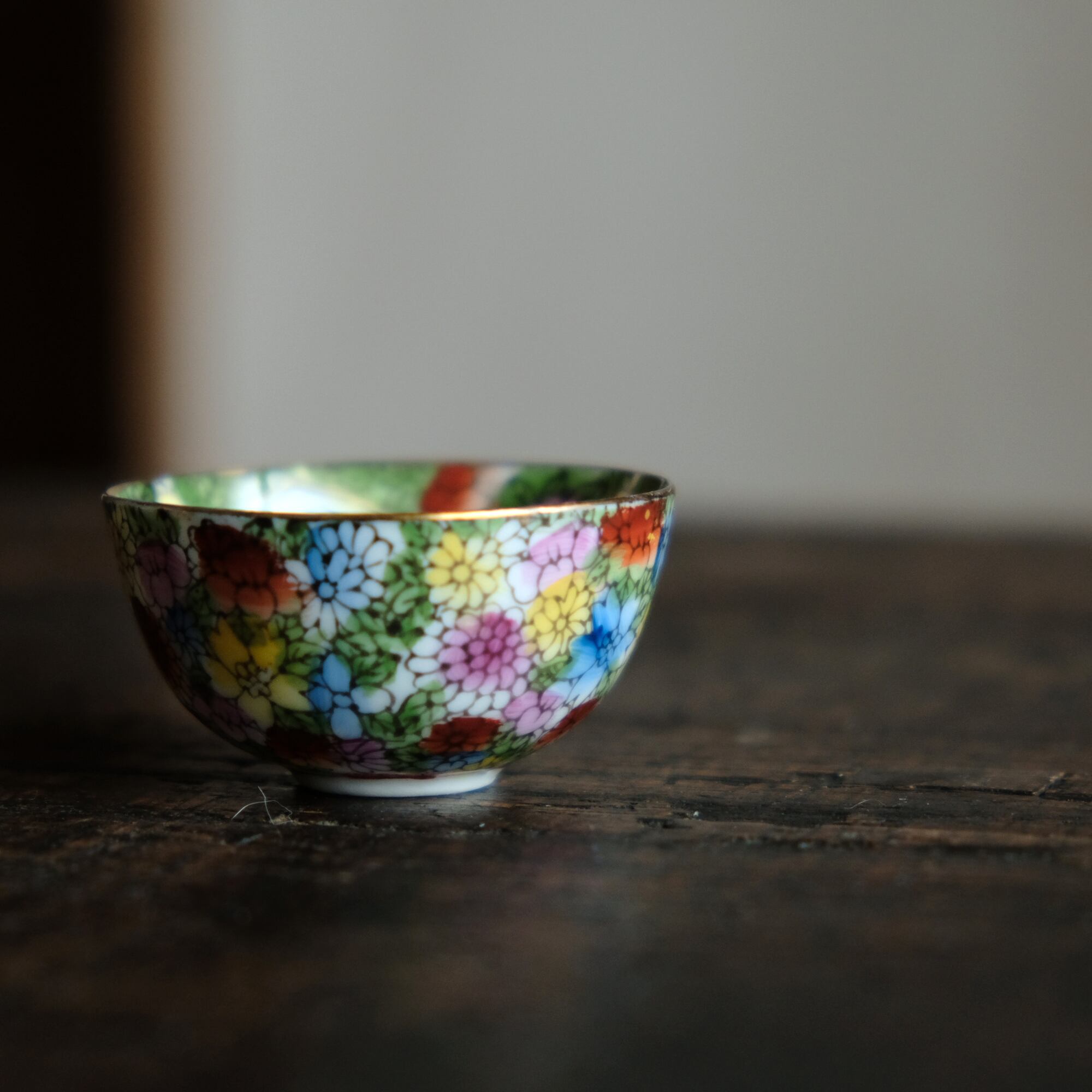 内側は金メッキの上に、側面は白地の上にこれでもかという程のカラフルな草花尽くし。