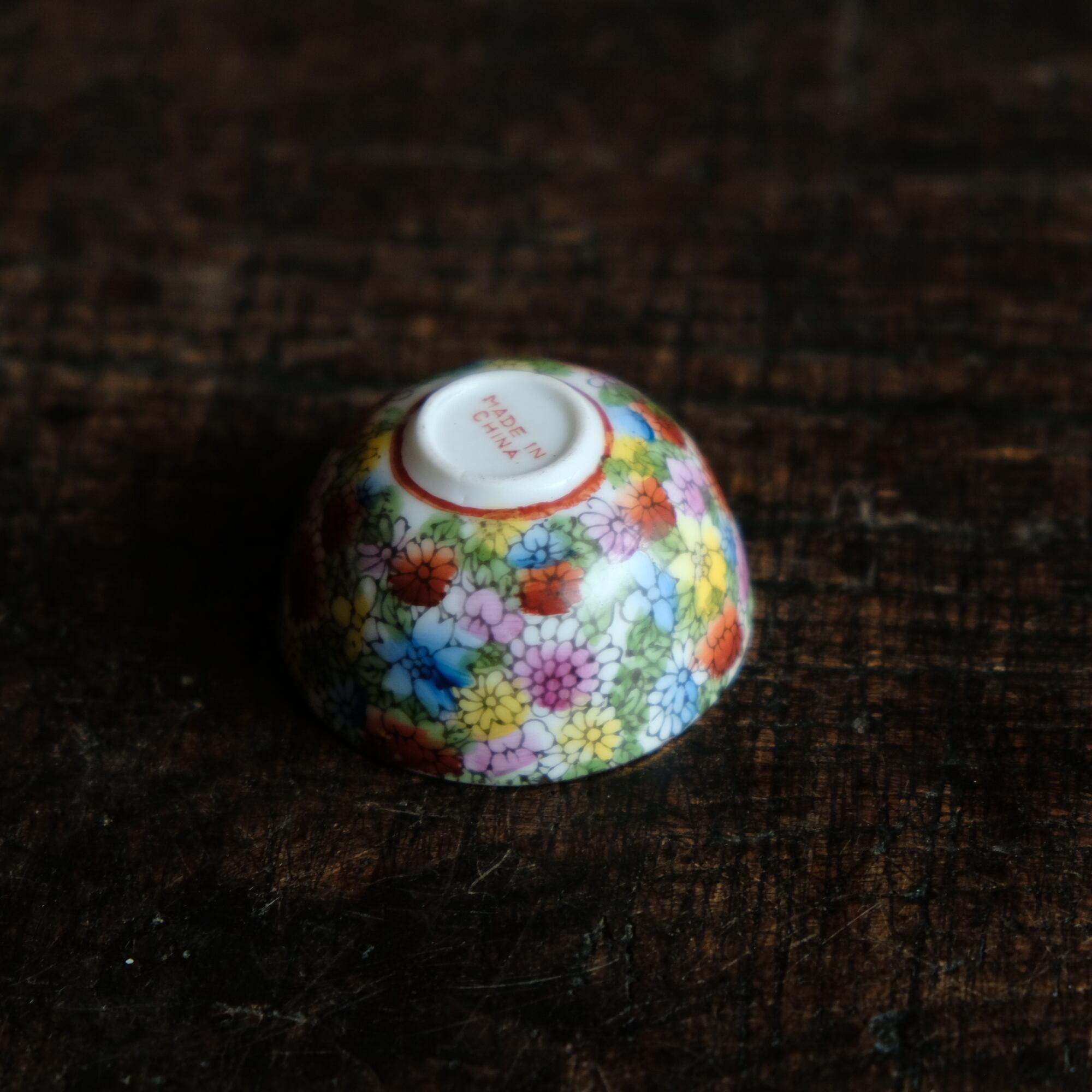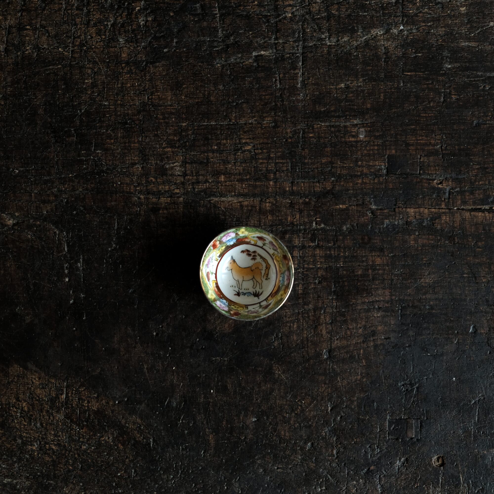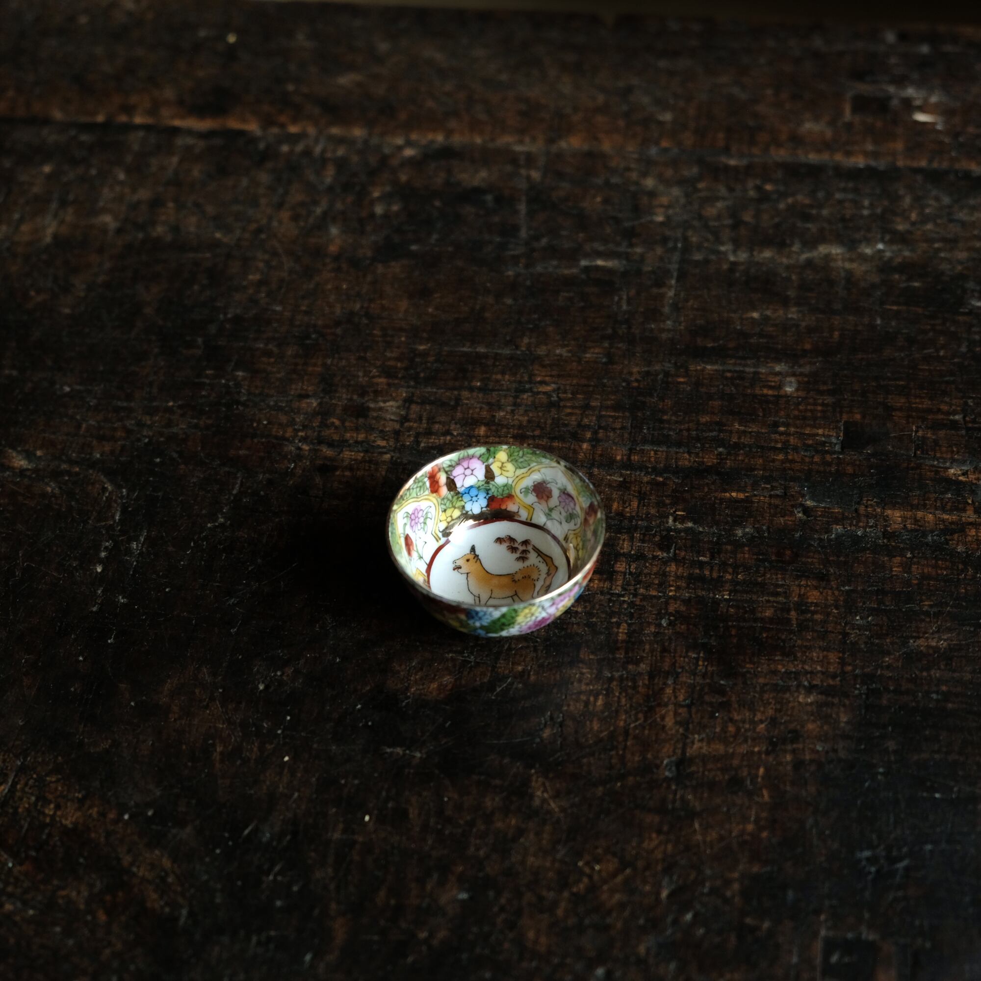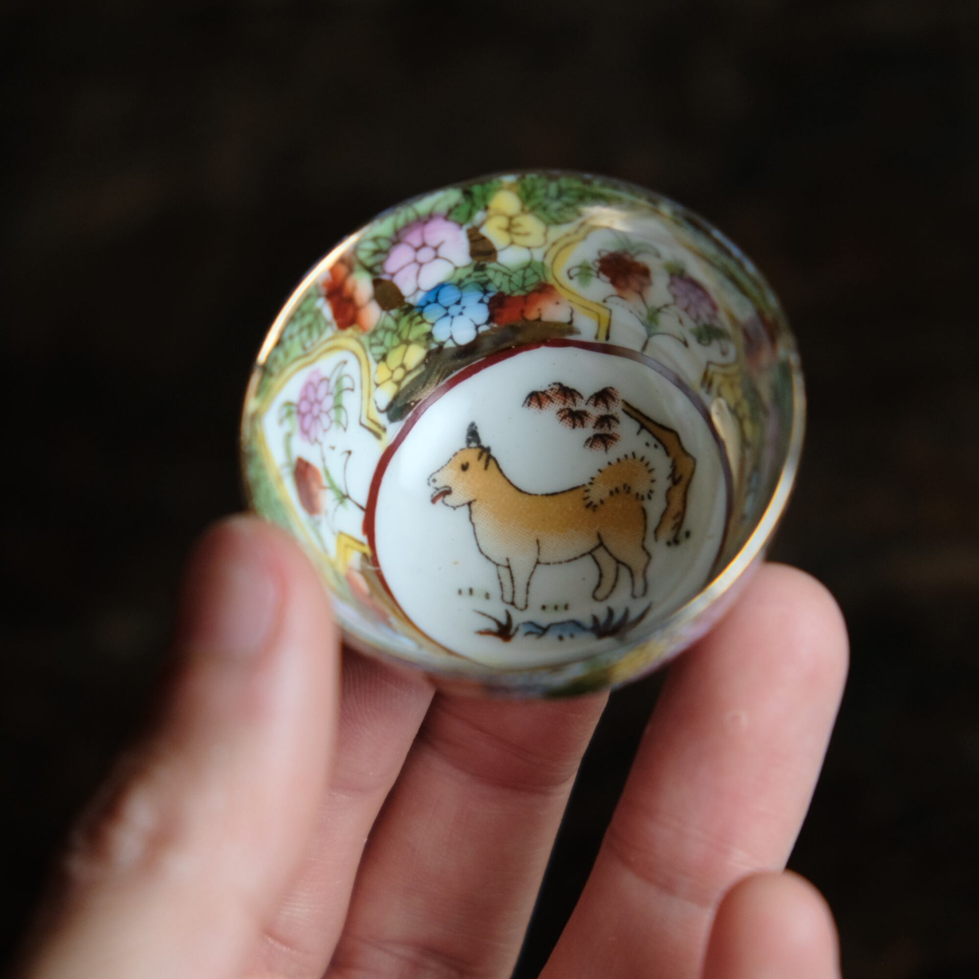 見込みに犬(戌)◆中国産 made in china 干支文色絵金彩小ぶり猪口 茶杯 花尽くし。シノワズリ チャイナレトロ b1