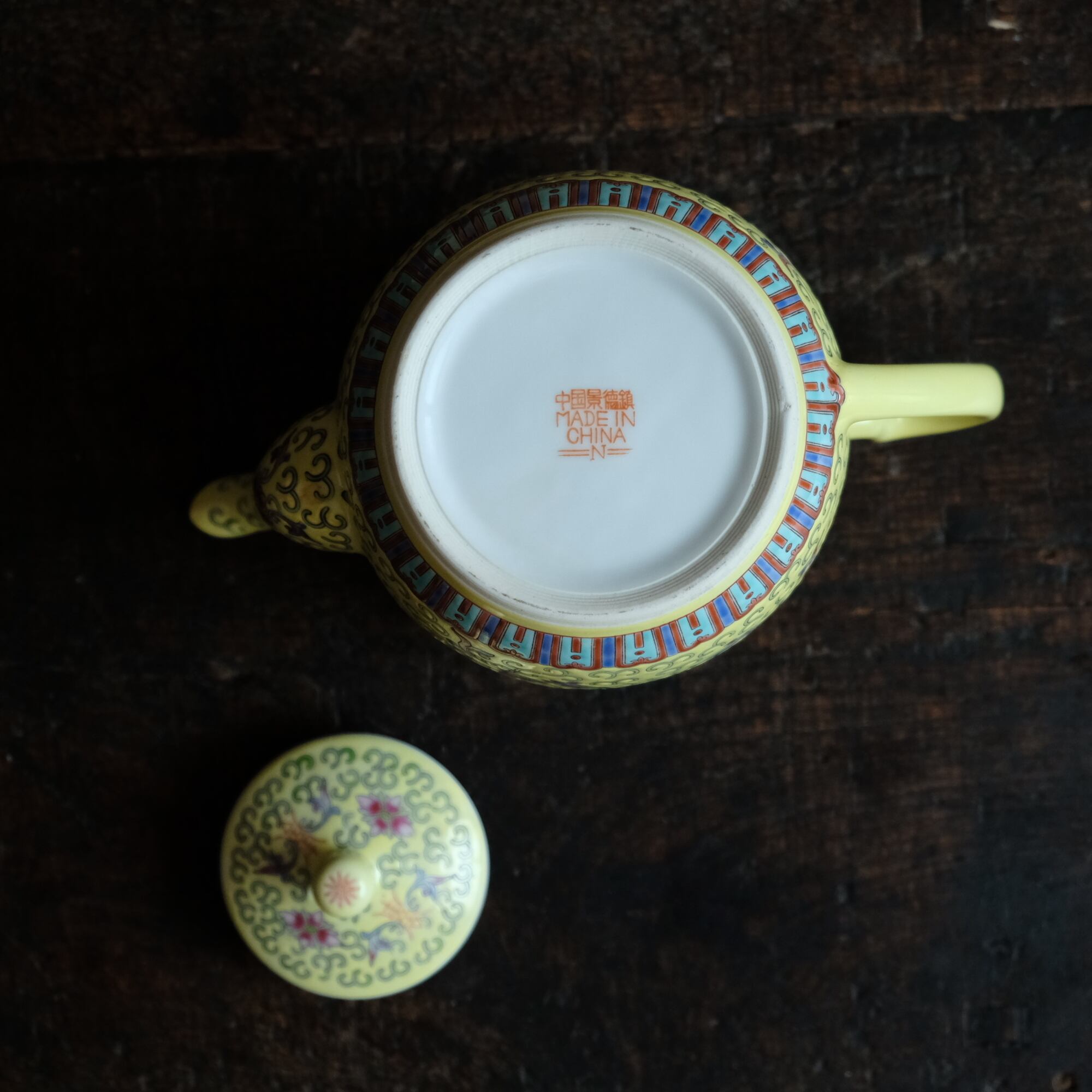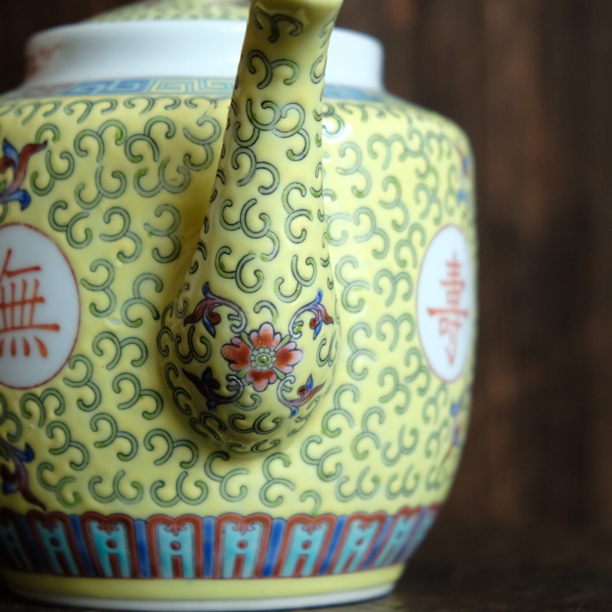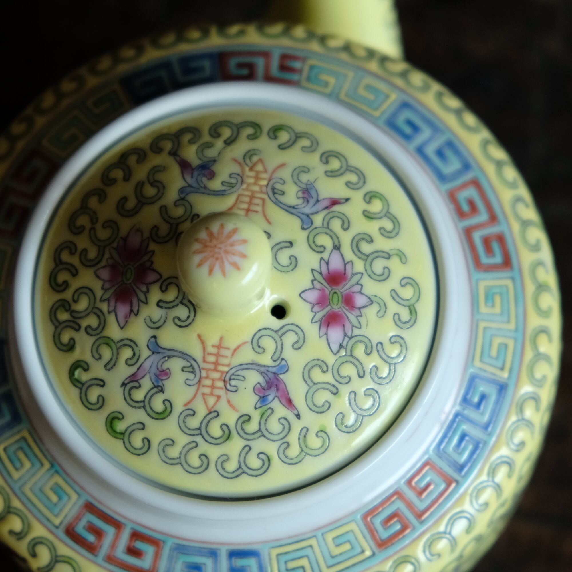 中国景徳鎮◆萬寿無疆。花唐草文色絵急須 茶器 黄色 チャイナレトロ パステルカラー シノワズリ