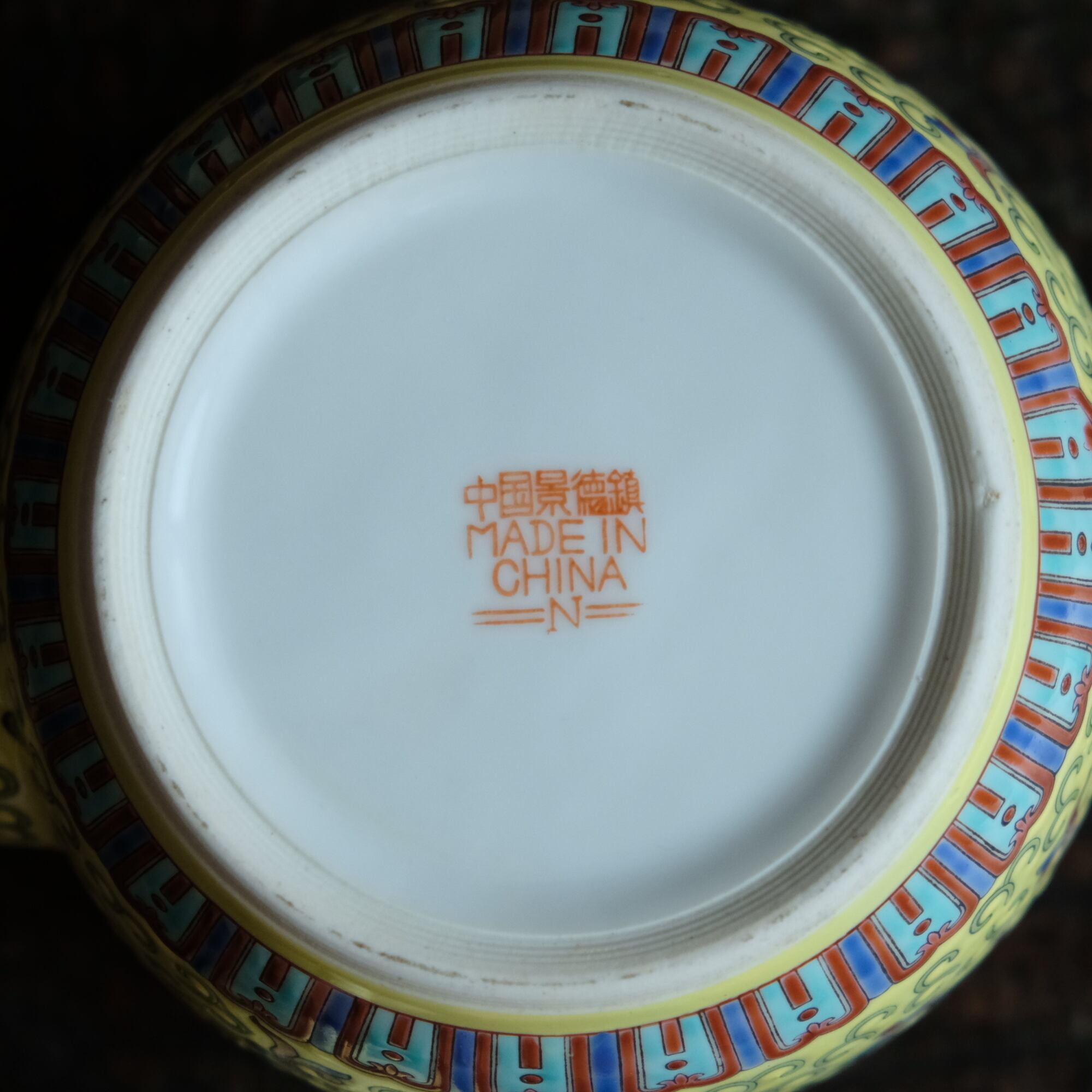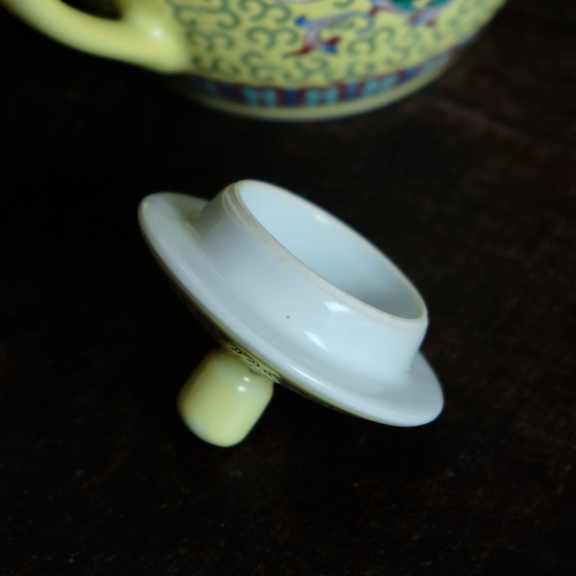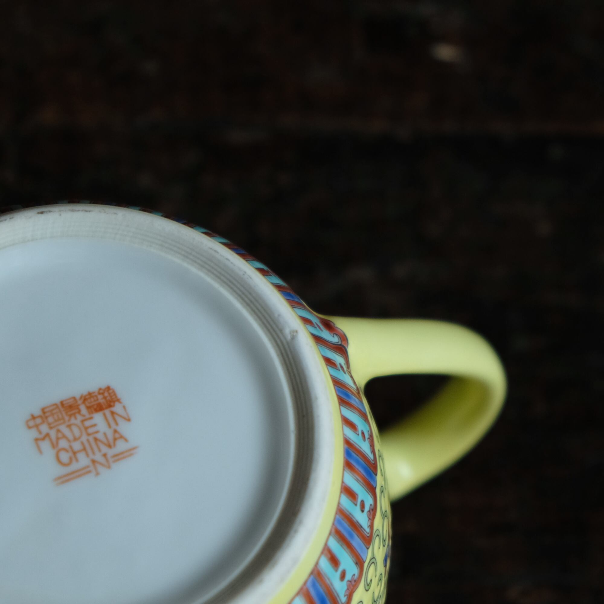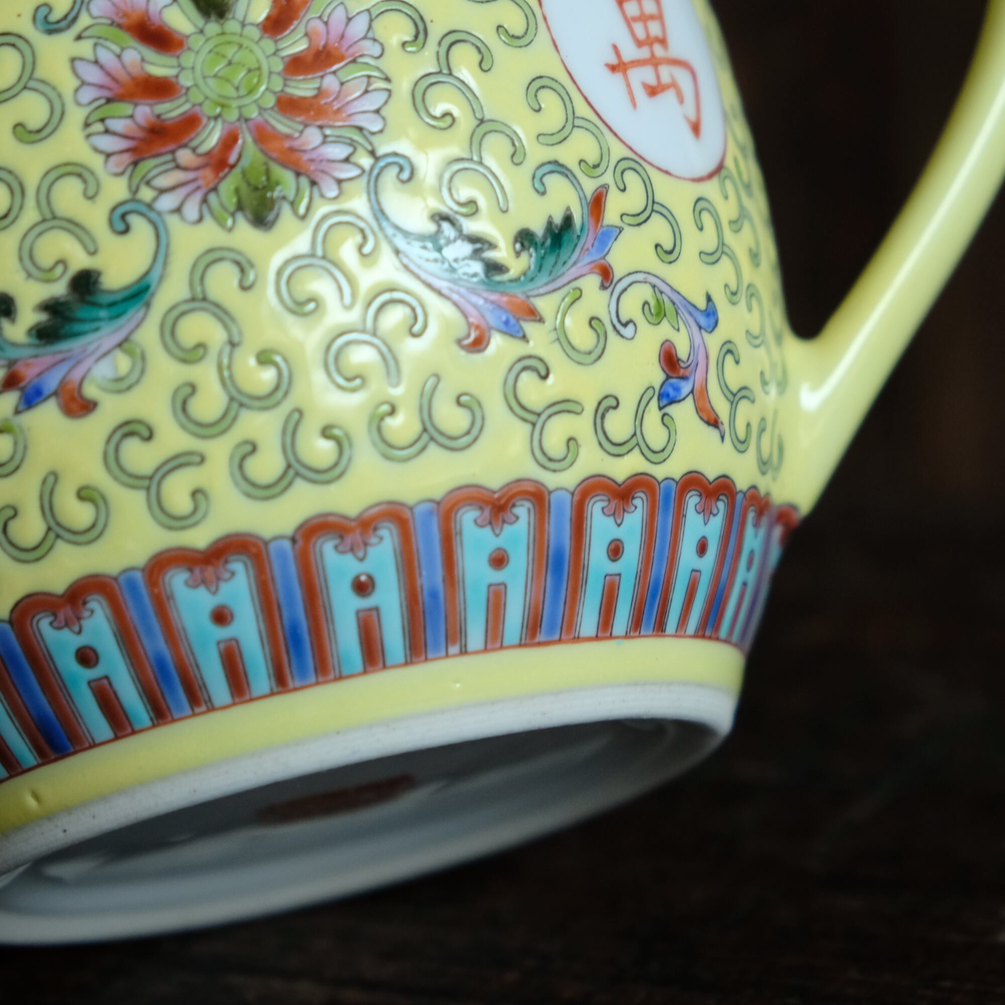 中国景徳鎮◆萬寿無疆。花唐草文色絵急須 茶器 黄色 チャイナレトロ パステルカラー シノワズリ