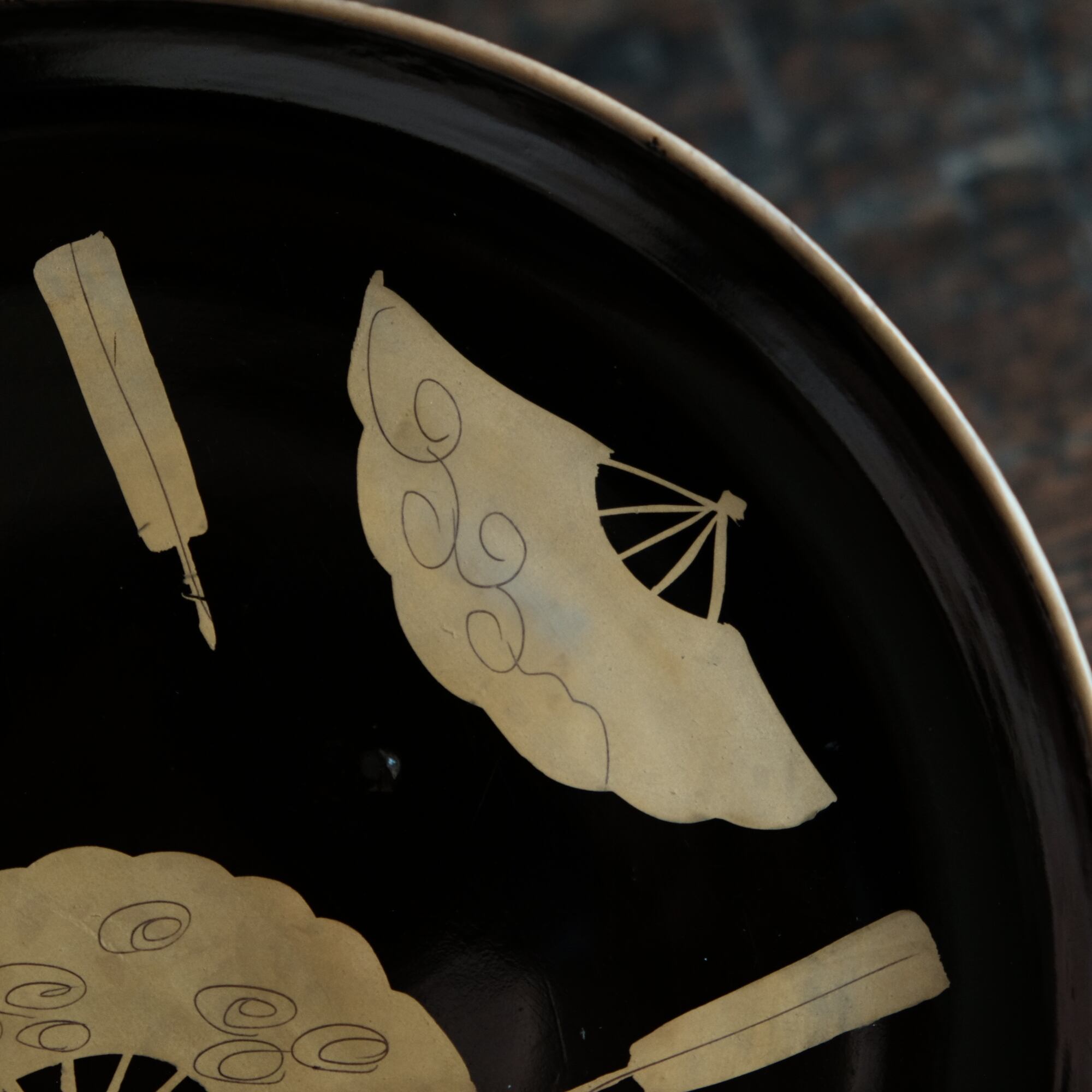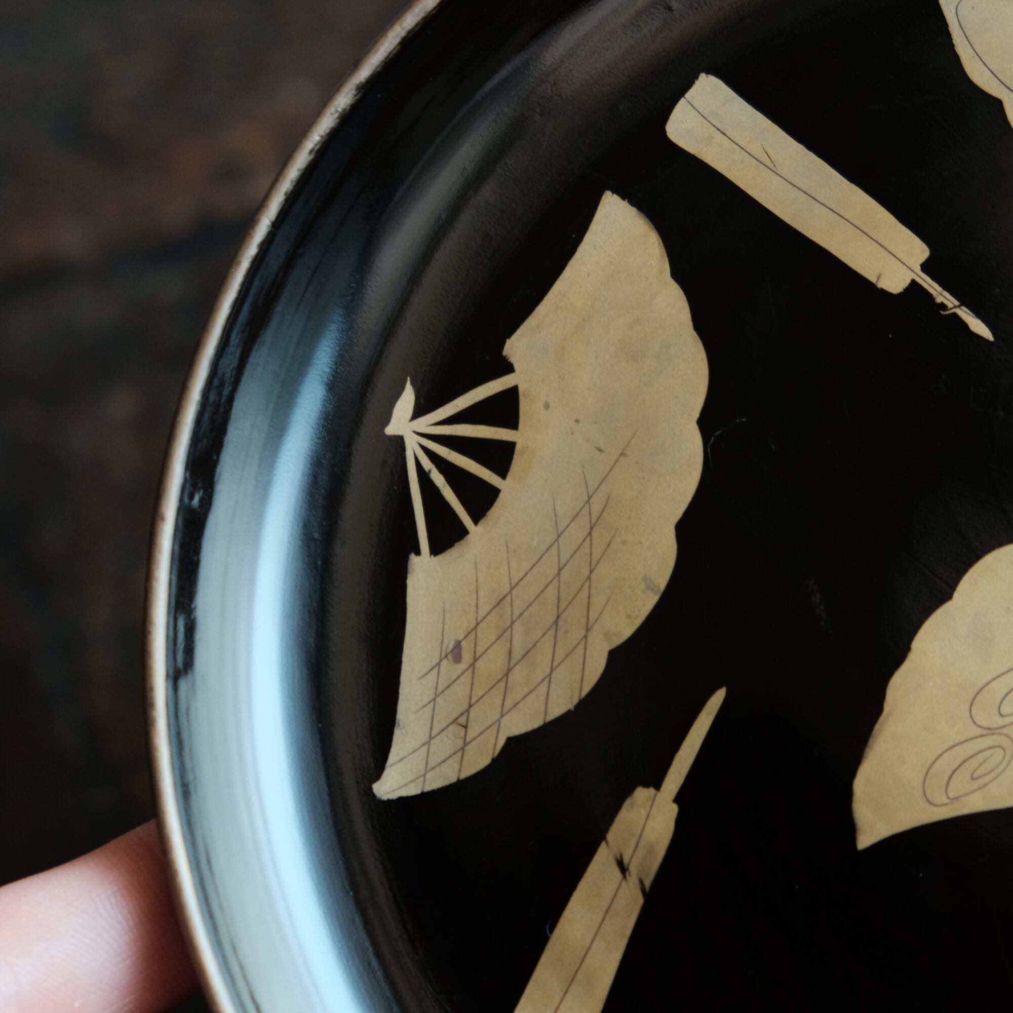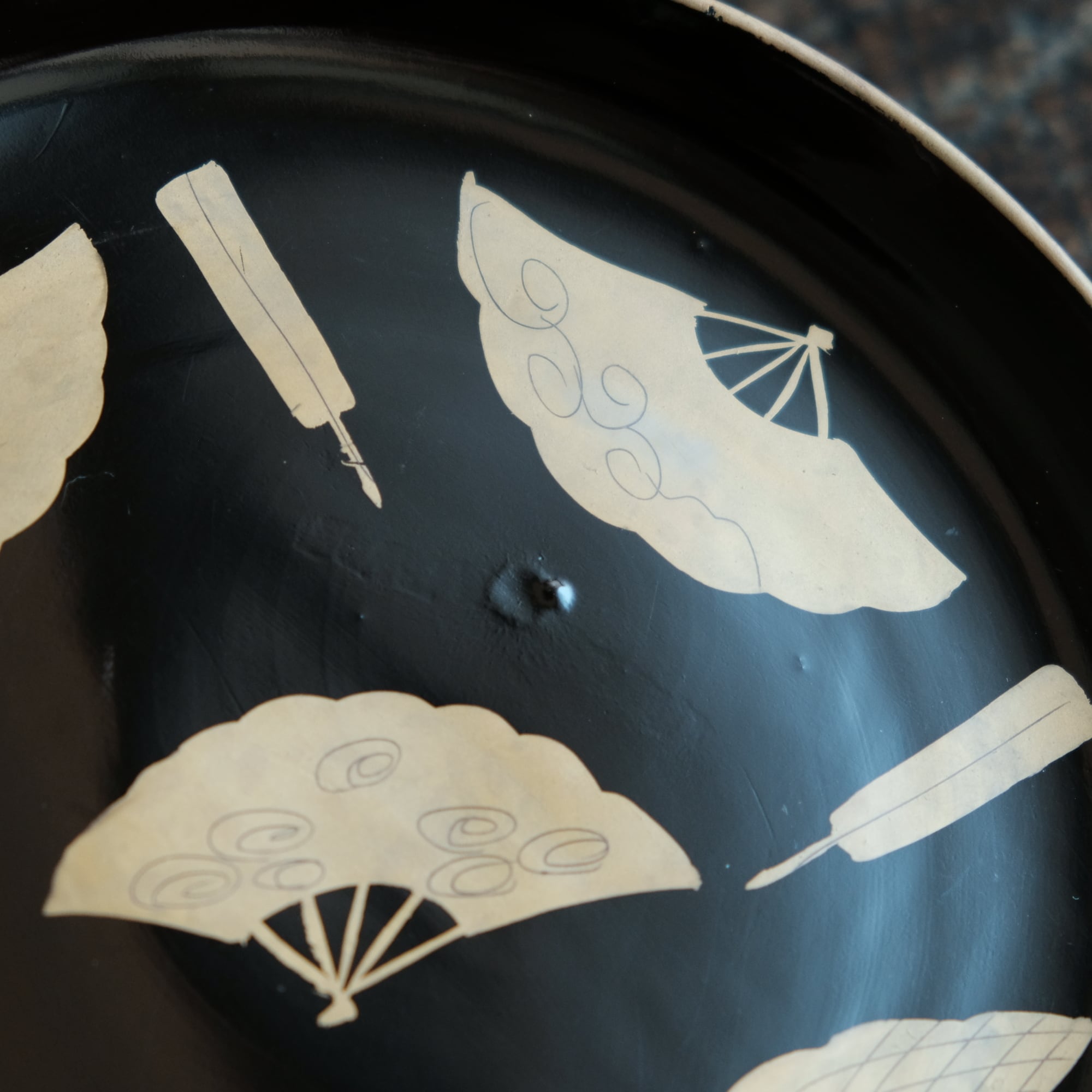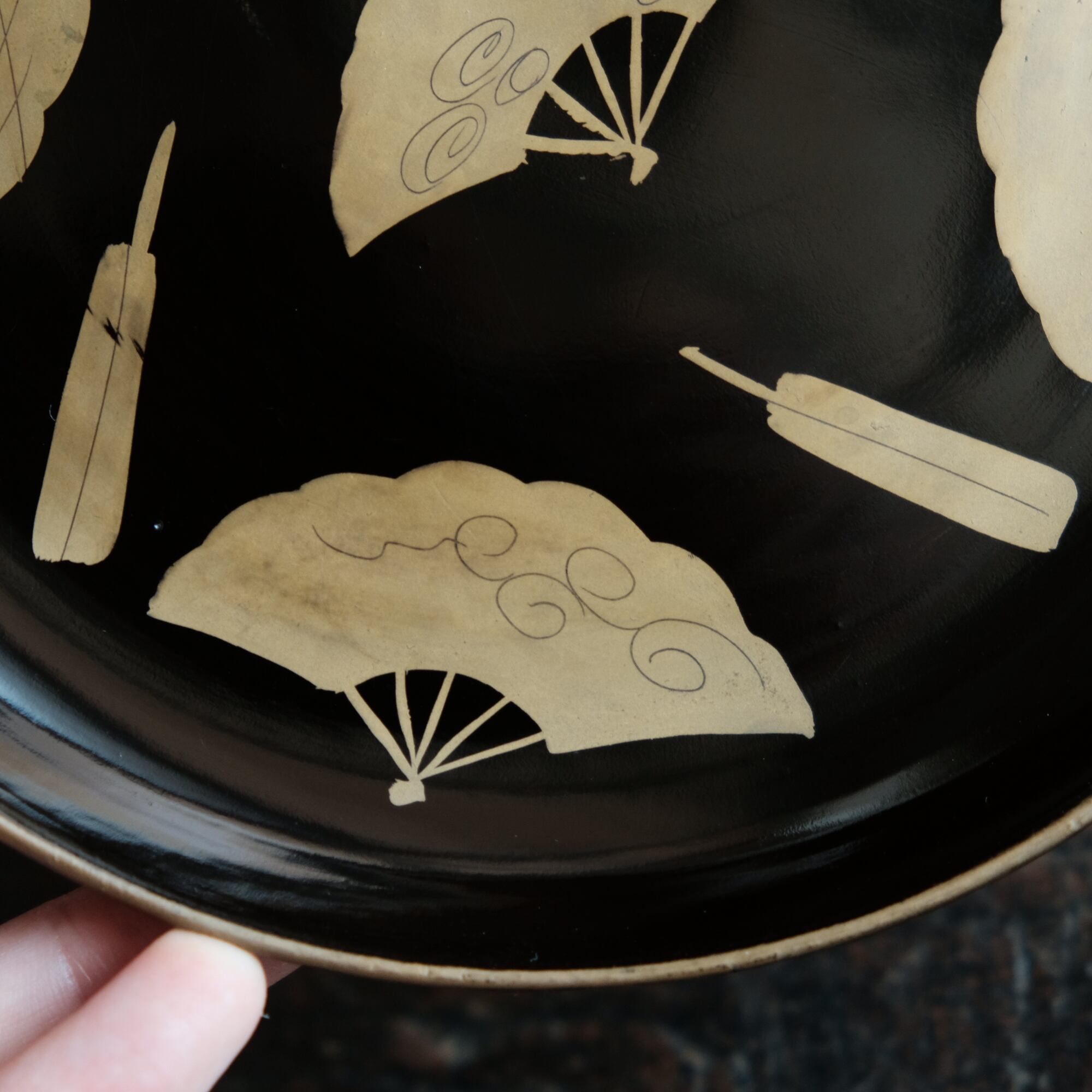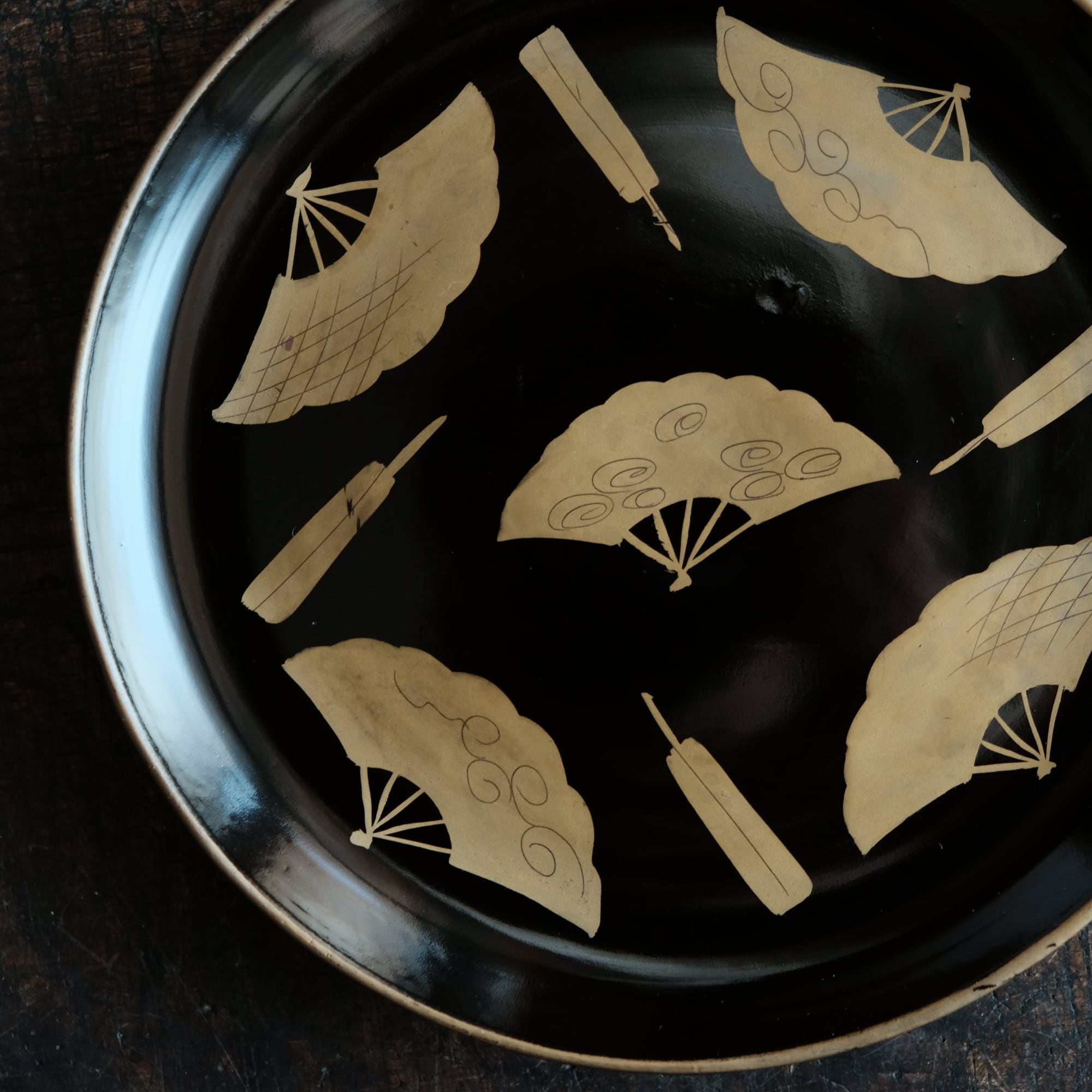 可愛らしい扇子の絵◆時代物 扇子文漆芸蒔絵中皿 漆器 骨董/antiques 古民家 時代物 明治時代 i2
