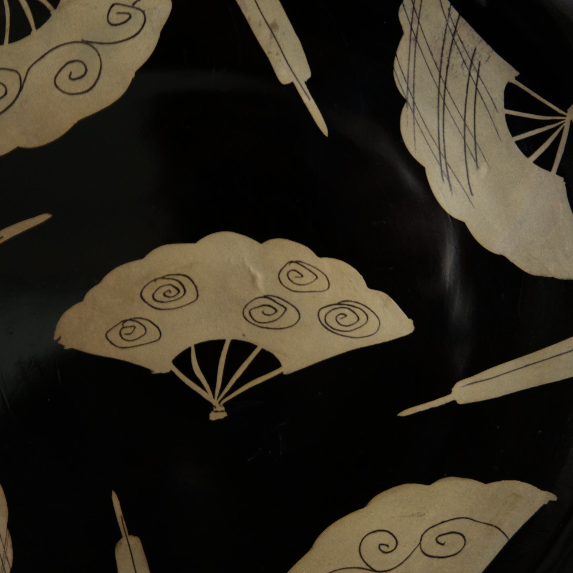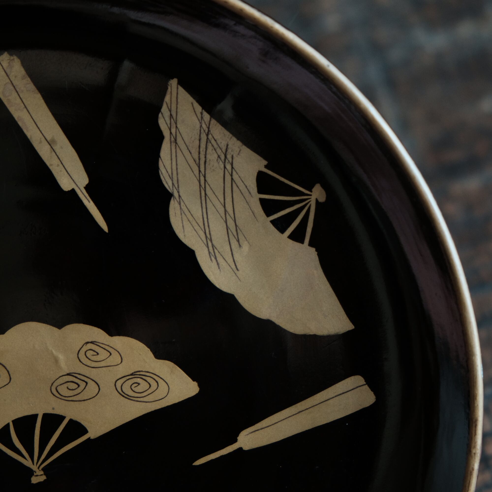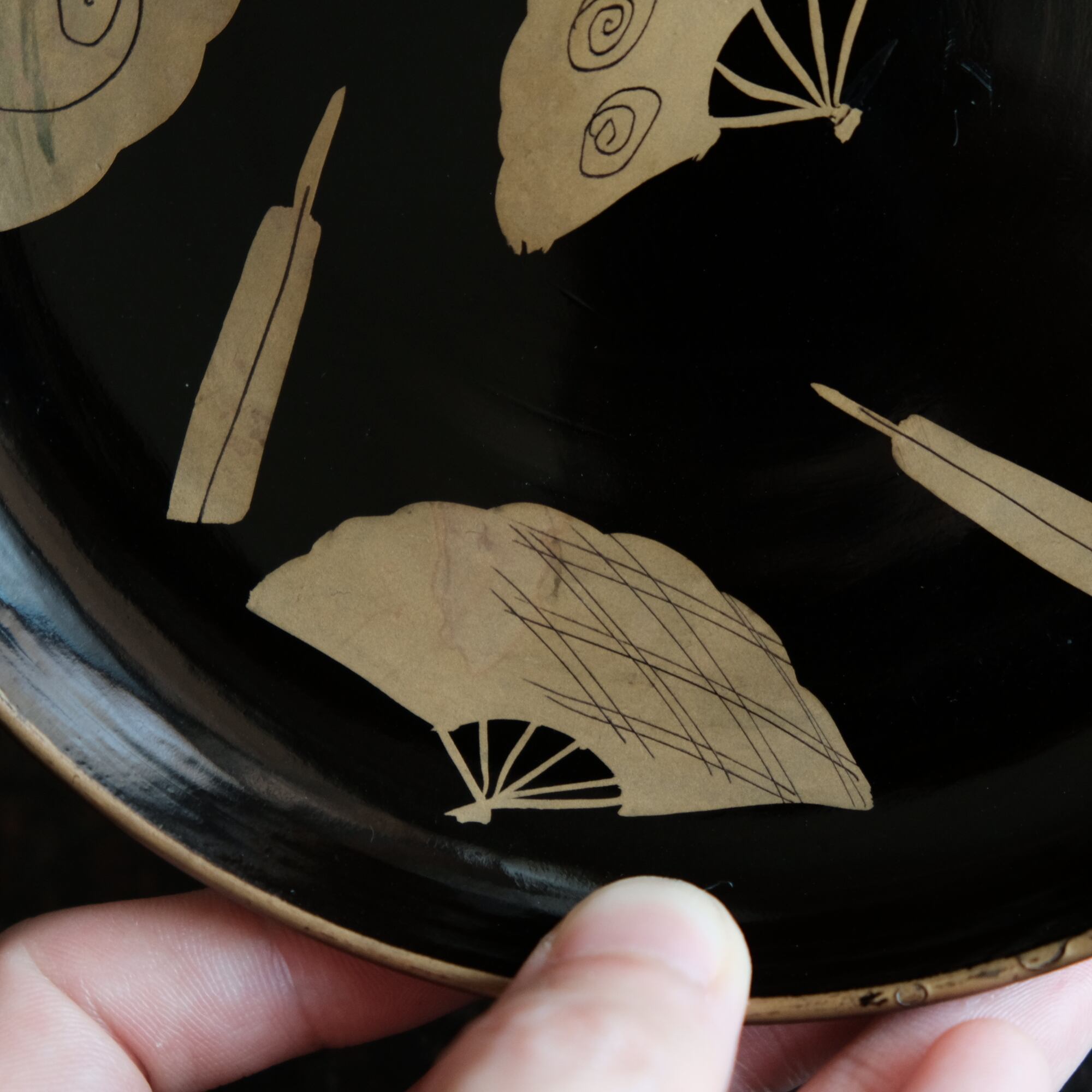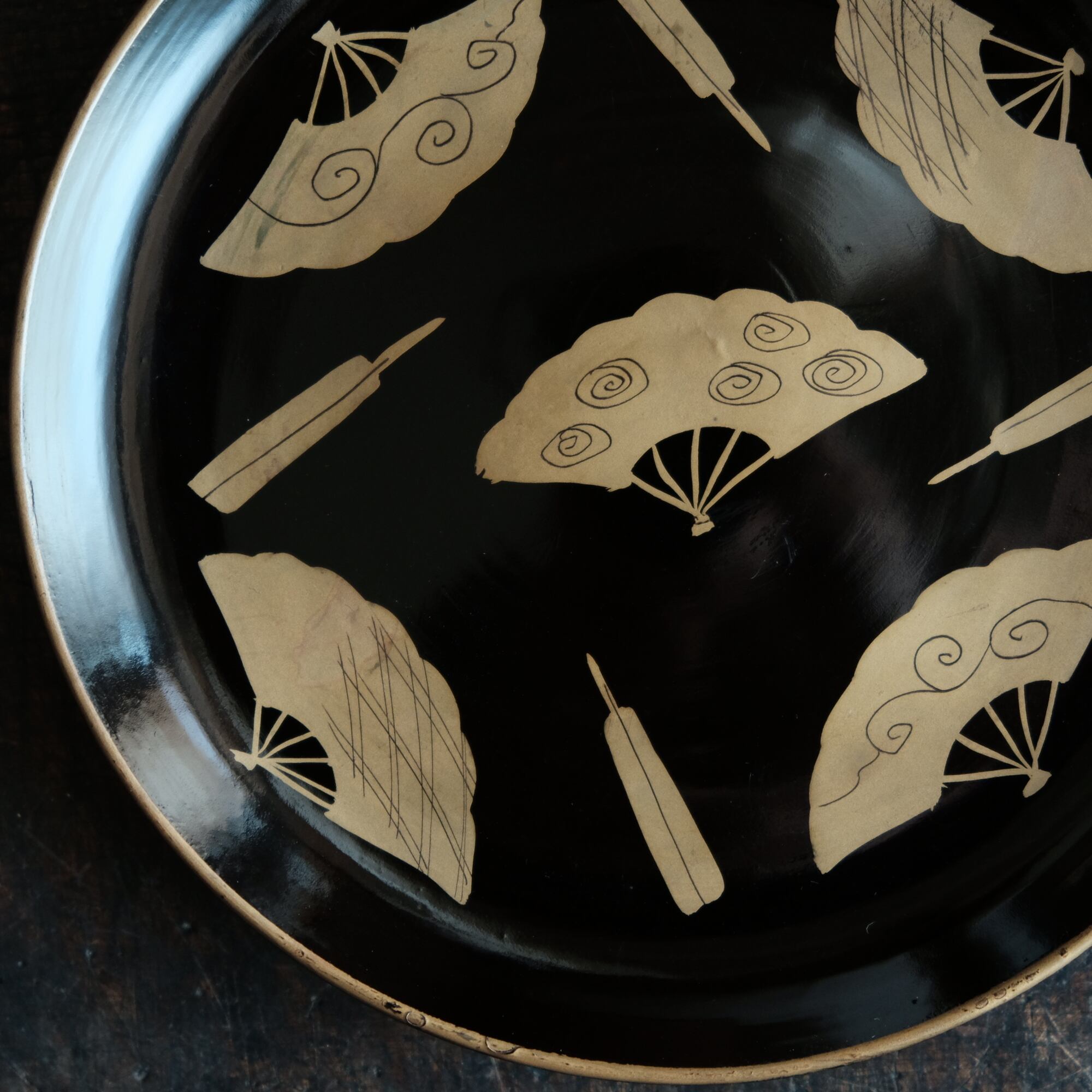 黒地にとても可愛らしい雰囲気の扇子の絵付けが素敵な中皿になります。