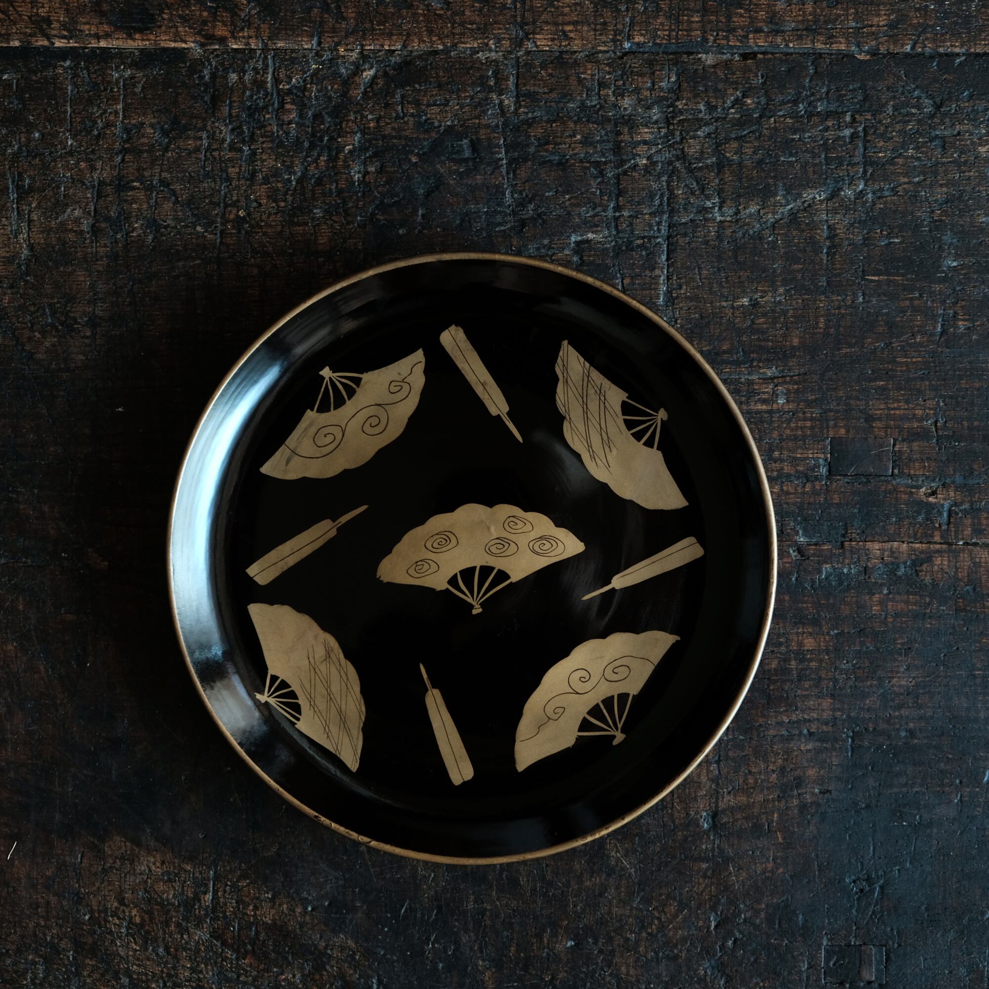 可愛らしい扇子の絵◆時代物 扇子文漆芸蒔絵中皿 漆器 骨董/antiques 古民家 時代物 明治時代 i3