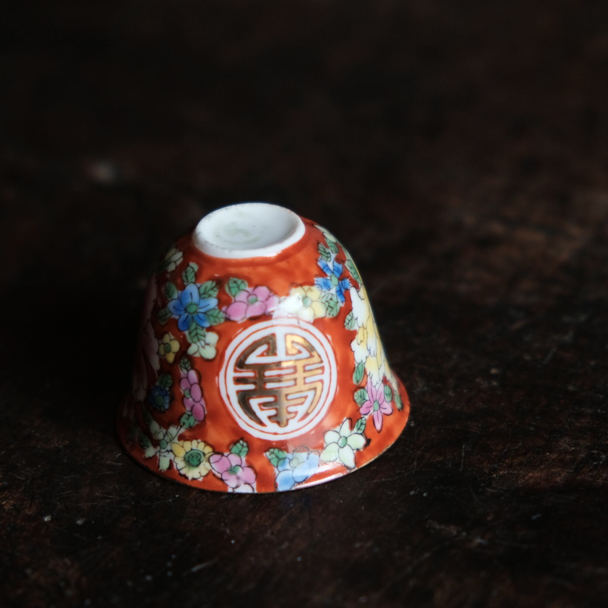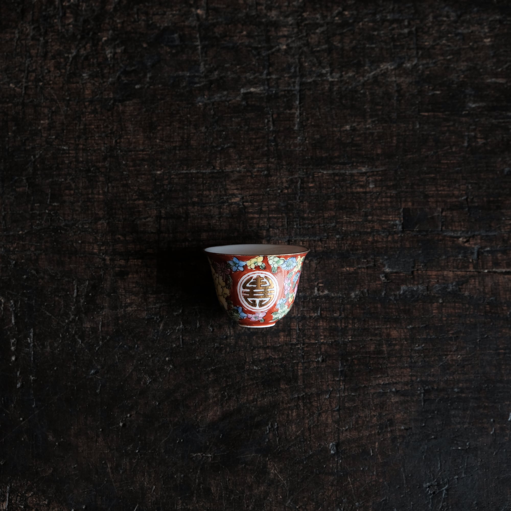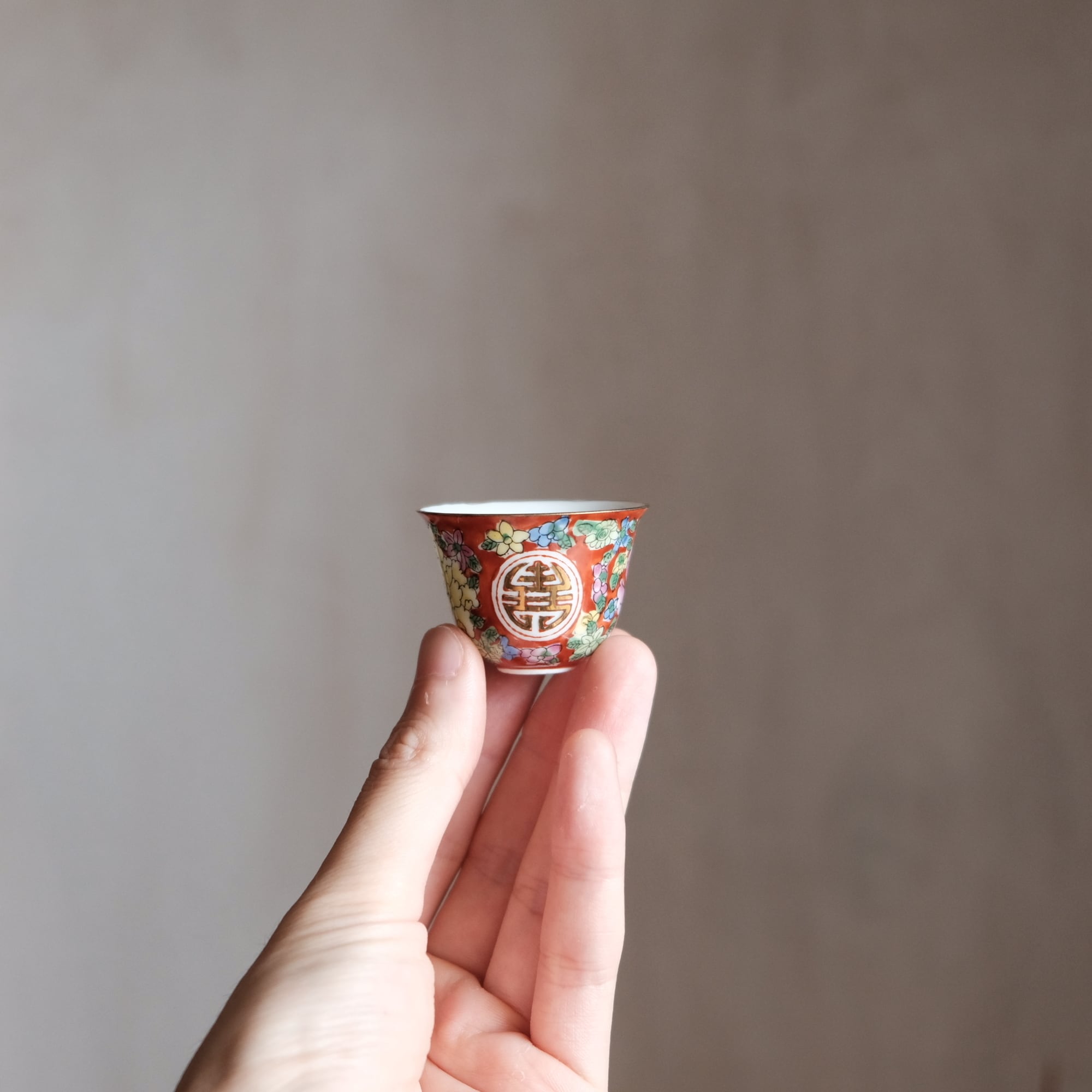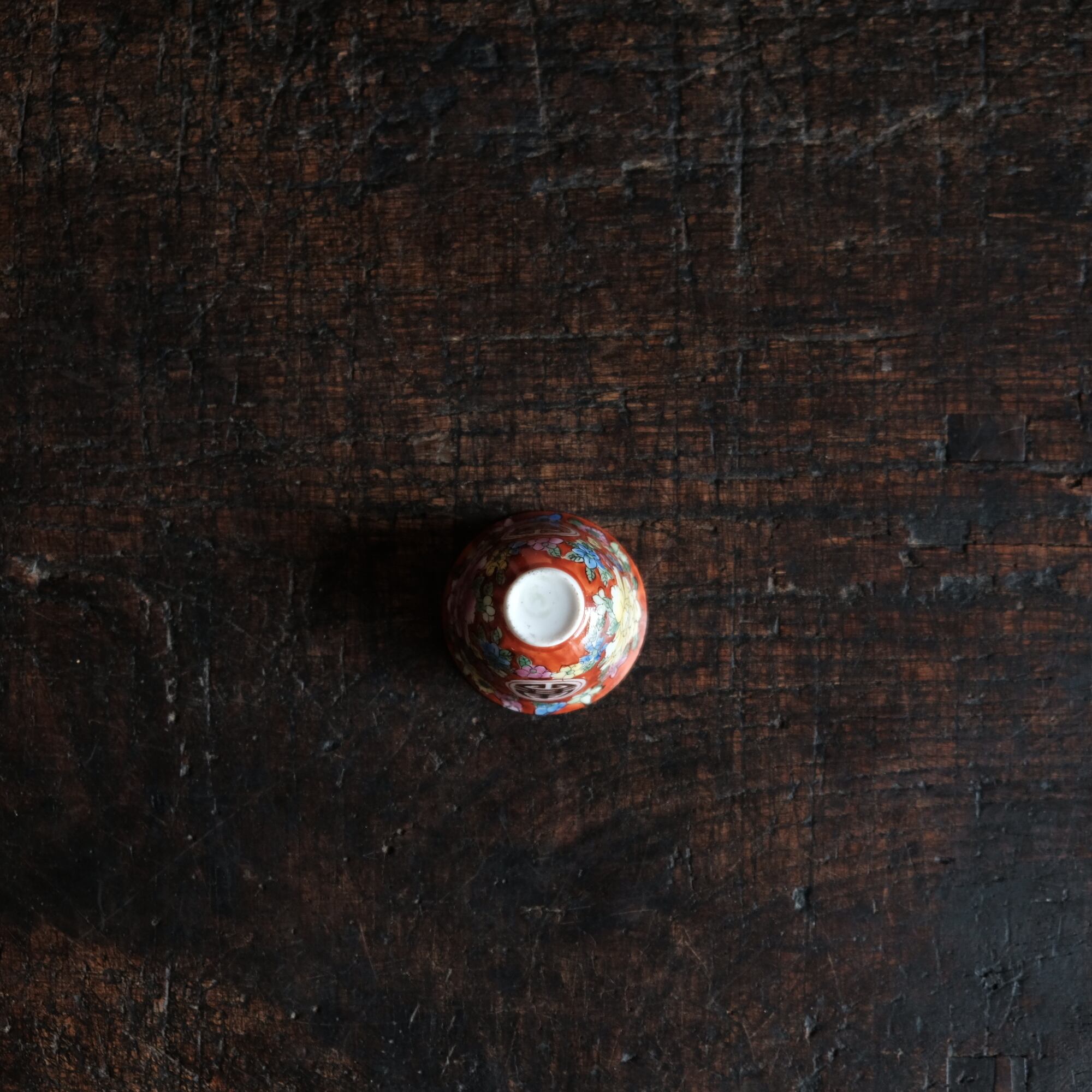 赤にカラフルな花と漢字◆中国産色絵金彩小ぶり猪口(茶杯) 器 チャイナレトロ シノワズリ インテリアオブジェ