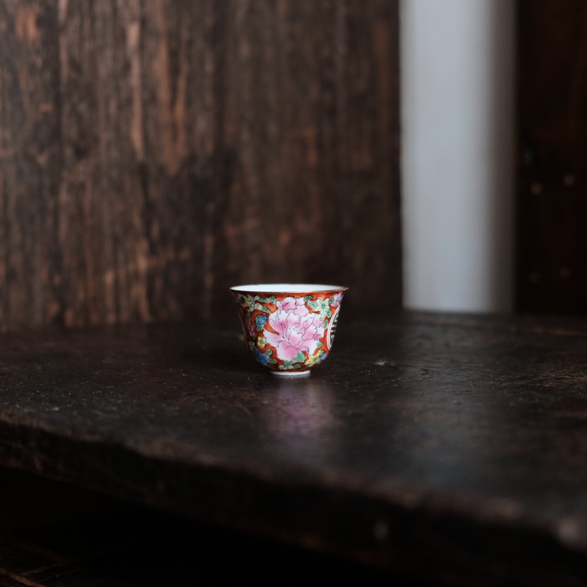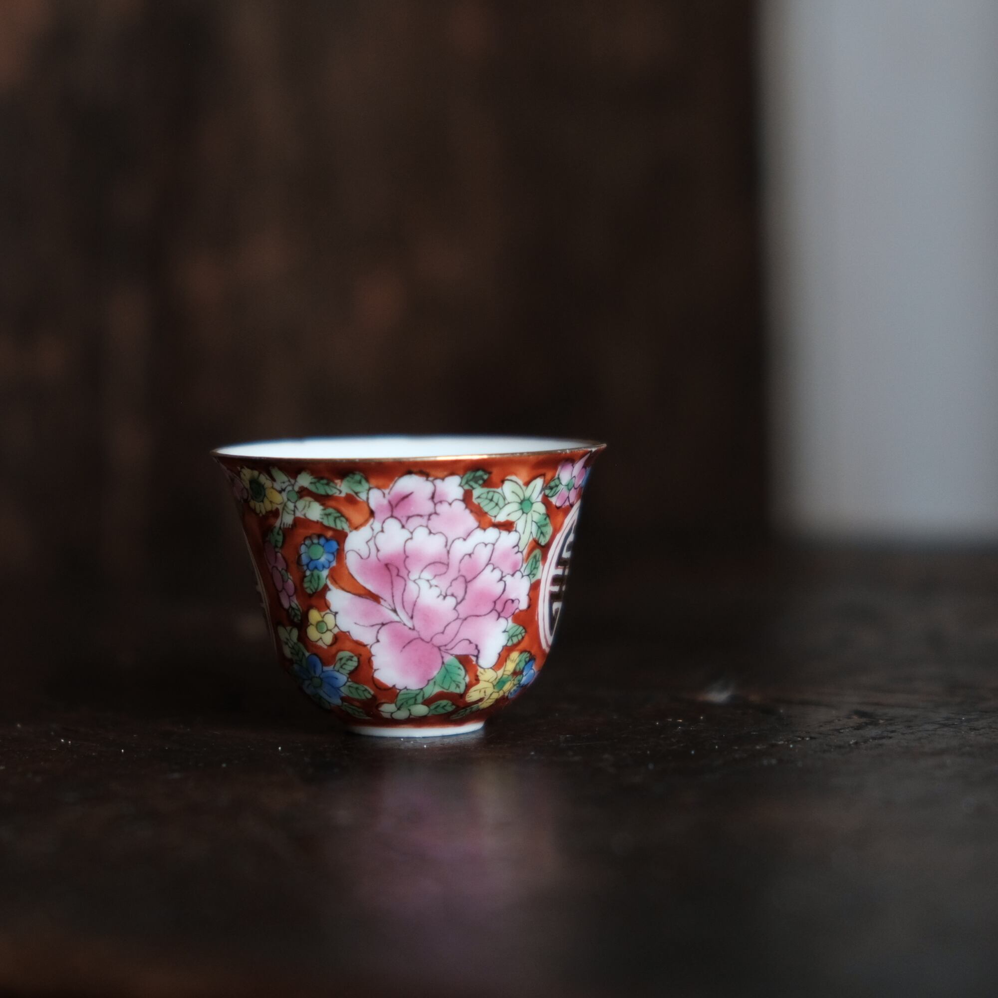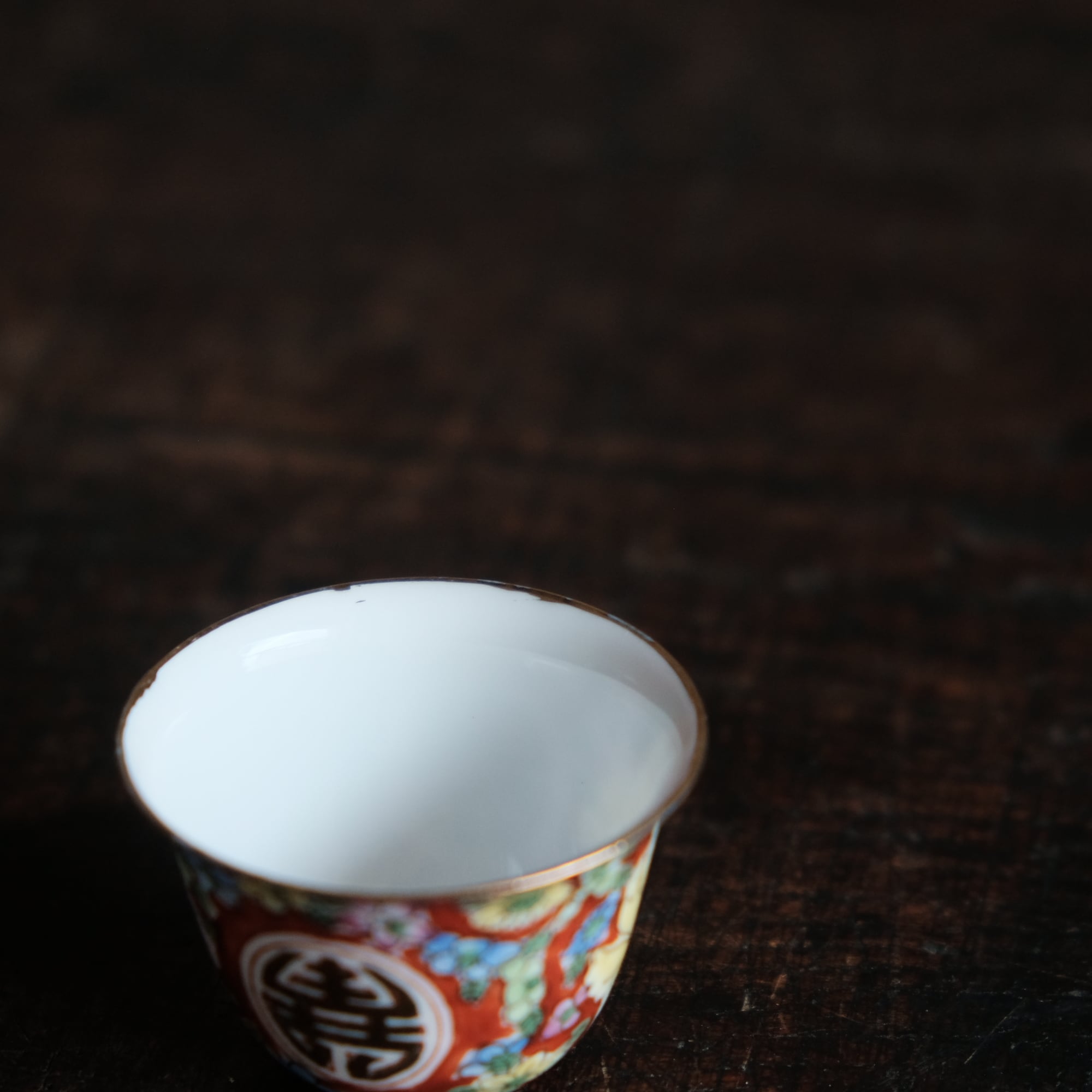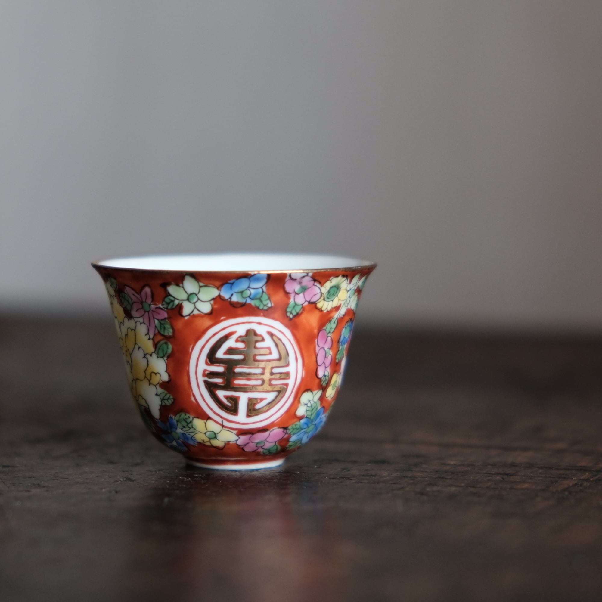 赤にカラフルな花と漢字◆中国産色絵金彩小ぶり猪口(茶杯) 器 チャイナレトロ シノワズリ インテリアオブジェ