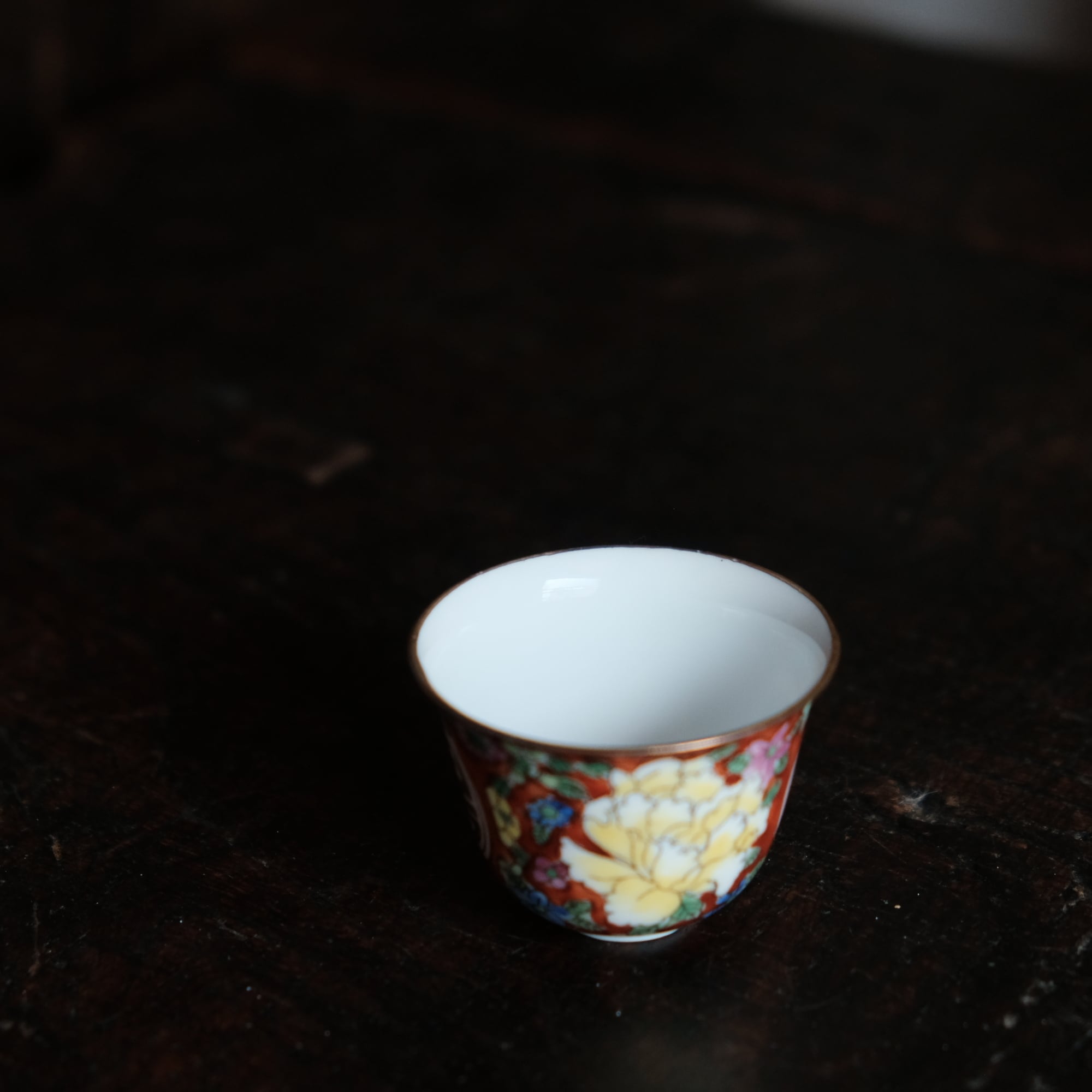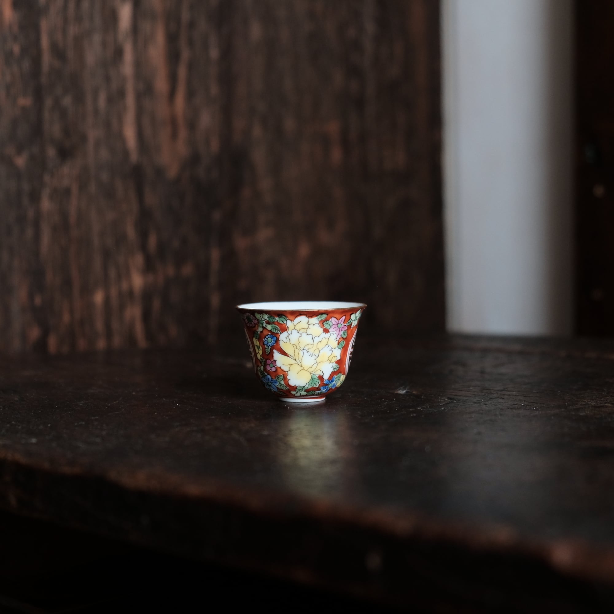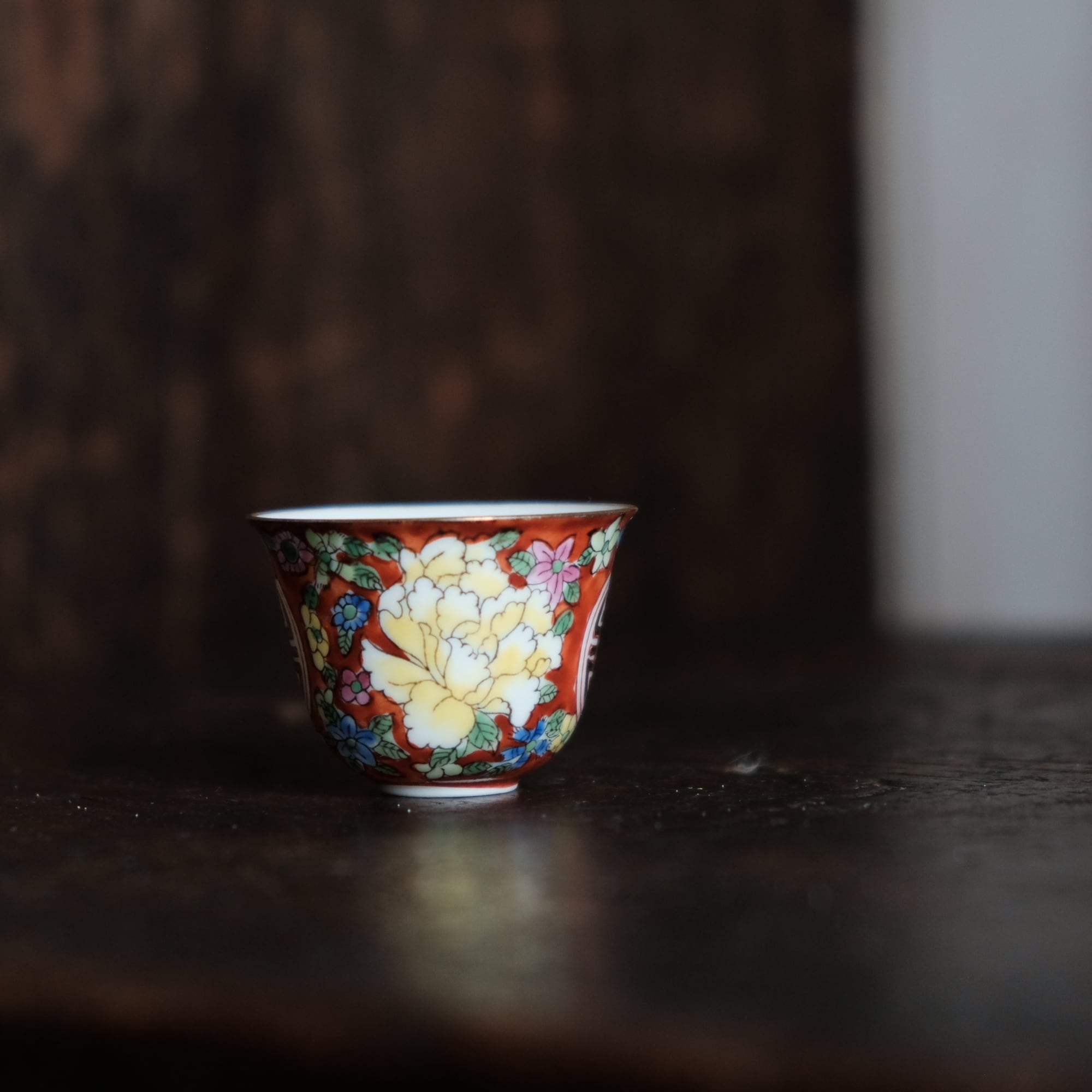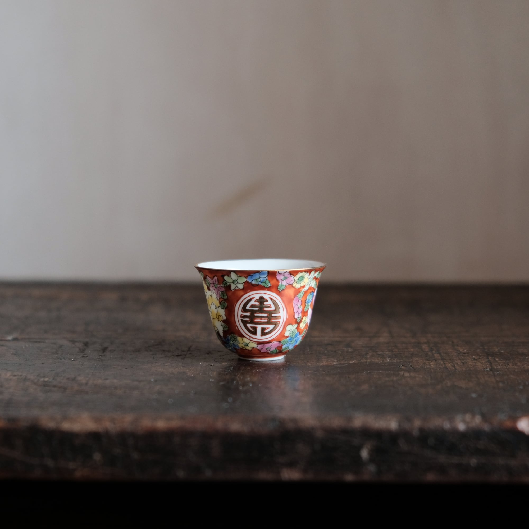 赤にカラフルな花と漢字◆中国産色絵金彩小ぶり猪口(茶杯) 器 チャイナレトロ シノワズリ インテリアオブジェ