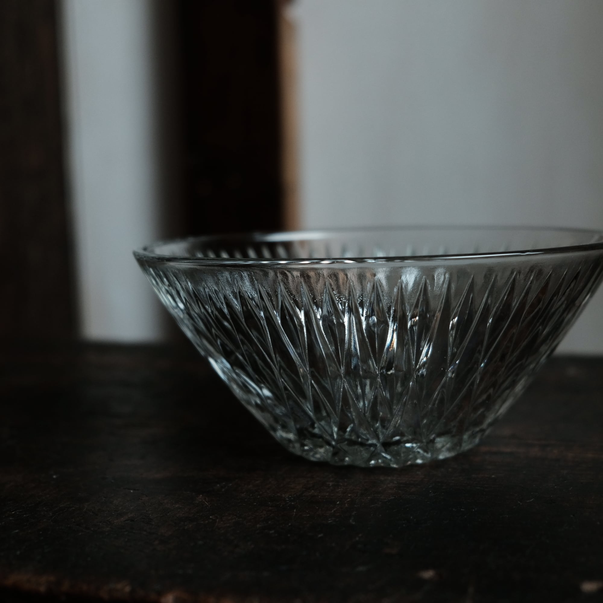 洋な空間にもスッと馴染んでくれる雰囲気のとても素敵なプレスガラスの器になります。
