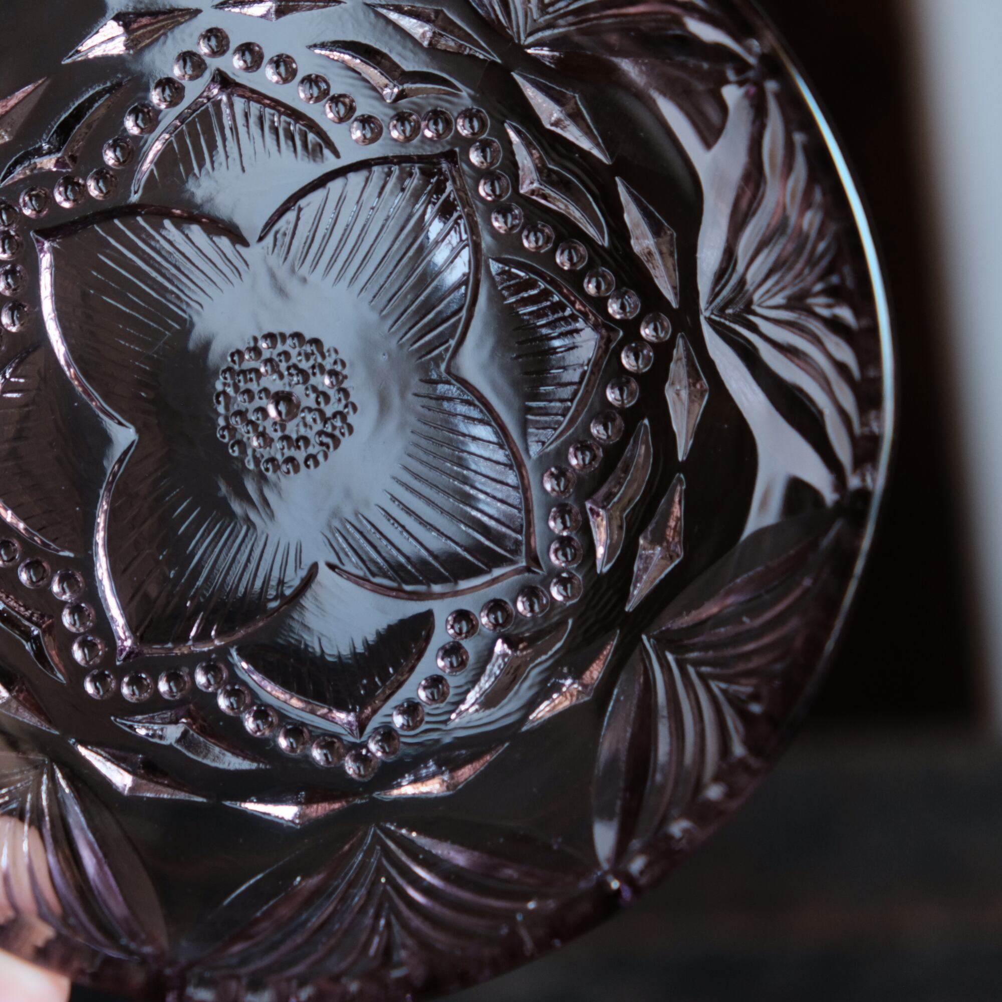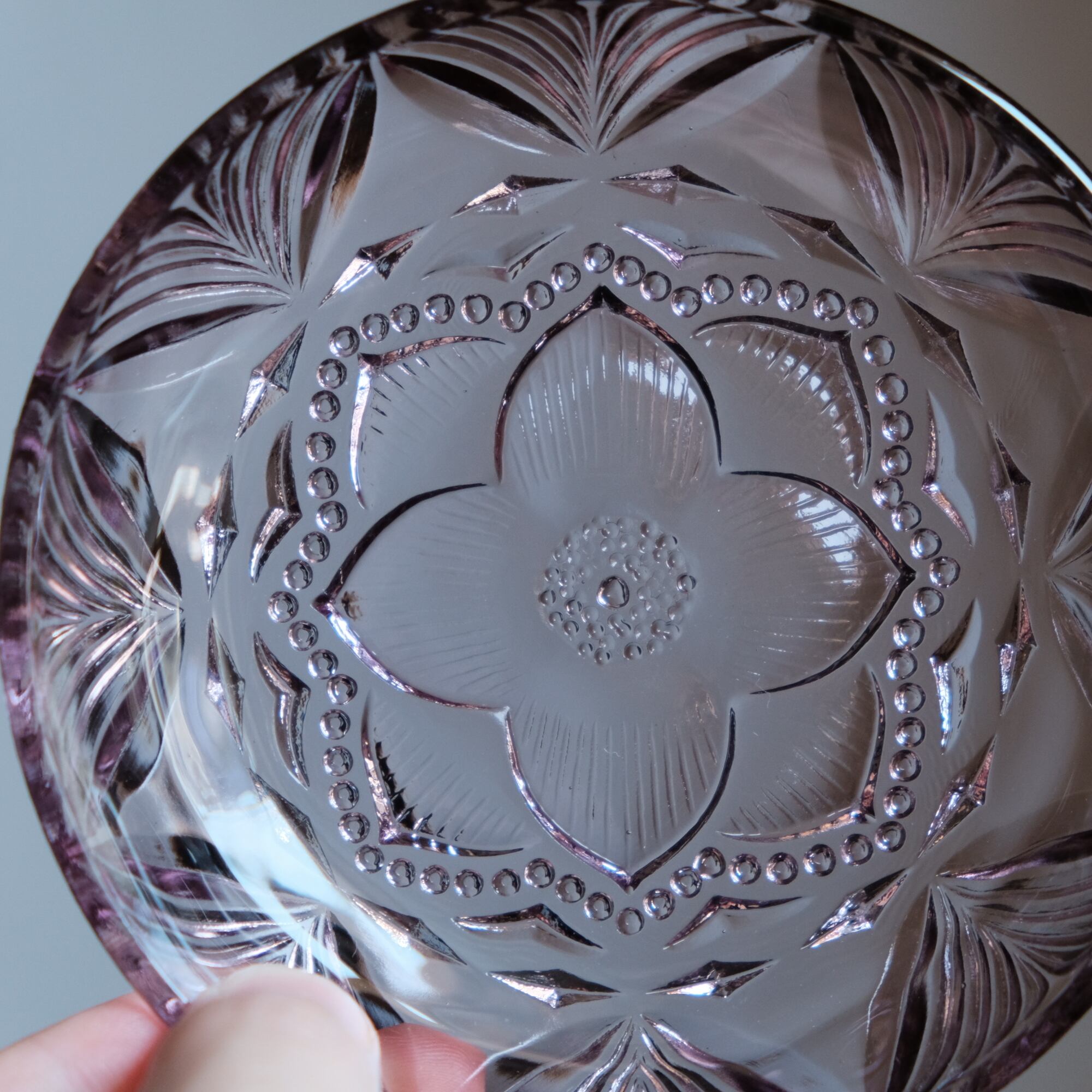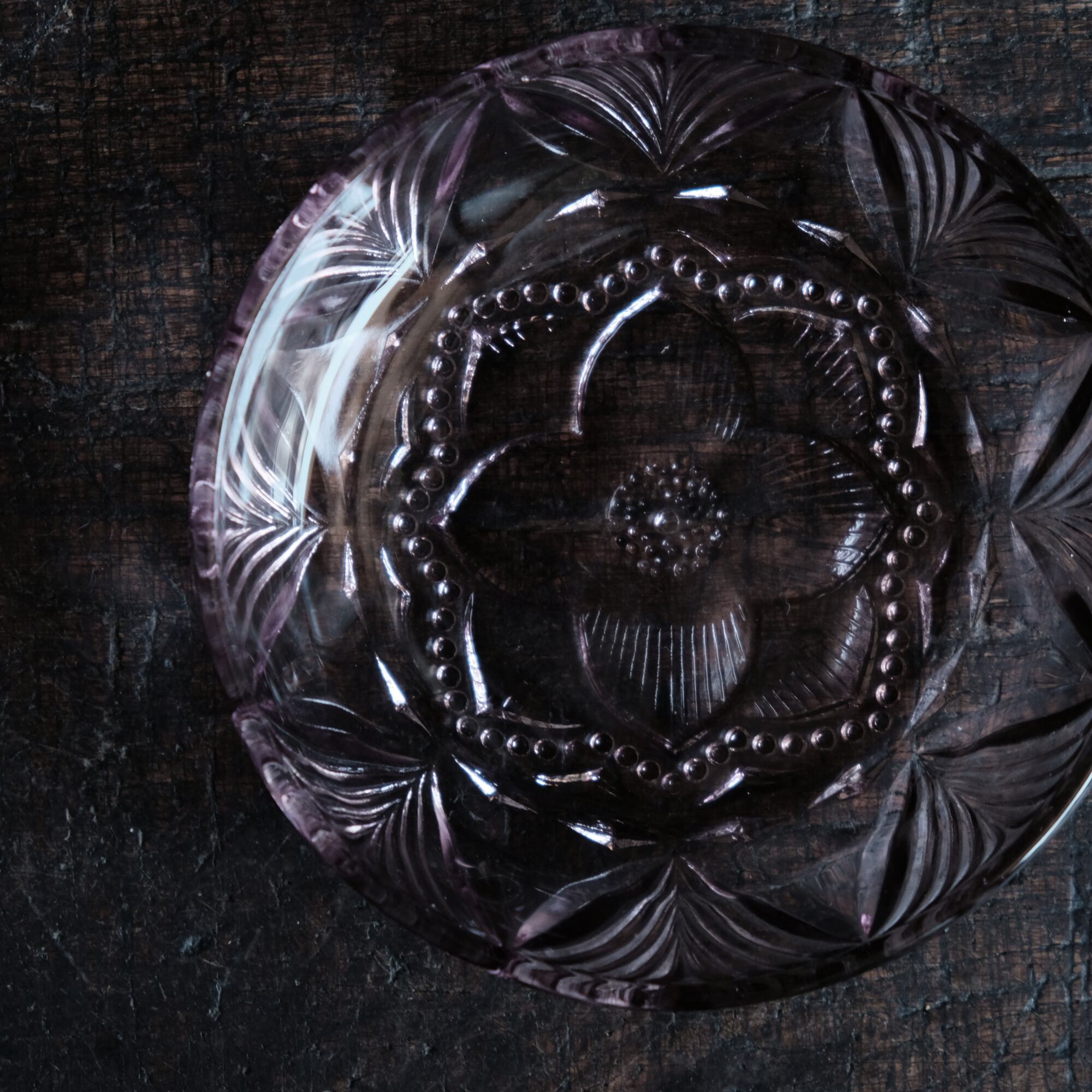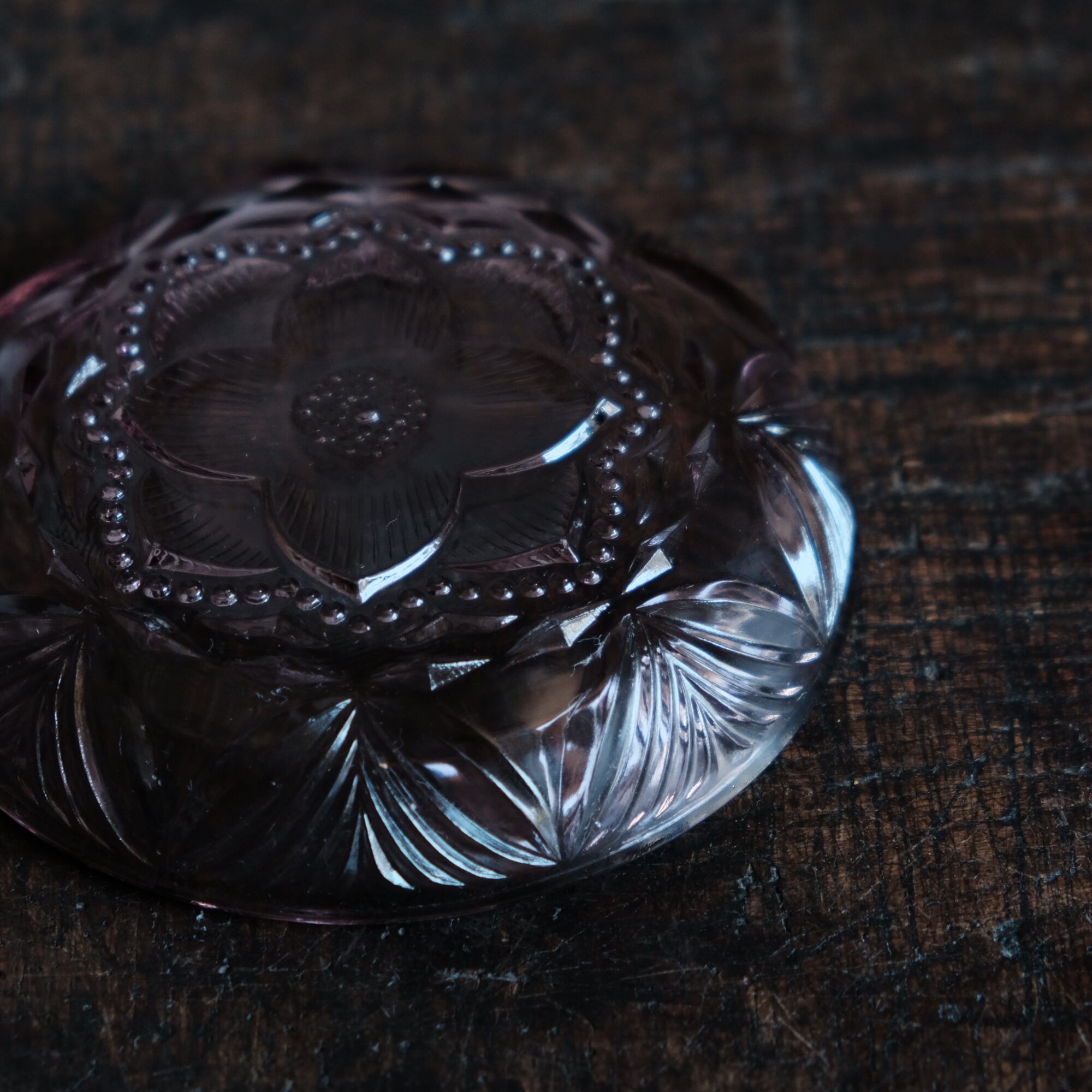 見込みに花文様◆昭和中期 プレスガラス小皿 vintage/antiques 古民家 古道具 ダークパープル