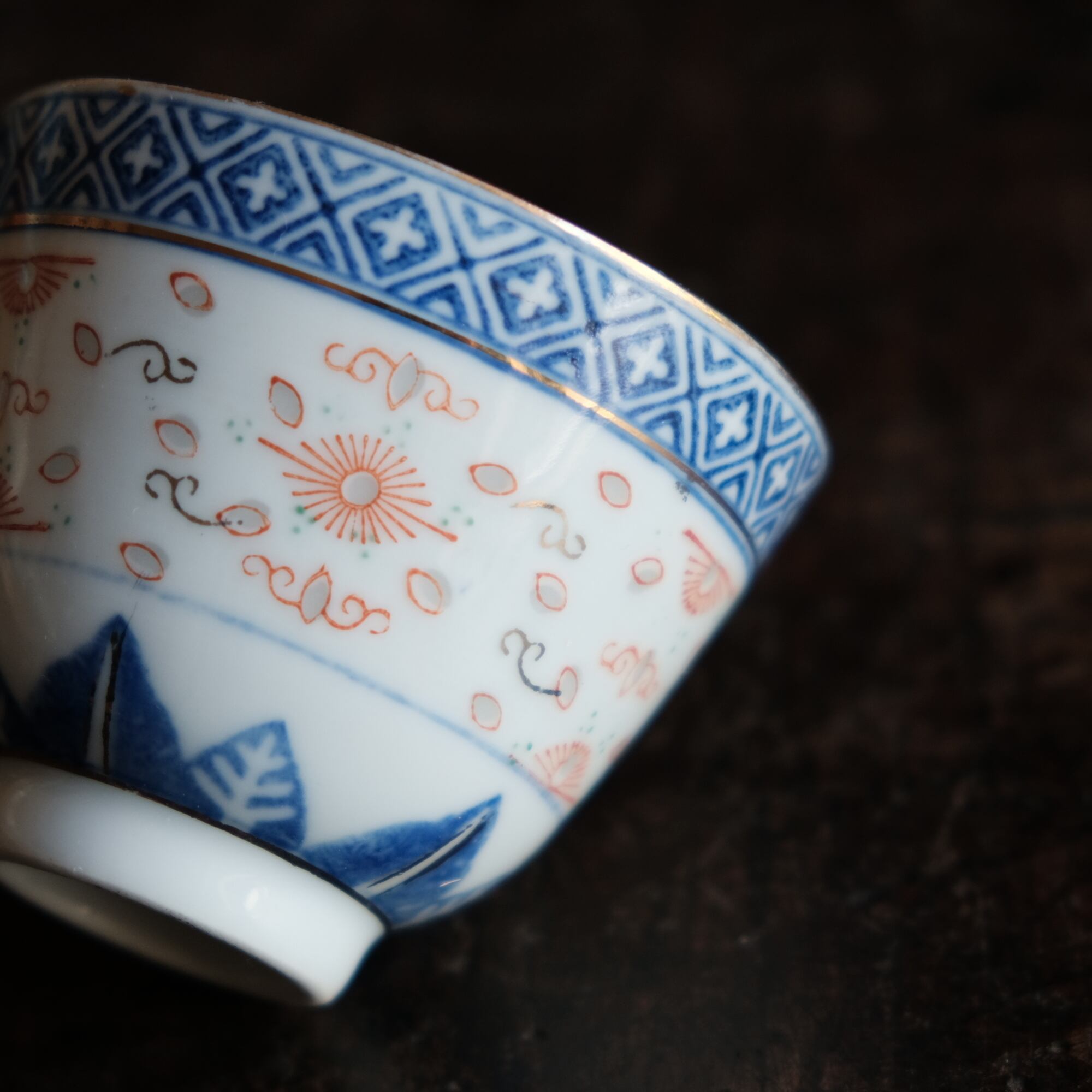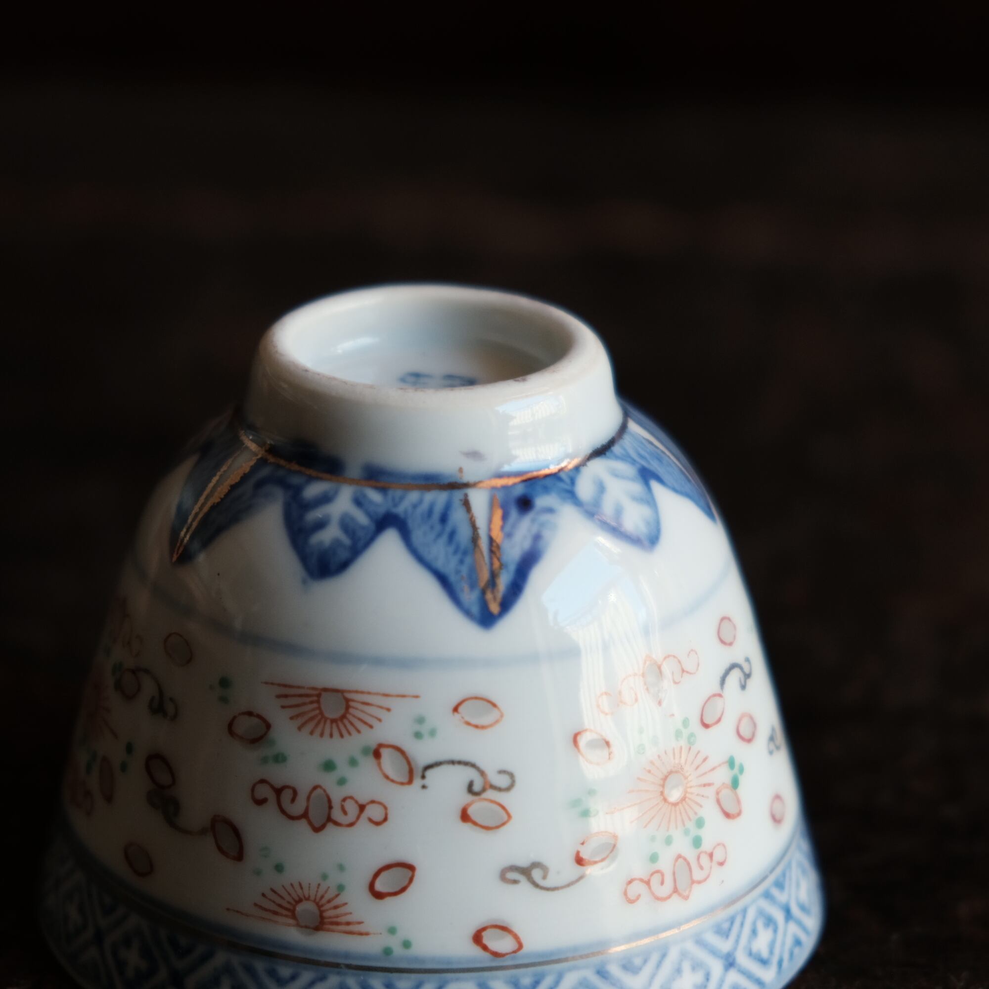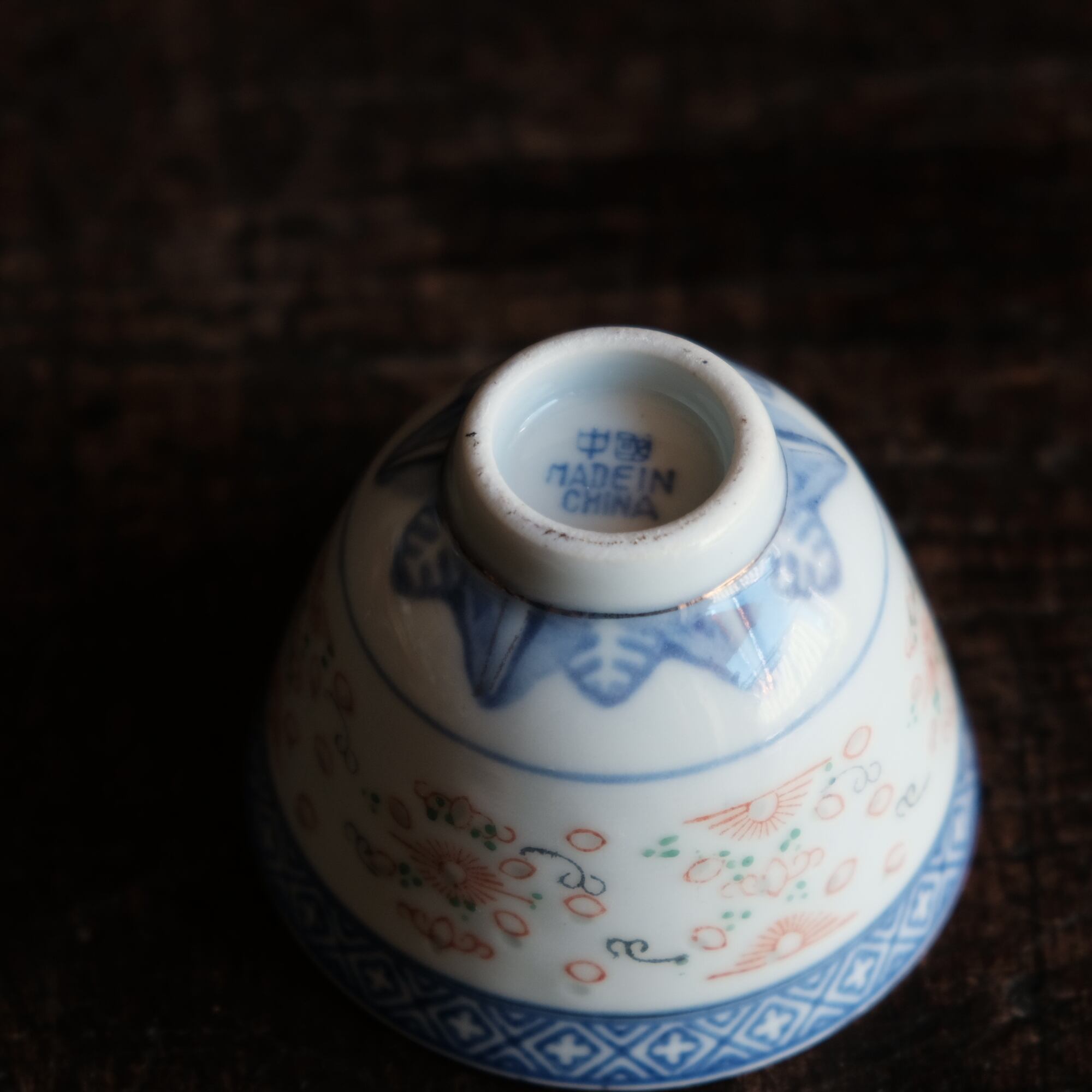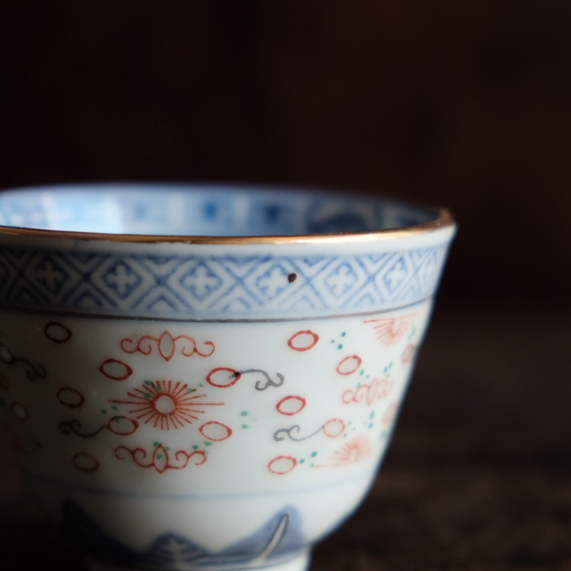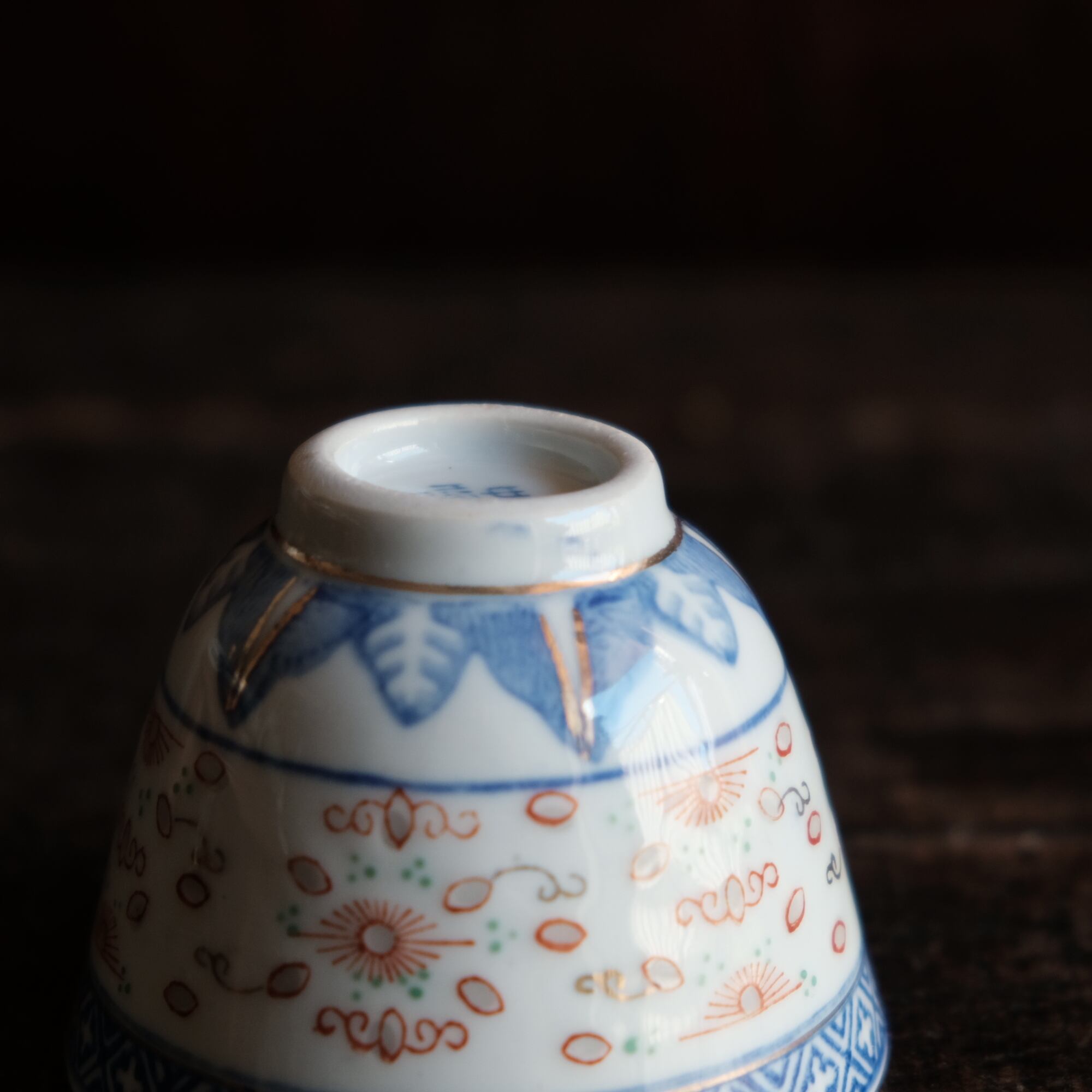 チャイナレトロで可愛い◆花と漢字。中国景徳鎮 赤絵金彩猪口 茶杯 蛍焼 湯呑み 茶器