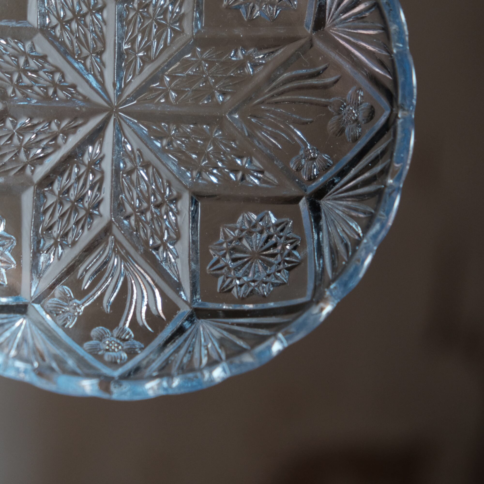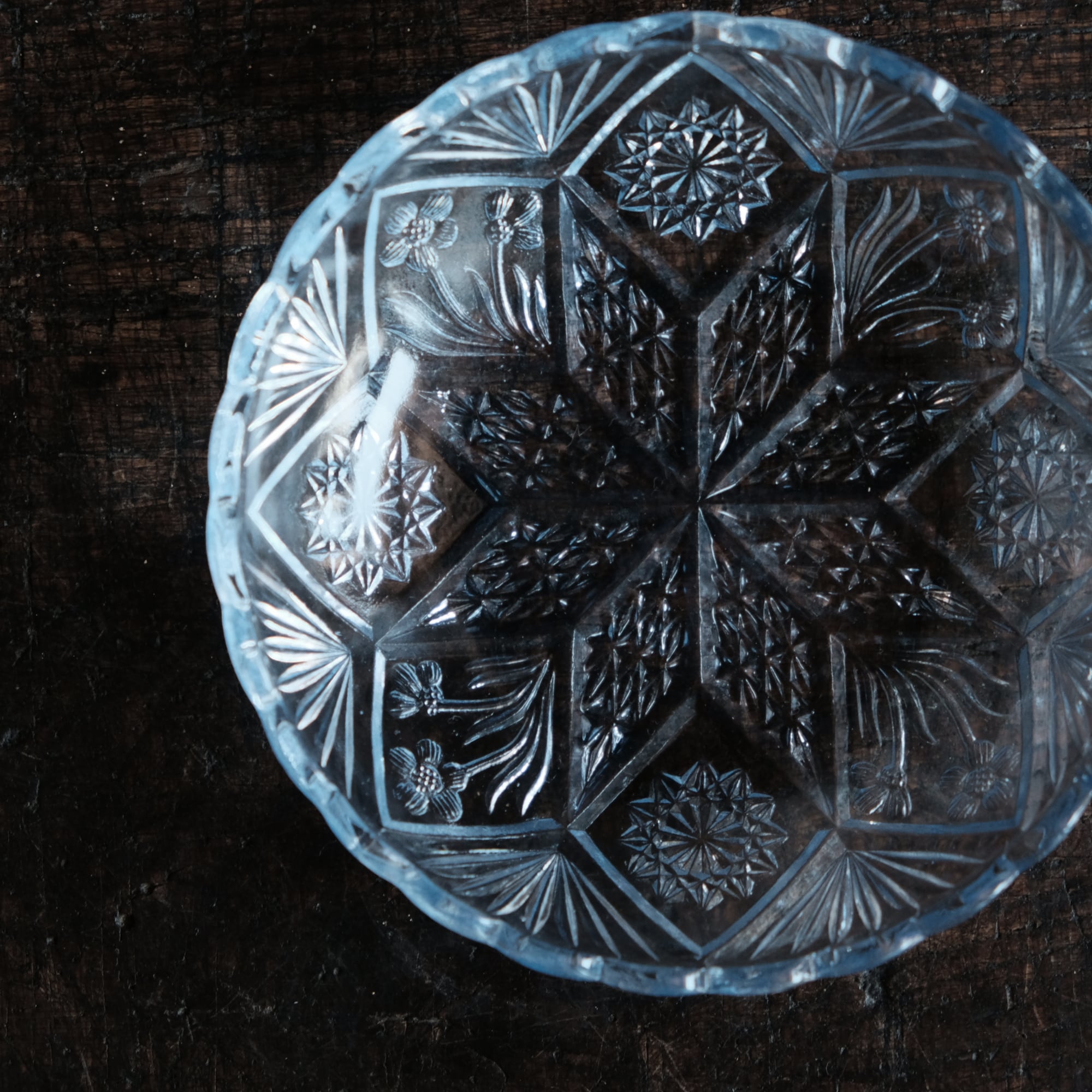 草花が可愛い◆薄い涼しげなブルー。プレスガラス波縁深皿 古民家 古道具 vintage レトロガラス 昭和中期