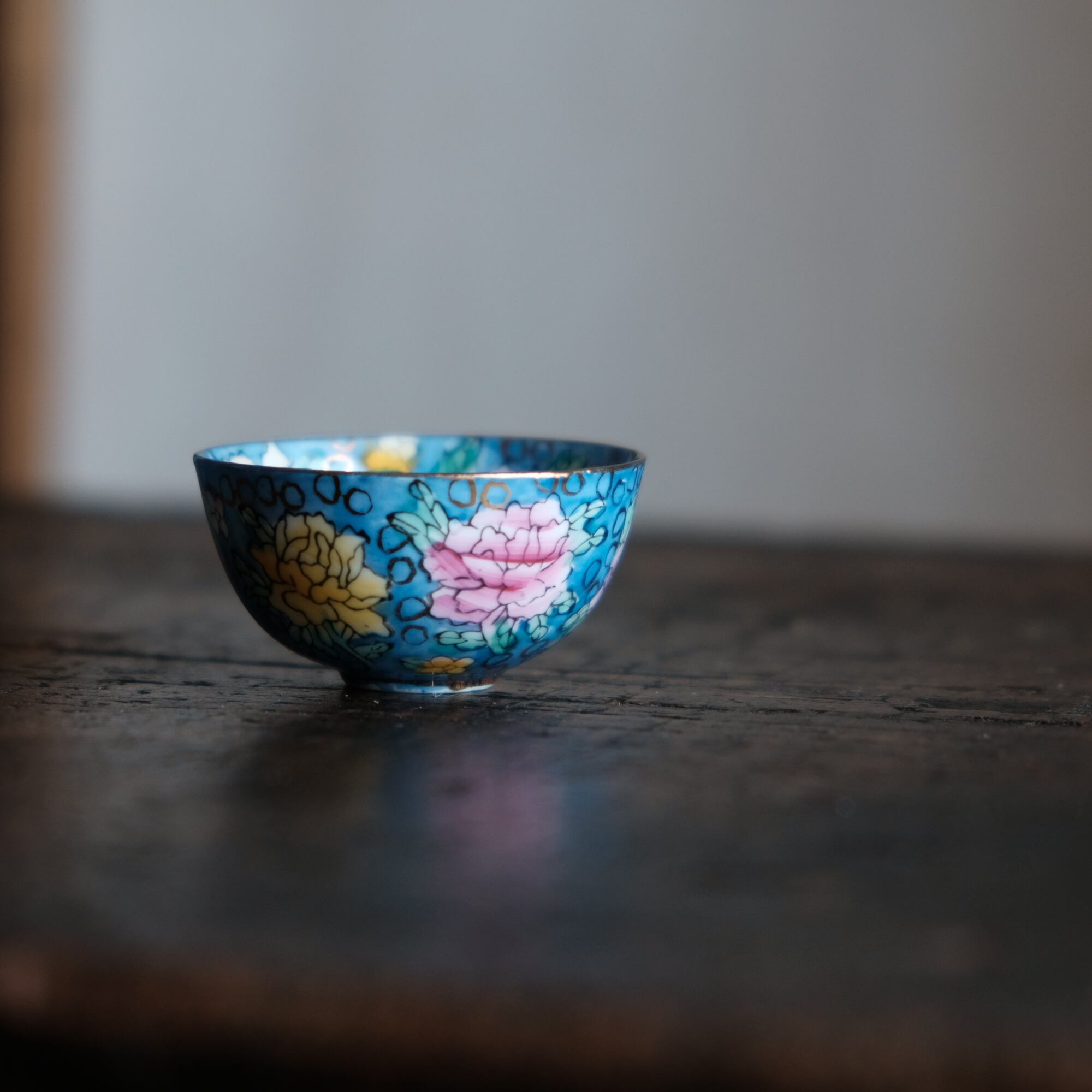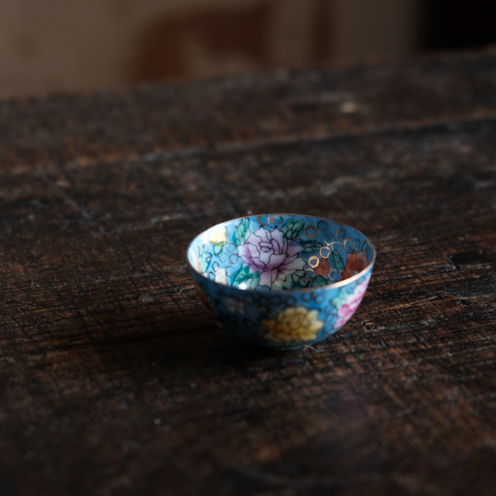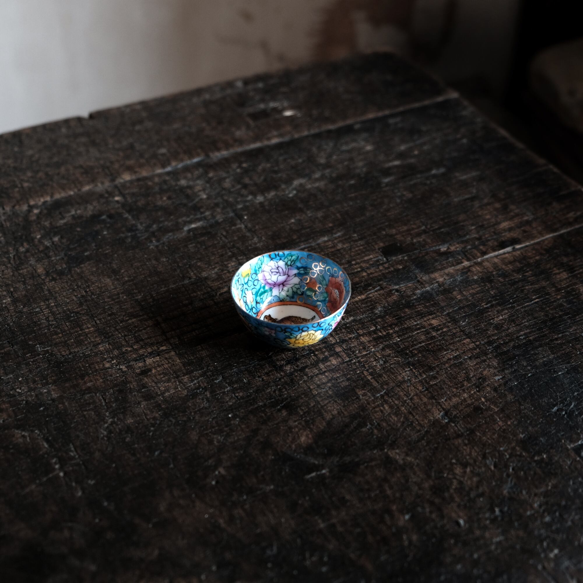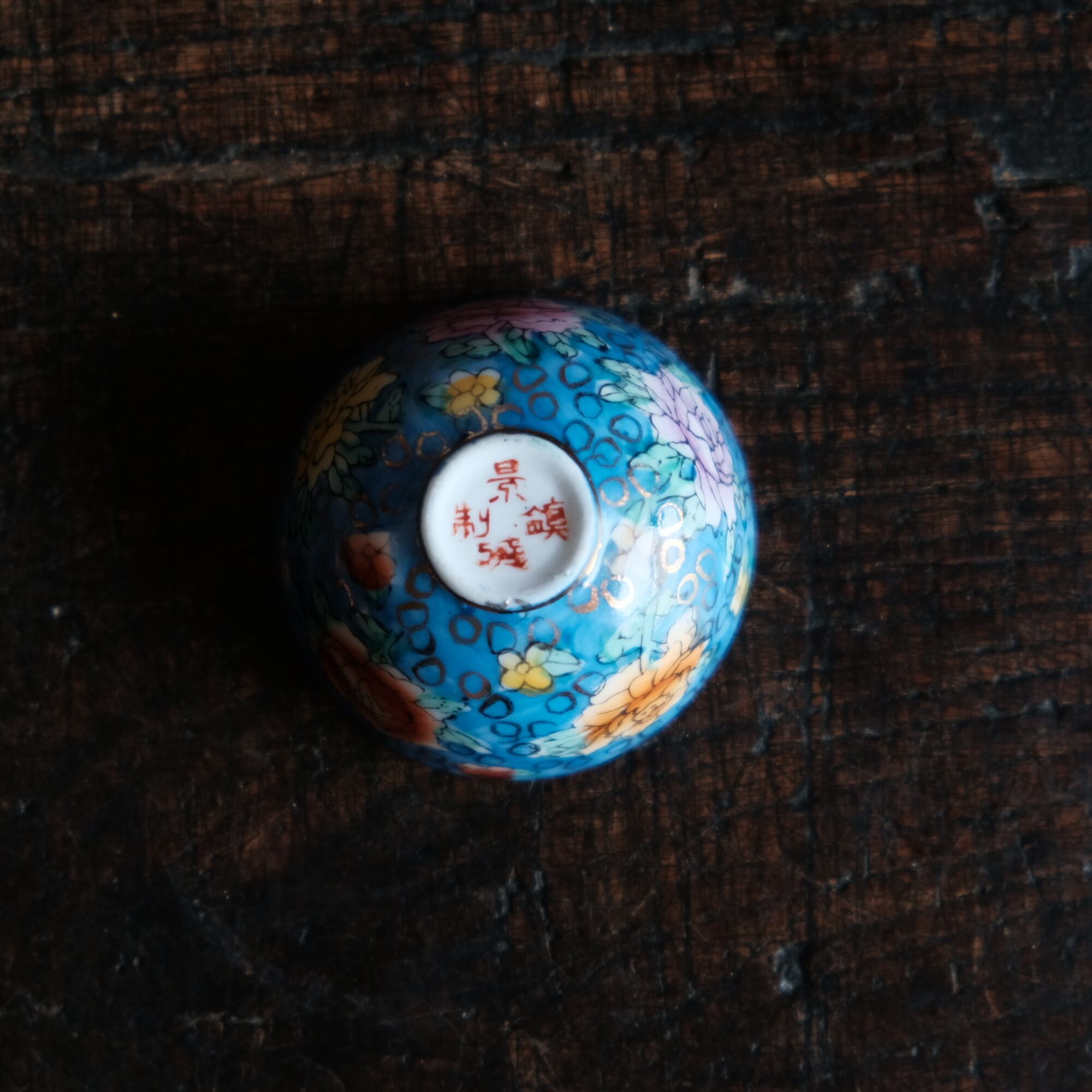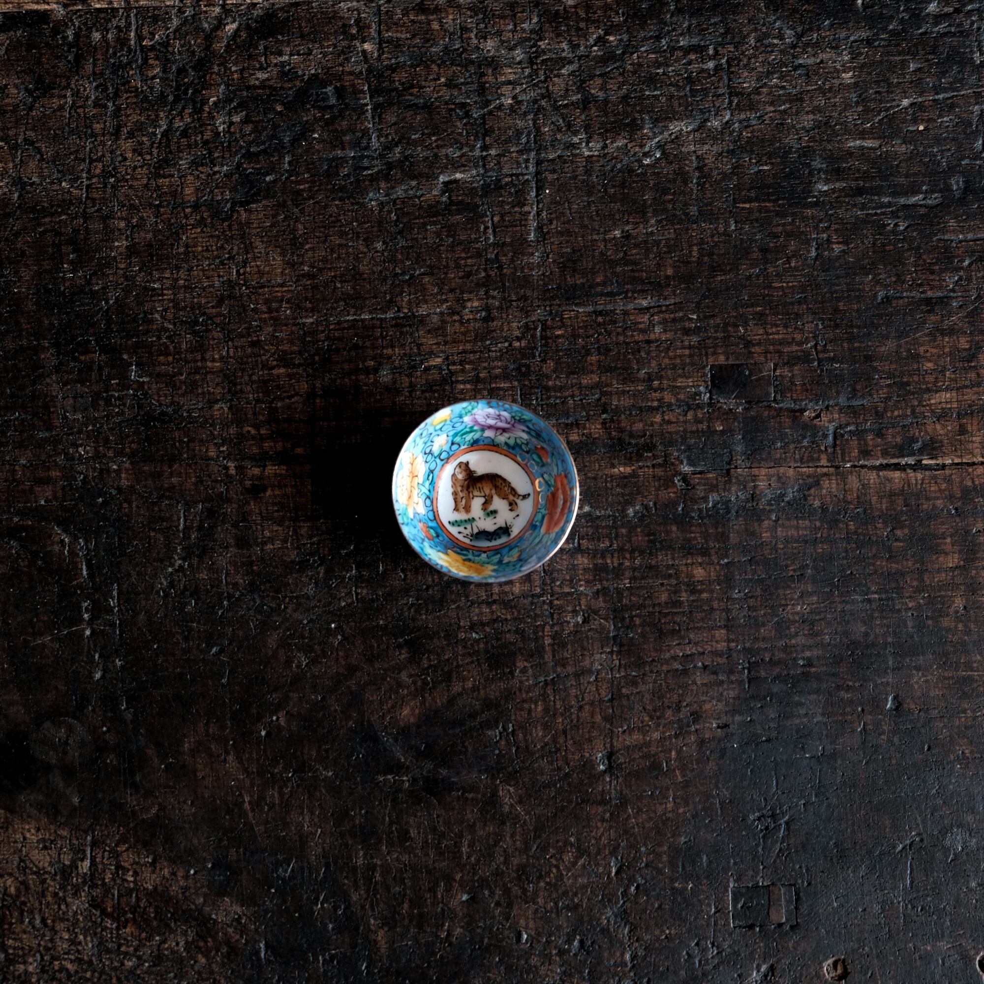 見込みに虎(寅)◆中国景徳鎮 干支文色絵金彩小ぶり猪口 茶杯 花尽くし。シノワズリ チャイナレトロ
