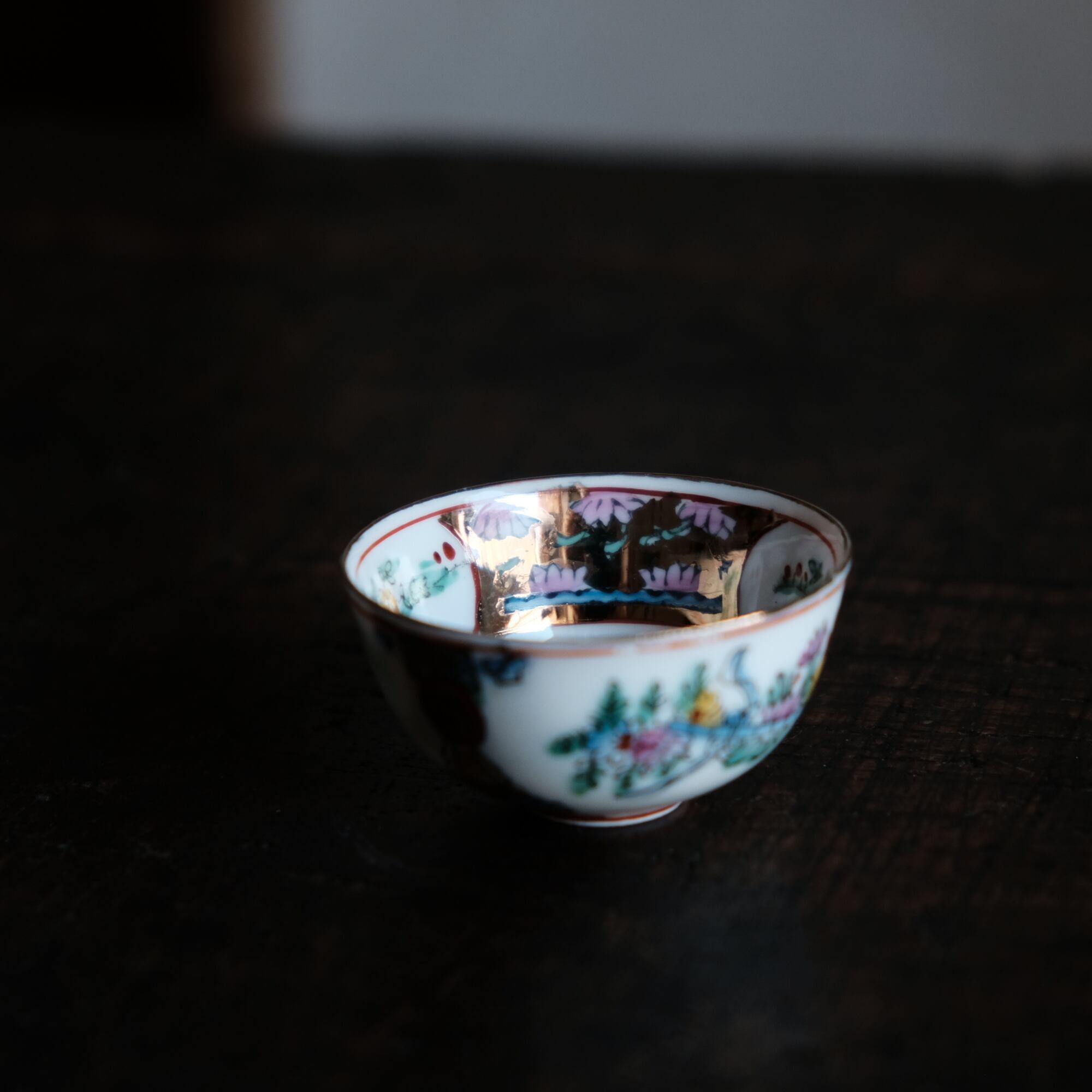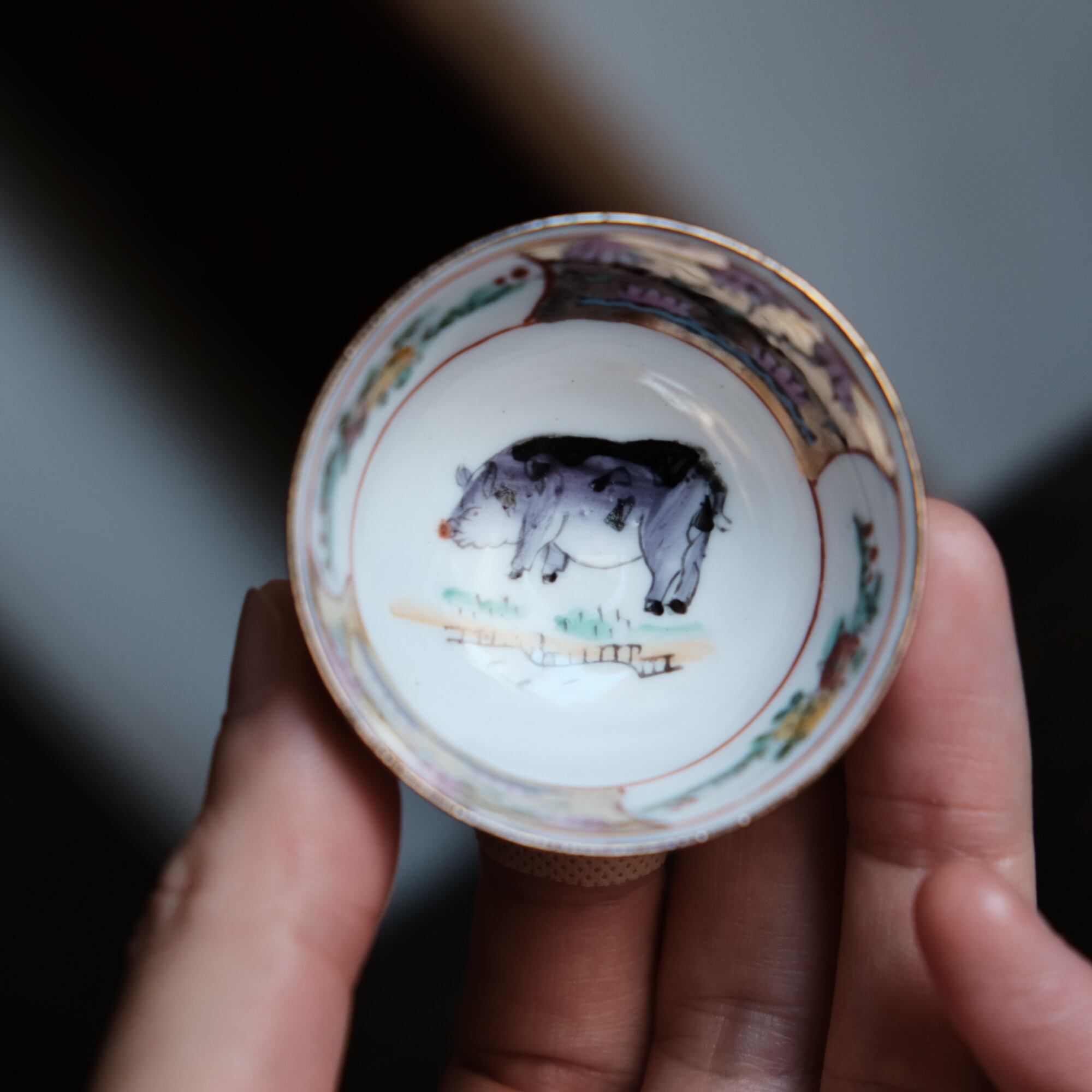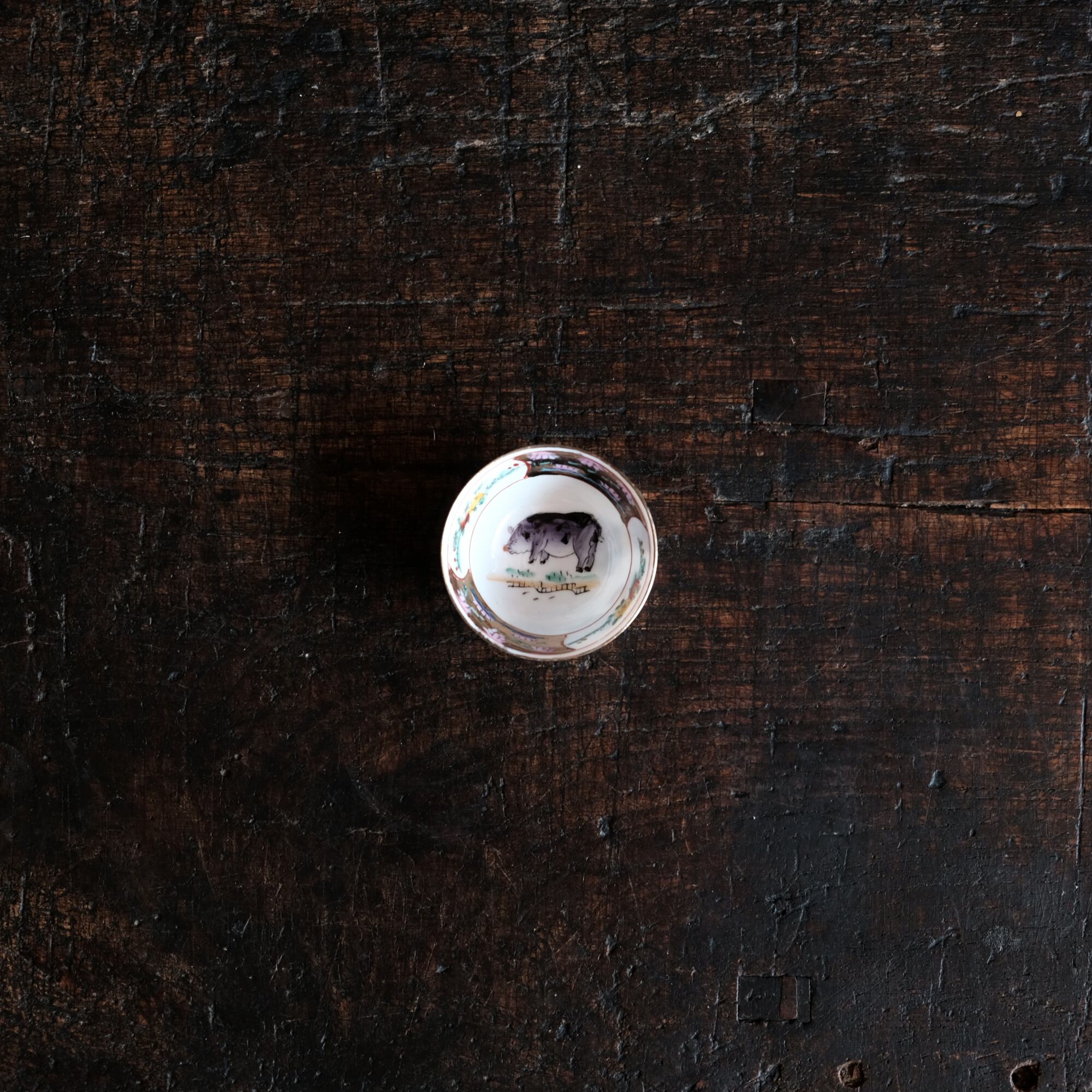 見込みに豚◆中国景徳鎮 干支文色絵金彩小ぶり猪口 茶杯 花尽くし。シノワズリ チャイナレトロ