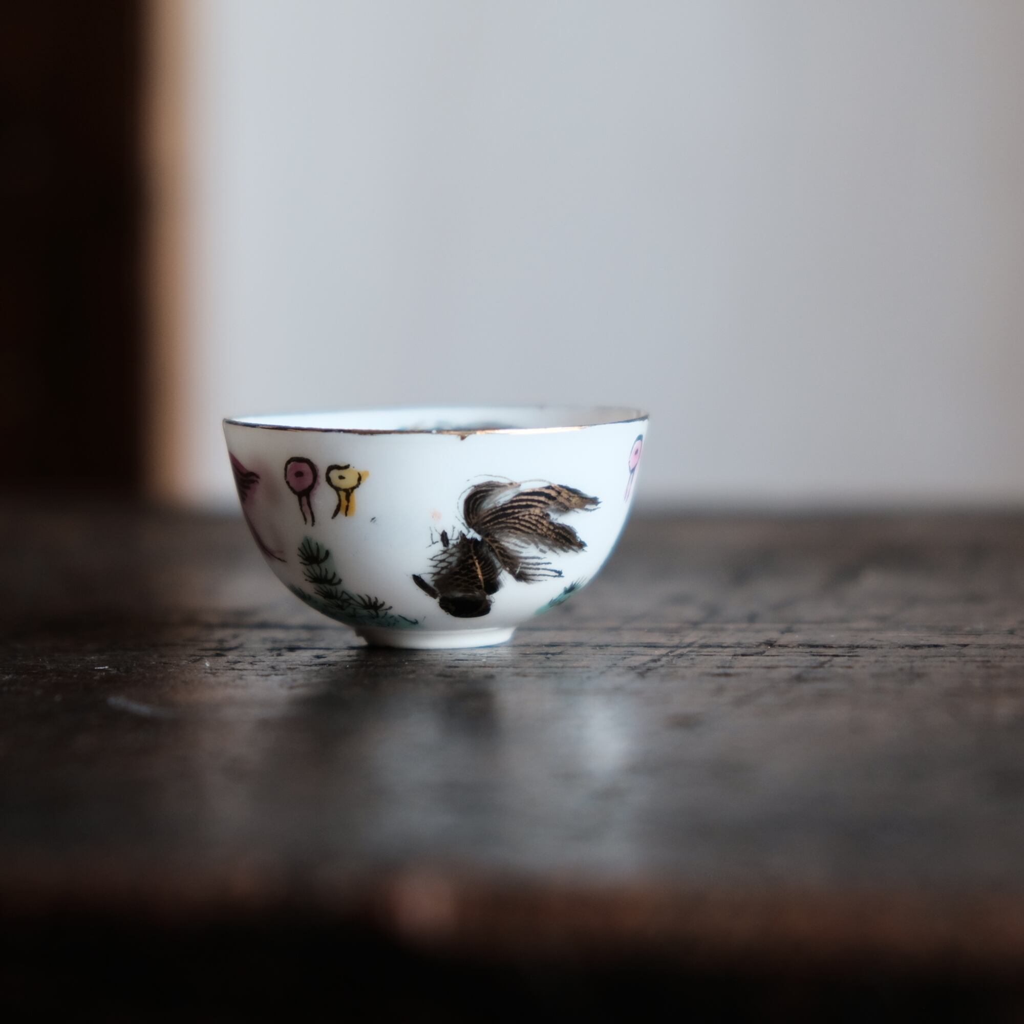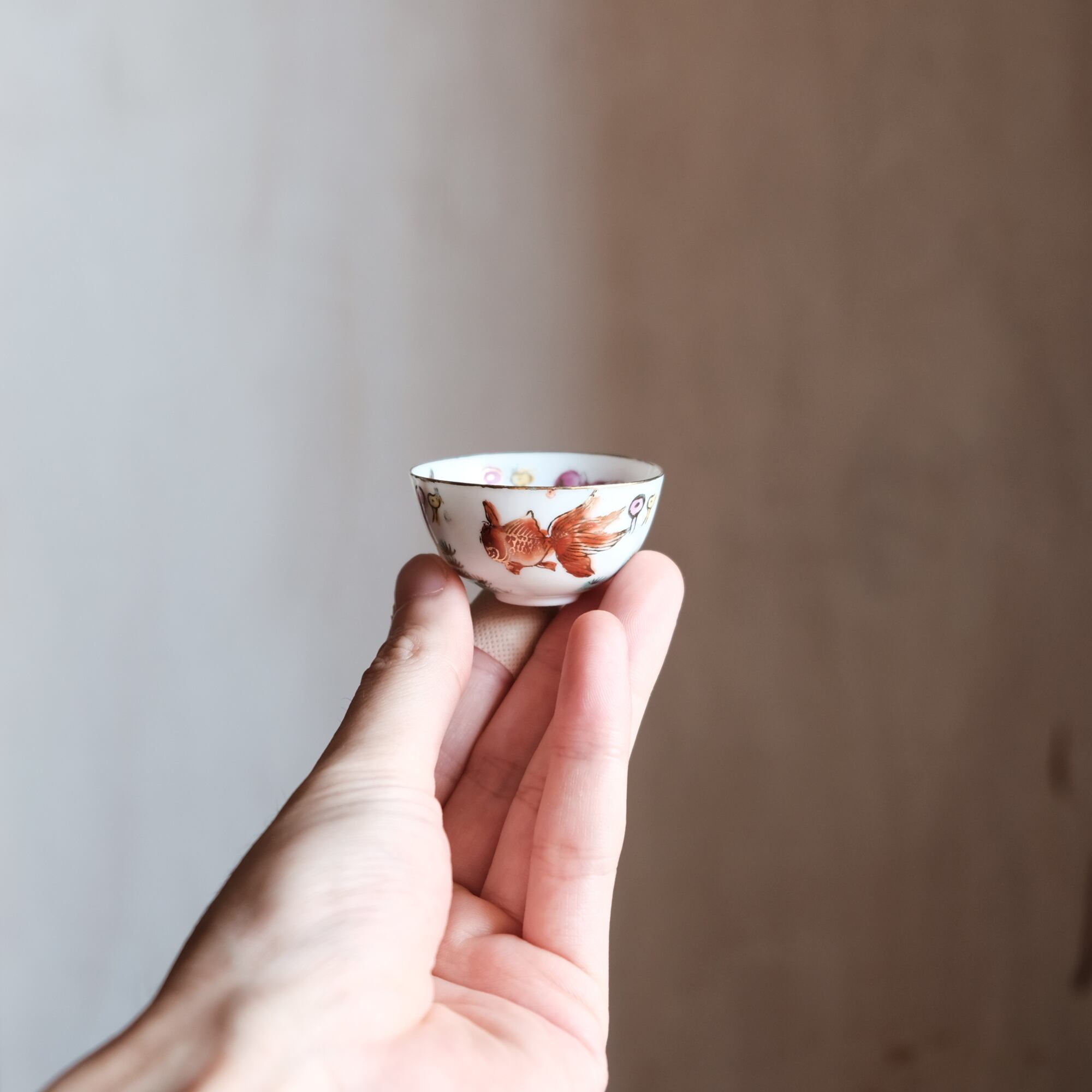 見込みに犬(戌)◆三色の金魚。中国景徳鎮 干支文色絵金彩小ぶり猪口 茶杯 花尽くし。シノワズリ チャイナレトロ