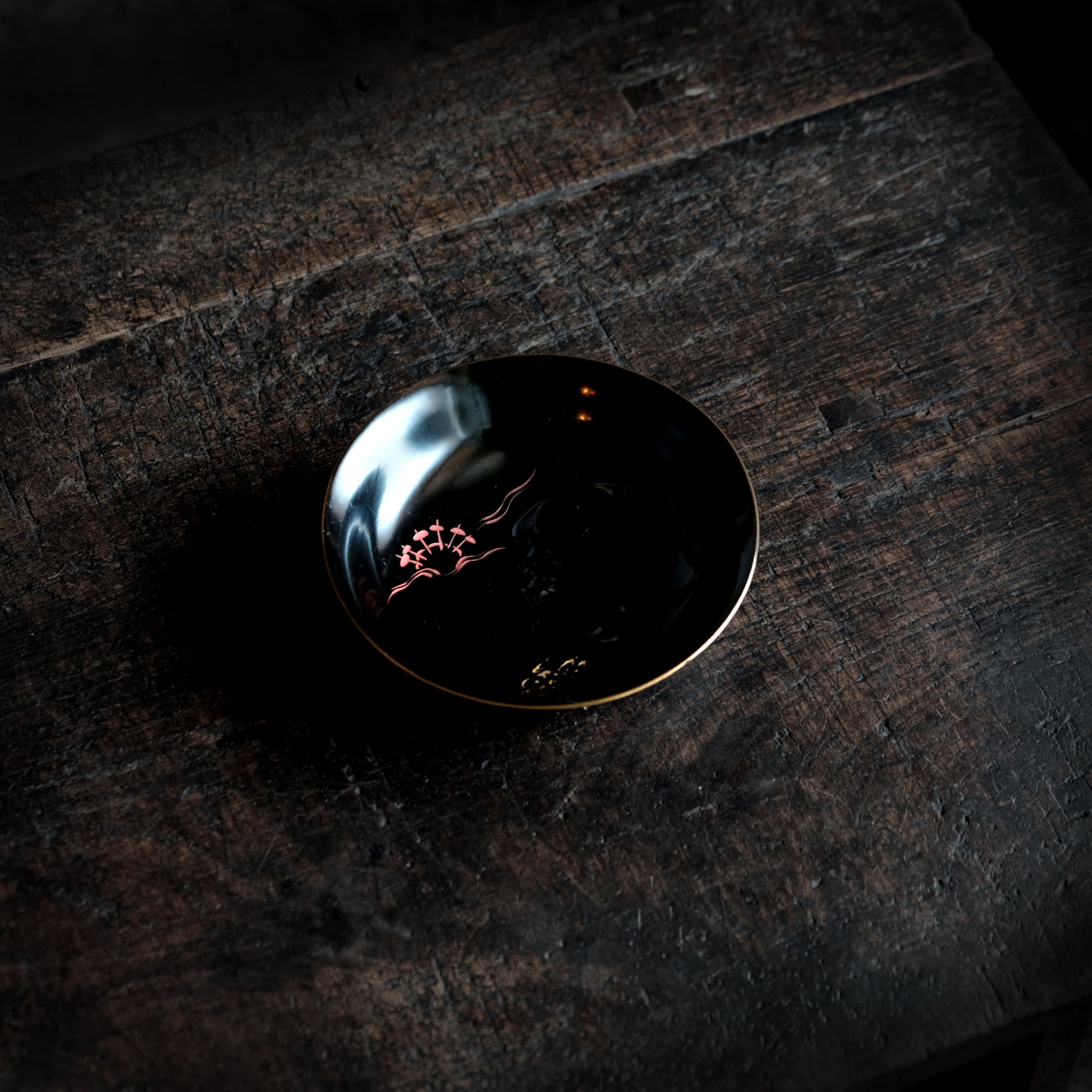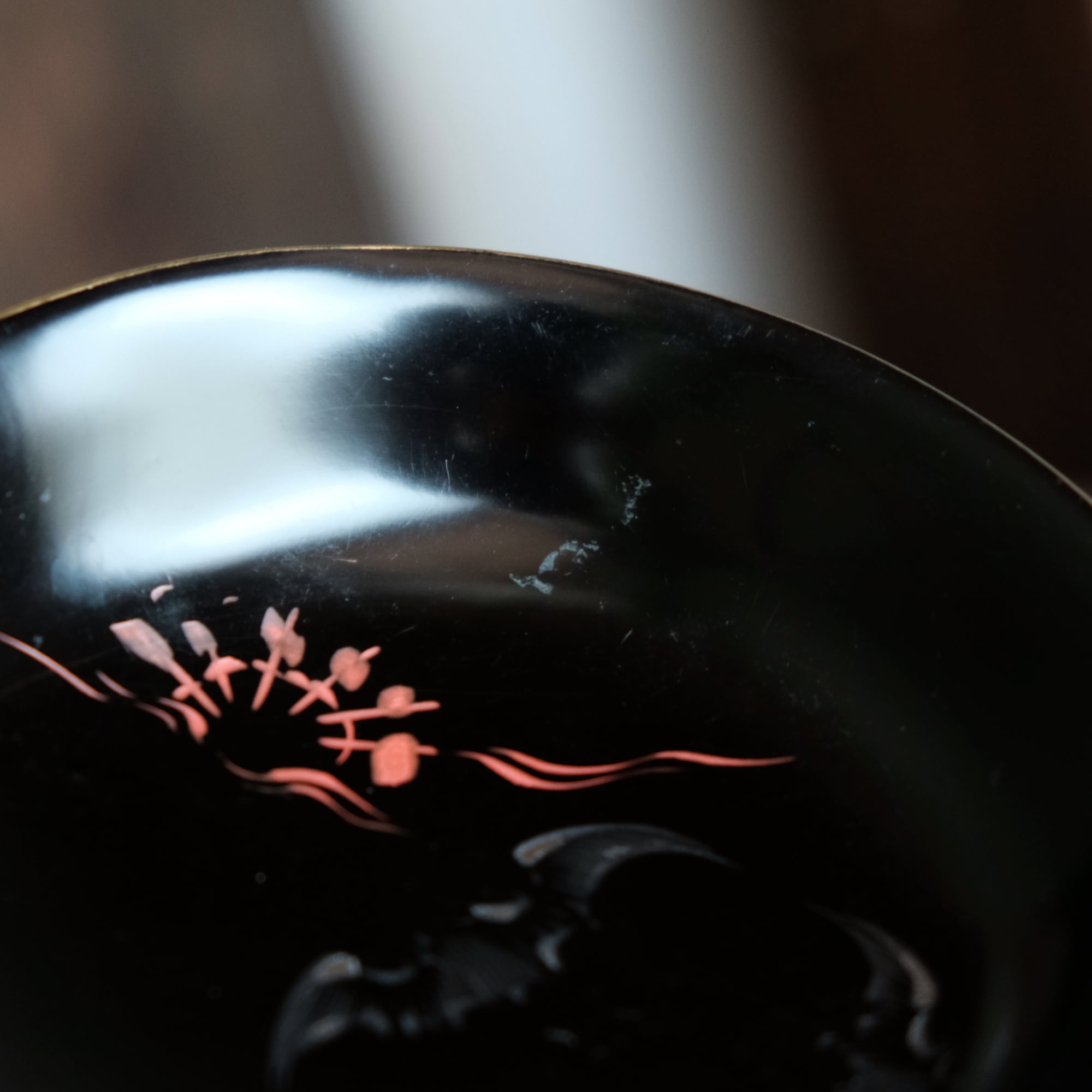 3匹の蝙蝠◆赤い水車と金の雲。古輪島塗 漆芸彫刻金彩深皿 漆器 骨董/antiques 明治~大正期