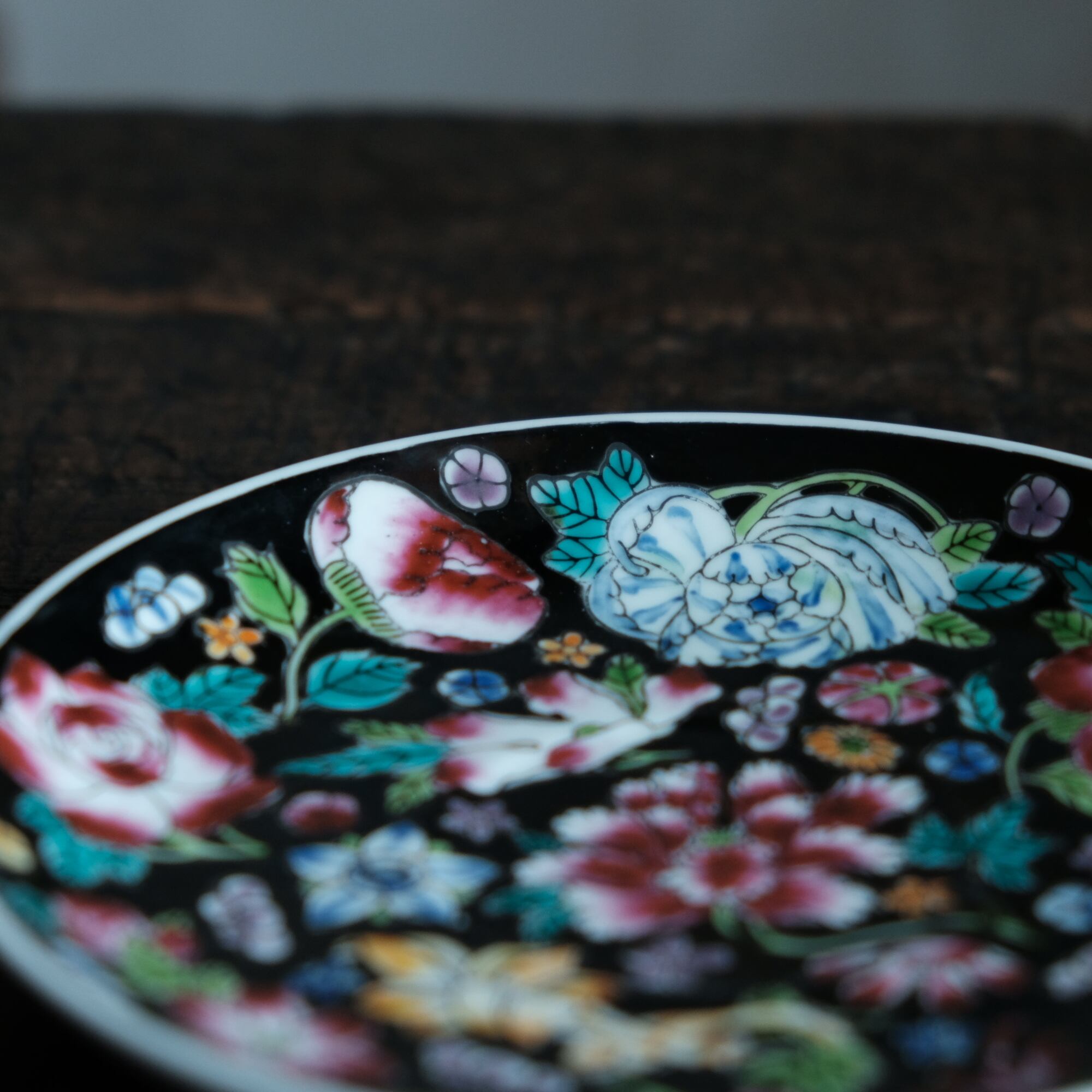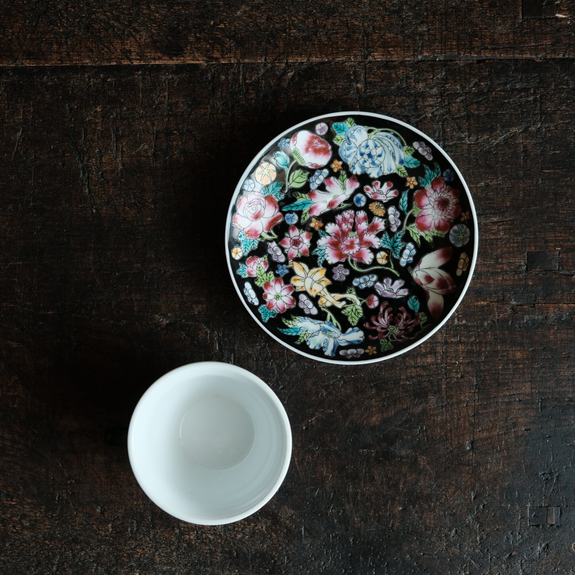 黒にカラフルな花尽くし◆中国景徳鎮 色絵カップ&ソーサー 茶器 シノワズリ チャイナレトロ インテリア