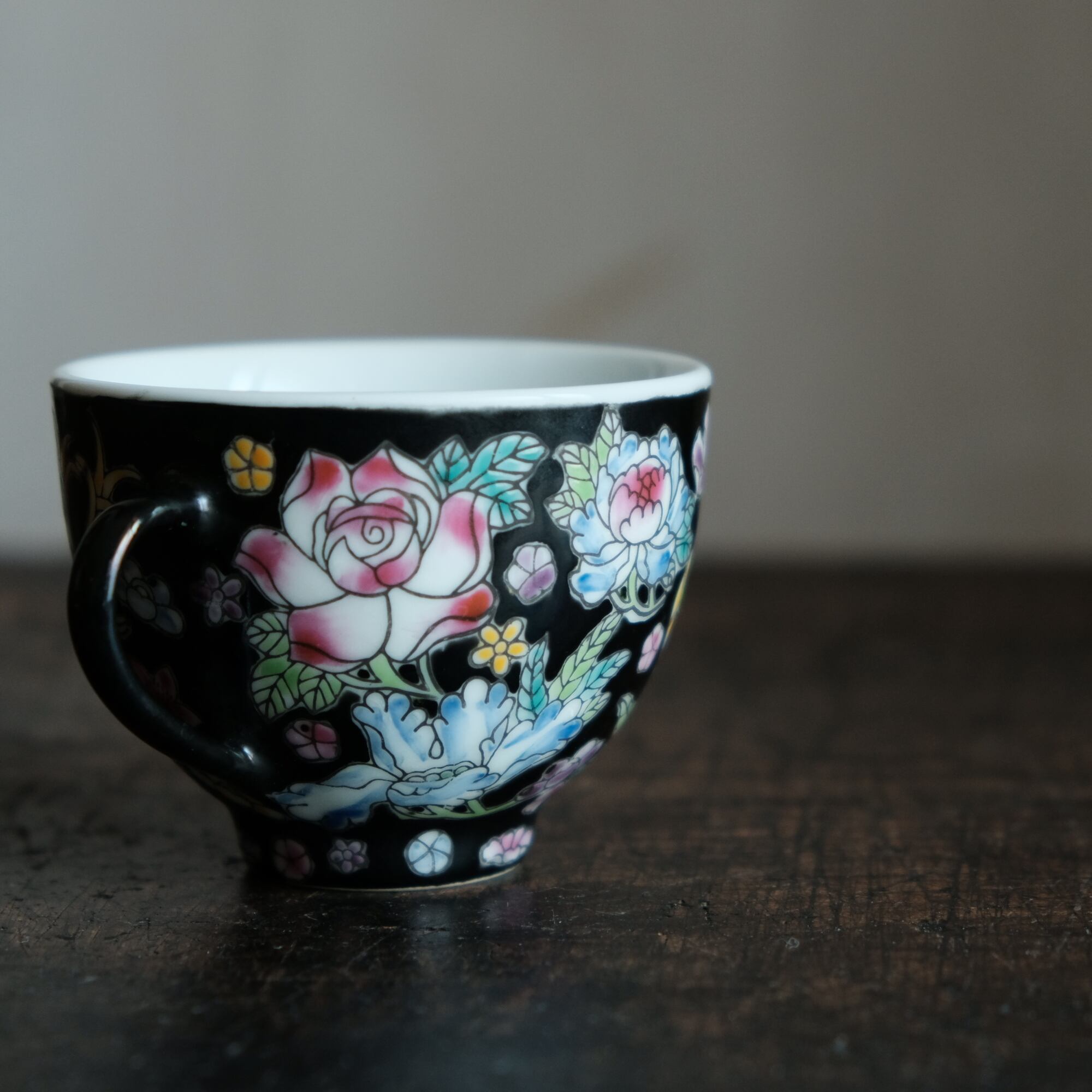 黒にカラフル草花◆中国景徳鎮 色絵カップ 器 シノワズリ チャイナレトロ 暮らしに。BK