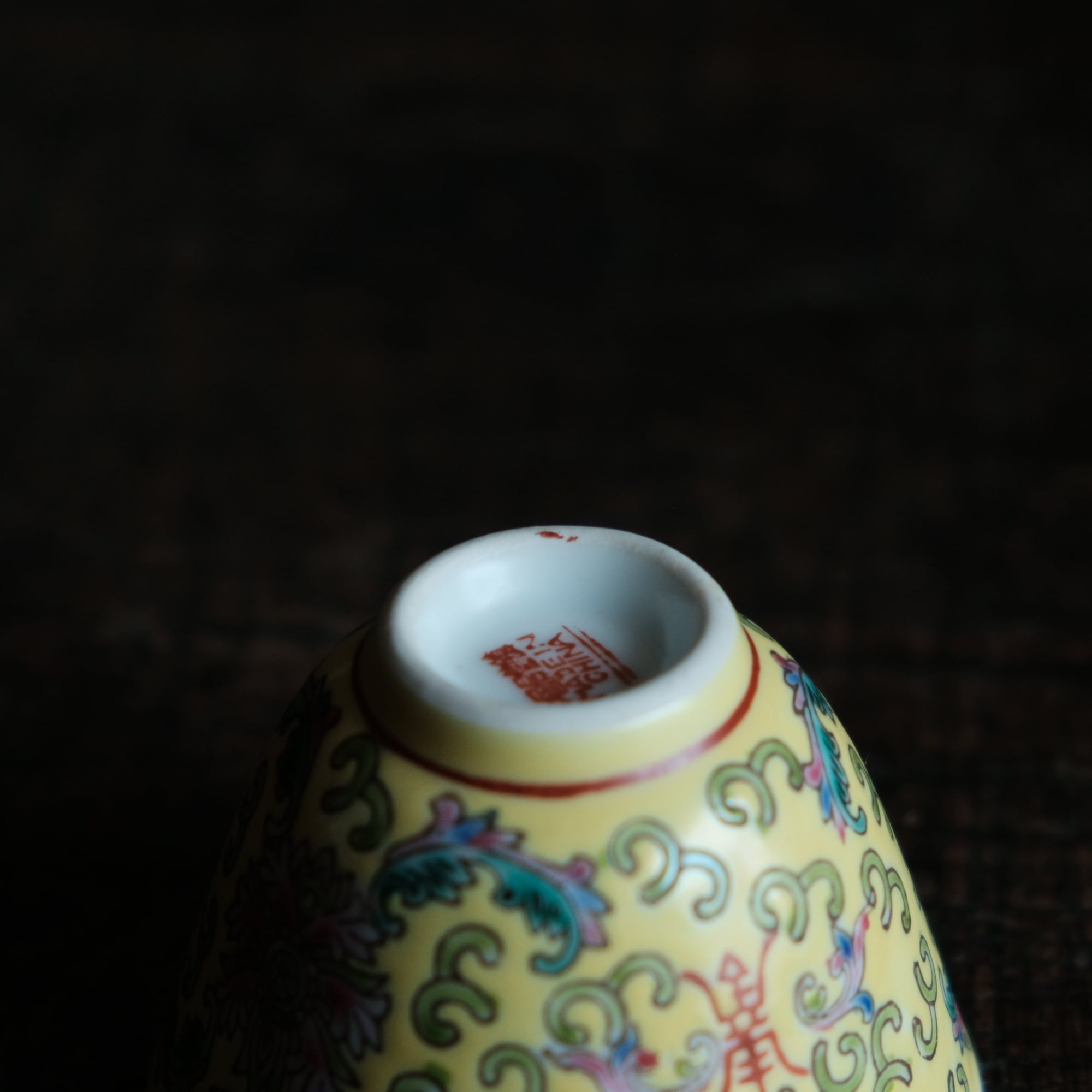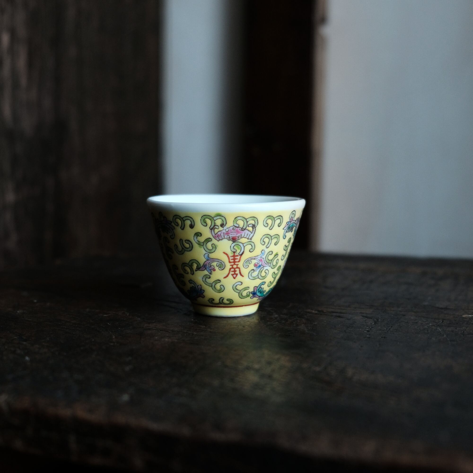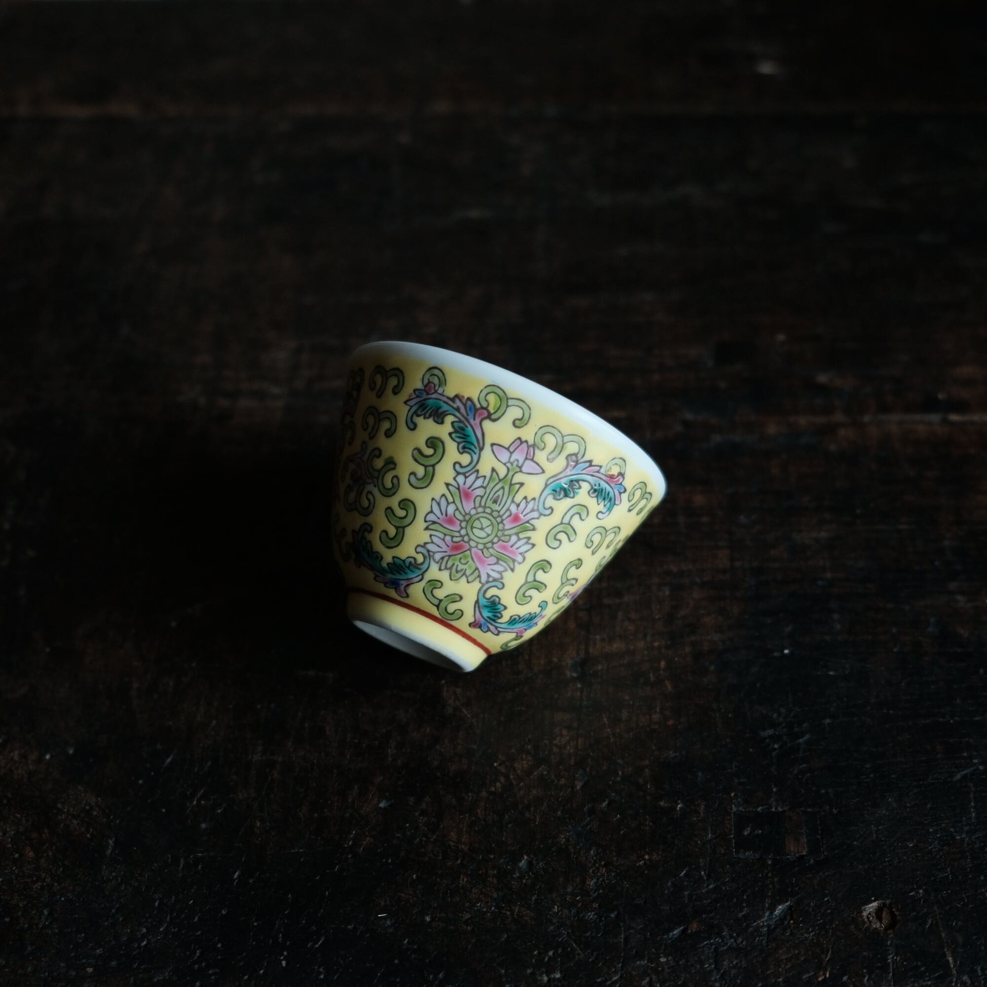 花唐草と蝙蝠と漢字◆中国景徳鎮 花唐草文色絵猪口 茶杯 カップ 花唐草 中華・台湾料理 黄色 イエロー