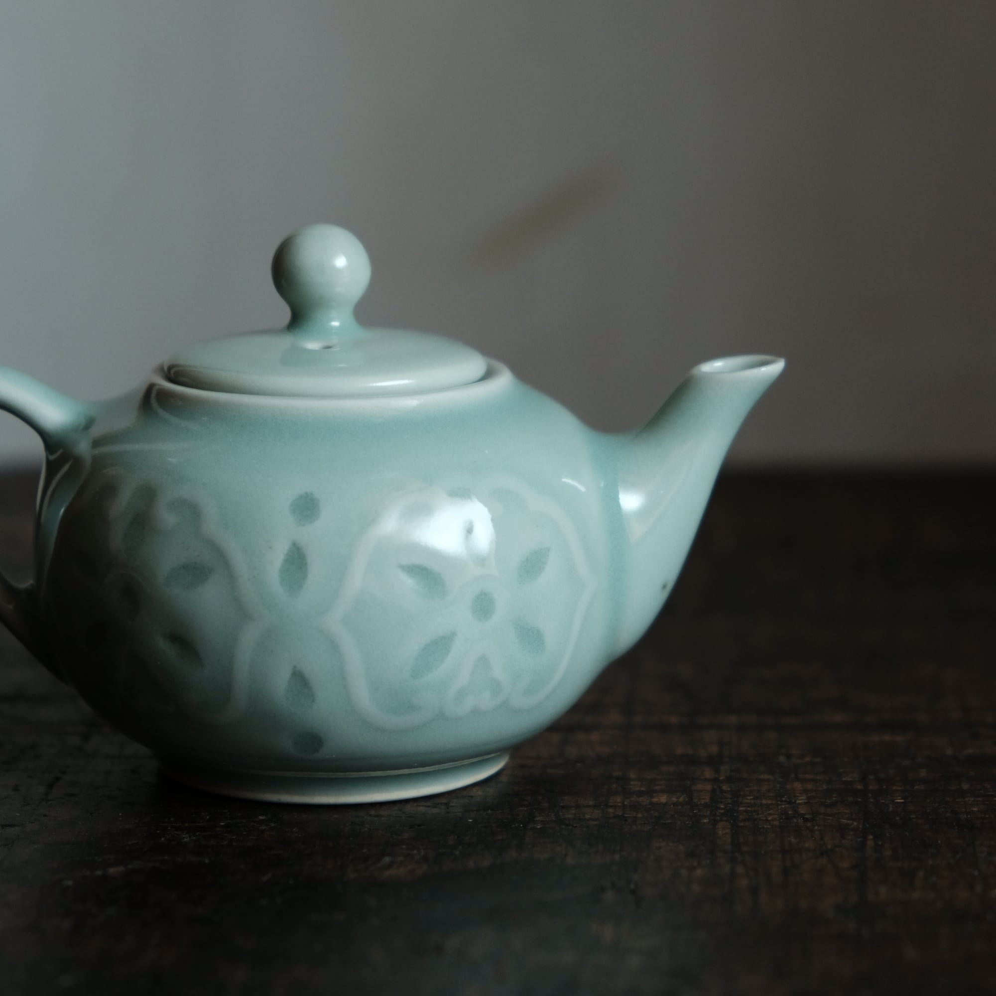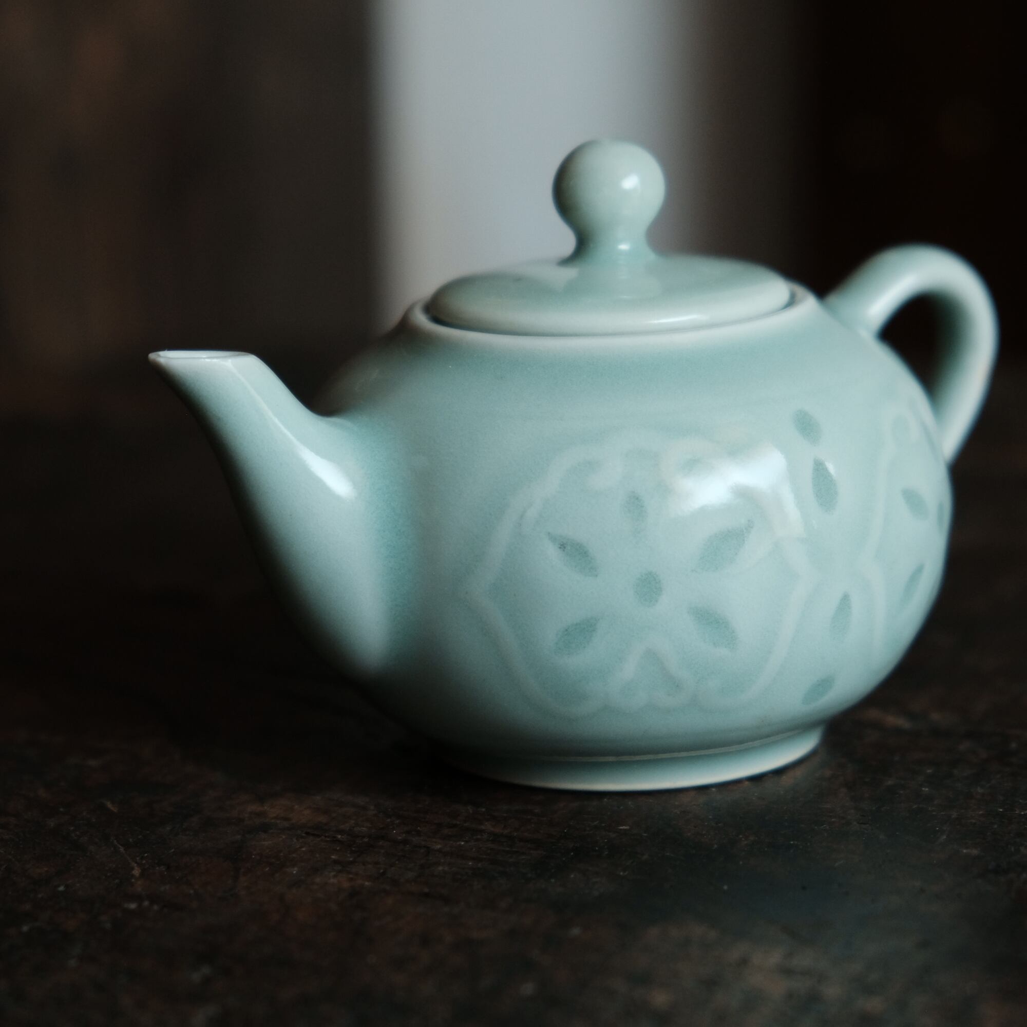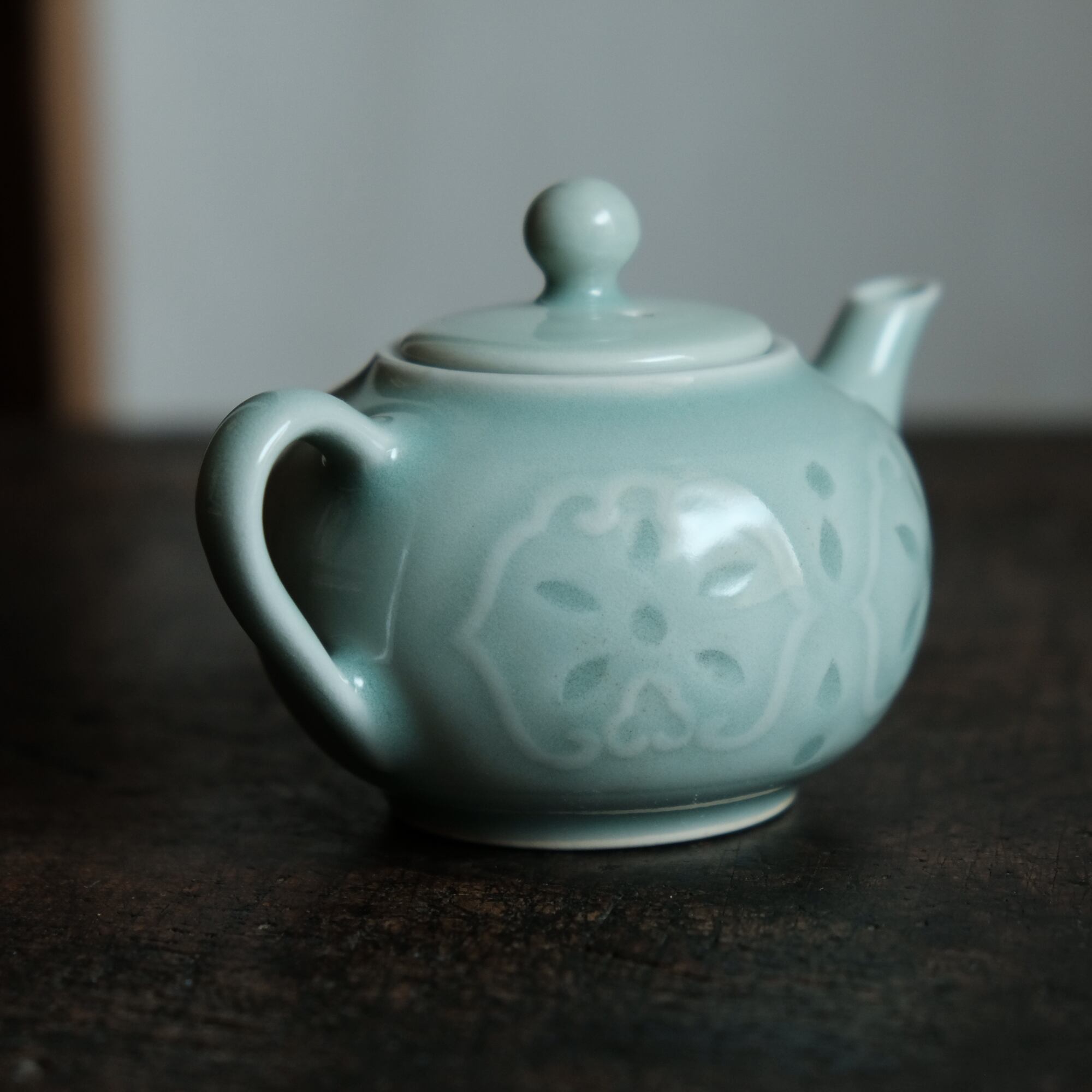 未使用品◆青磁で素敵。中国産 青磁陽刻煎茶急須 インテリア 茶器 工芸品 チャイナレトロ シノワズリ