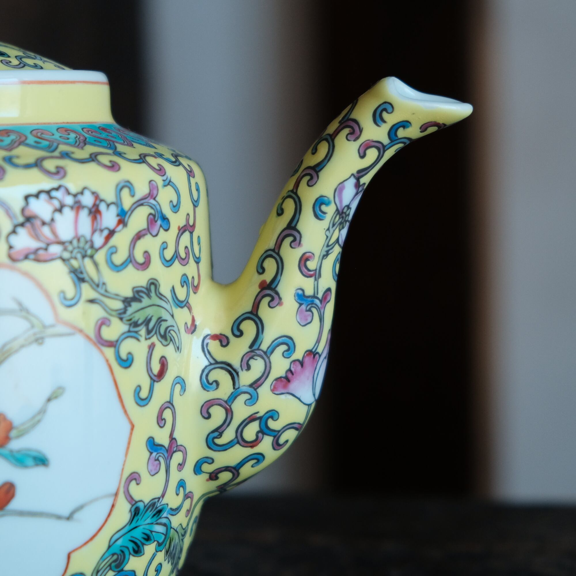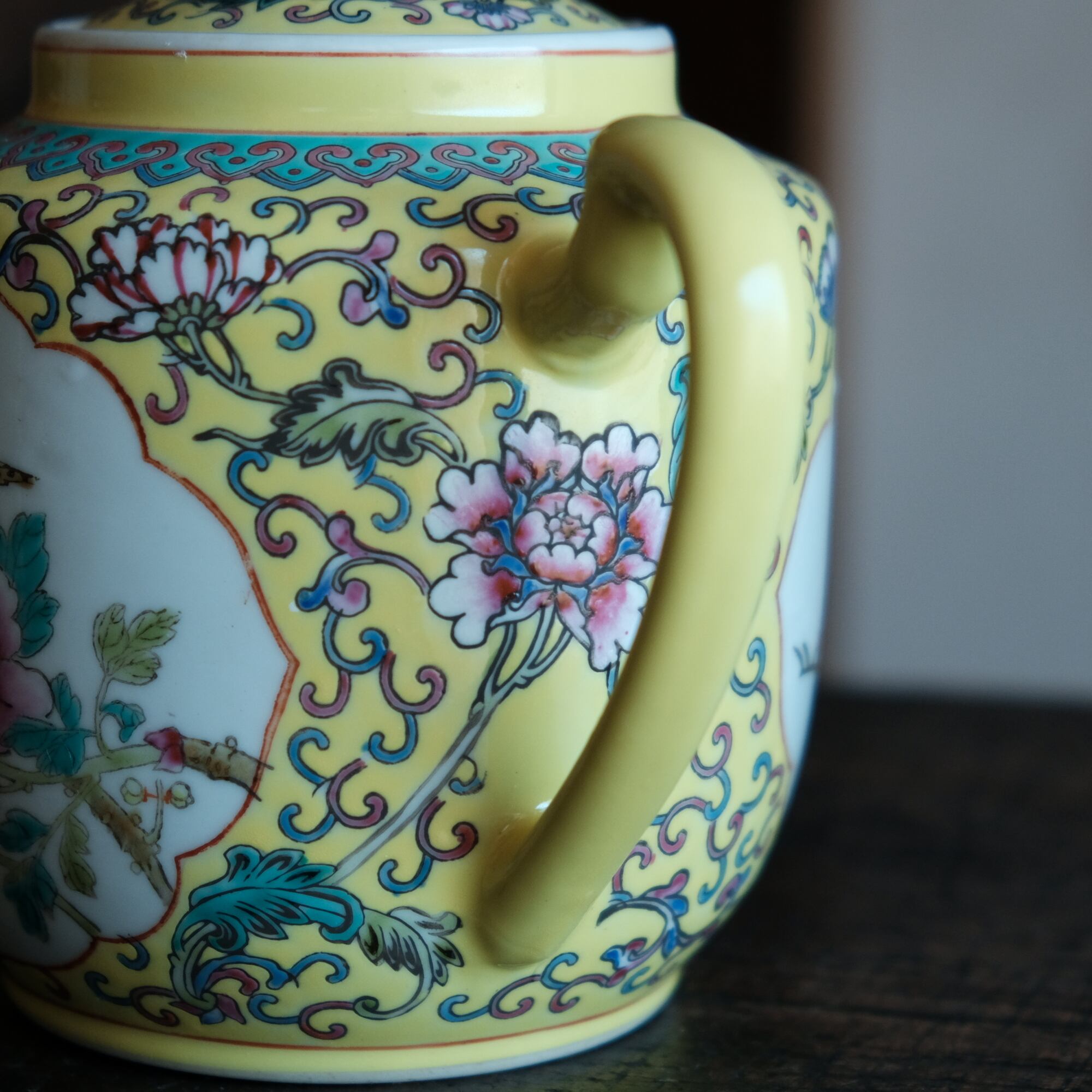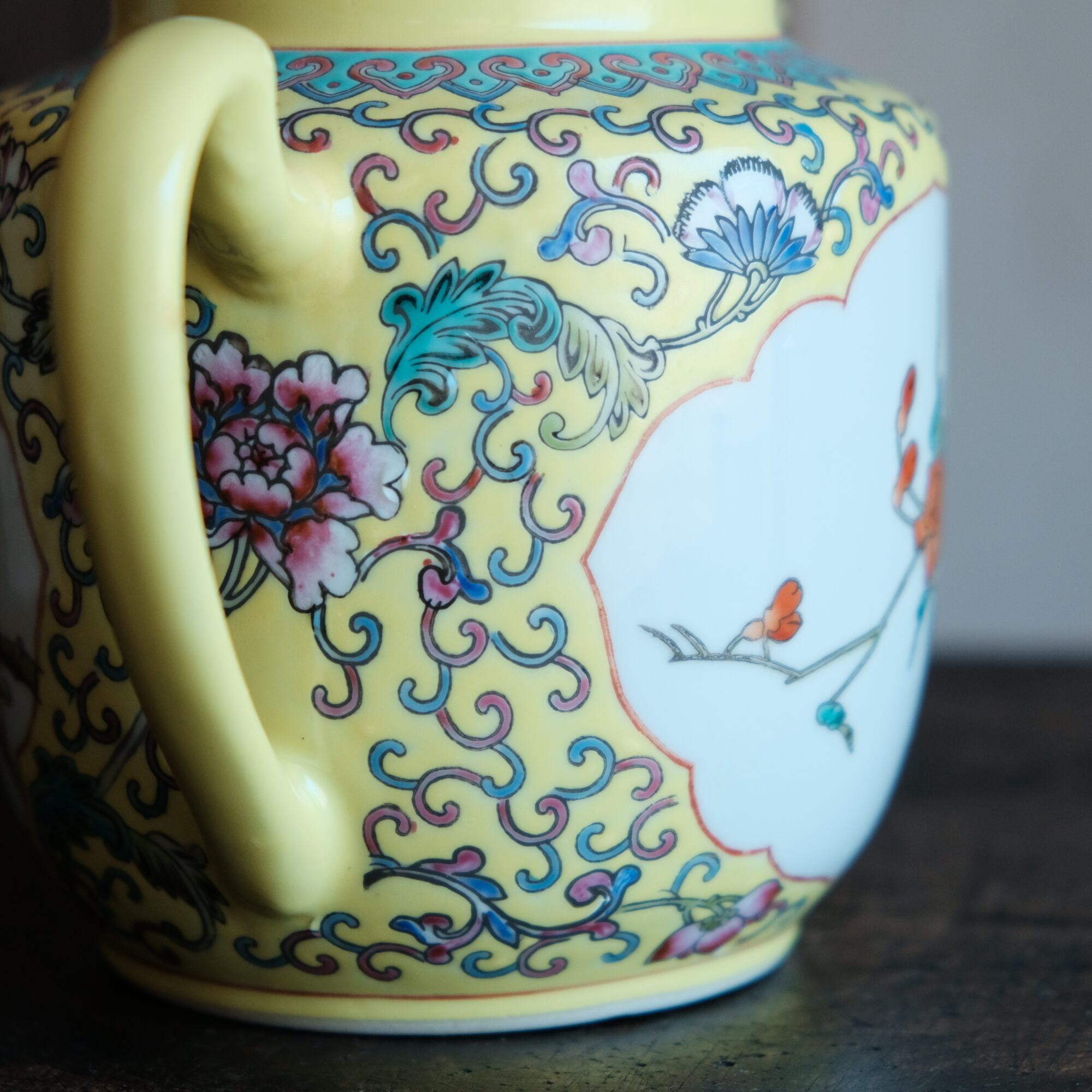 花と鳥◆中国景徳鎮 花鳥文色絵急須 茶器 シノワズリ チャイナレトロ ビビットカラー イエロー・黄色
