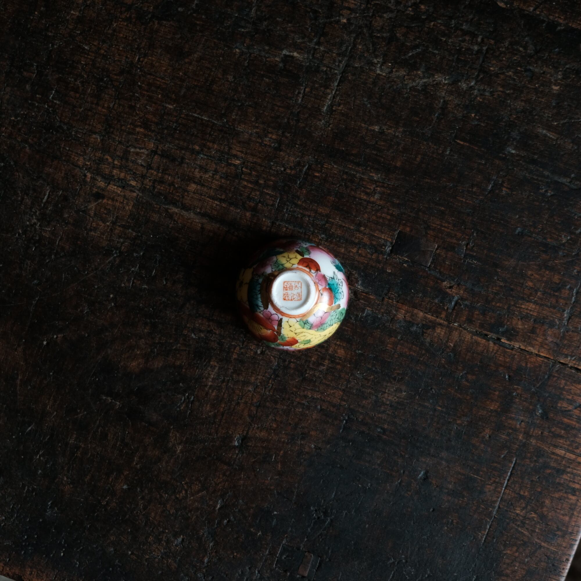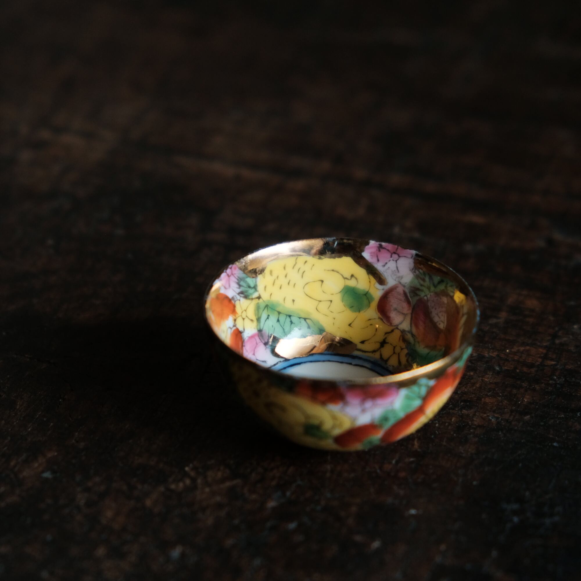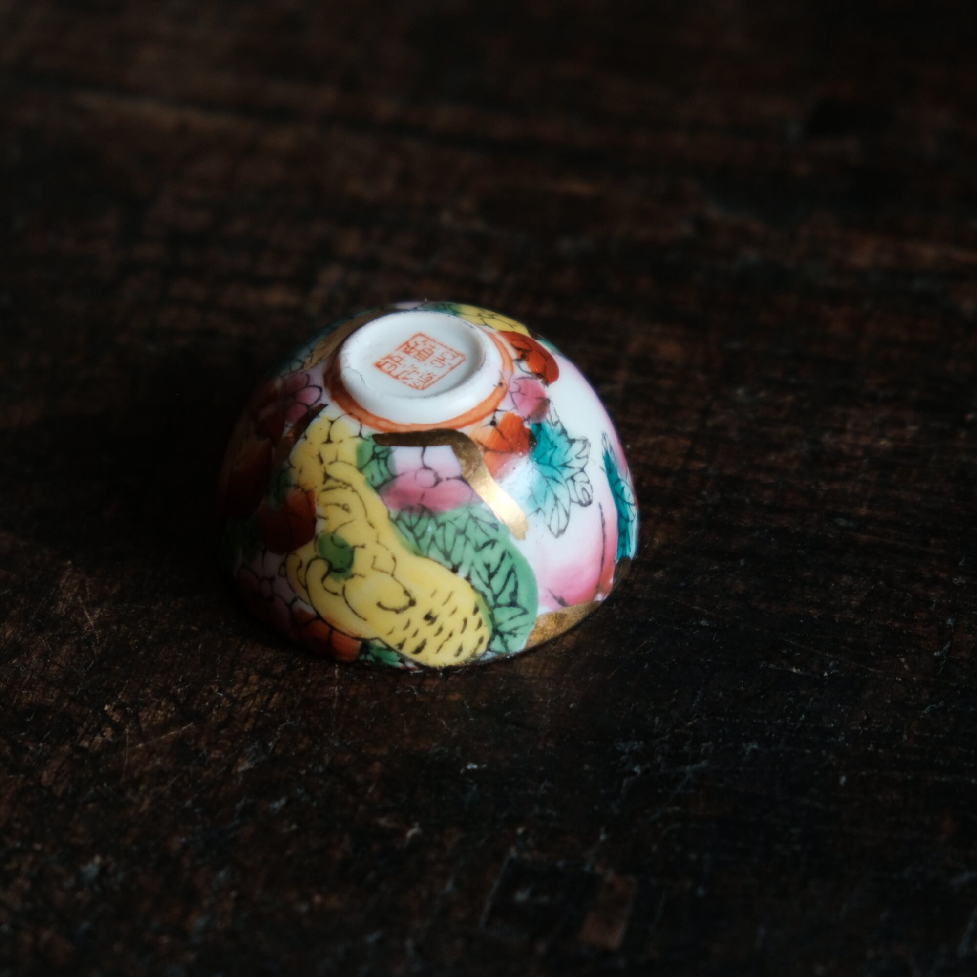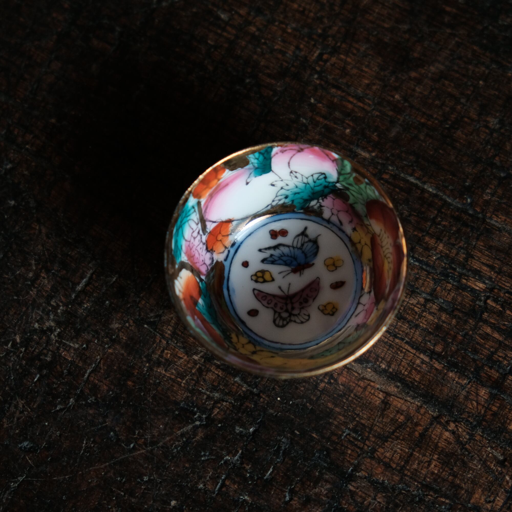 見込みに蝶々◆花や果実。中国景徳鎮 色絵金彩小ぶり猪口 茶杯 カラフル チャイナレトロ シノワズリ 工芸品