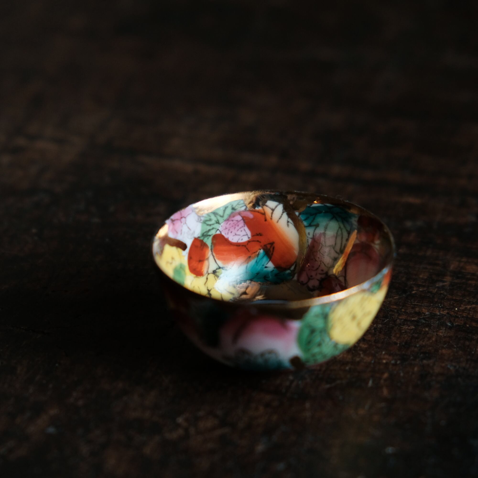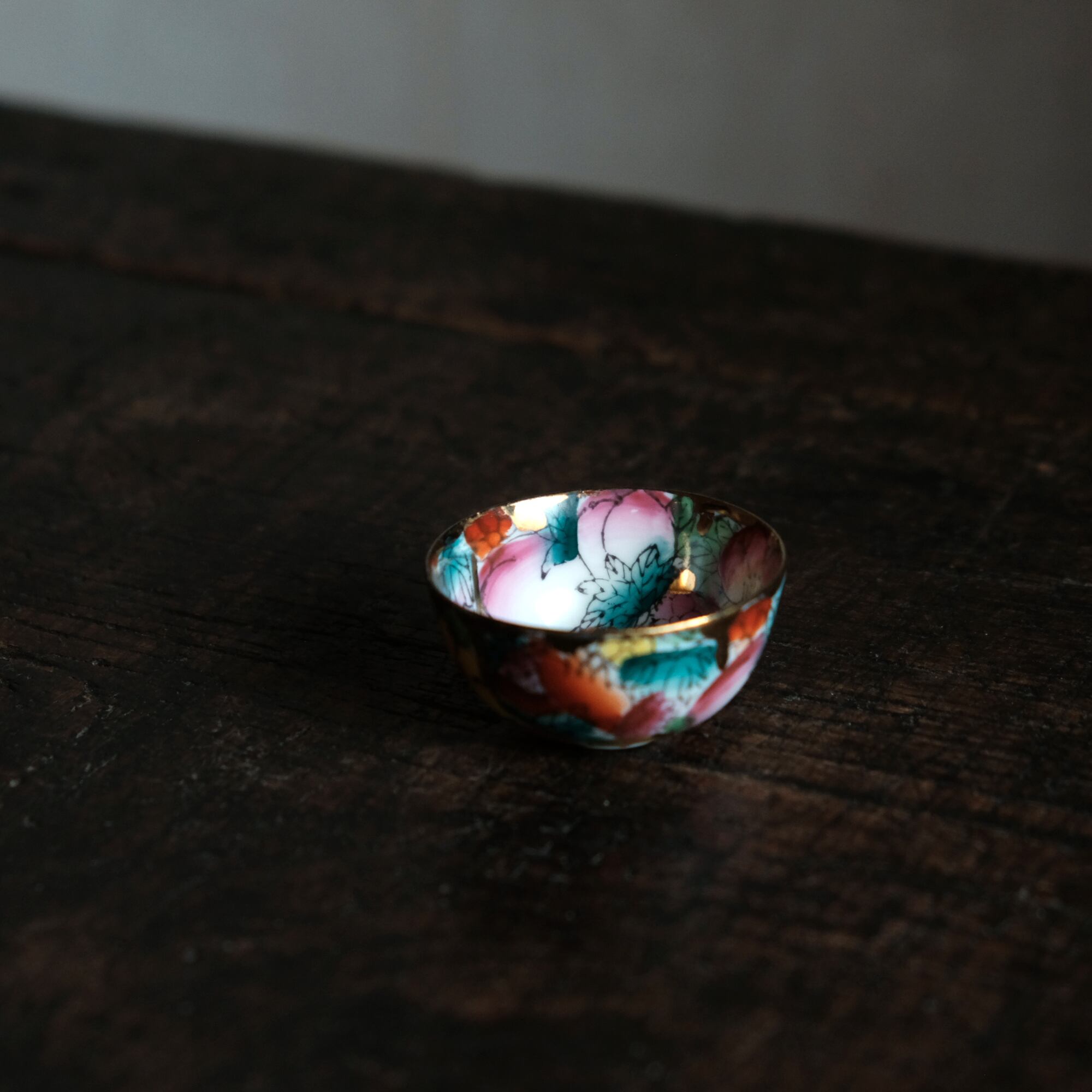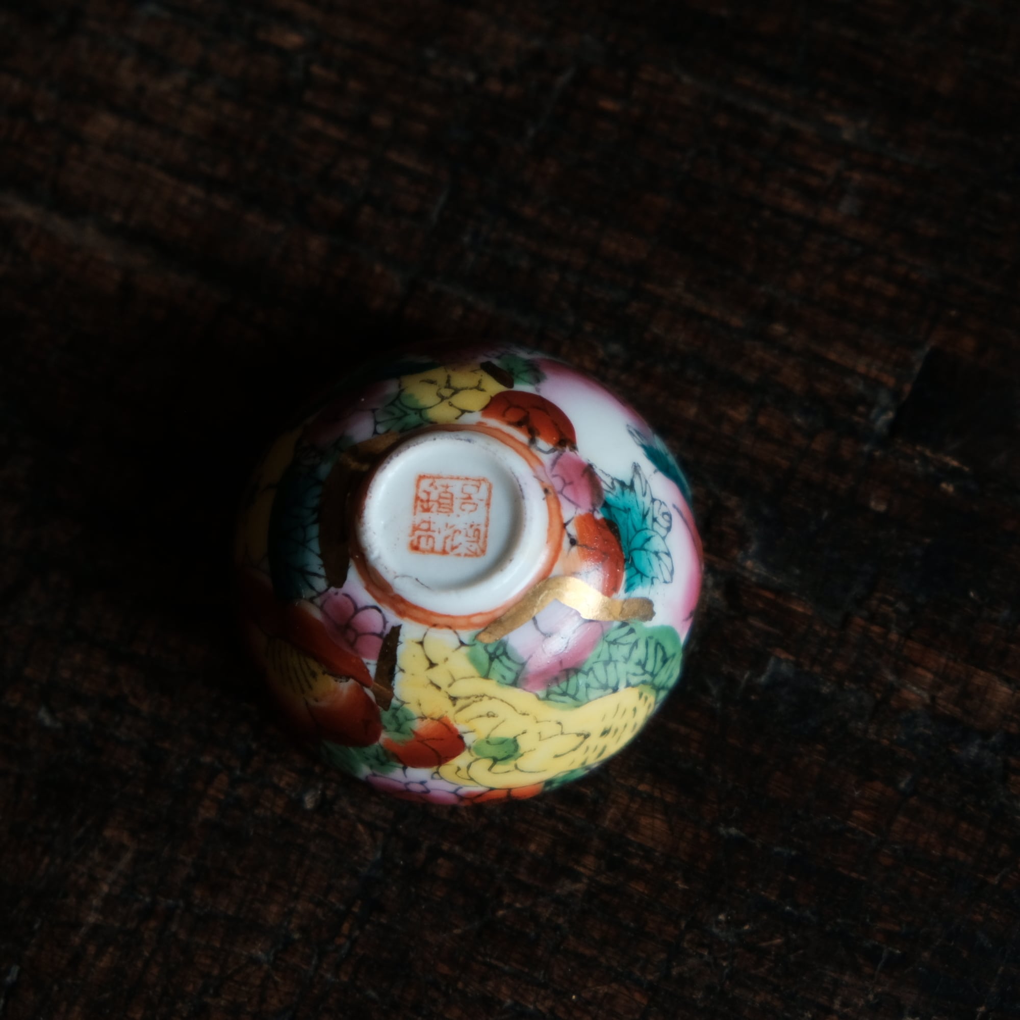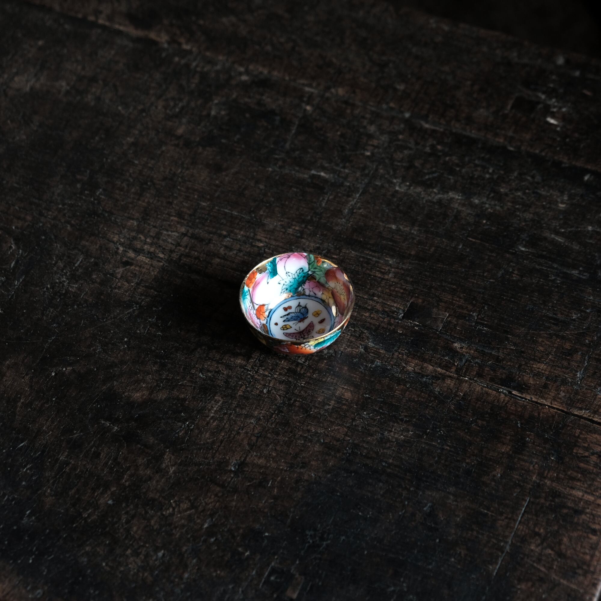 見込みに蝶々◆花や果実。中国景徳鎮 色絵金彩小ぶり猪口 茶杯 カラフル チャイナレトロ シノワズリ 工芸品