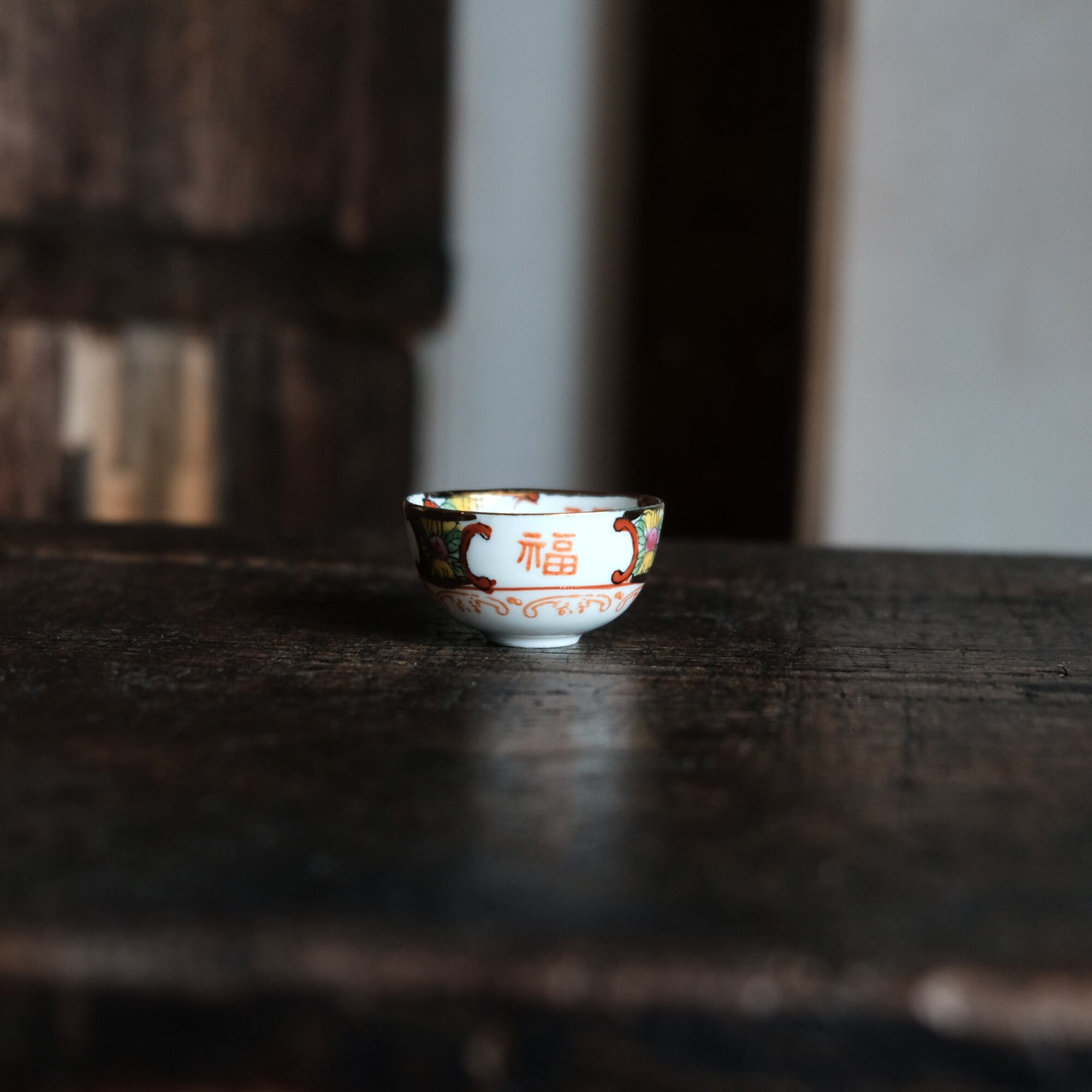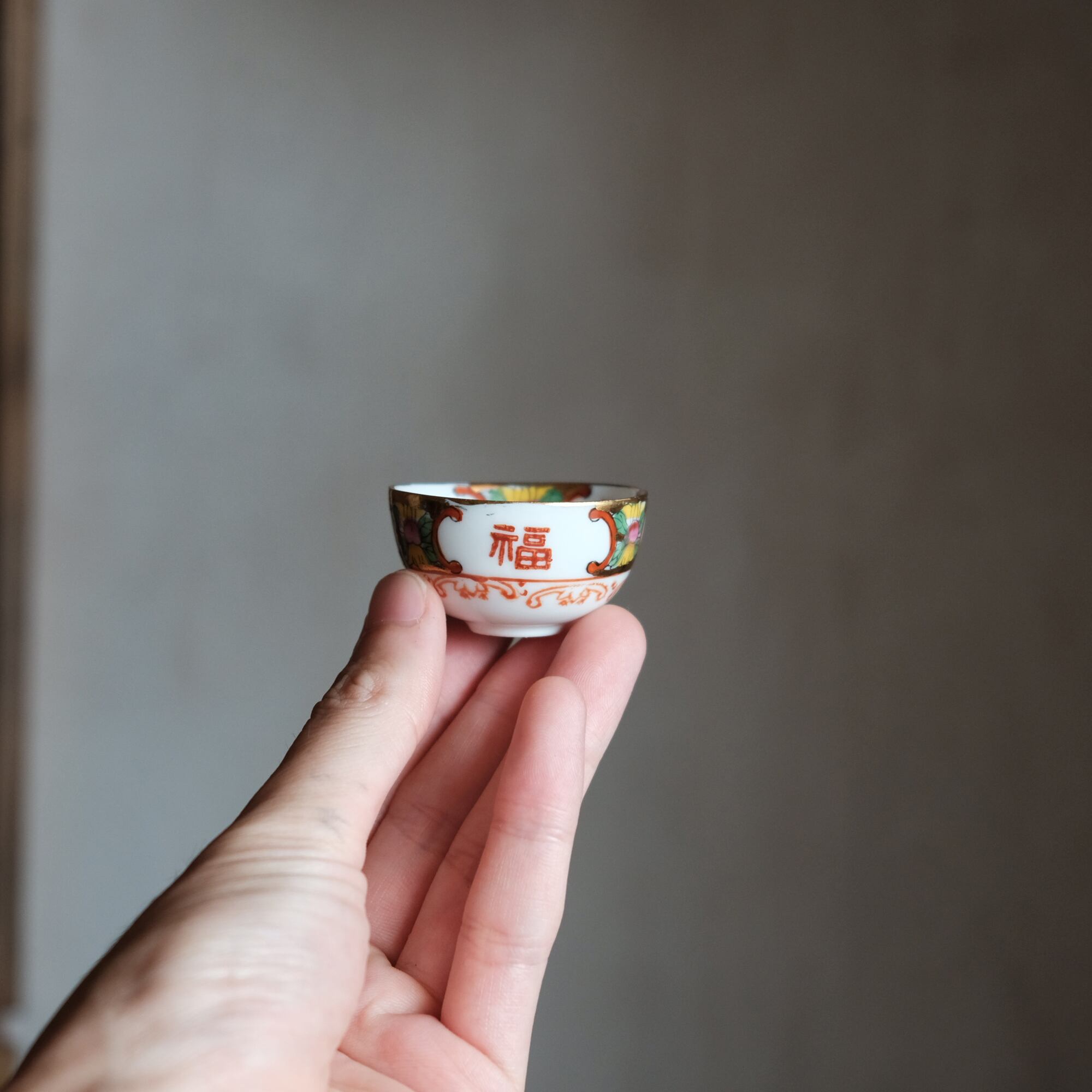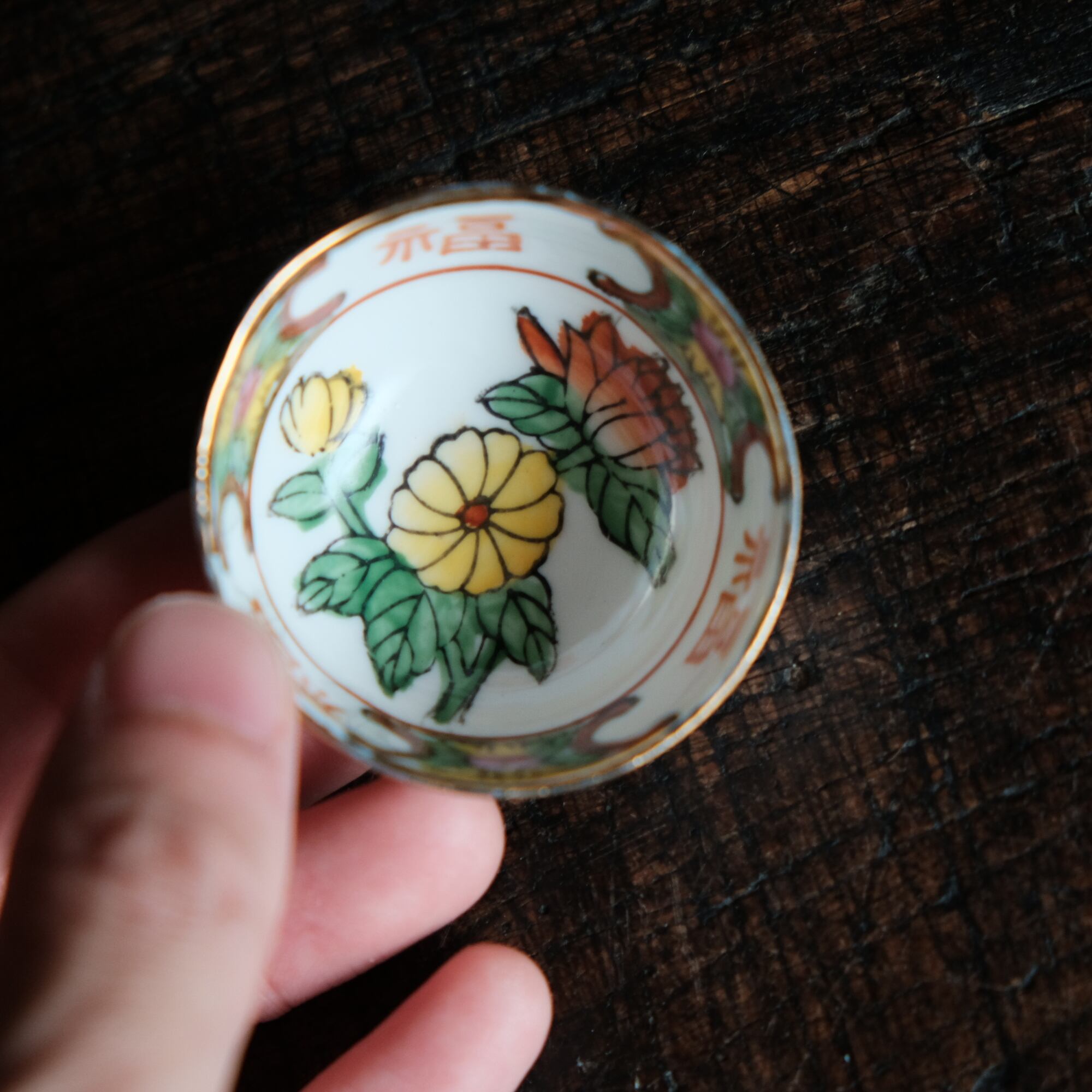 菊と福◆中国景徳鎮 色絵金彩小ぶり猪口 茶杯 カラフル チャイナレトロ シノワズリ 工芸品