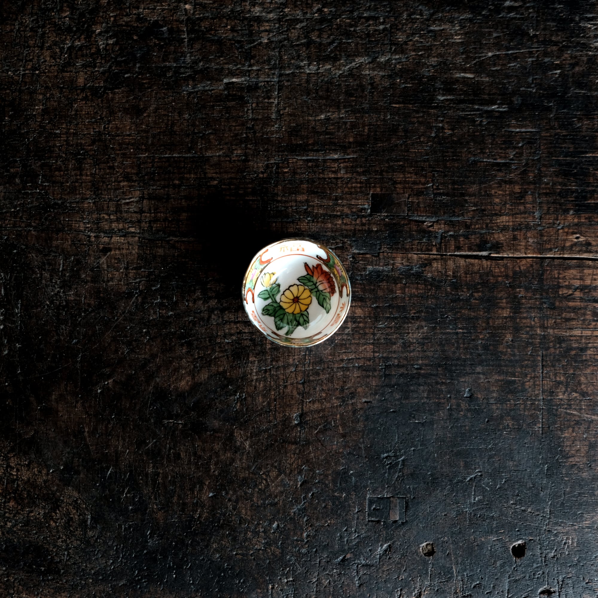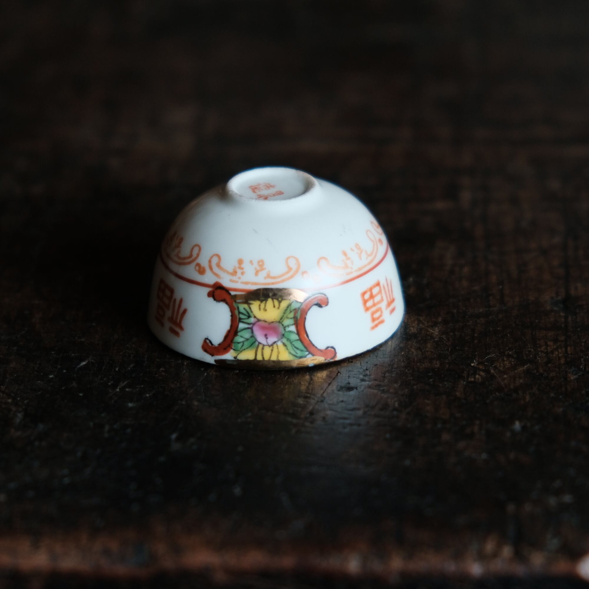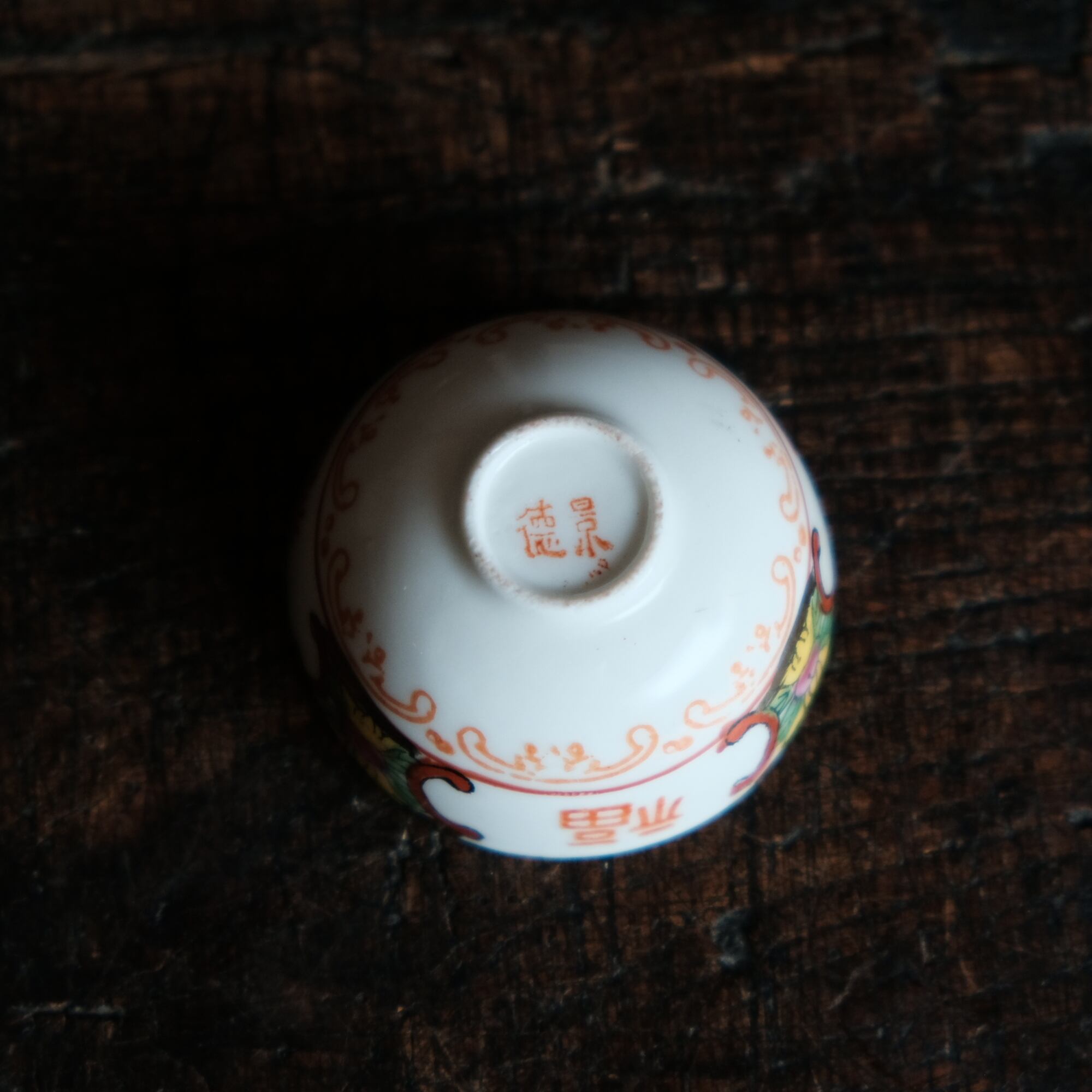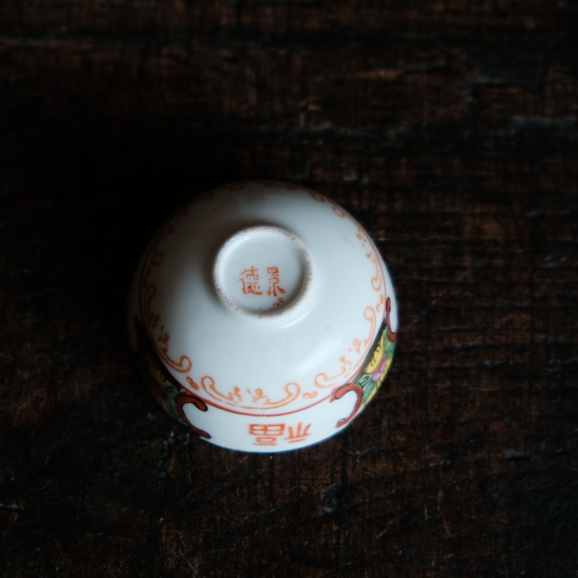 菊と福◆中国景徳鎮 色絵金彩小ぶり猪口 茶杯 カラフル チャイナレトロ シノワズリ 工芸品