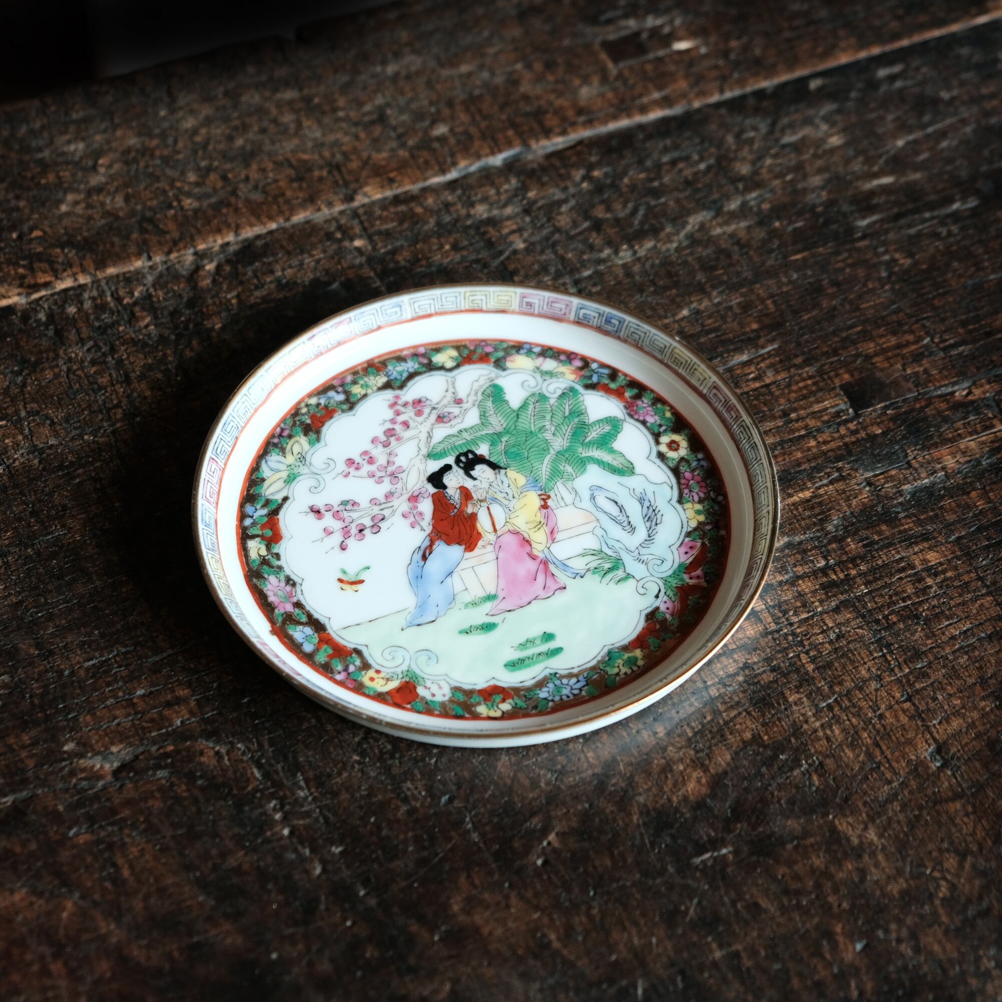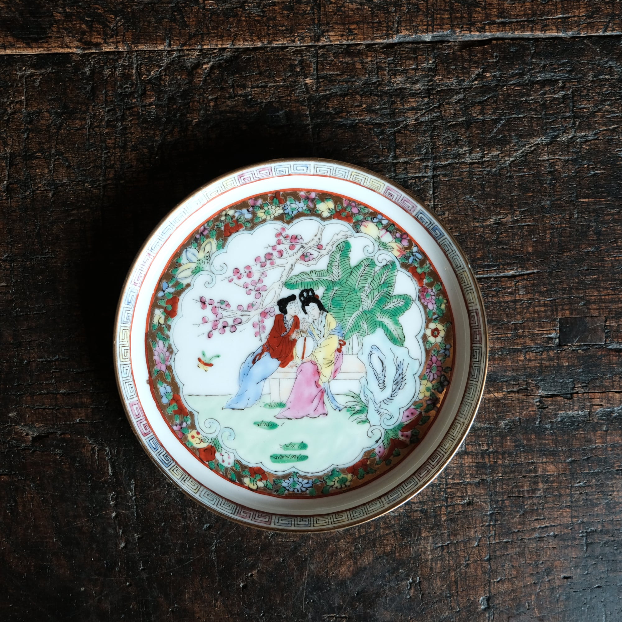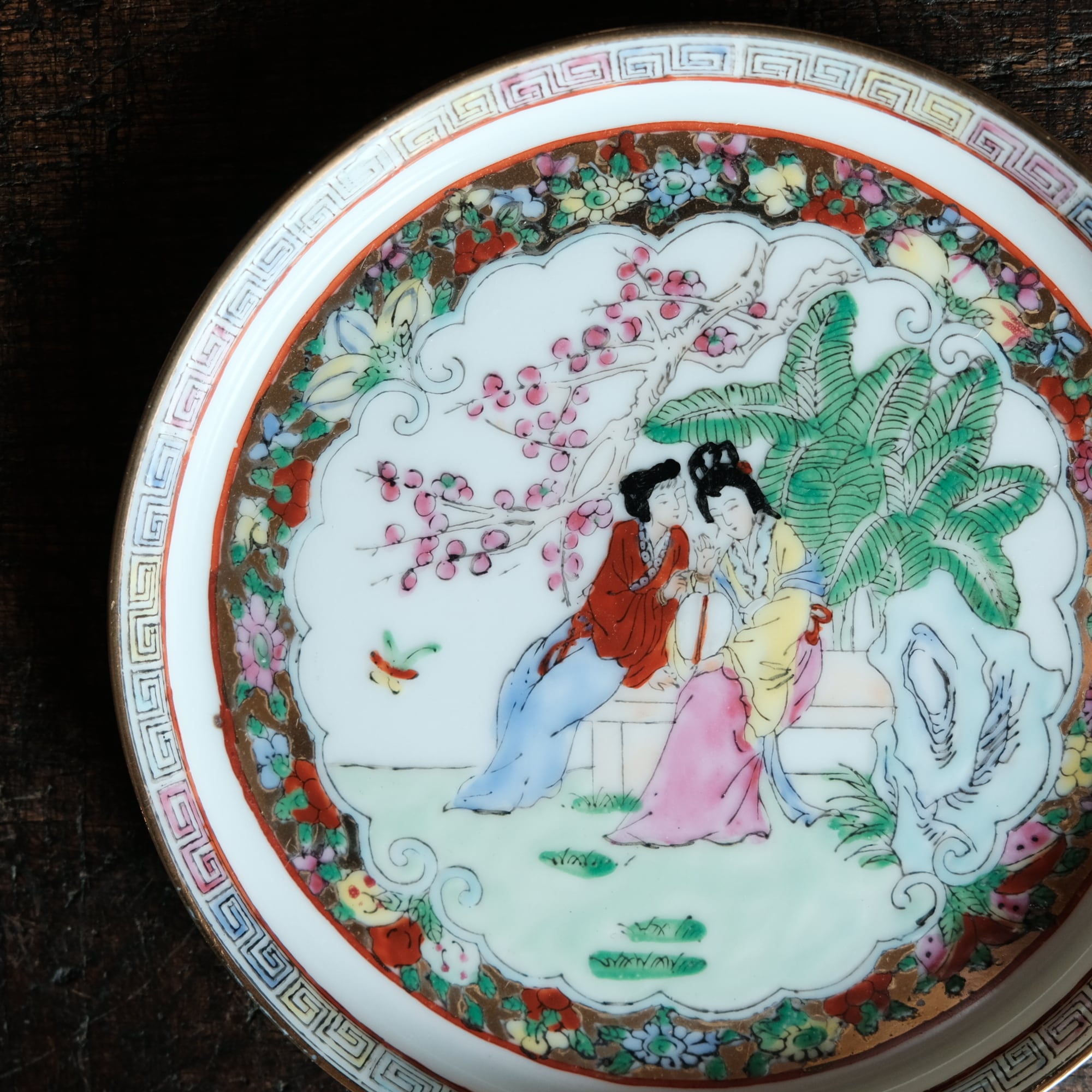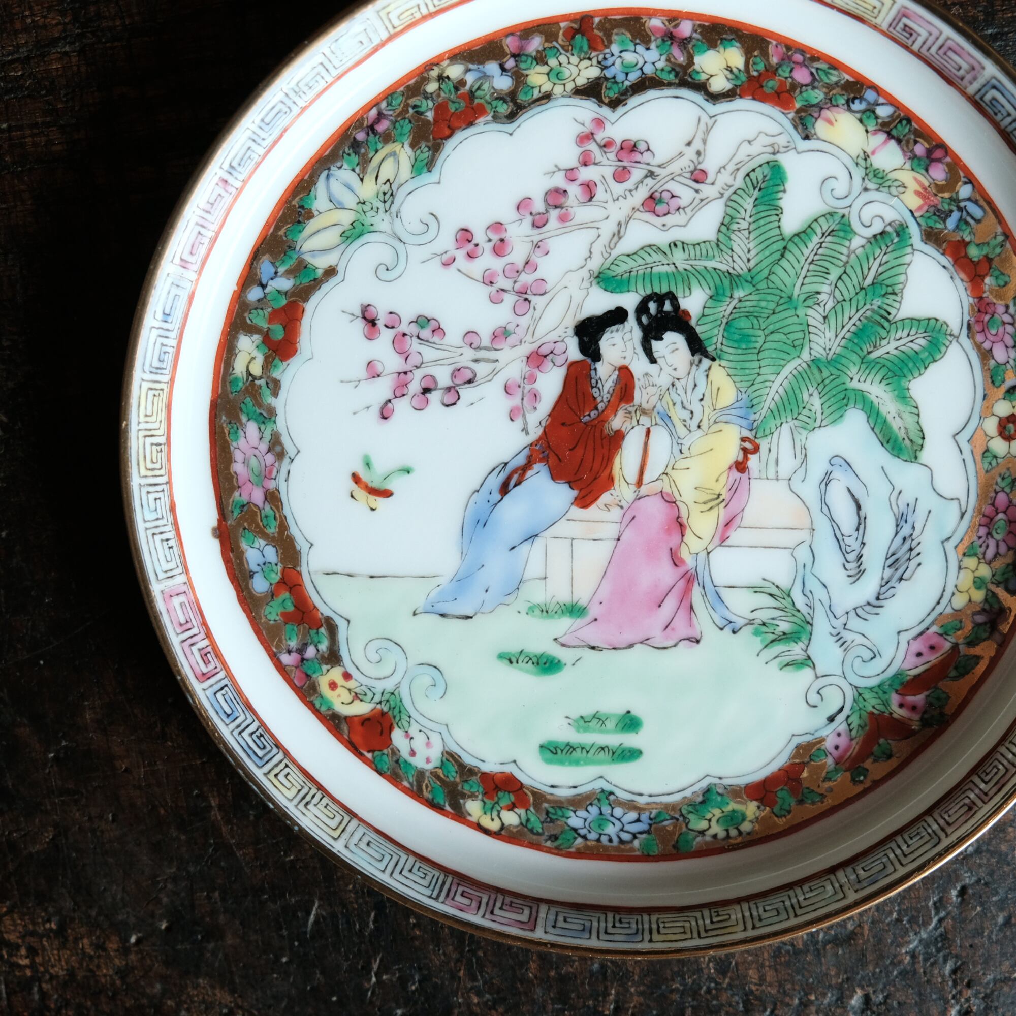 椅子に座る皇女◆草花と蝶々。中国産色絵金彩中皿プレート 煎茶茶器 シノワズリ チャイナレトロ インテリア