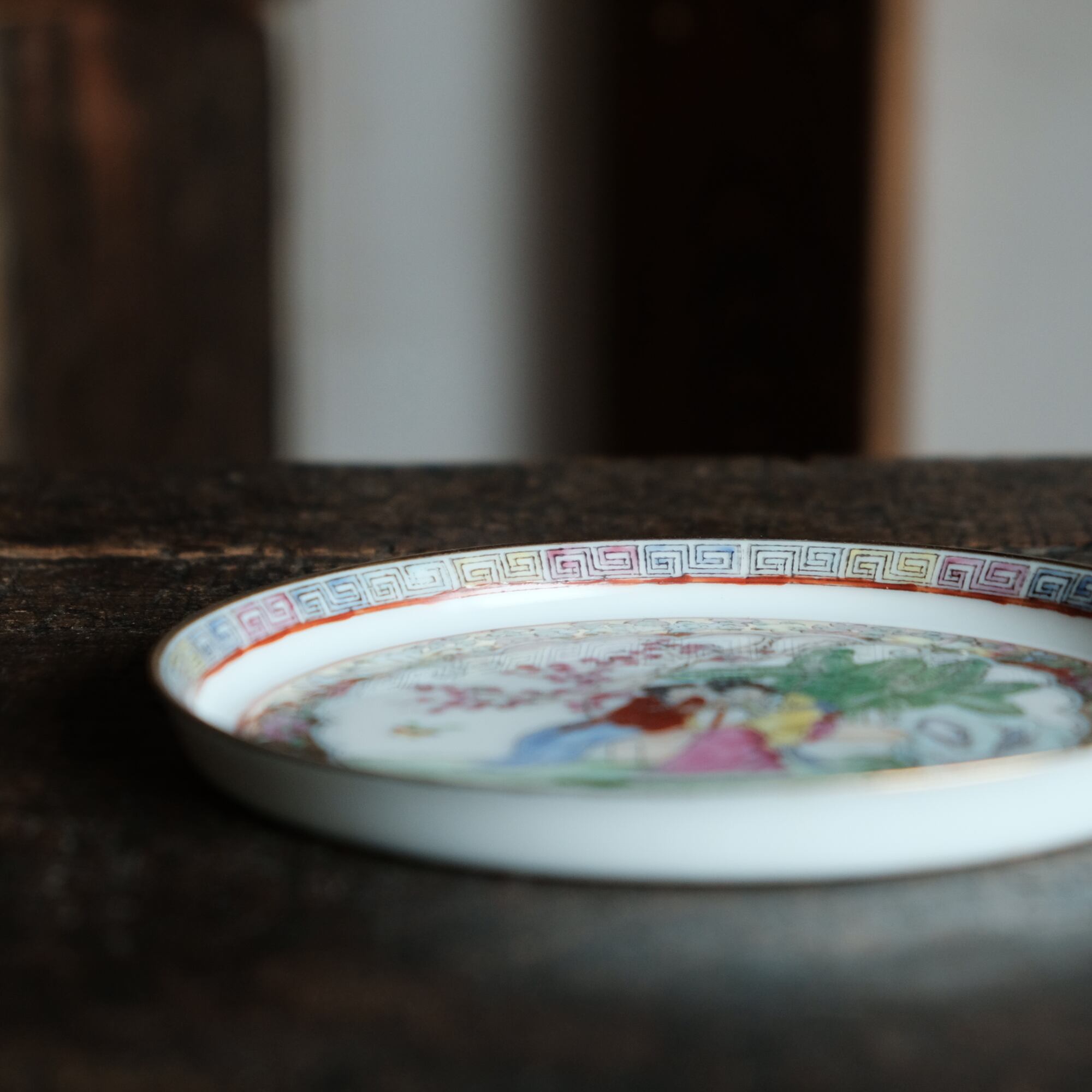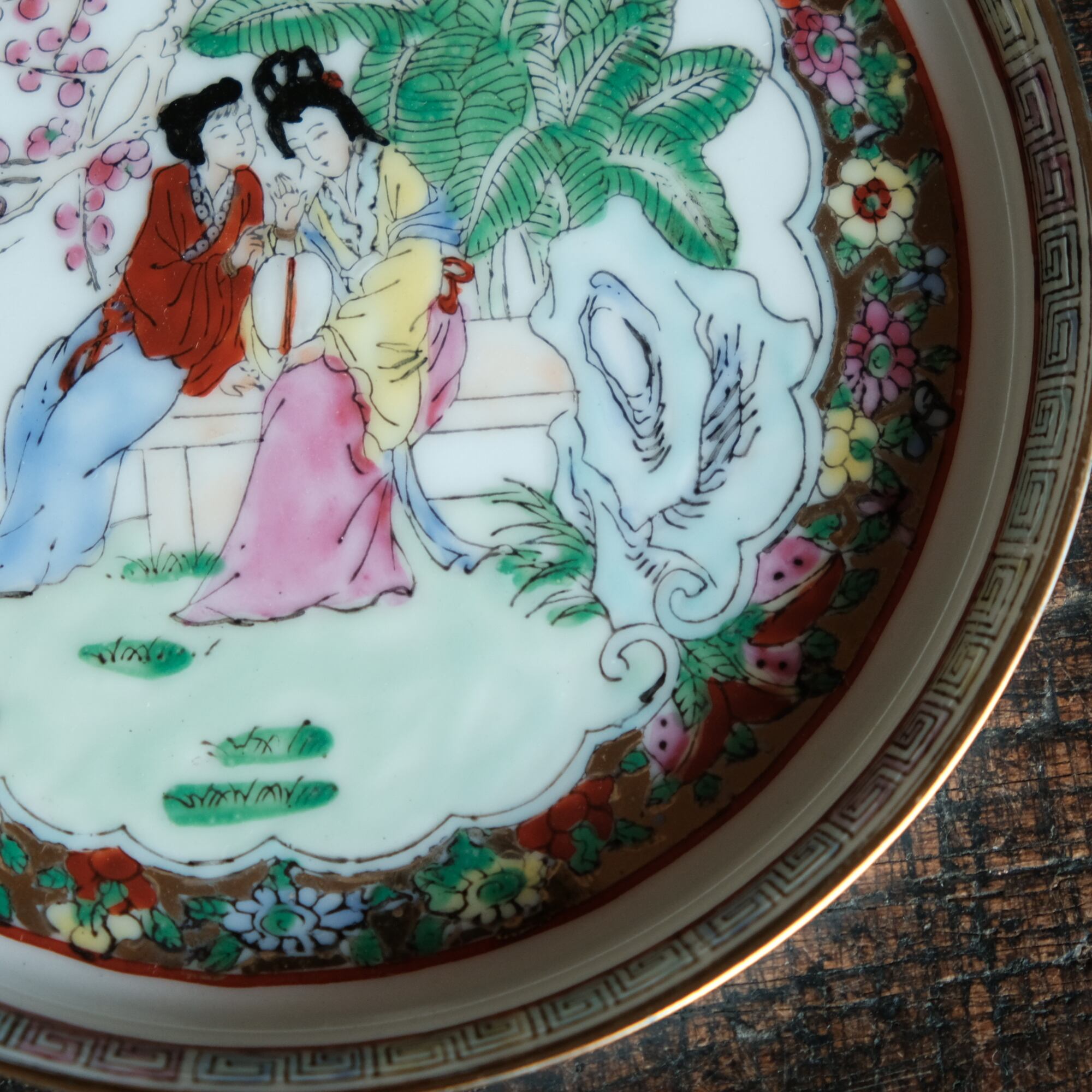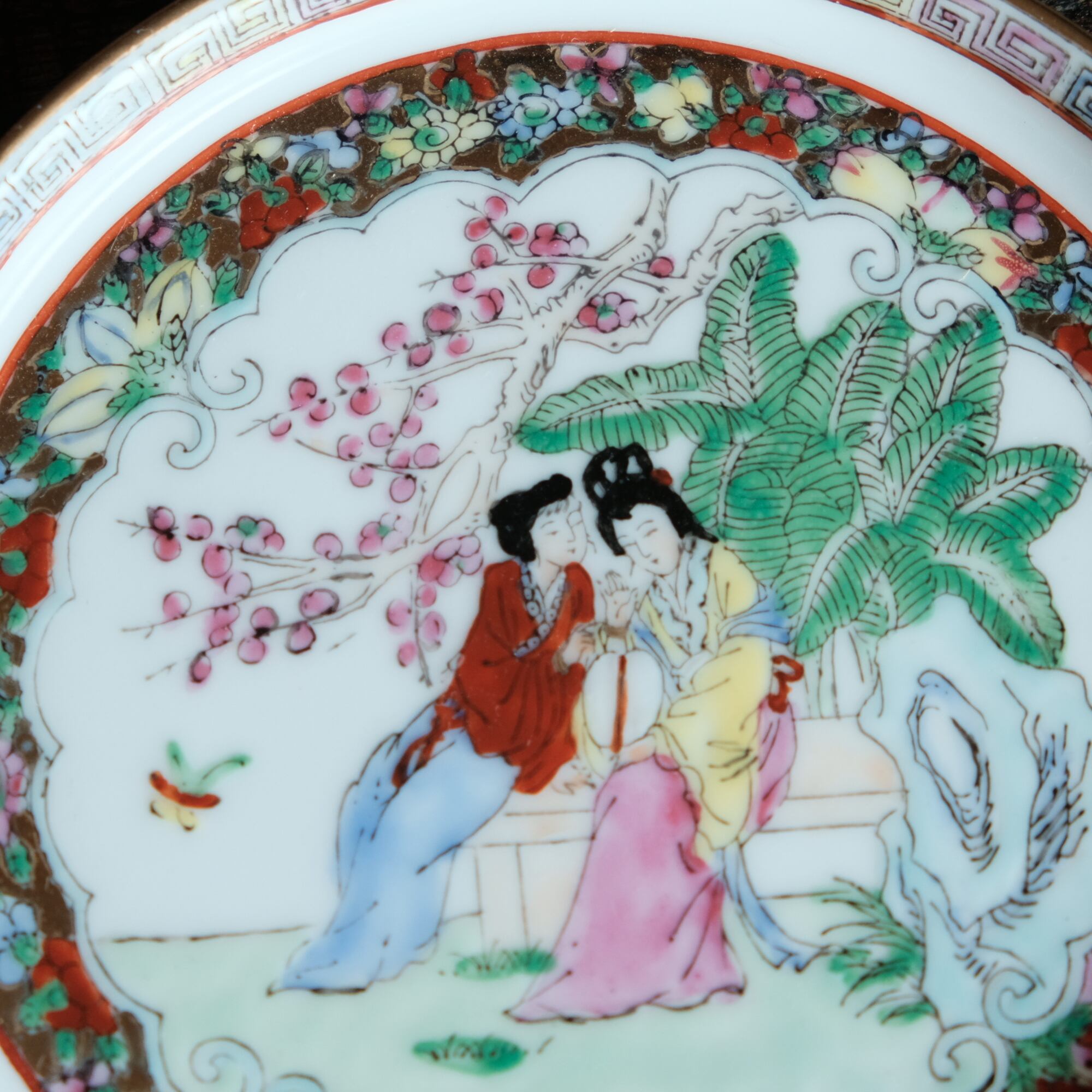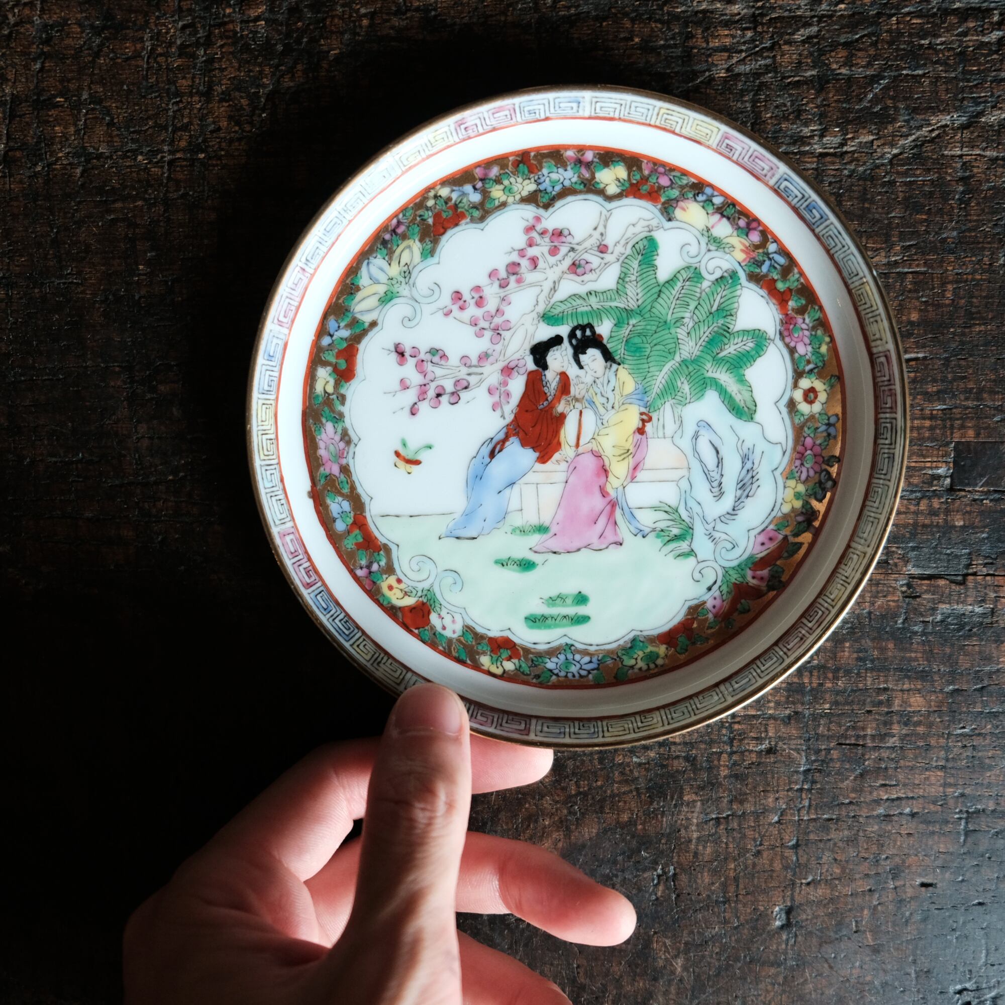 椅子に座る皇女◆草花と蝶々。中国産色絵金彩中皿プレート 煎茶茶器 シノワズリ チャイナレトロ インテリア