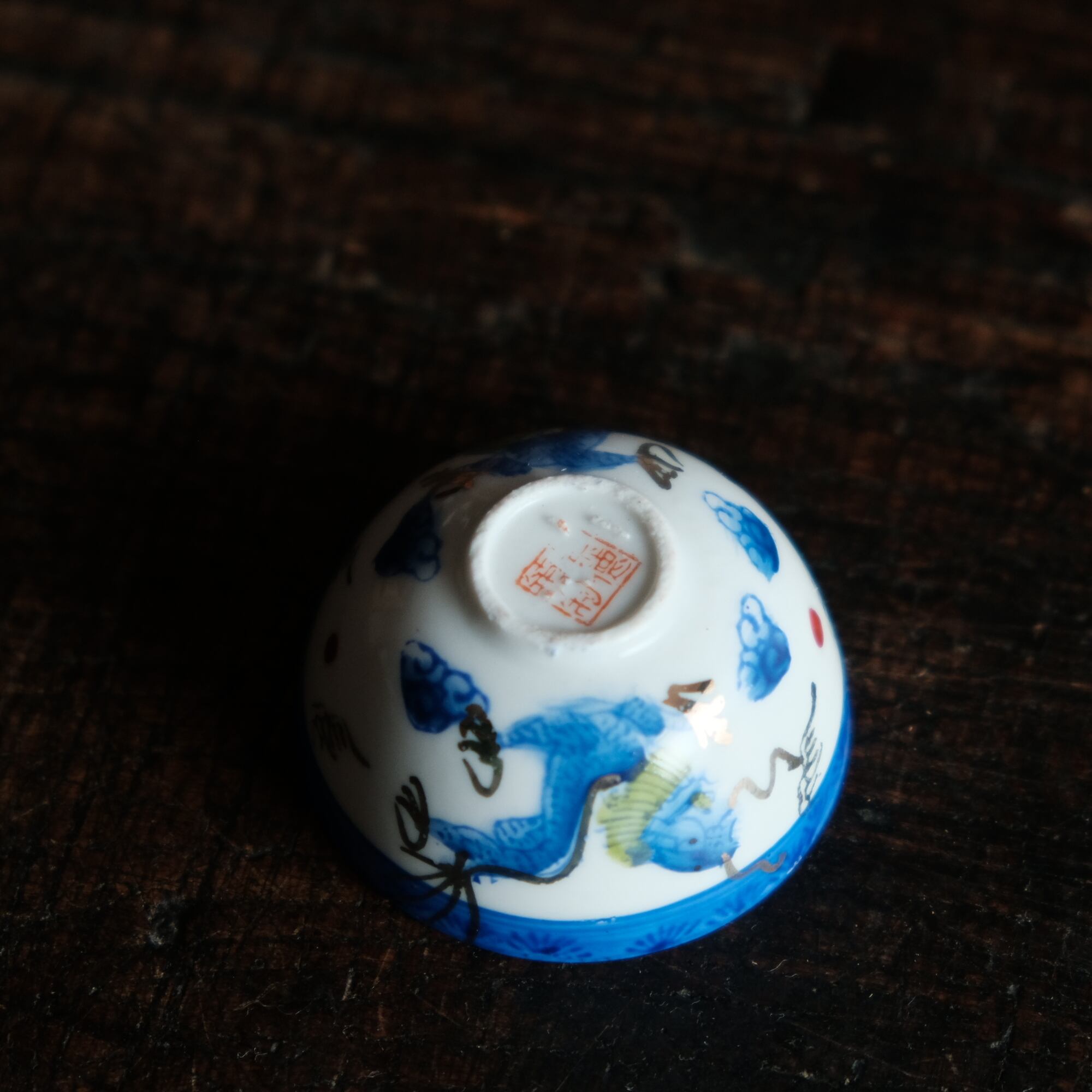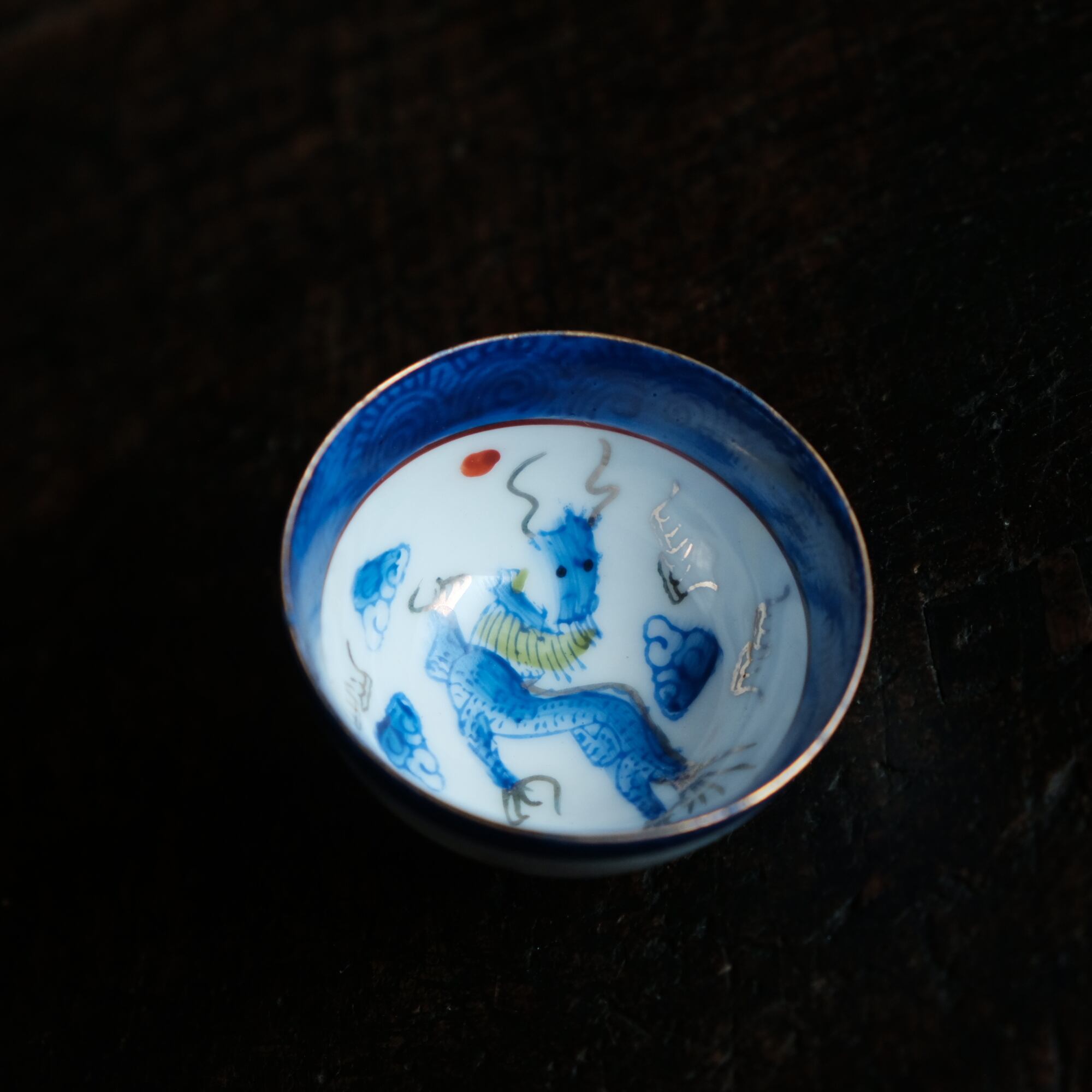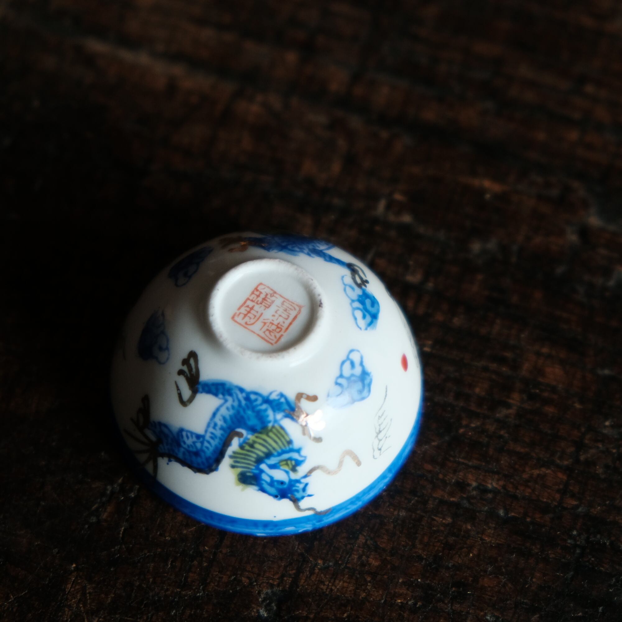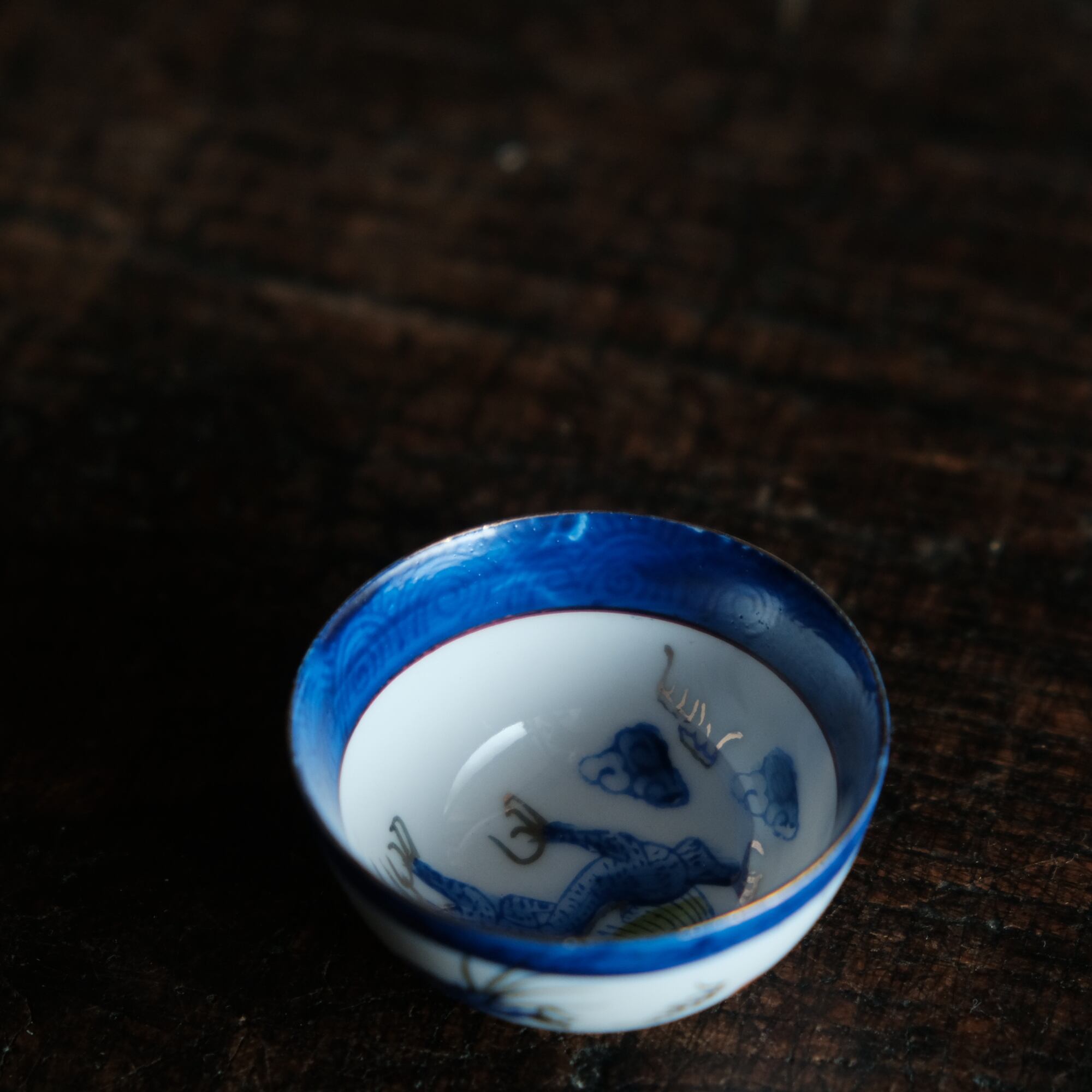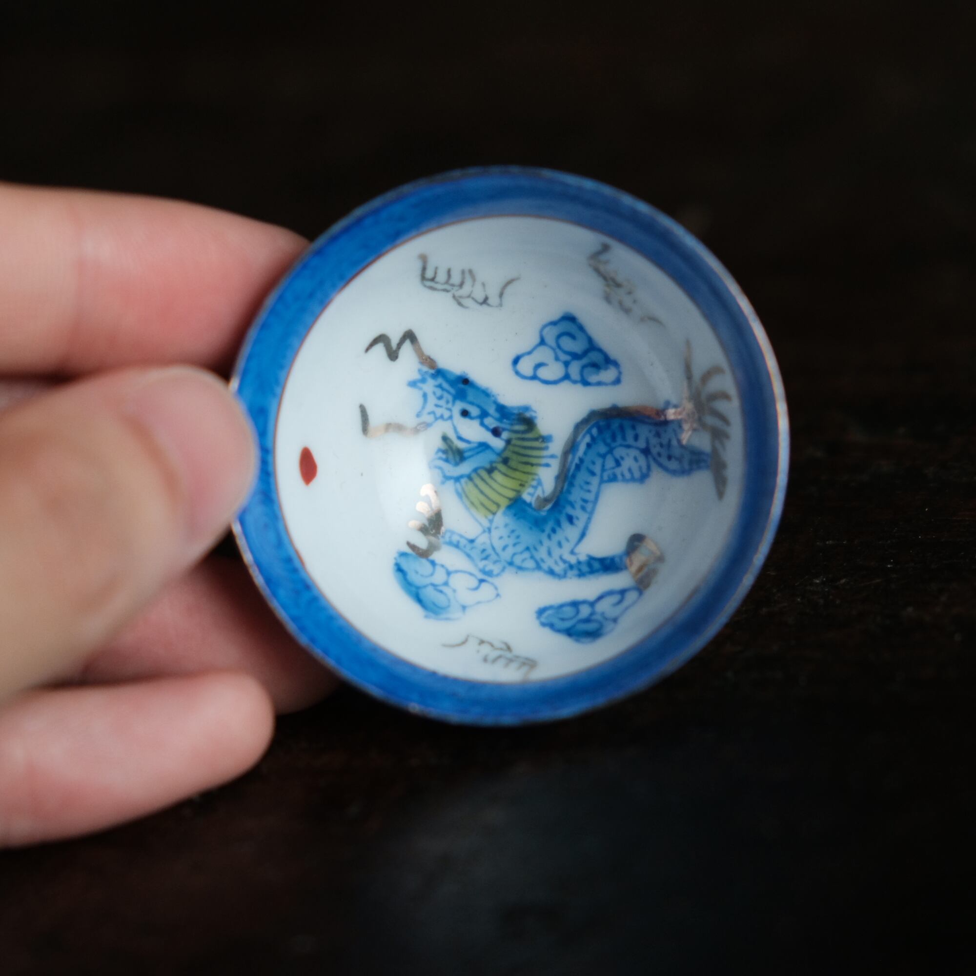 龍と雲と宝珠◆青で素敵。中国景徳鎮 色絵金彩小ぶり猪口 茶杯 ブルー チャイナレトロ シノワズリ 工芸品