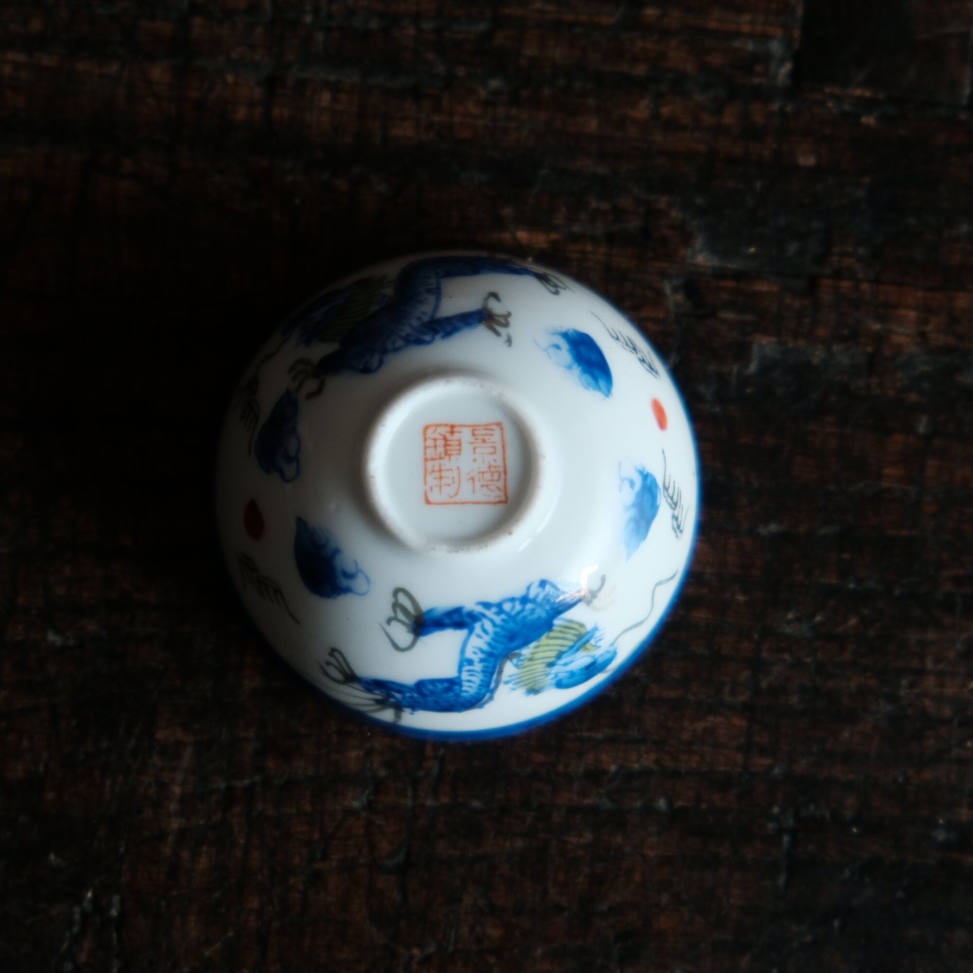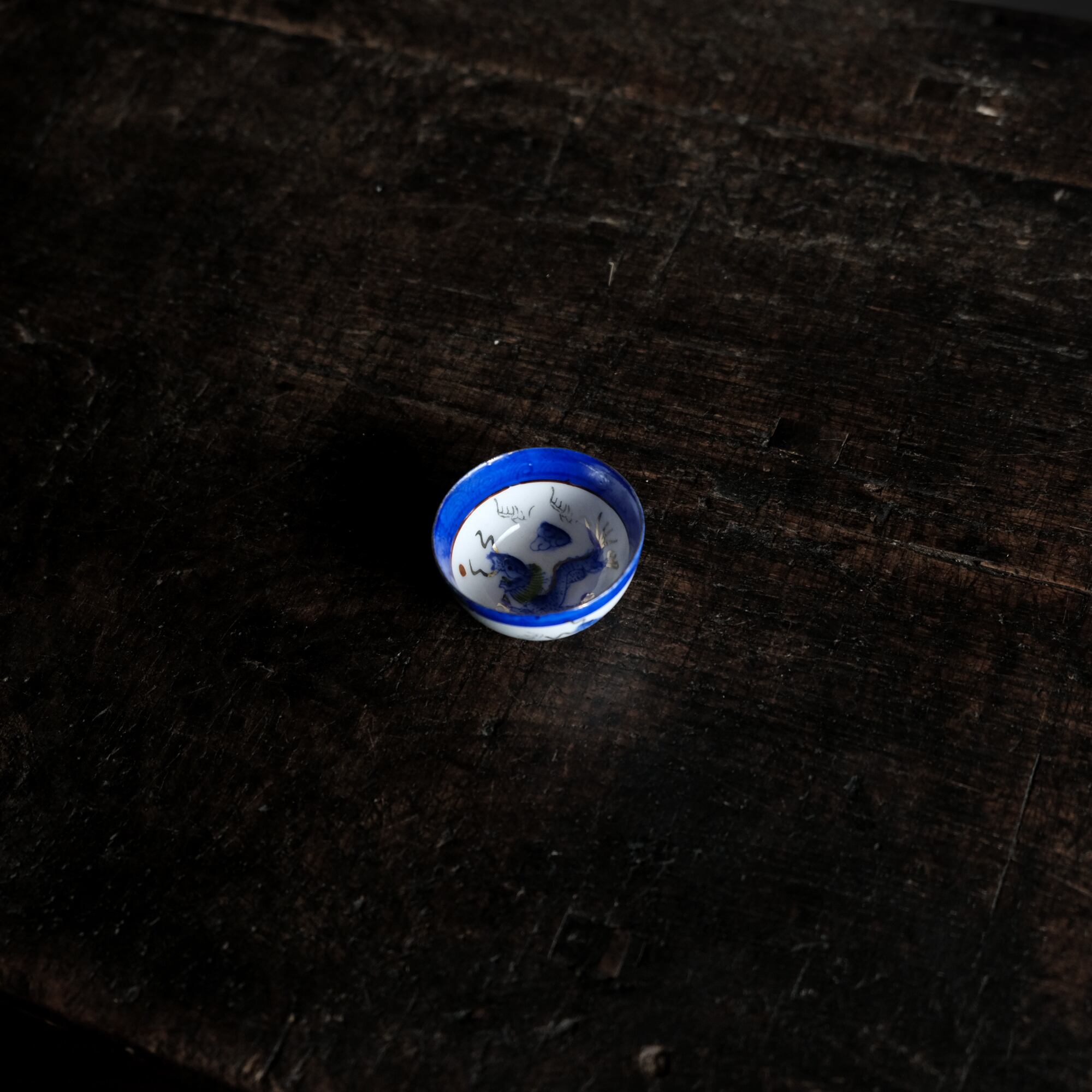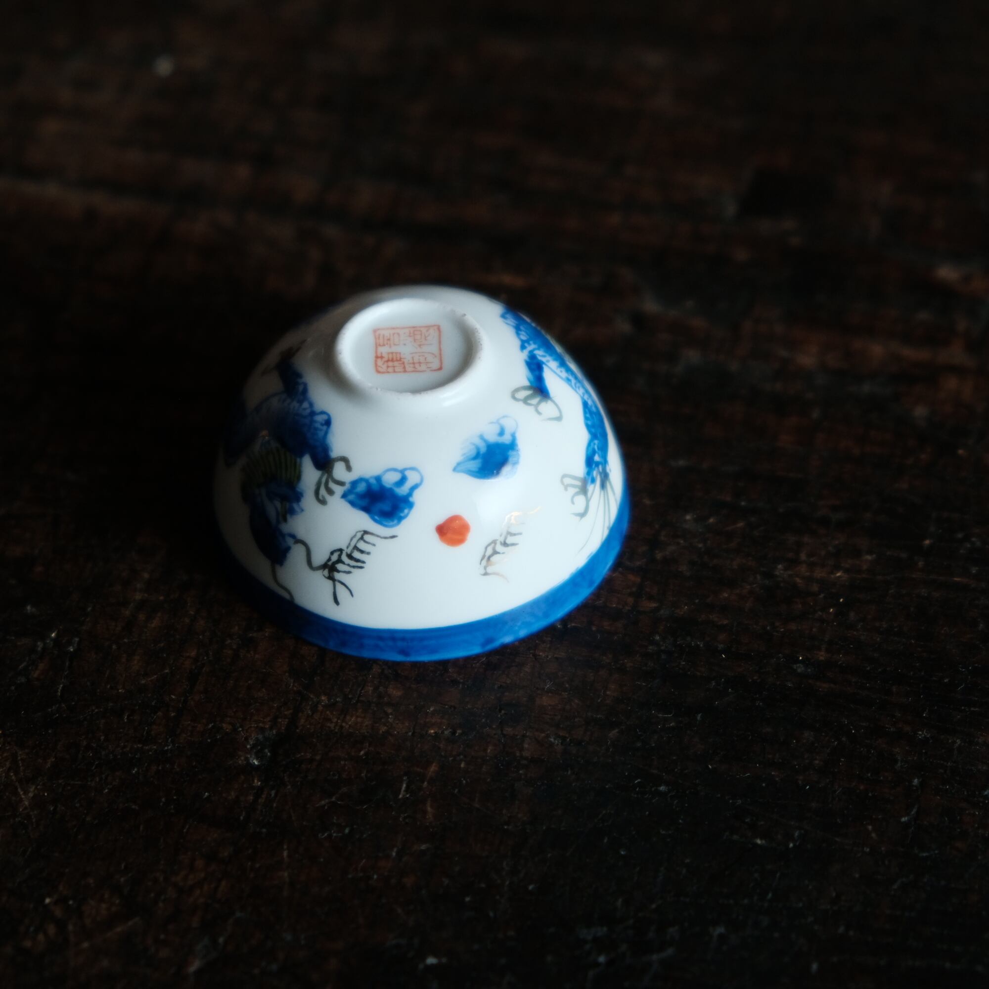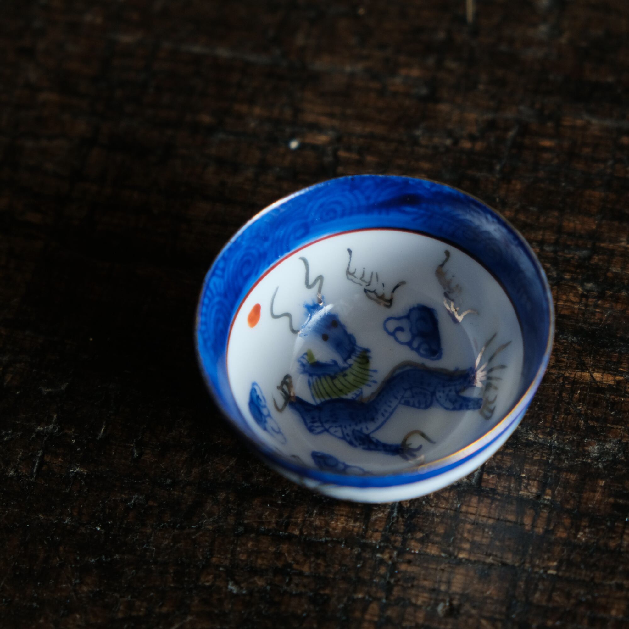 龍と雲と宝珠◆青で素敵。中国景徳鎮 色絵金彩小ぶり猪口 茶杯 ブルー チャイナレトロ シノワズリ 工芸品
