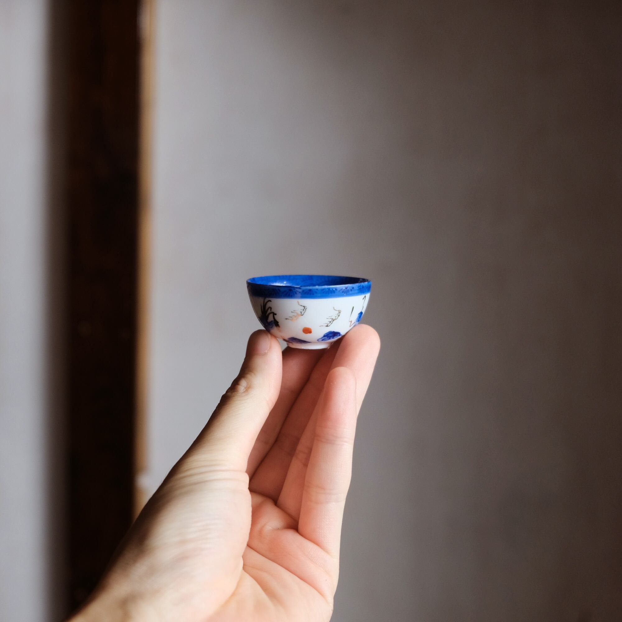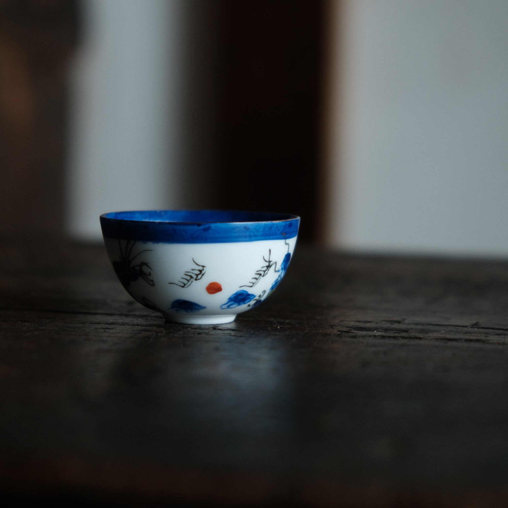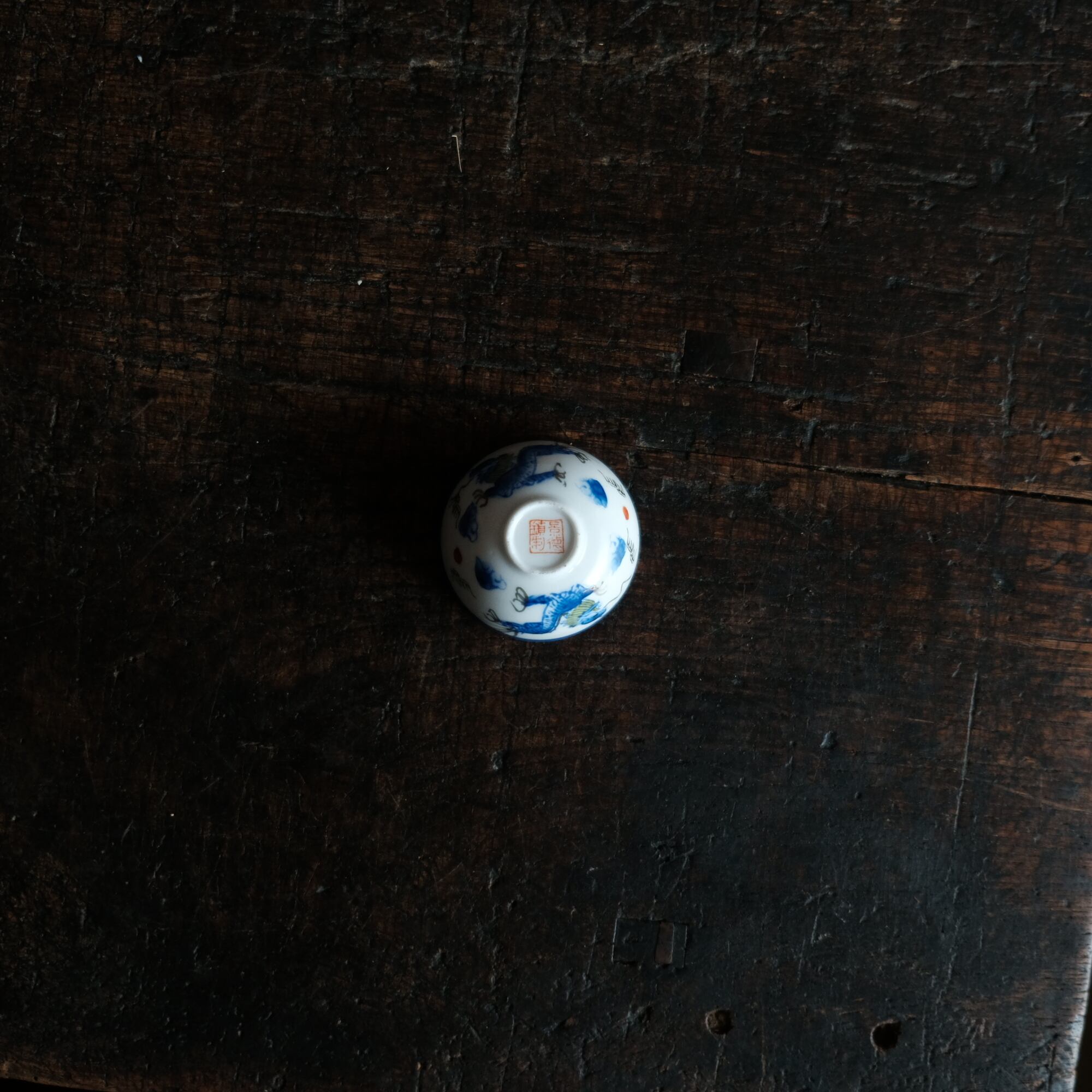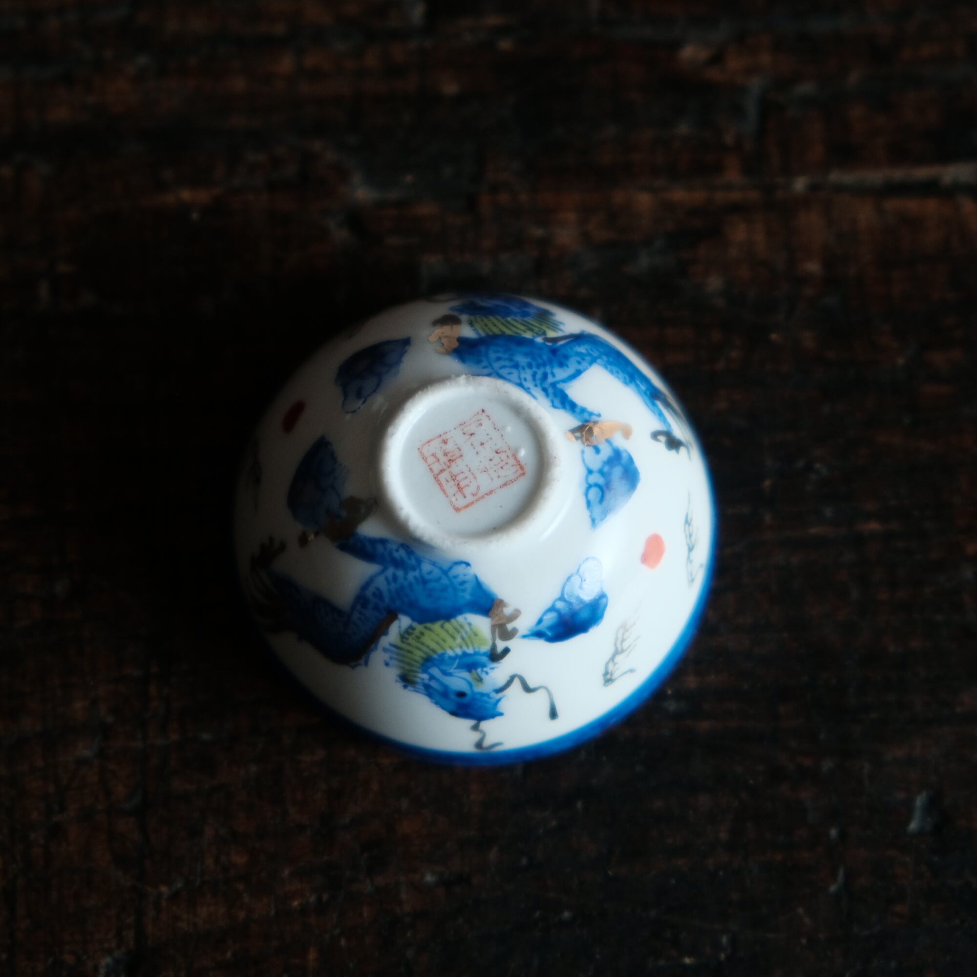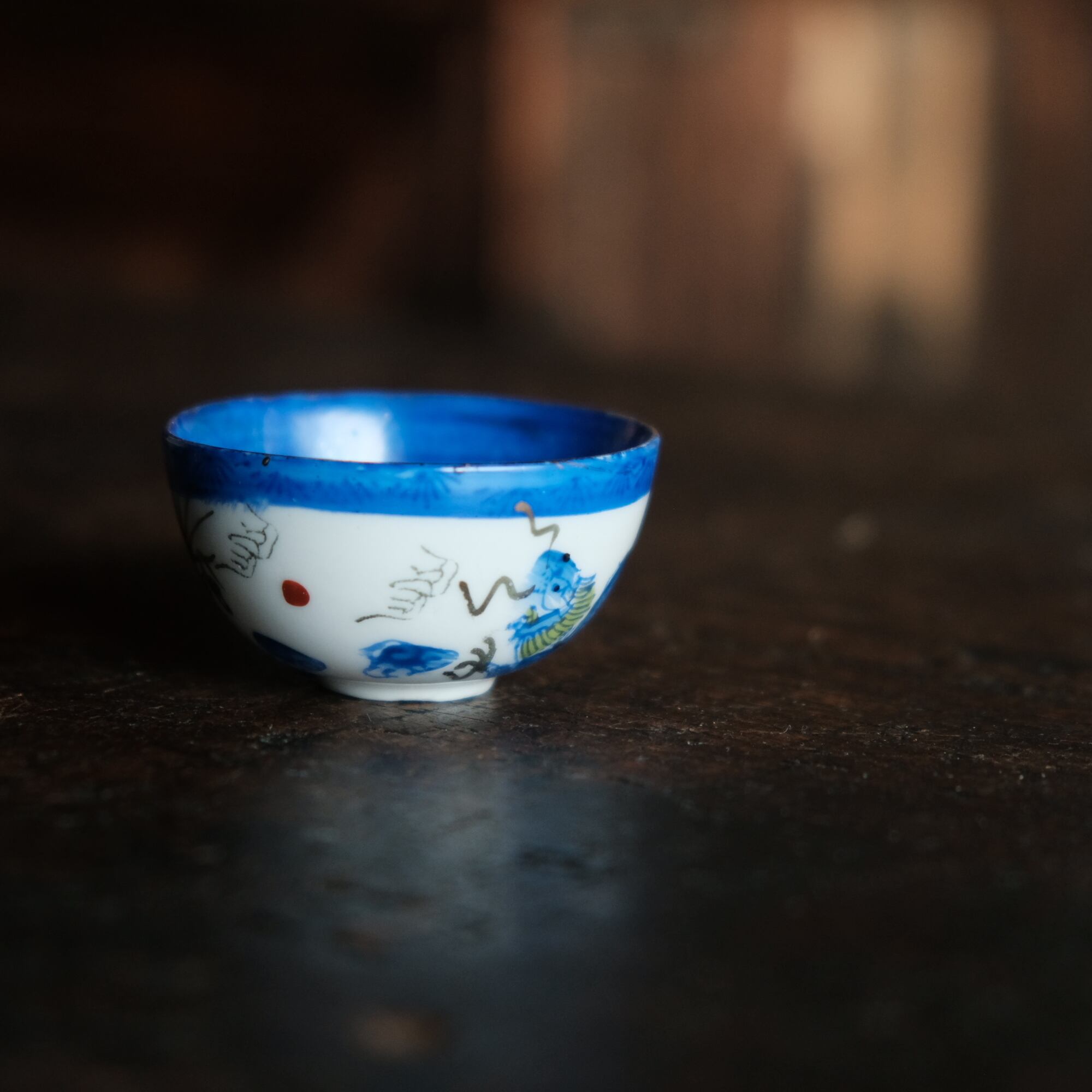 龍と雲と宝珠◆青で素敵。中国景徳鎮 色絵金彩小ぶり猪口 茶杯 ブルー チャイナレトロ シノワズリ 工芸品