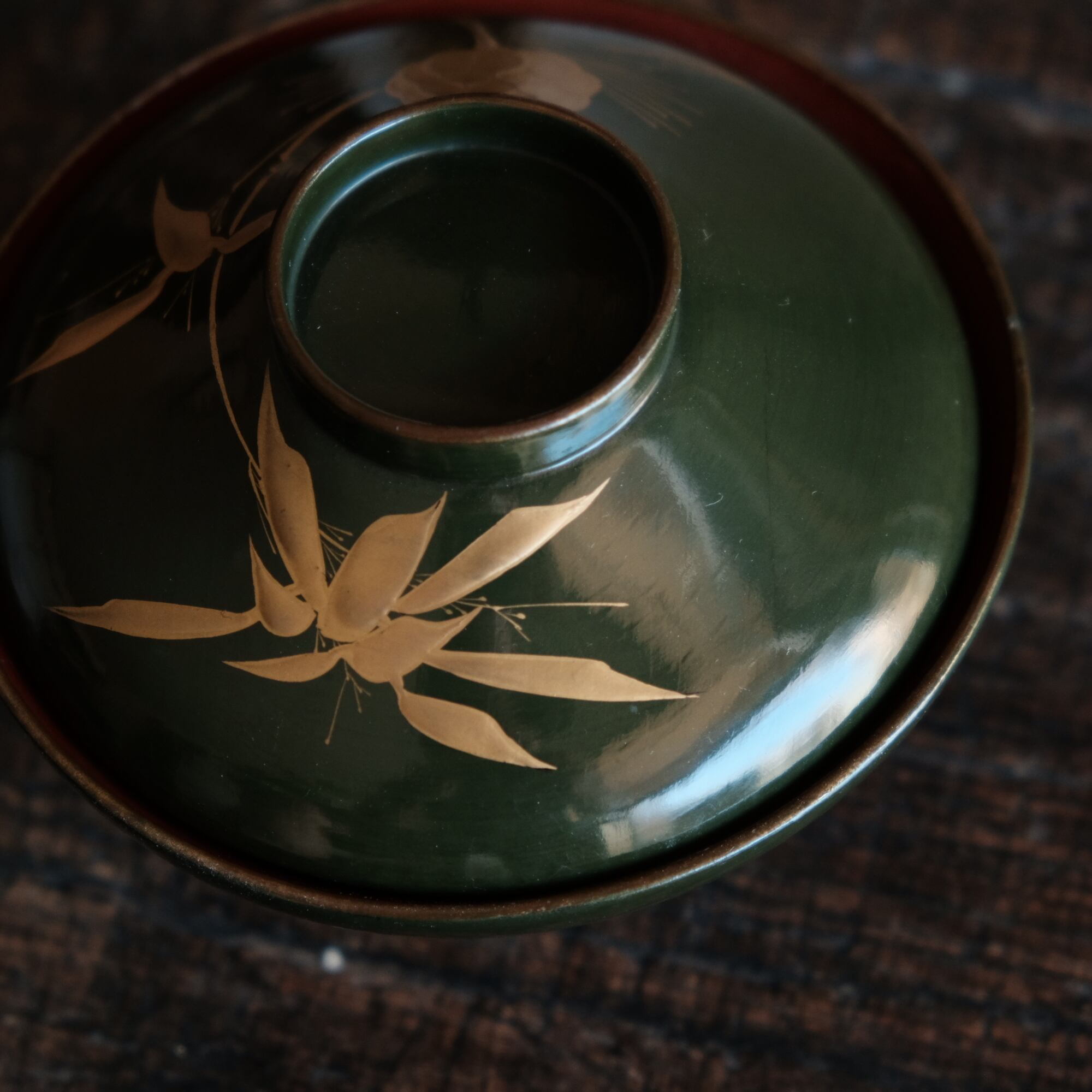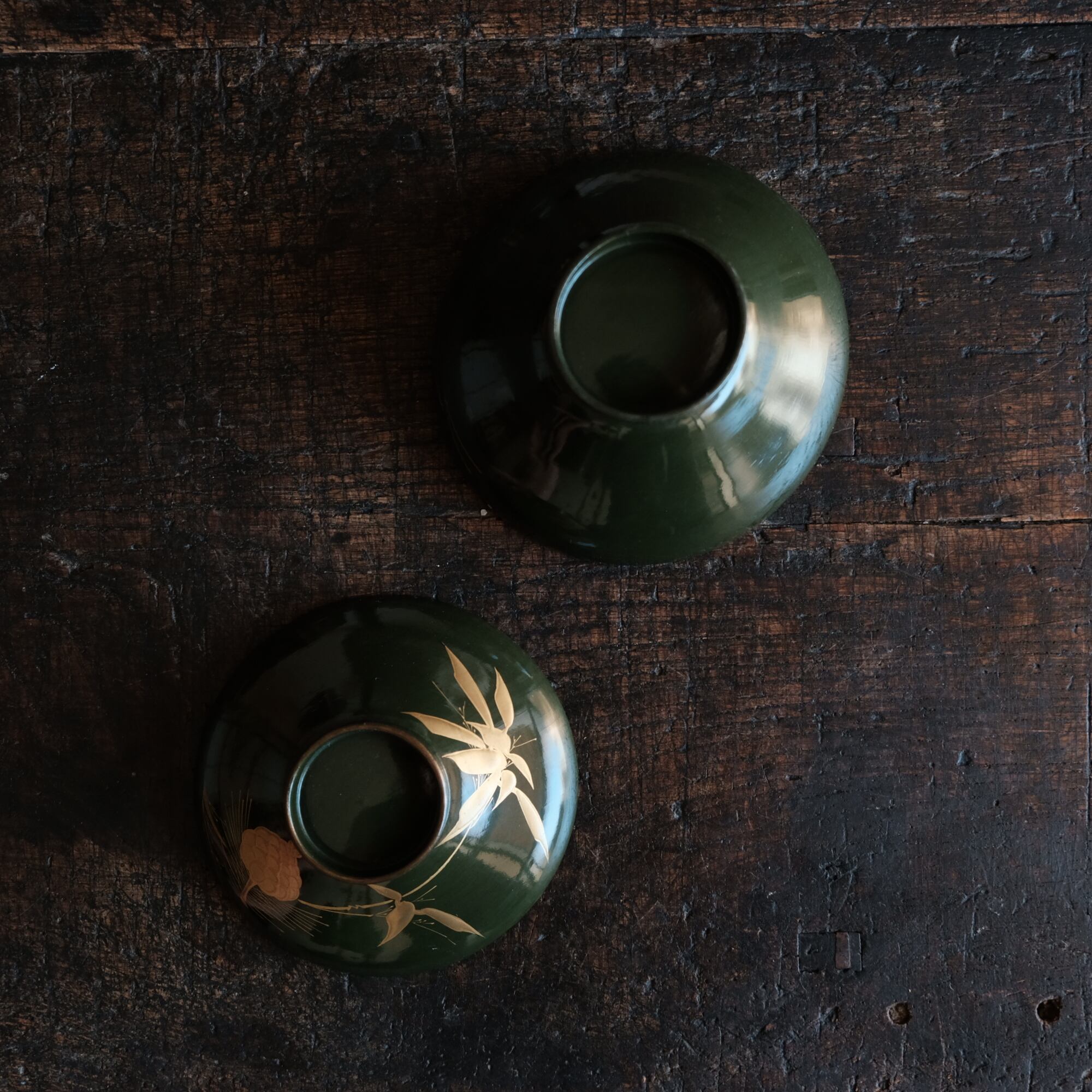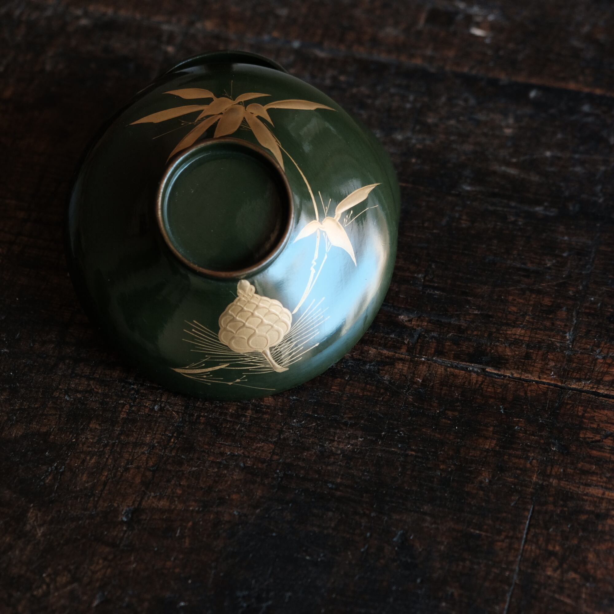 濃い抹茶グリーンな色味ではっきりと大きな蒔絵での絵付けが素敵な器です。
