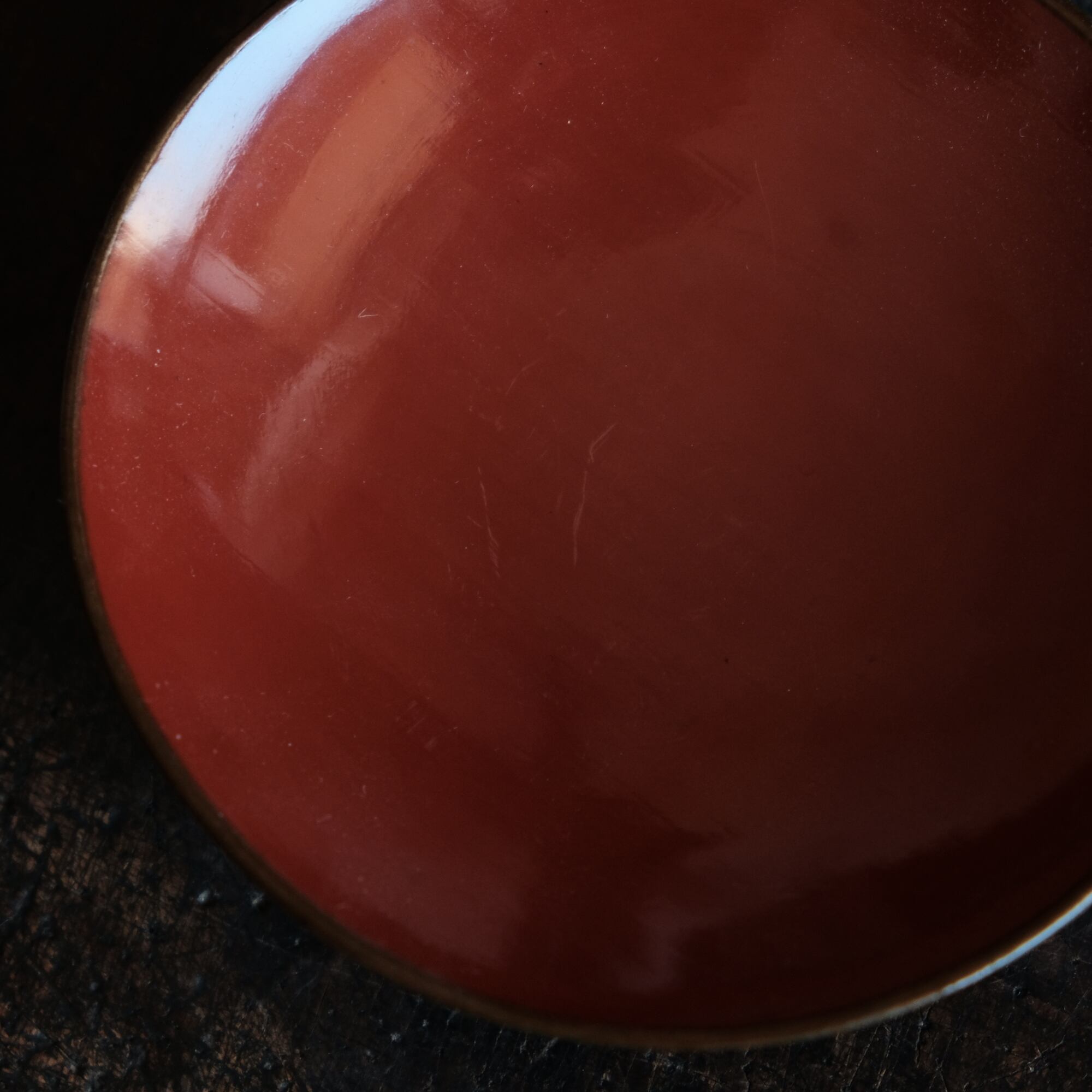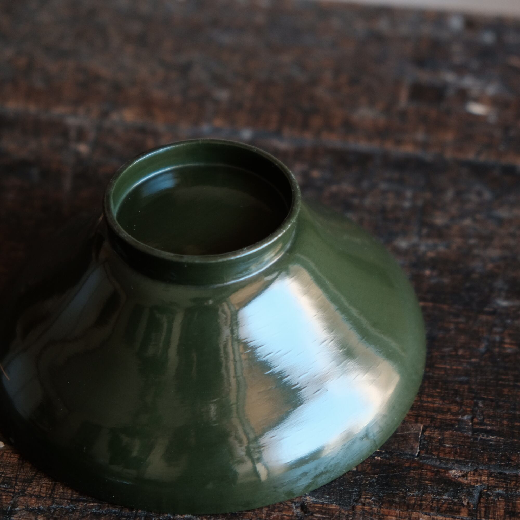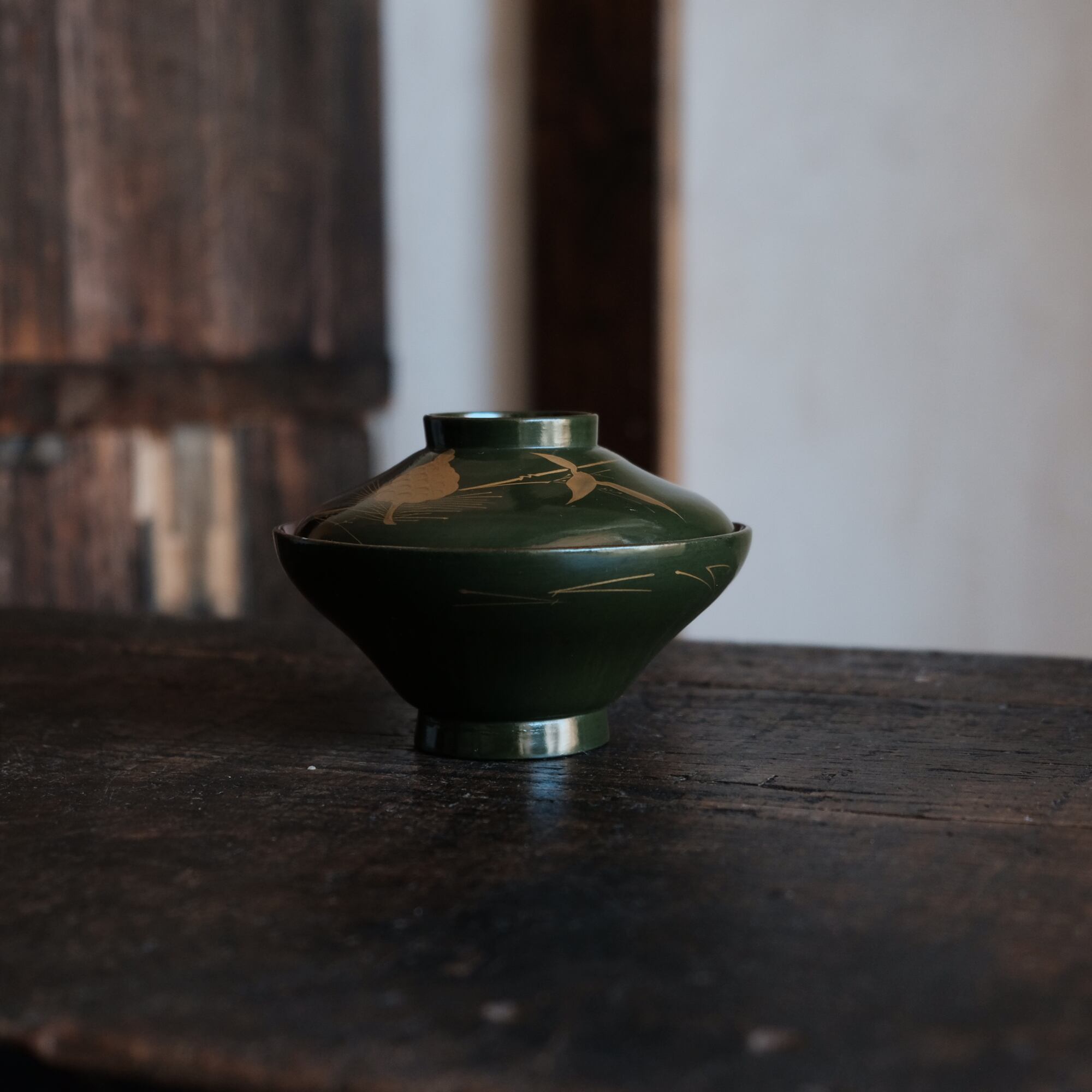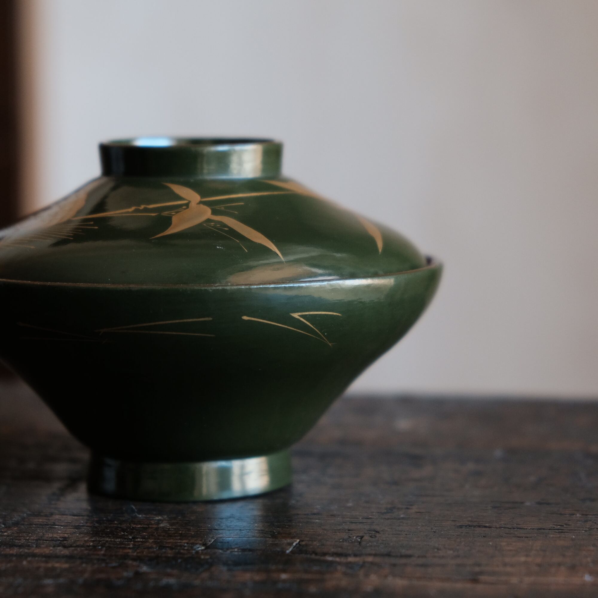 濃い抹茶グリーンな色味ではっきりと大きな蒔絵での絵付けが素敵な器です。