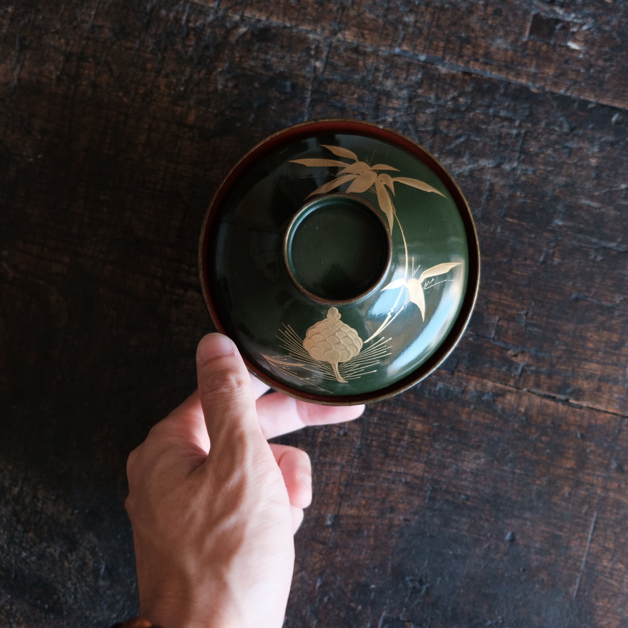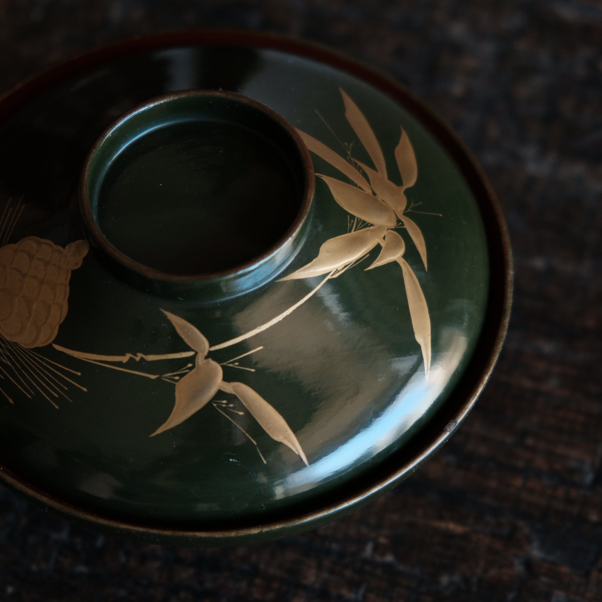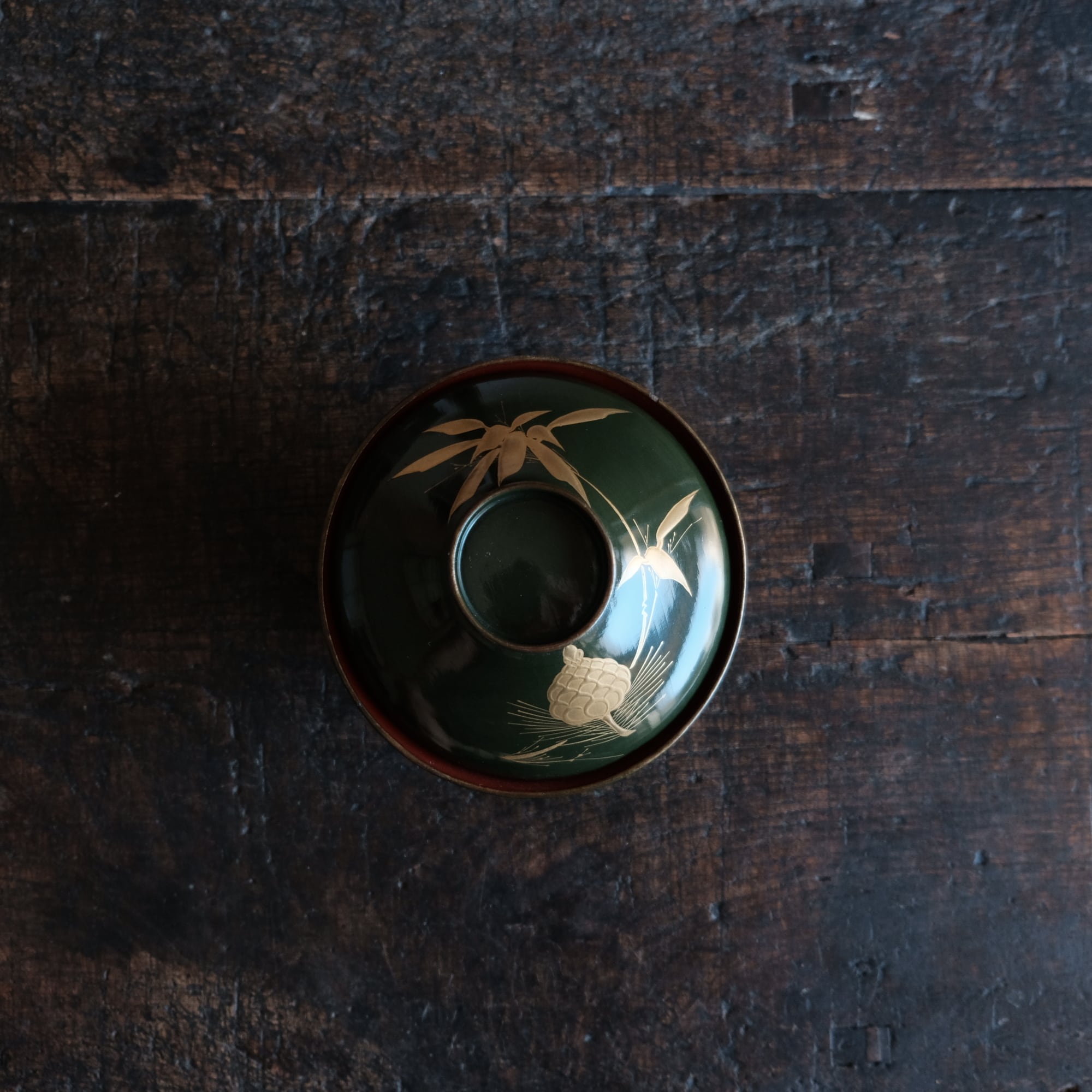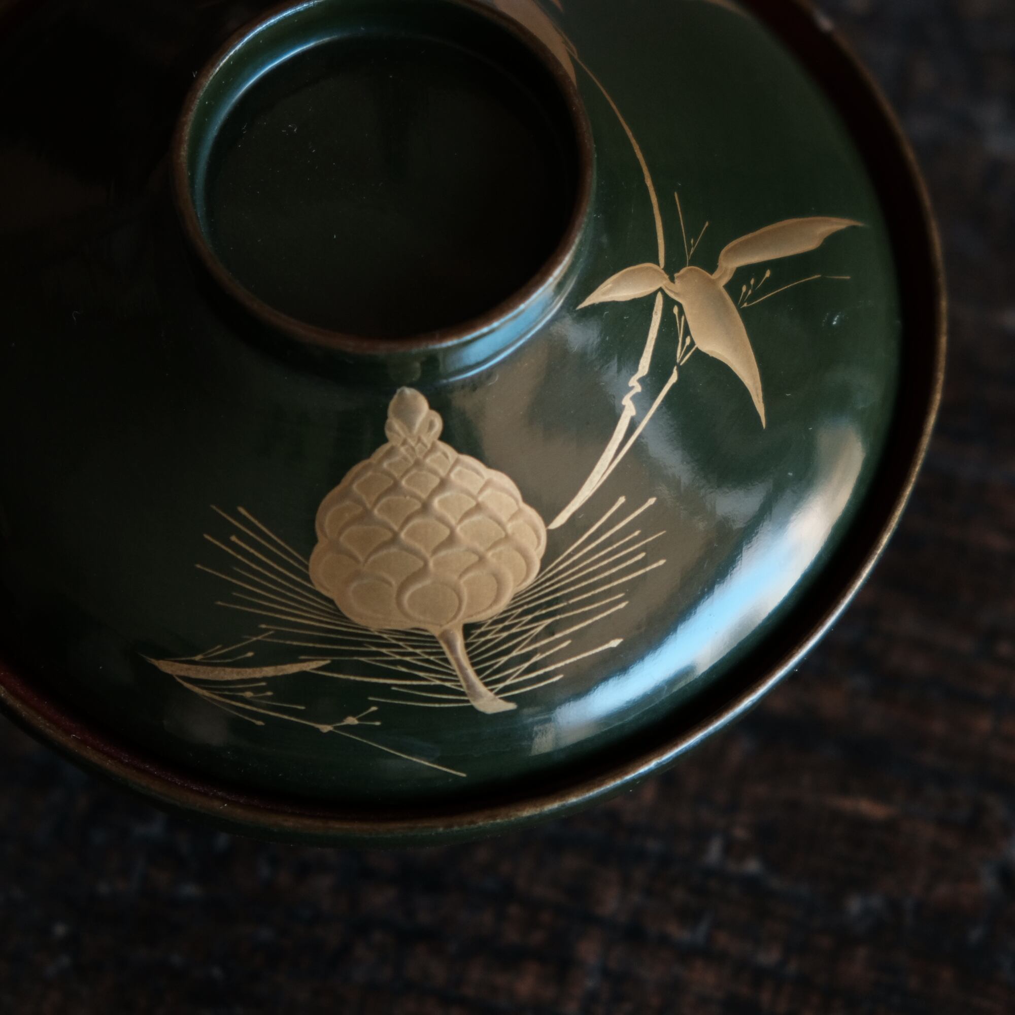 金の松ぼっくり◆深緑で素敵。時代物 漆芸蒔絵蓋付椀 漆器 骨董・antiques明治〜大正期 b1
