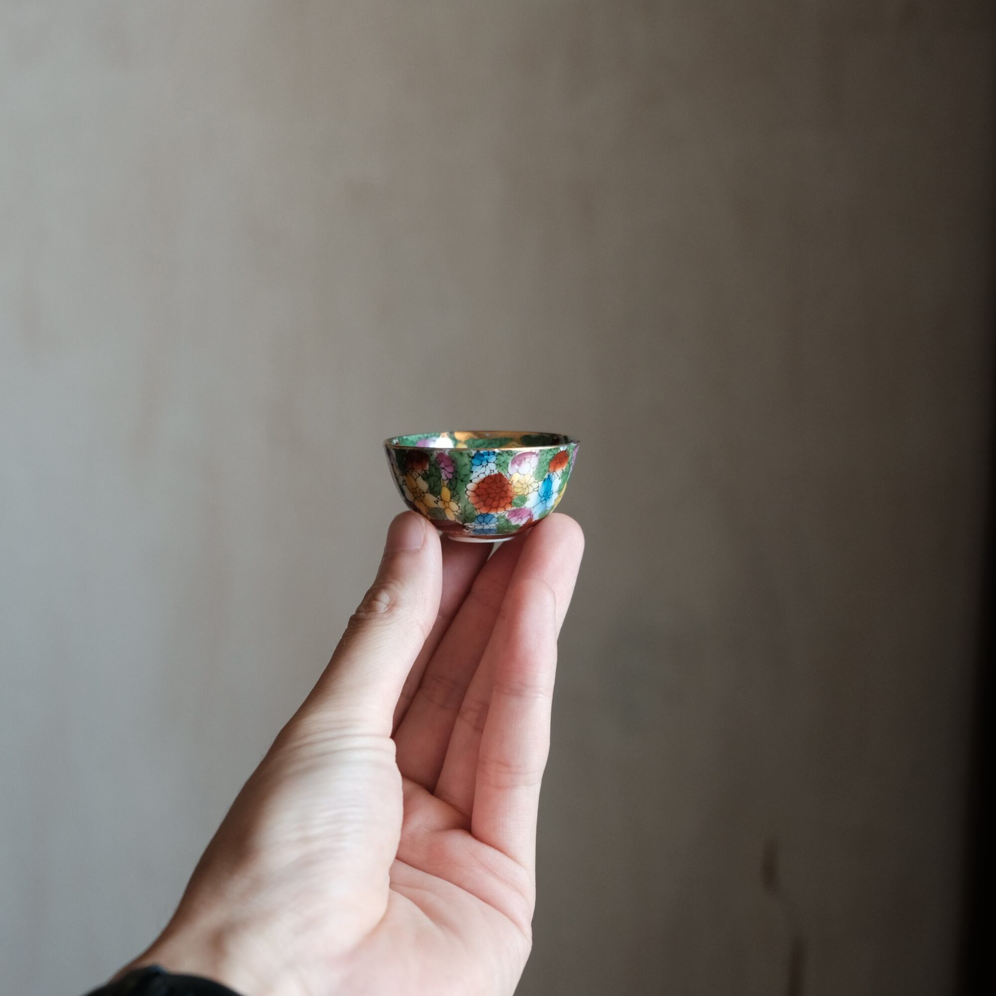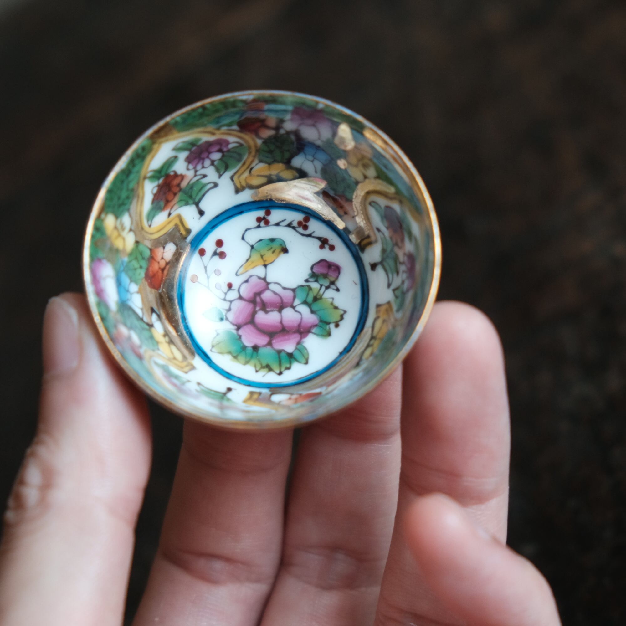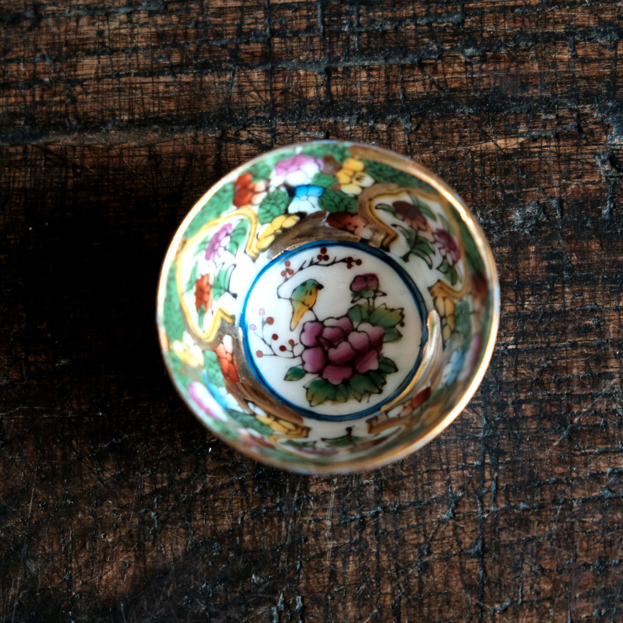 見込みにメジロと牡丹◆中国景徳鎮 色絵金彩小ぶり猪口 茶杯 カラフル チャイナレトロ シノワズリ 工芸品