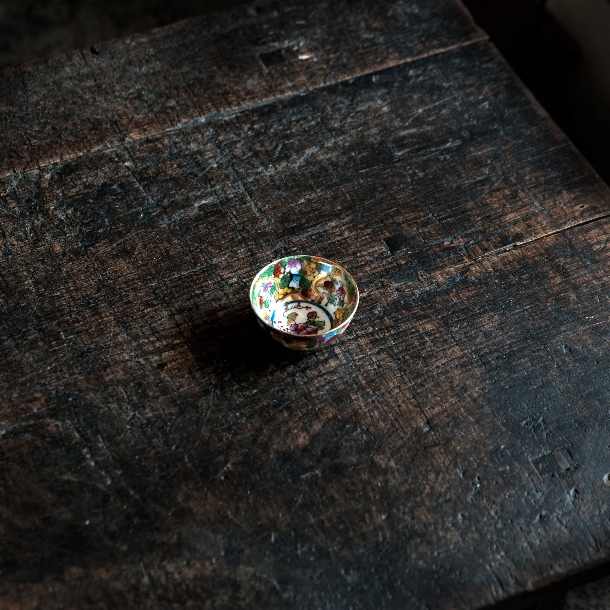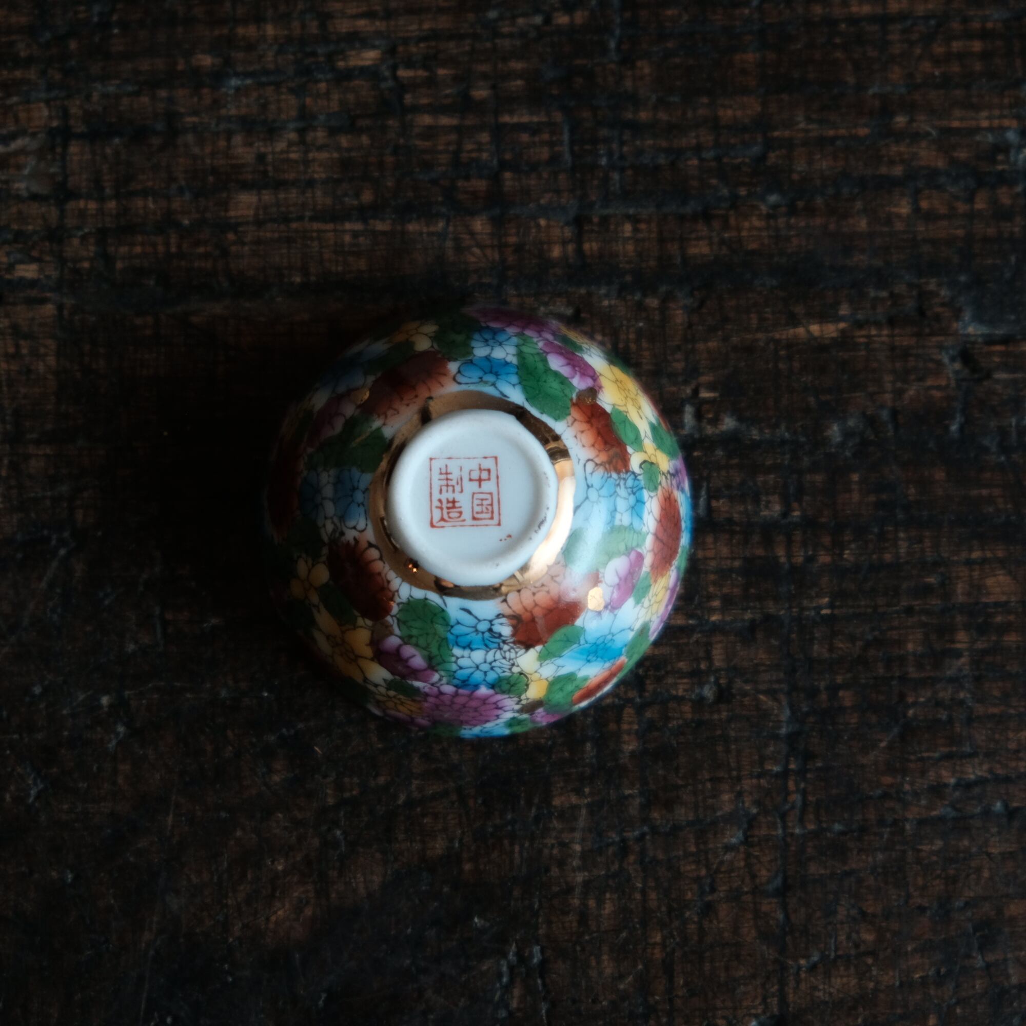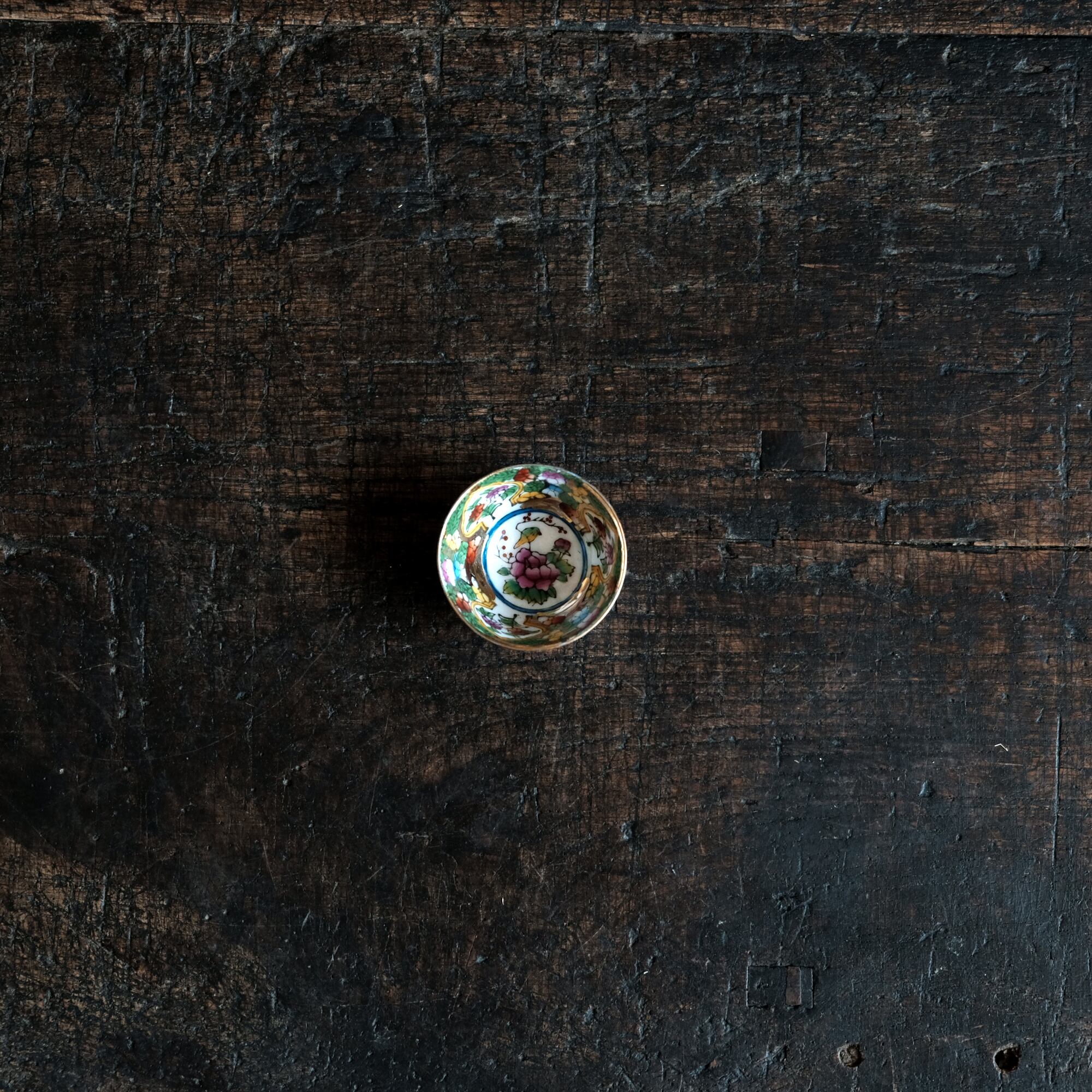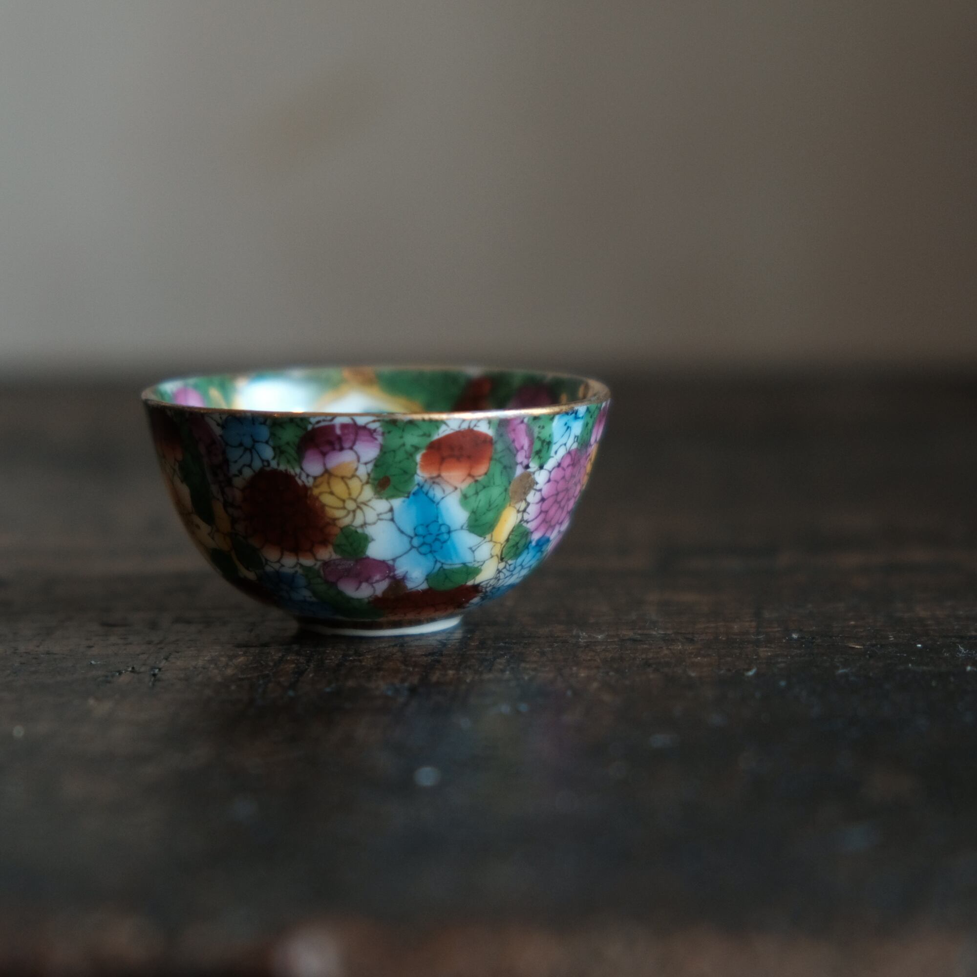 見込みにメジロと牡丹◆中国景徳鎮 色絵金彩小ぶり猪口 茶杯 カラフル チャイナレトロ シノワズリ 工芸品