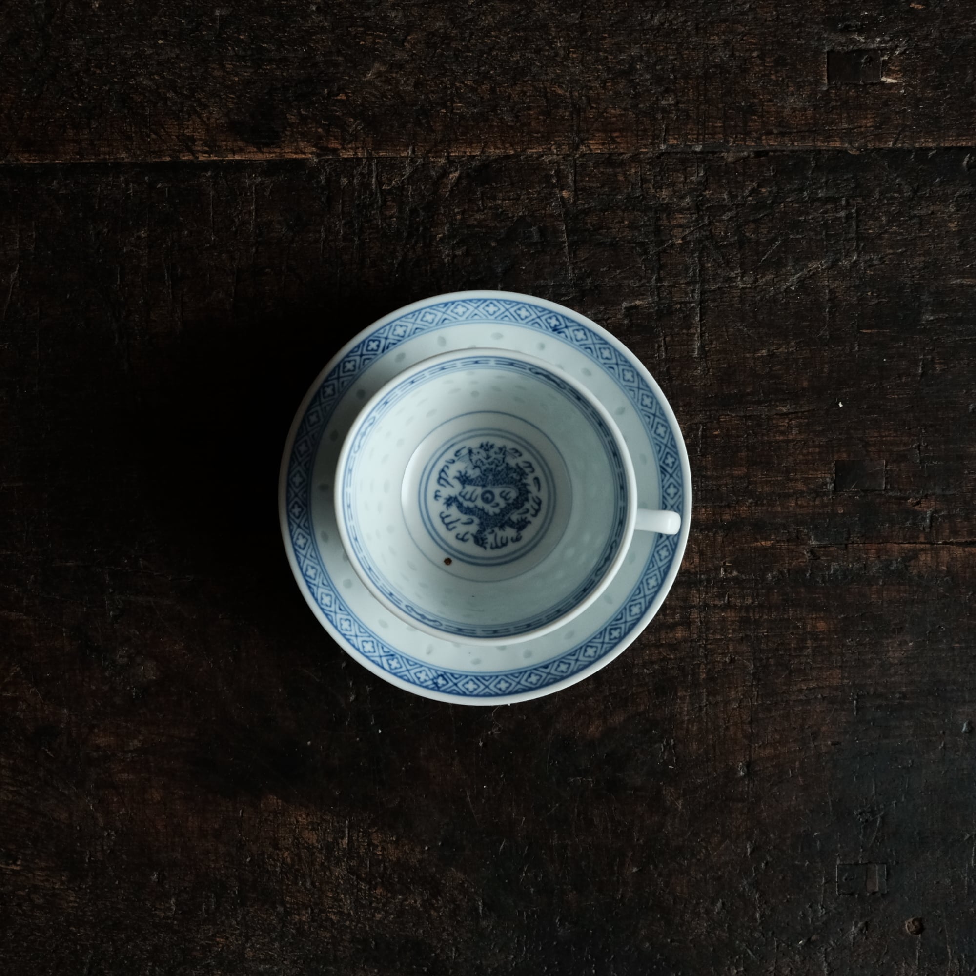 見込みに龍と青花◆中国景徳鎮 蛍焼染付カップ&ソーサー 茶器 蝙蝠 十字架 チャイナレトロ シノワズリ A