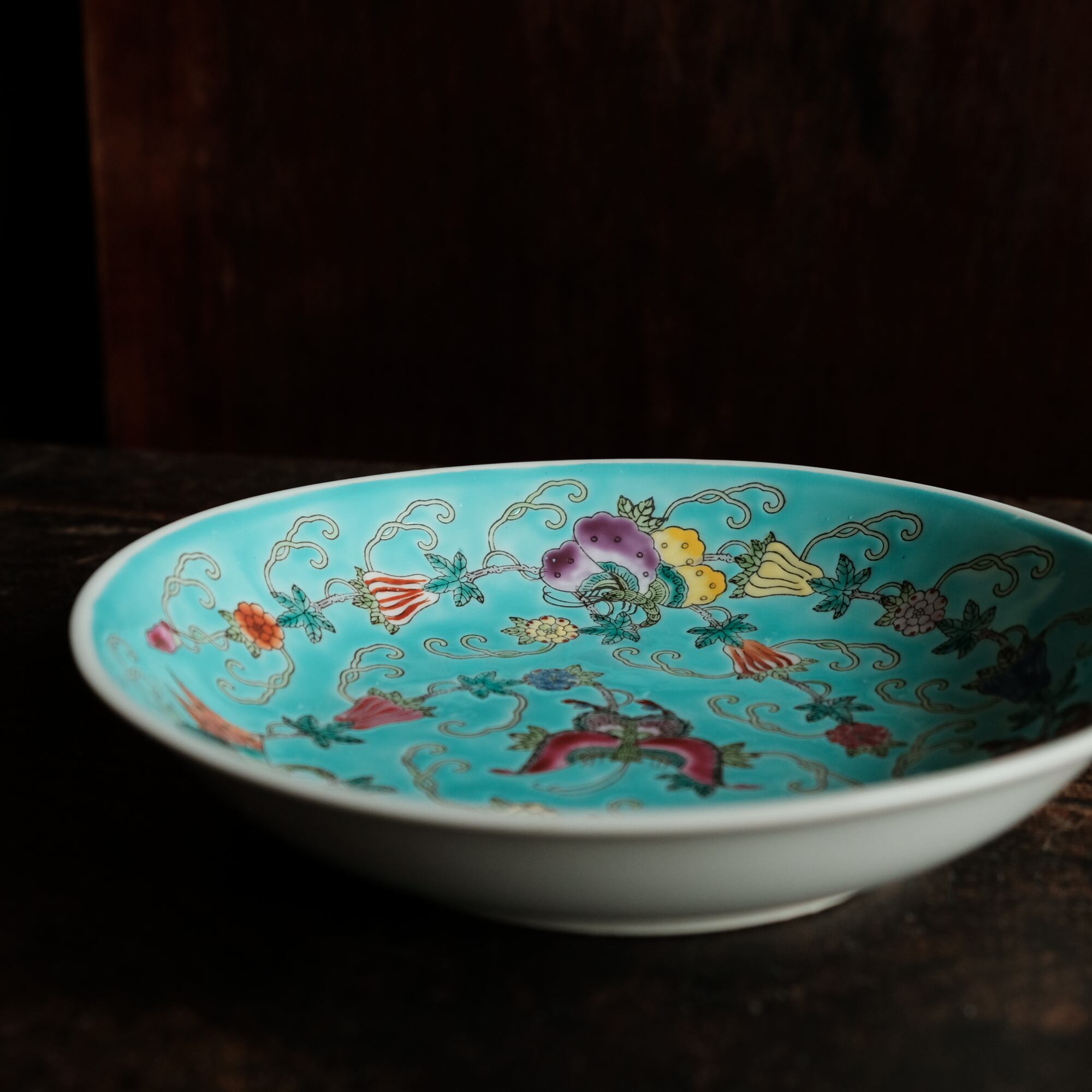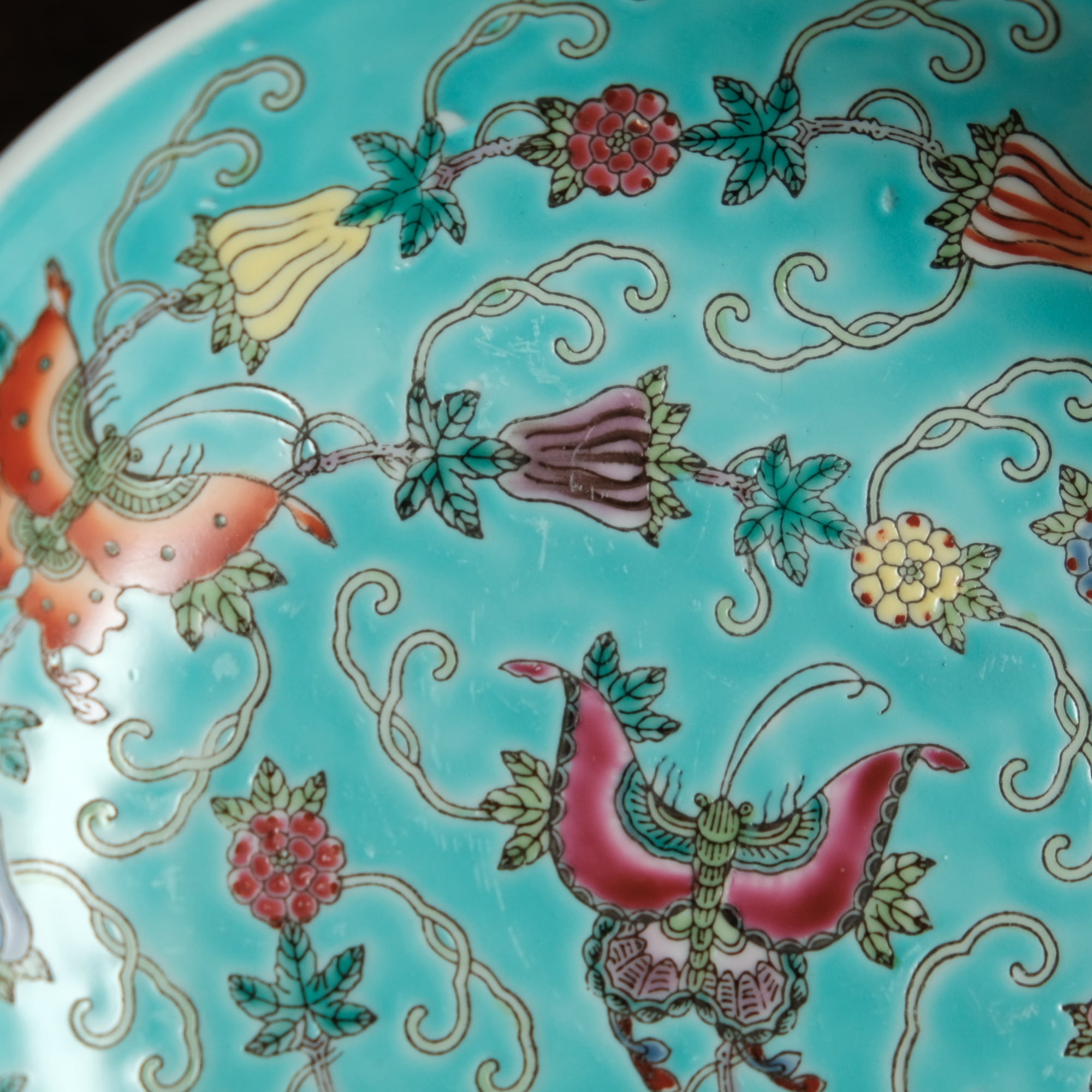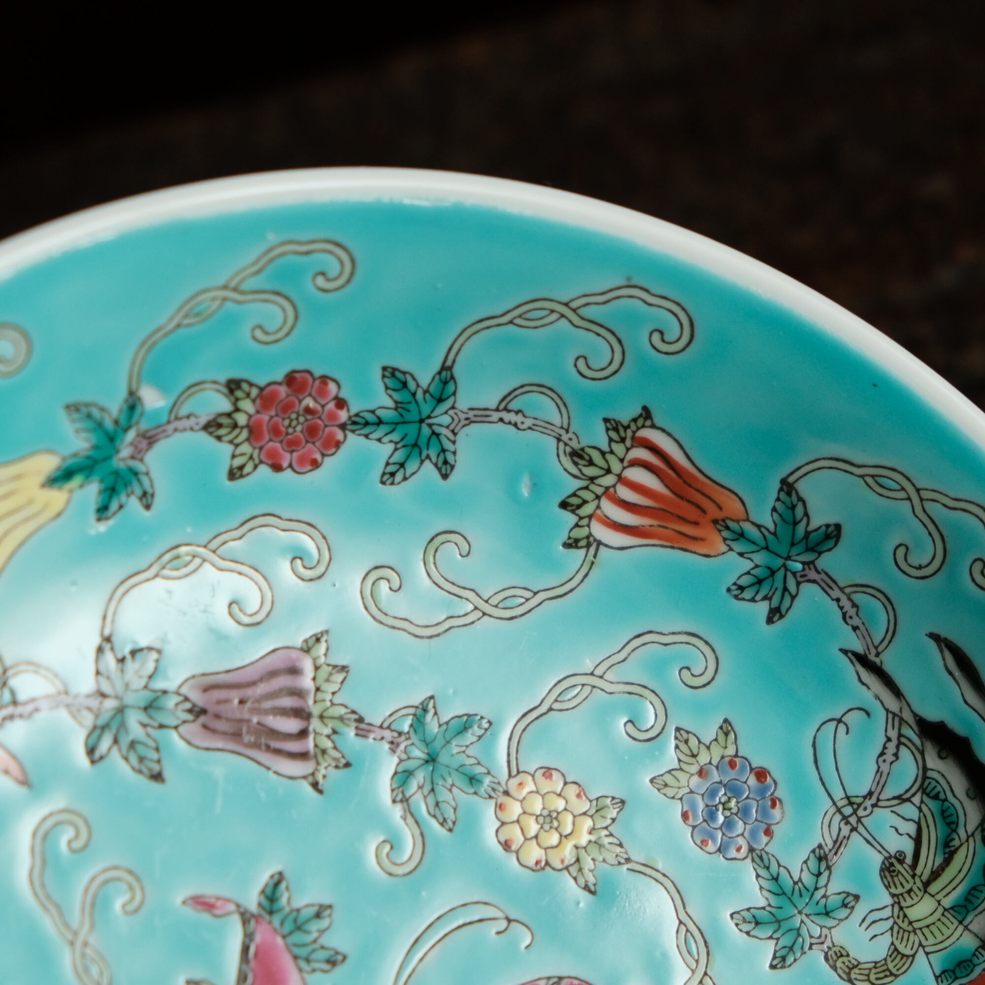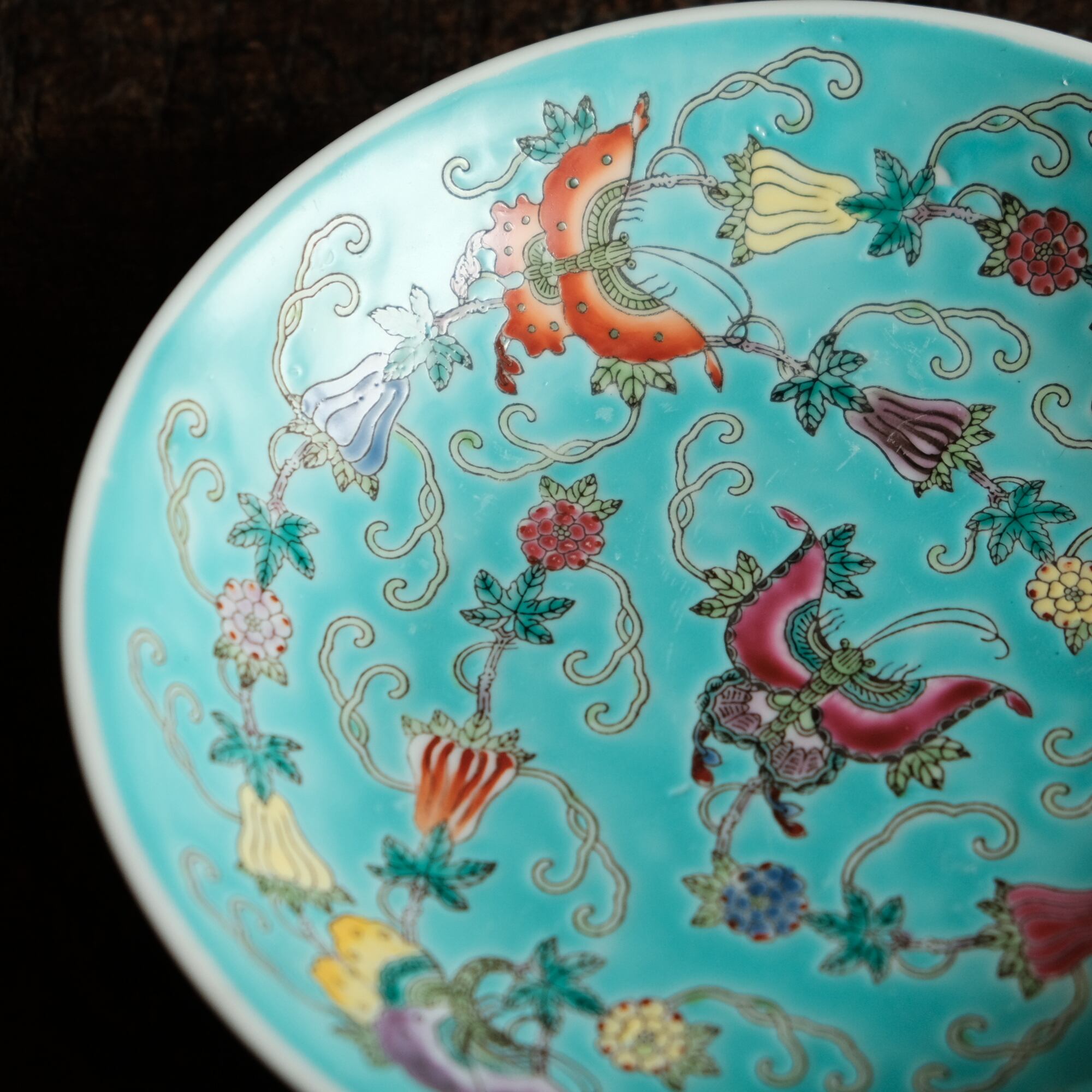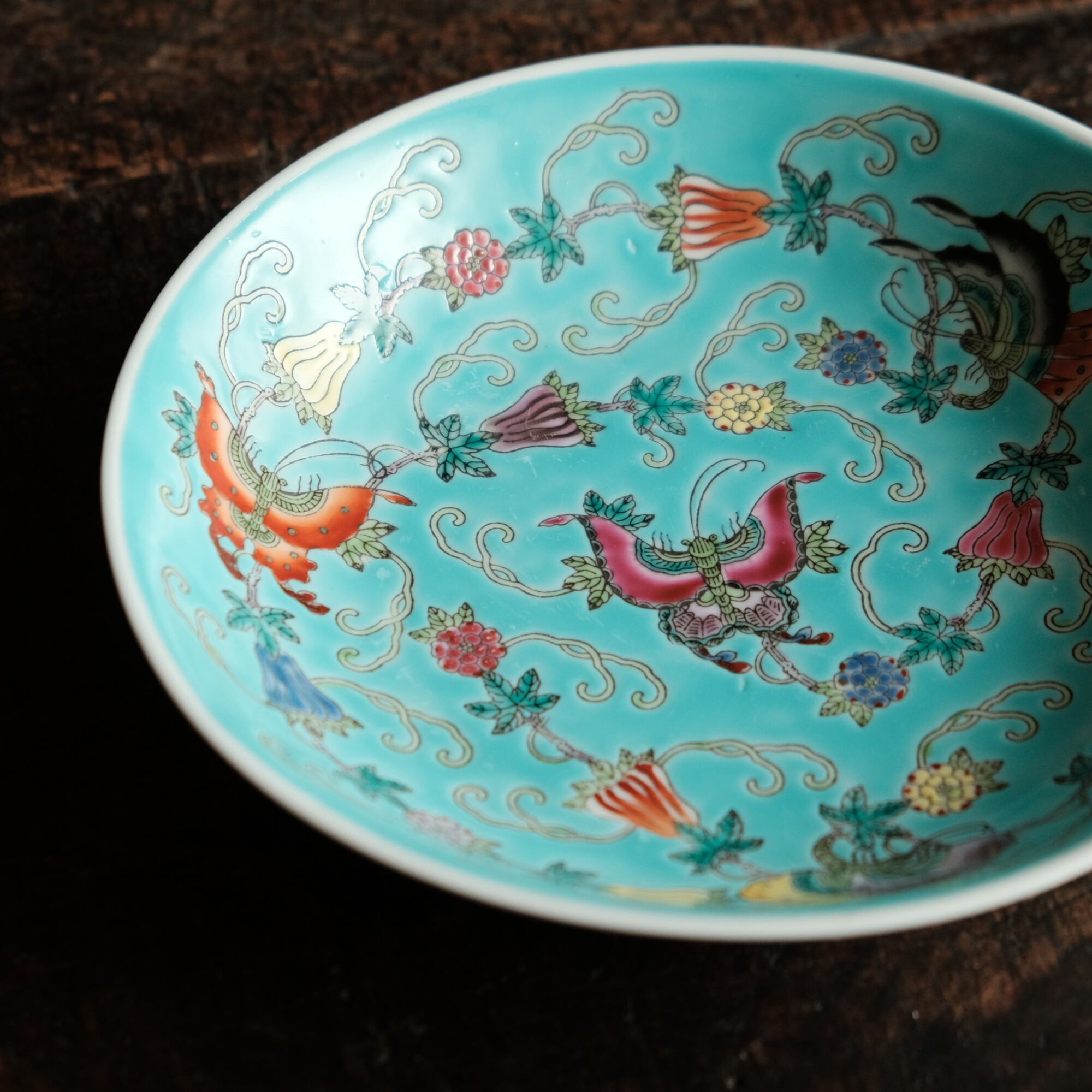 ビビットカラーで可愛い◆花と蕾と蝶々 中国景徳鎮 色絵中深皿 中華・台湾料理 チャイナレトロ
